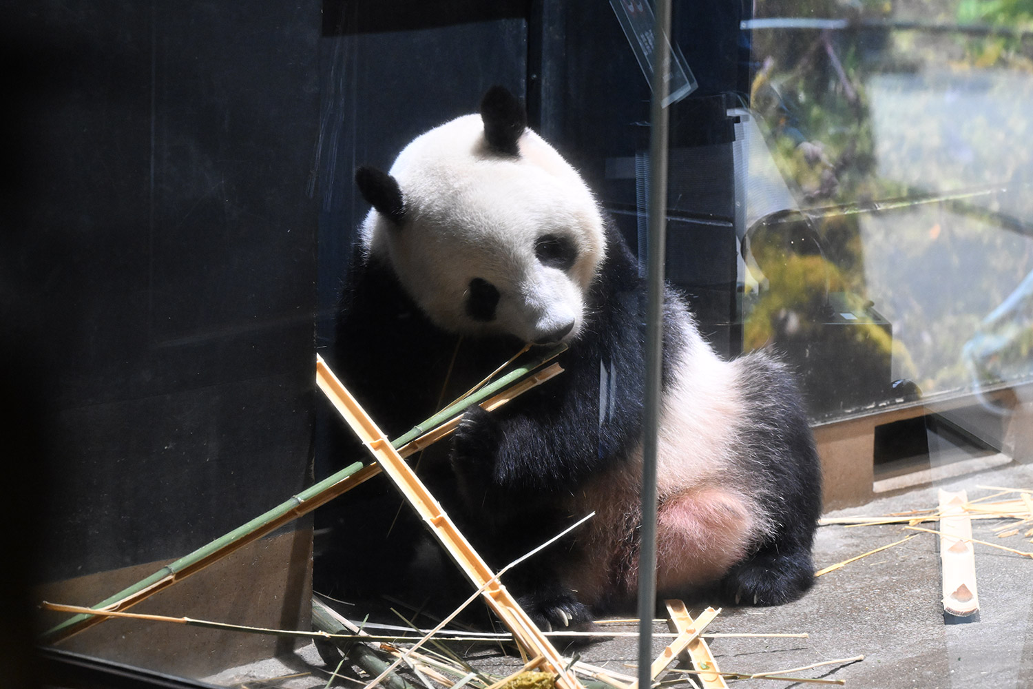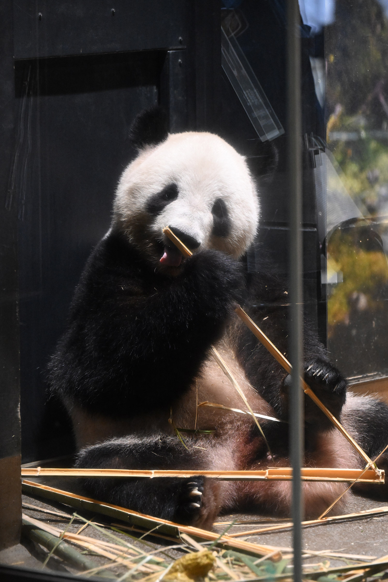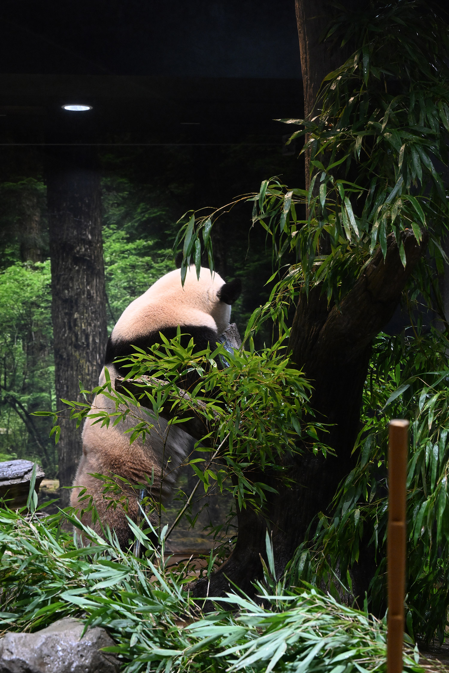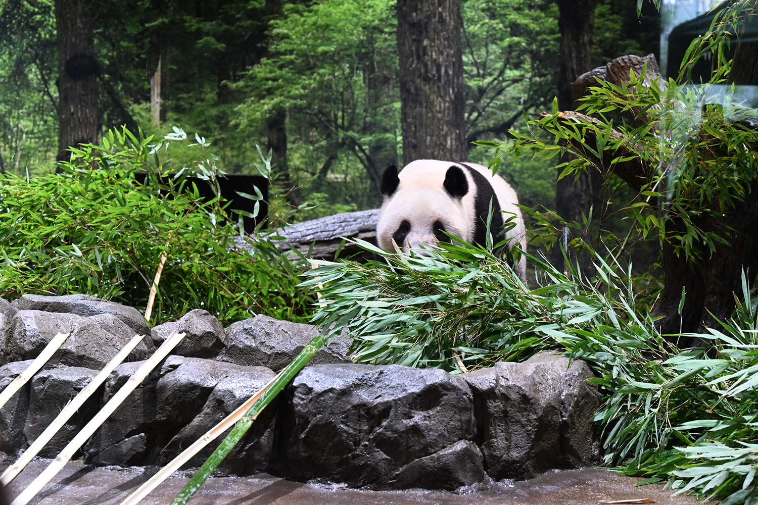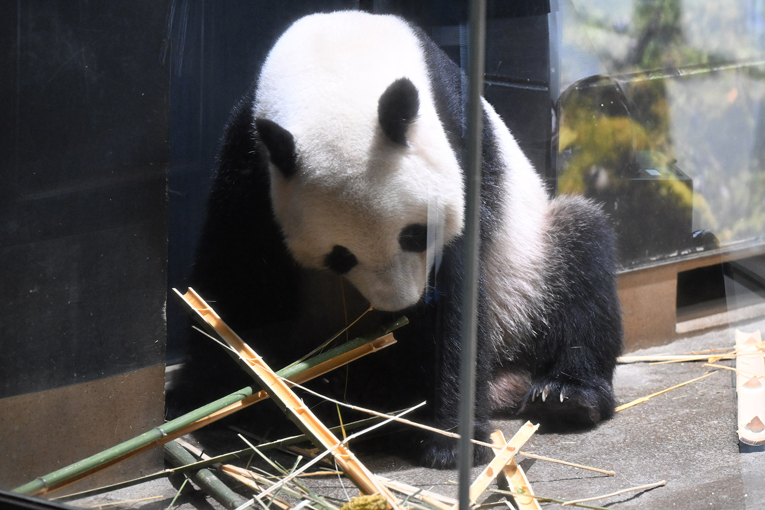 レイちゃん、竹林みたいに竹いっぱい😳💕…食欲が出てきたのかな?竹幹を割ったヤツが壁にズララと並んでるの、釣具屋さん🎣みたいですよね🤭
