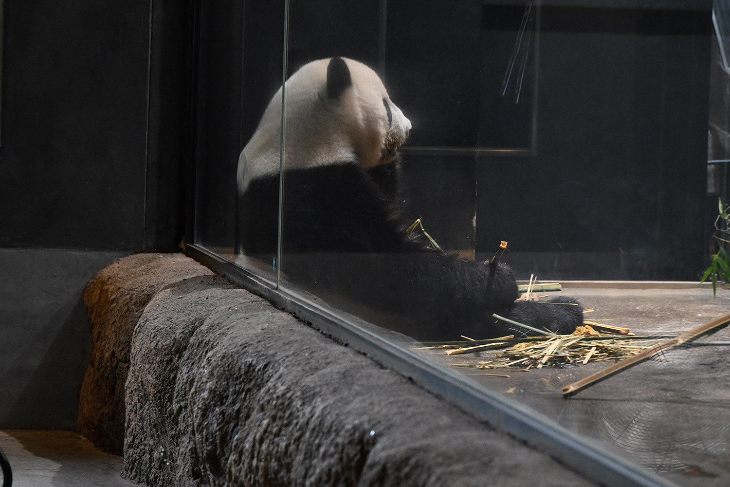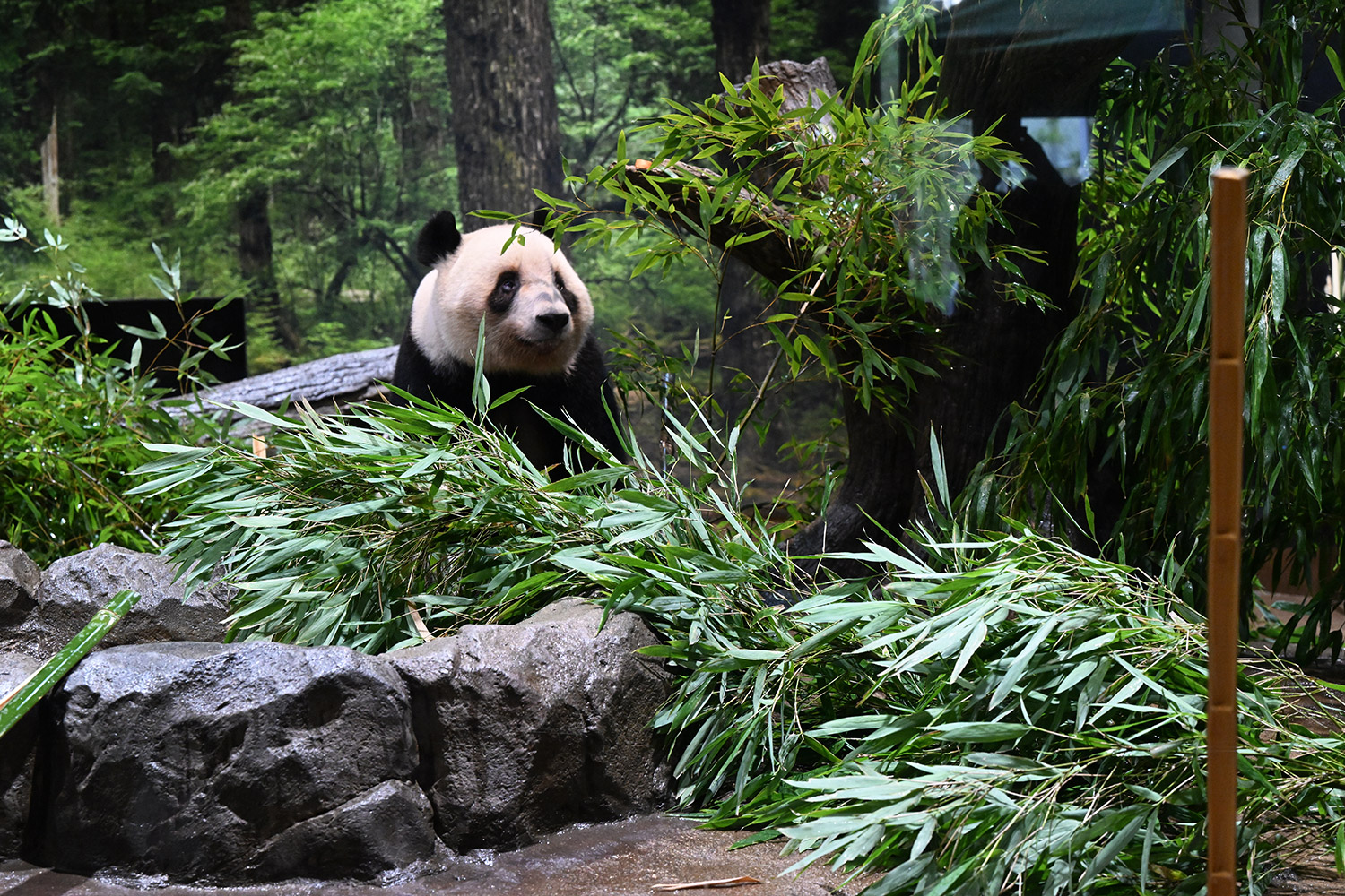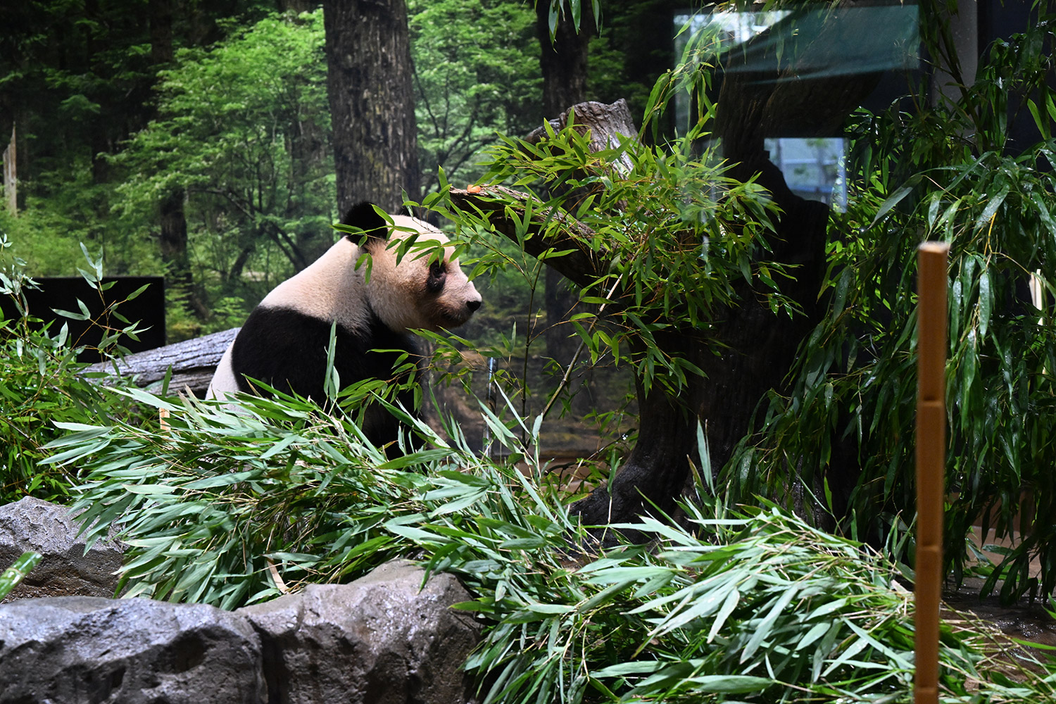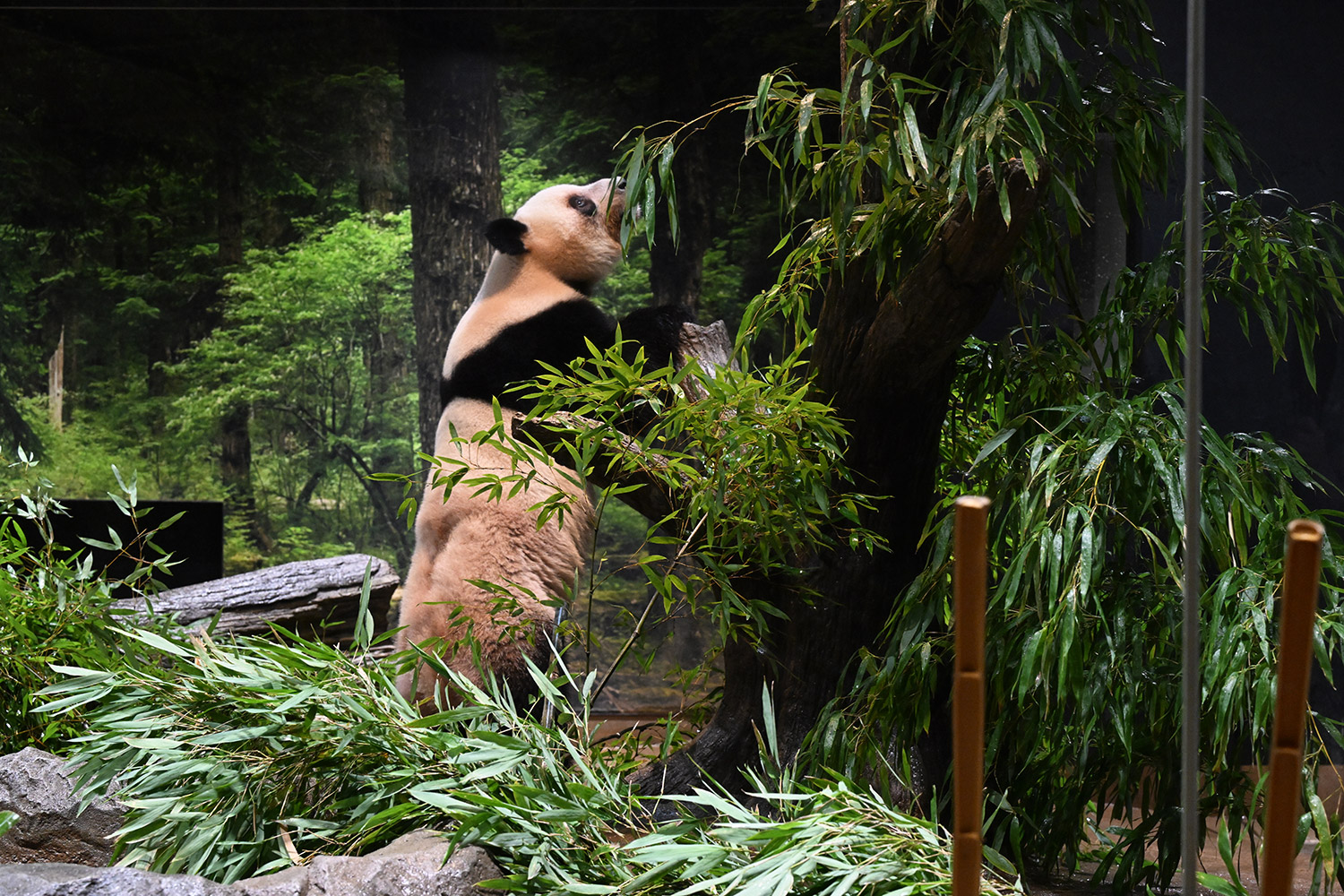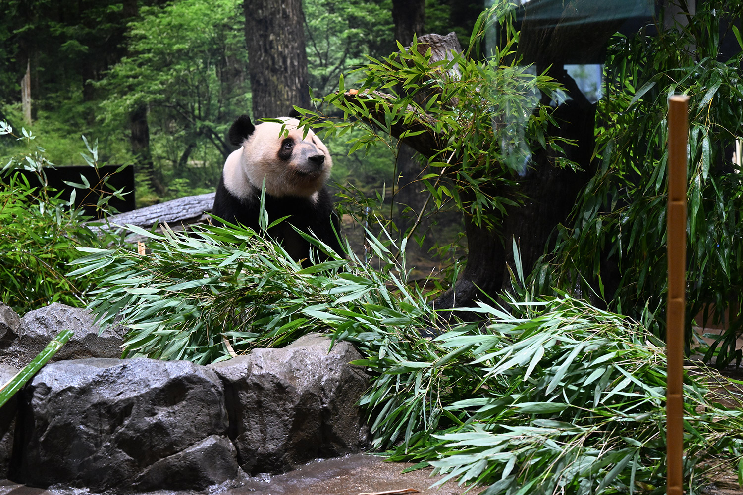 レイちゃん、竹林みたいに竹いっぱい😳💕…食欲が出てきたのかな?竹幹を割ったヤツが壁にズララと並んでるの、釣具屋さん🎣みたいですよね🤭