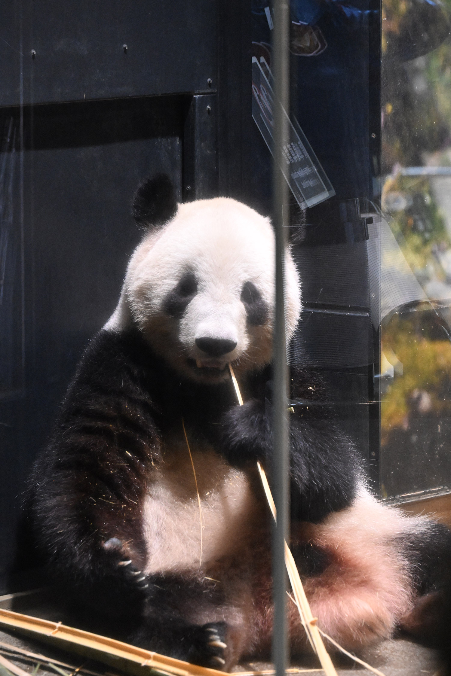 お顔はっきり見せてくれて嬉しいな♪首を傾けて一生懸命に竹バリバリ!足元の竹の上ほかほか竹団子、同系色。竹を快食シャオの身体から同じ竹色の快便。代謝抜群!健康な証拠💮👍✌️