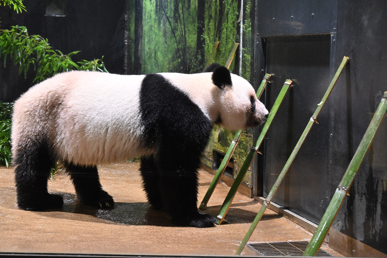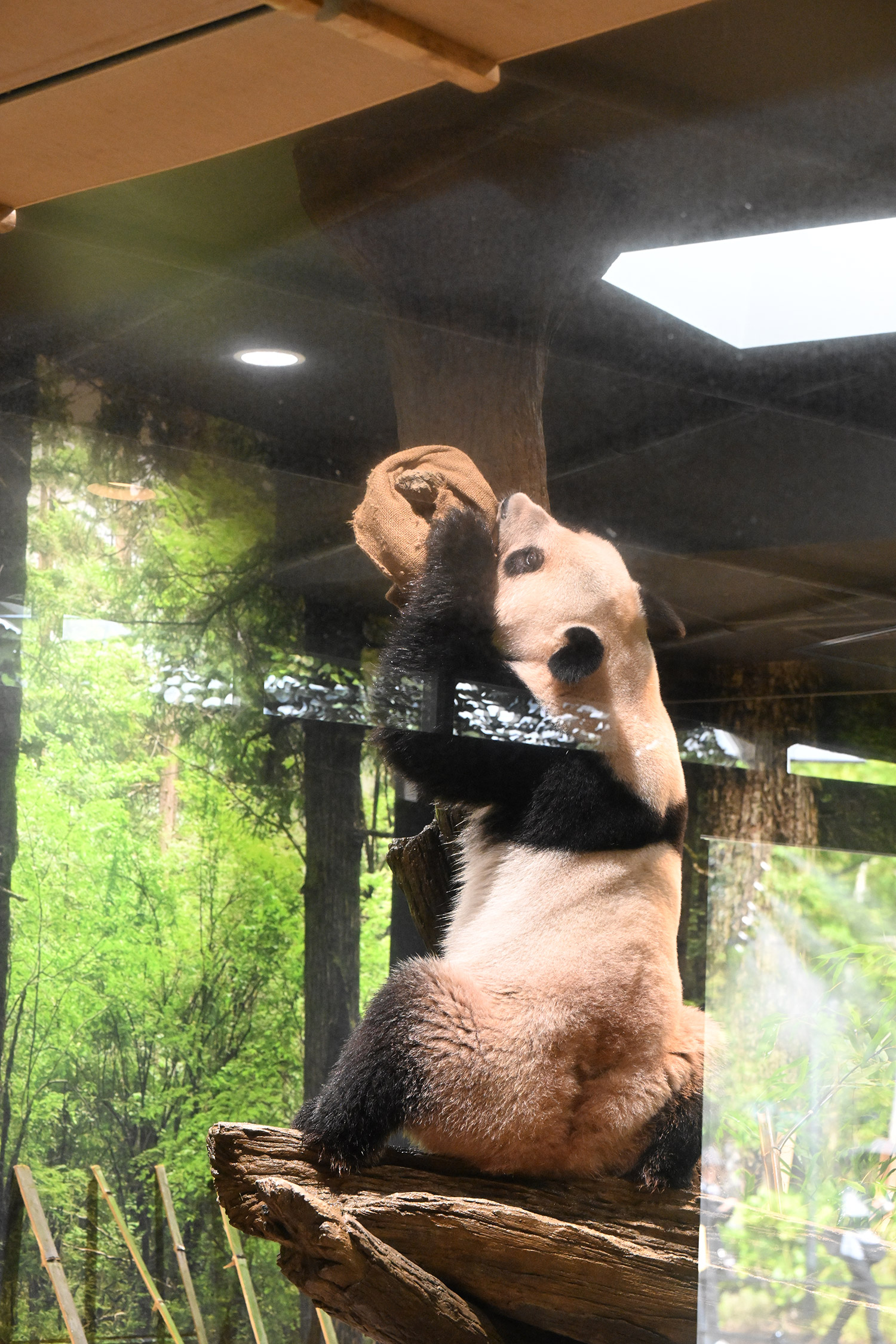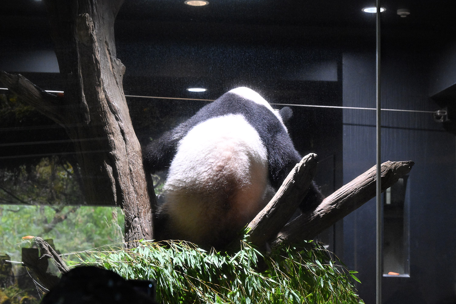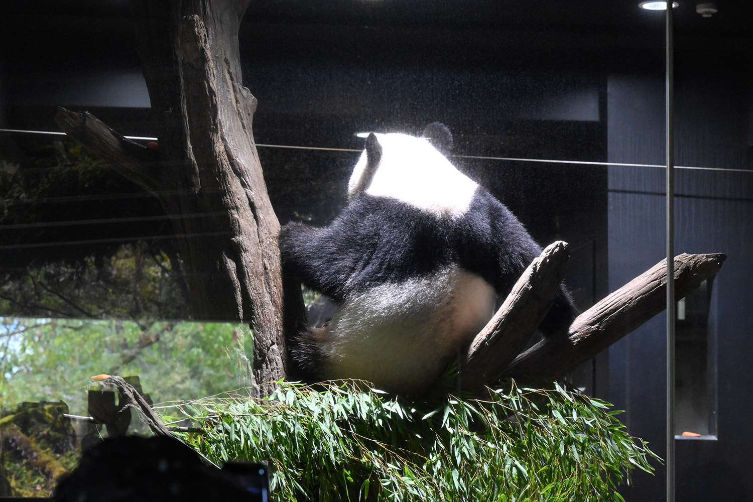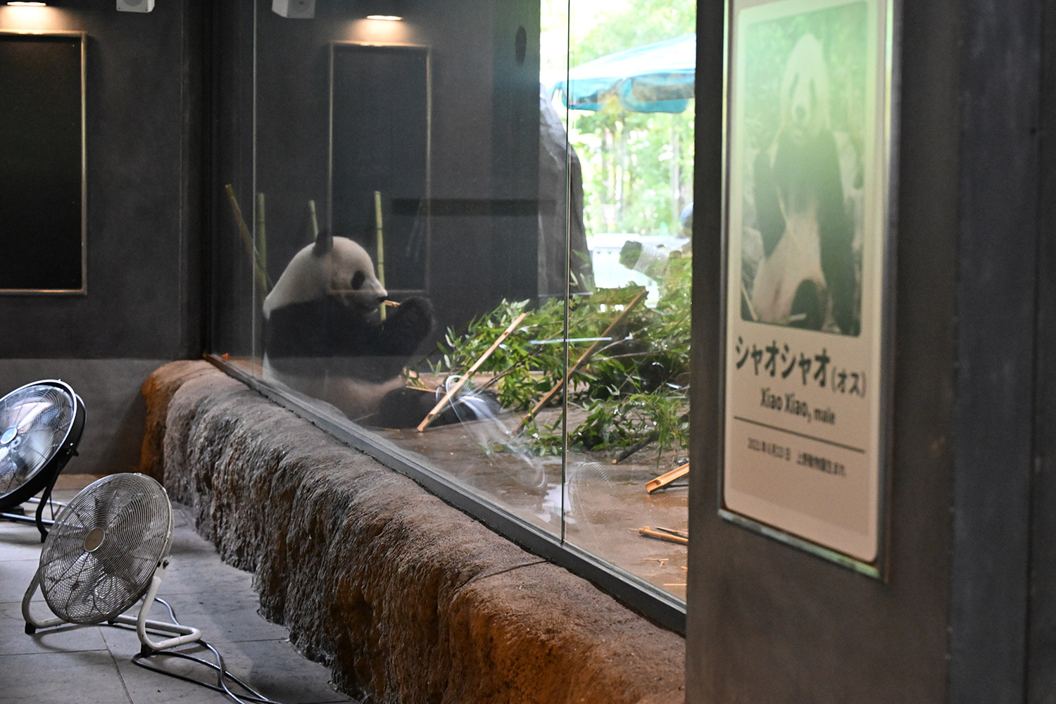 今日のパンダは10:00からです。月曜日の開園日。今日も気温が高めでお部屋展示でした。