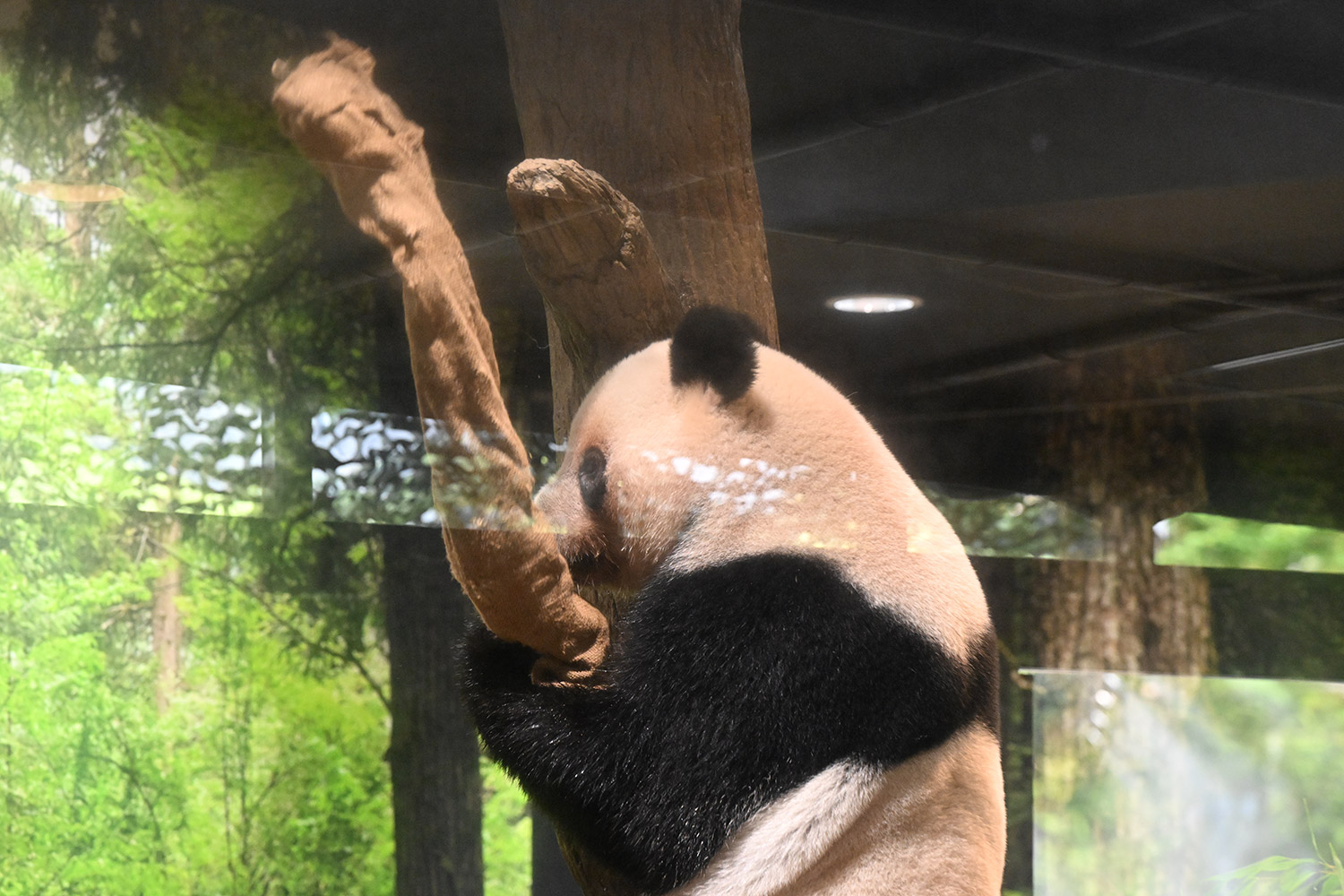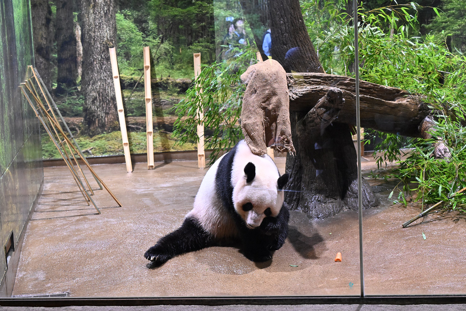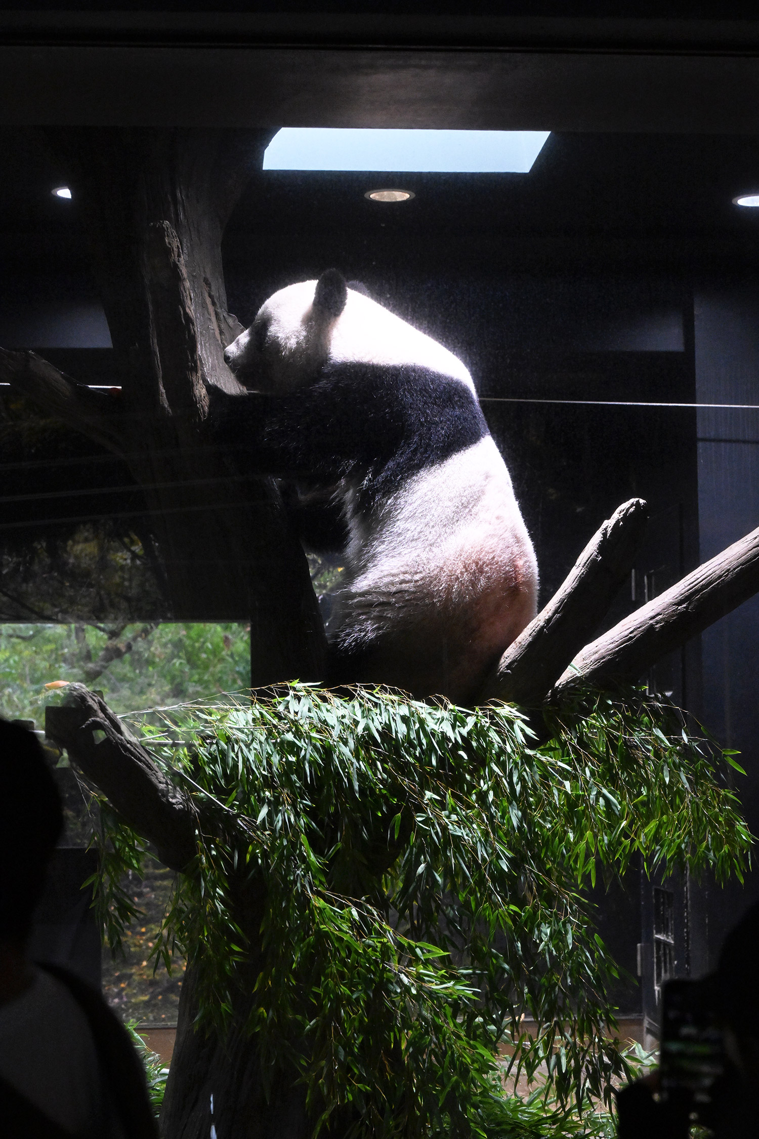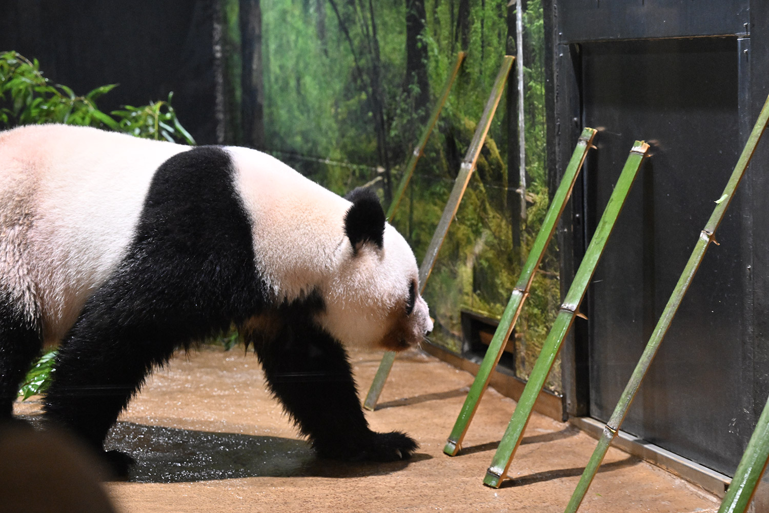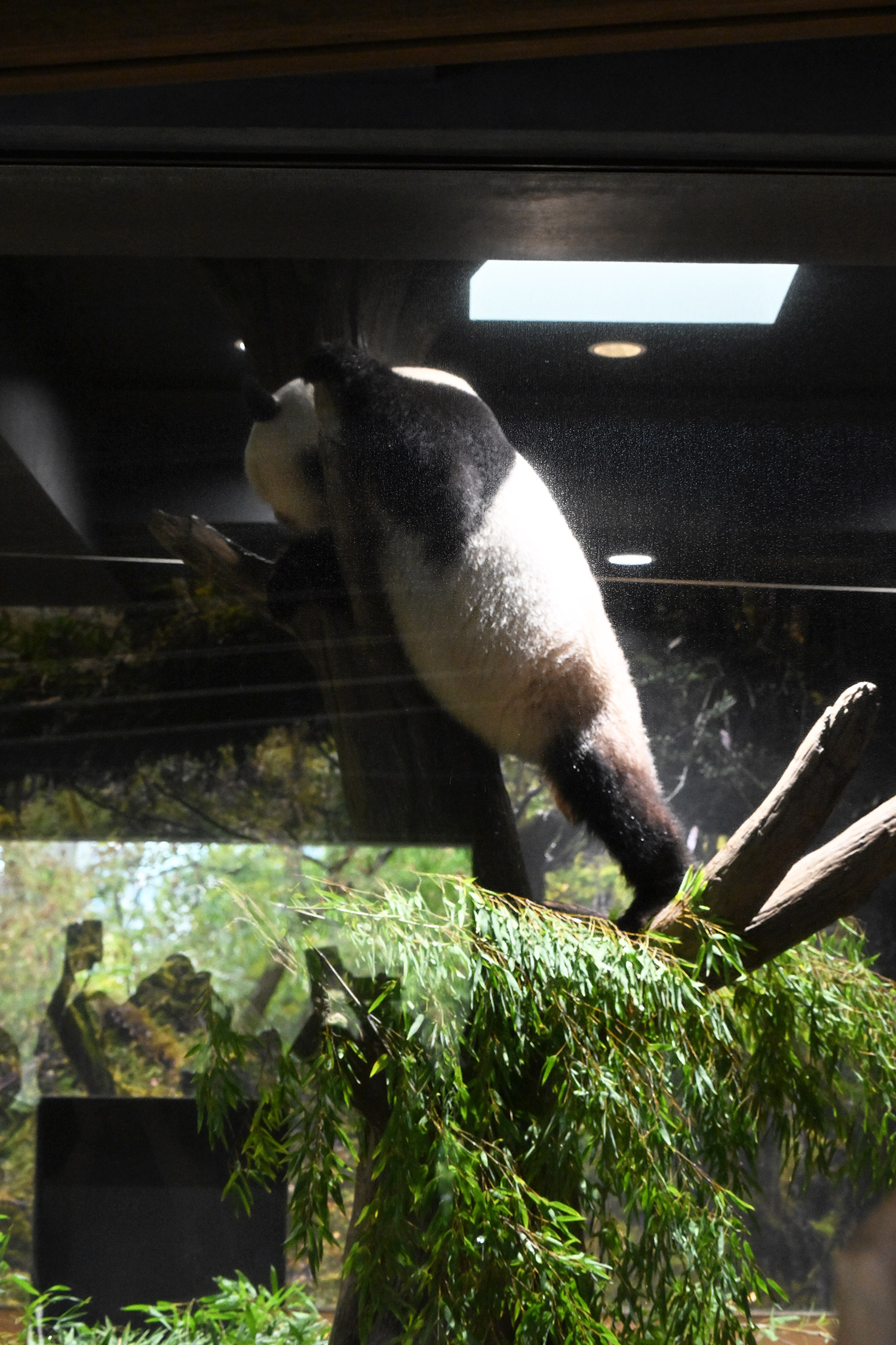 今日のパンダは10:00からです。月曜日の開園日。今日も気温が高めでお部屋展示でした。