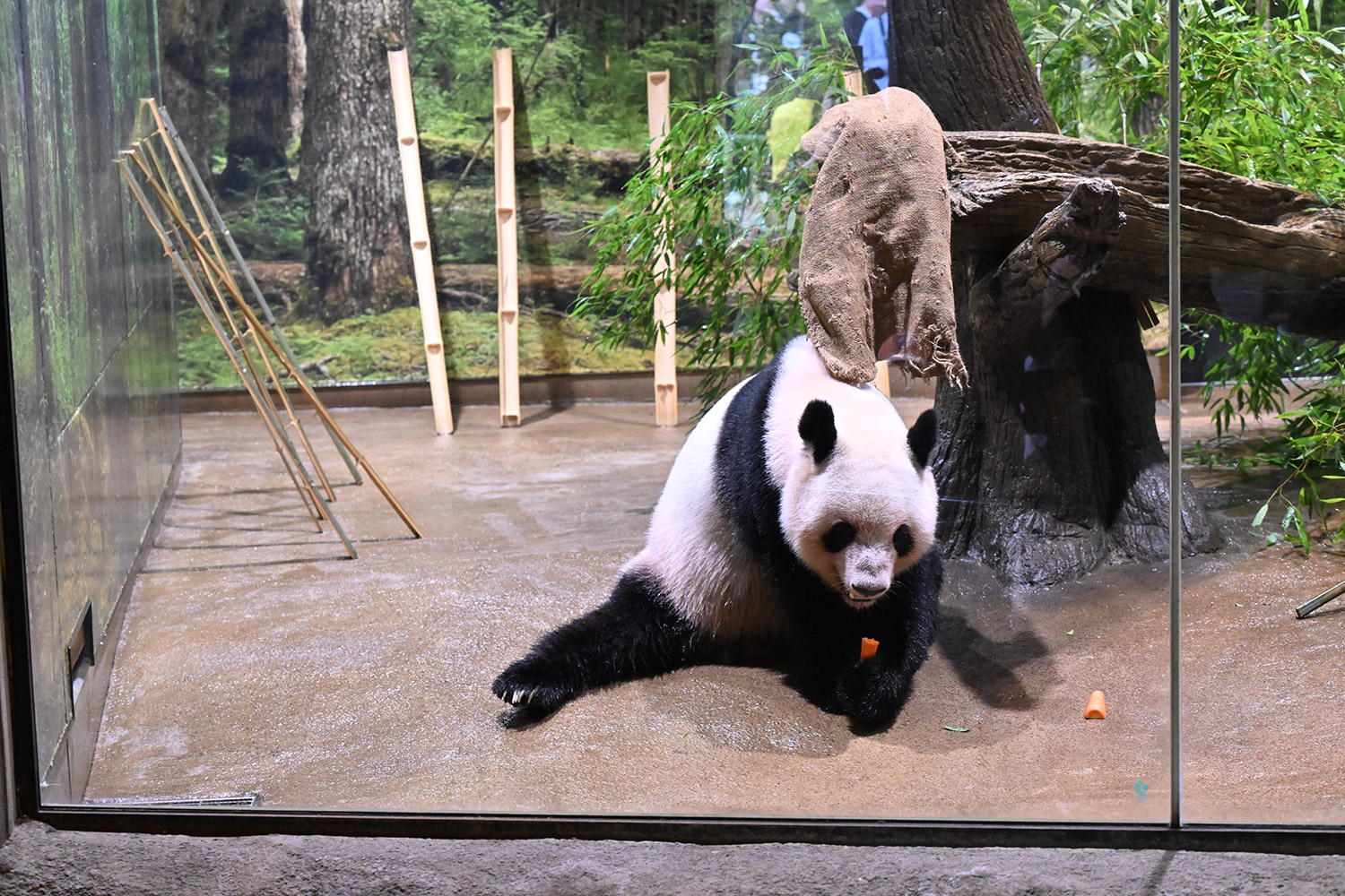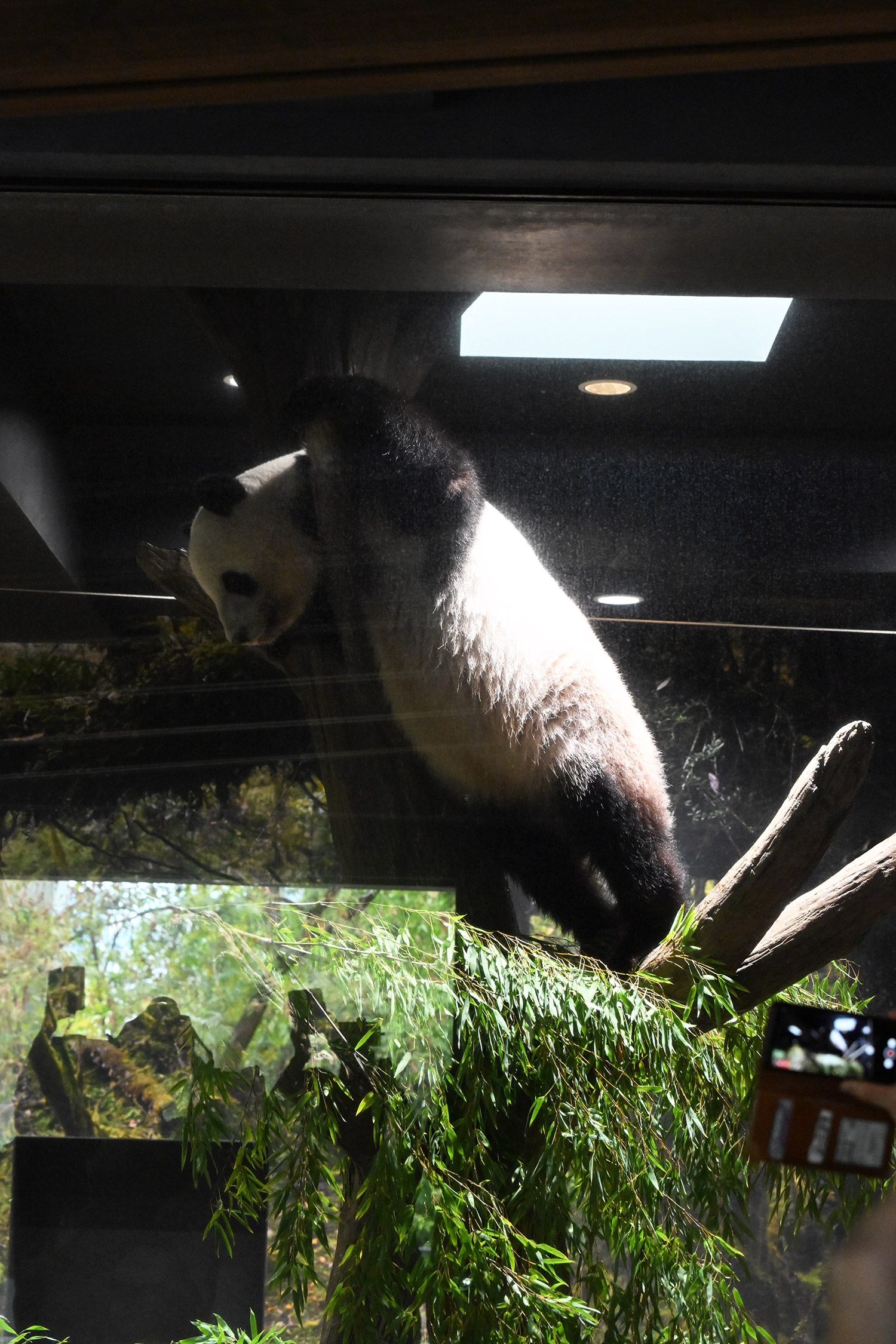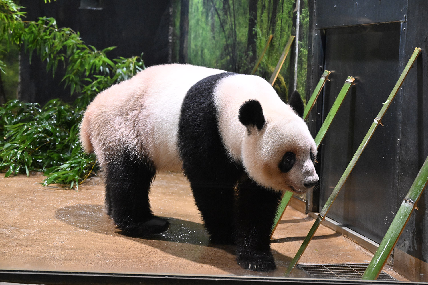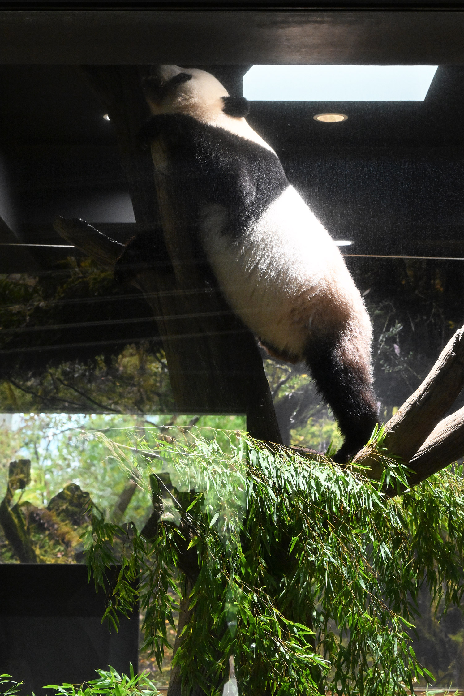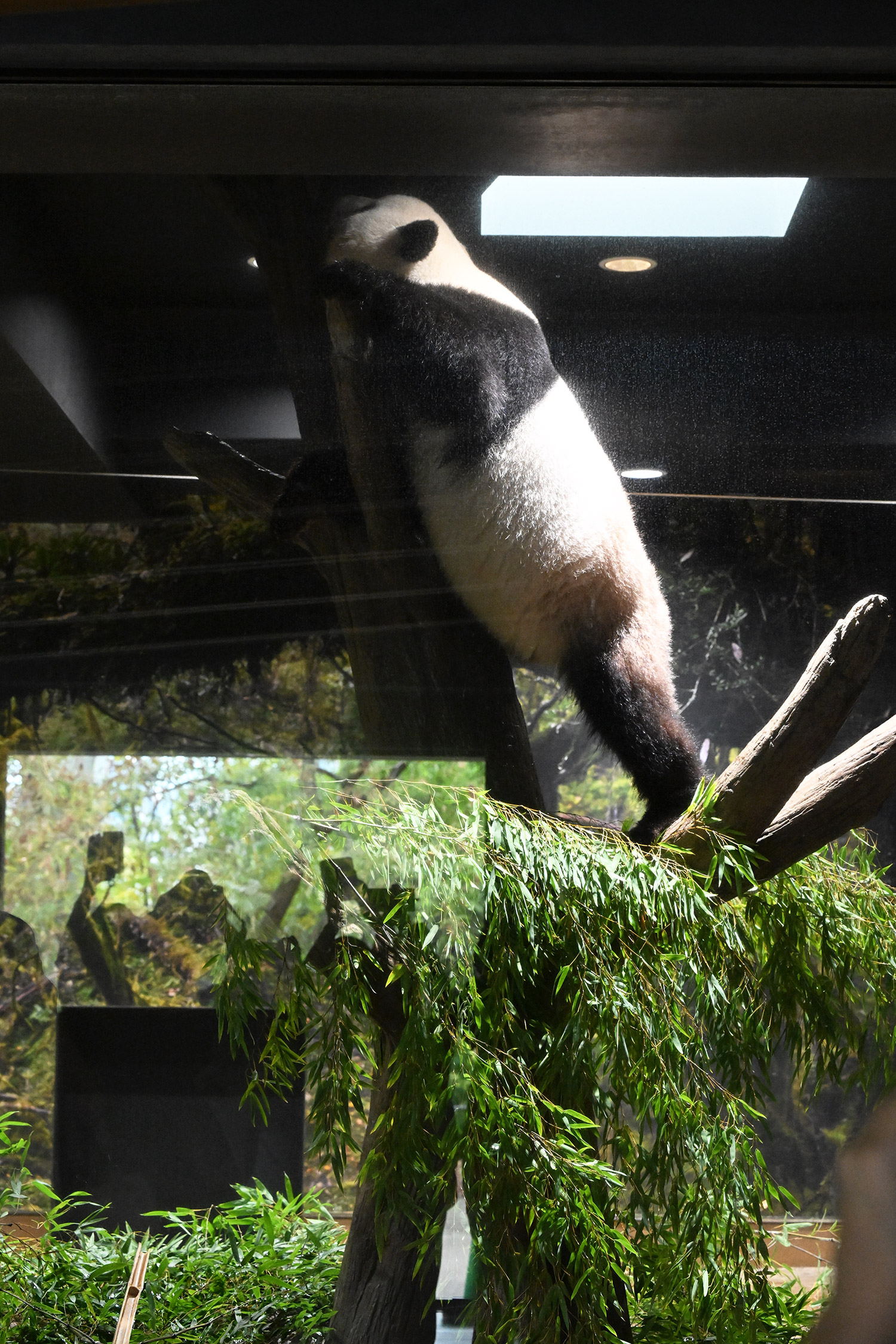今日のパンダは10:00からです。月曜日の開園日。今日も気温が高めでお部屋展示でした。