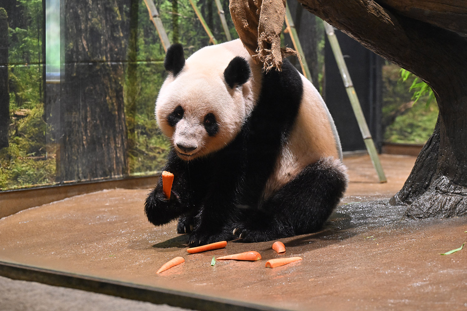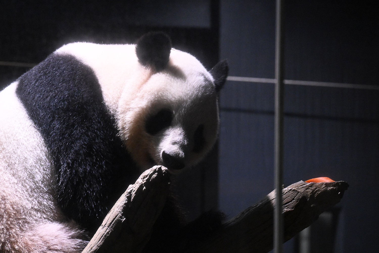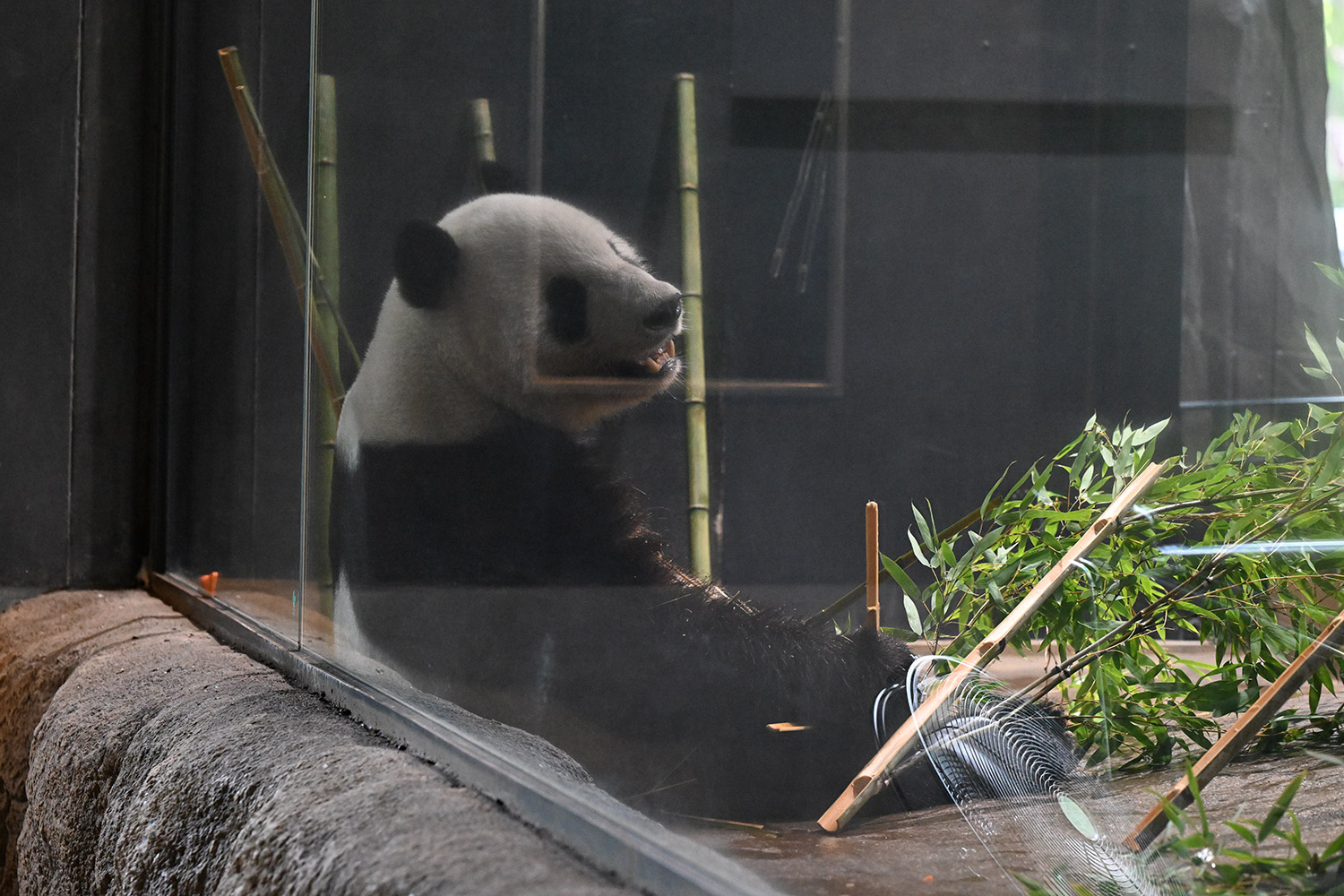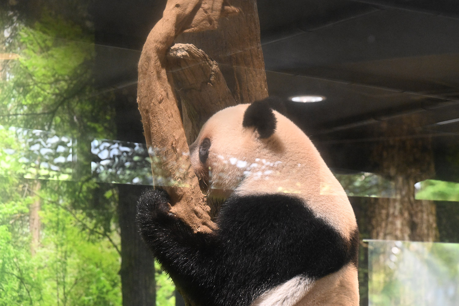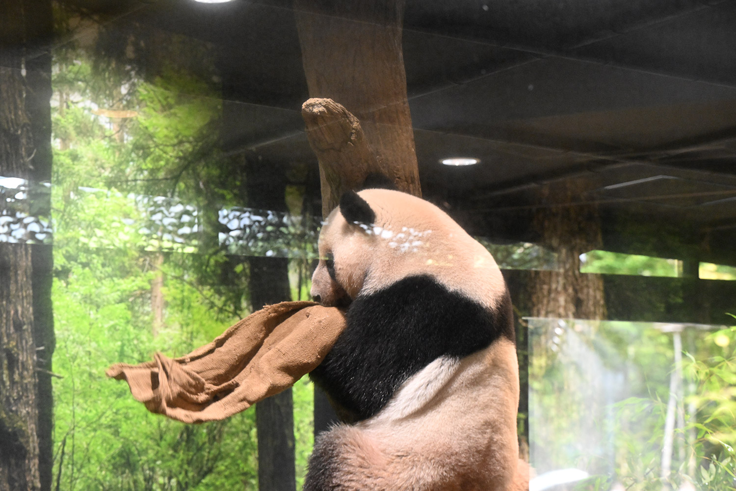 今日のパンダは10:00からです。月曜日の開園日。今日も気温が高めでお部屋展示でした。