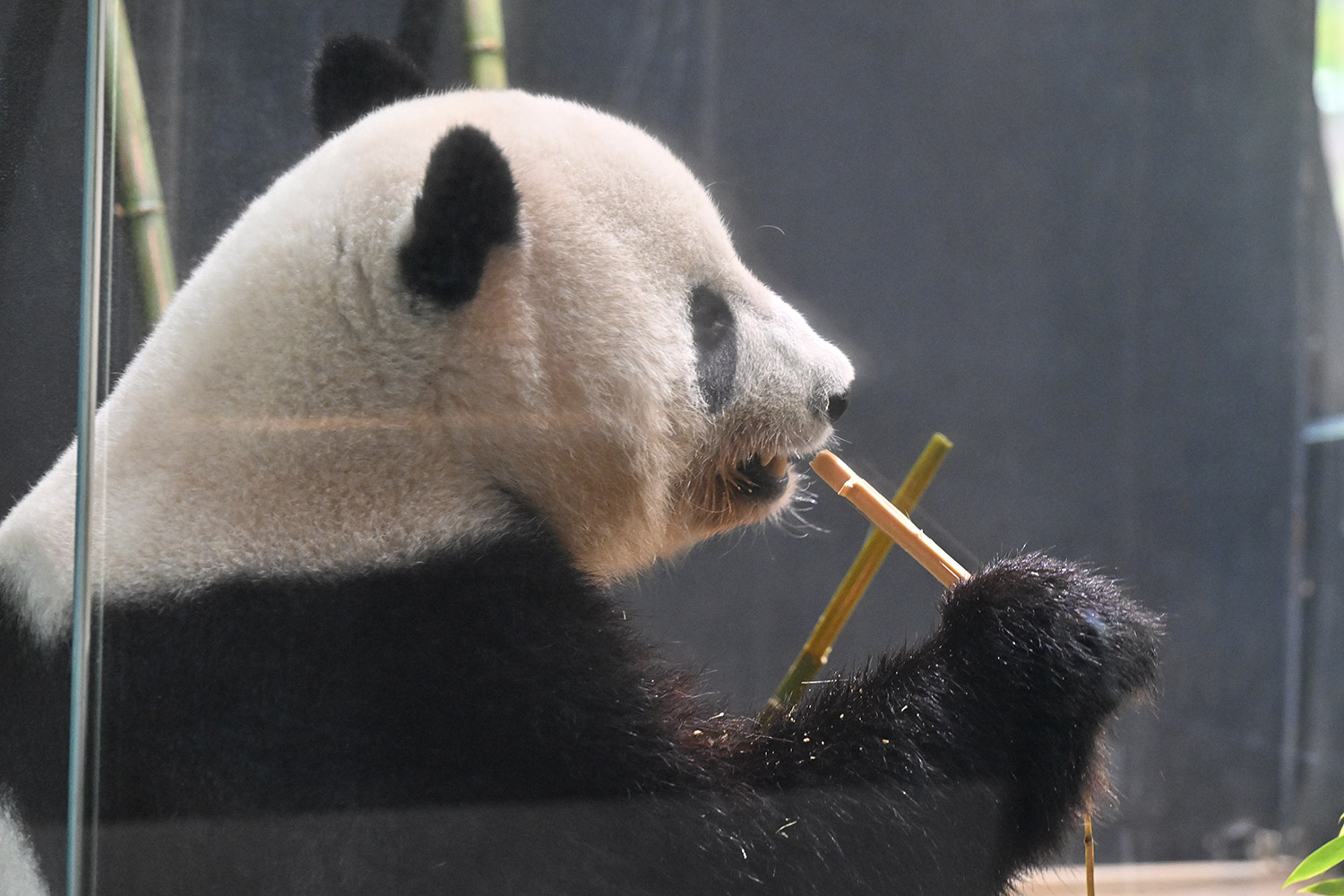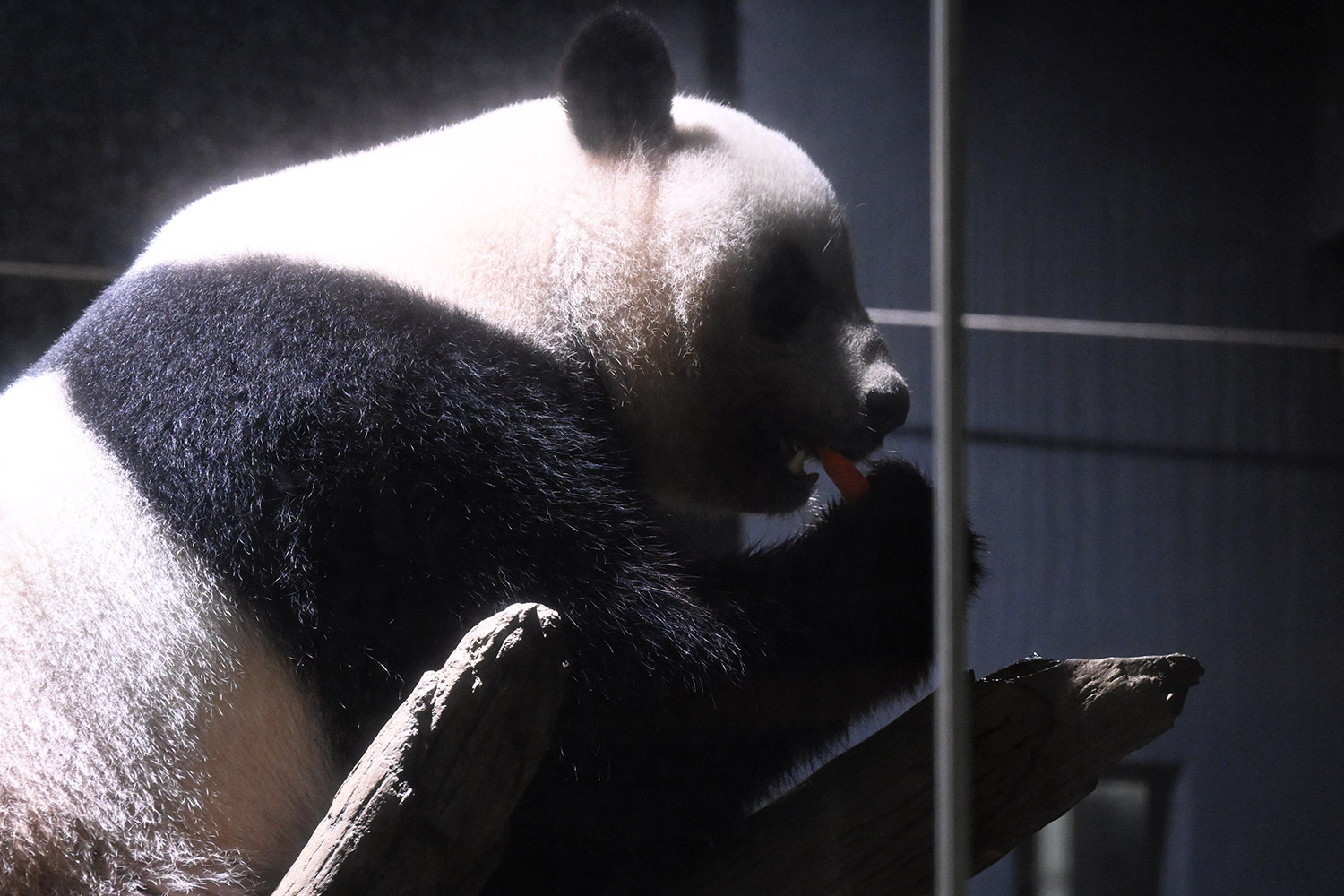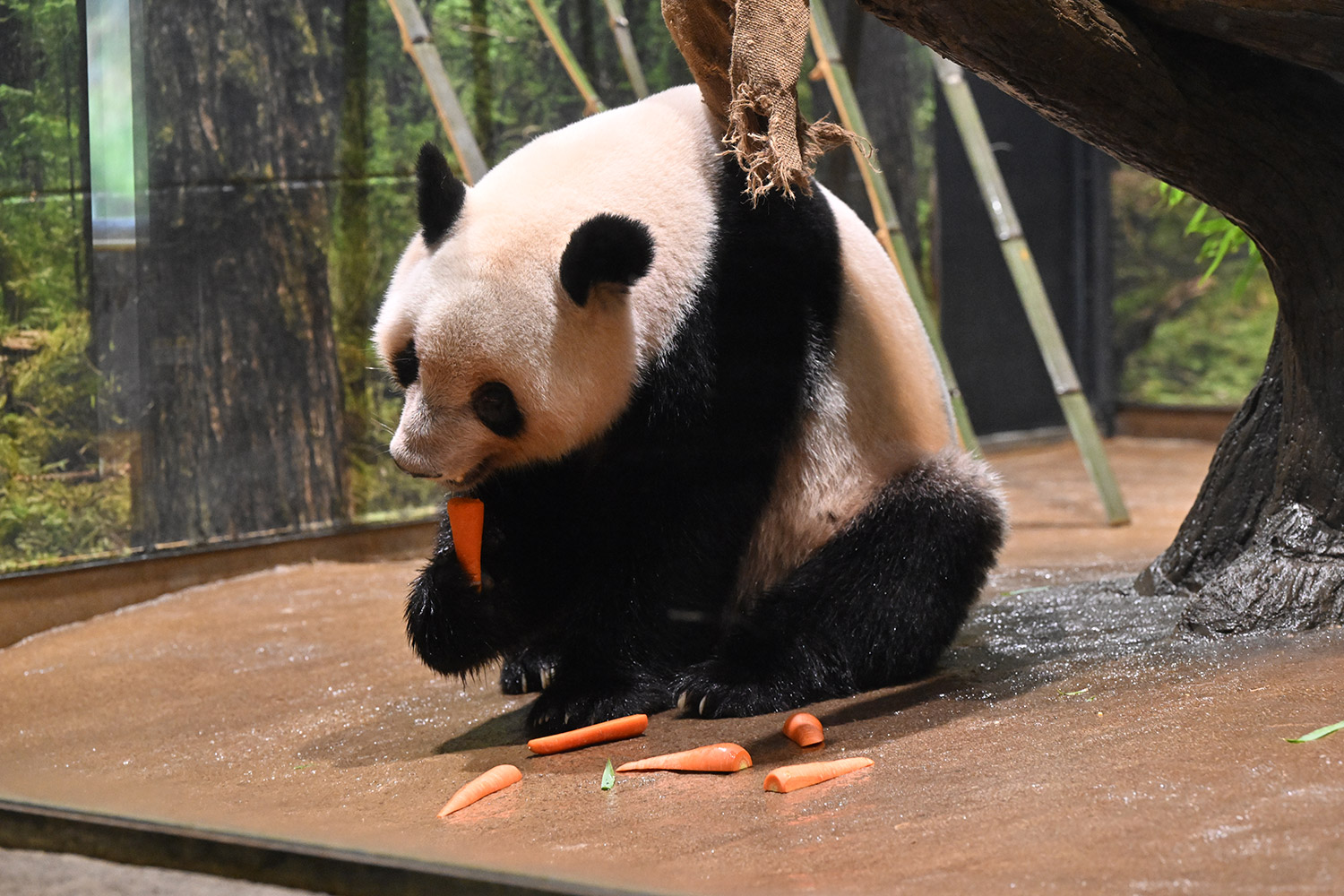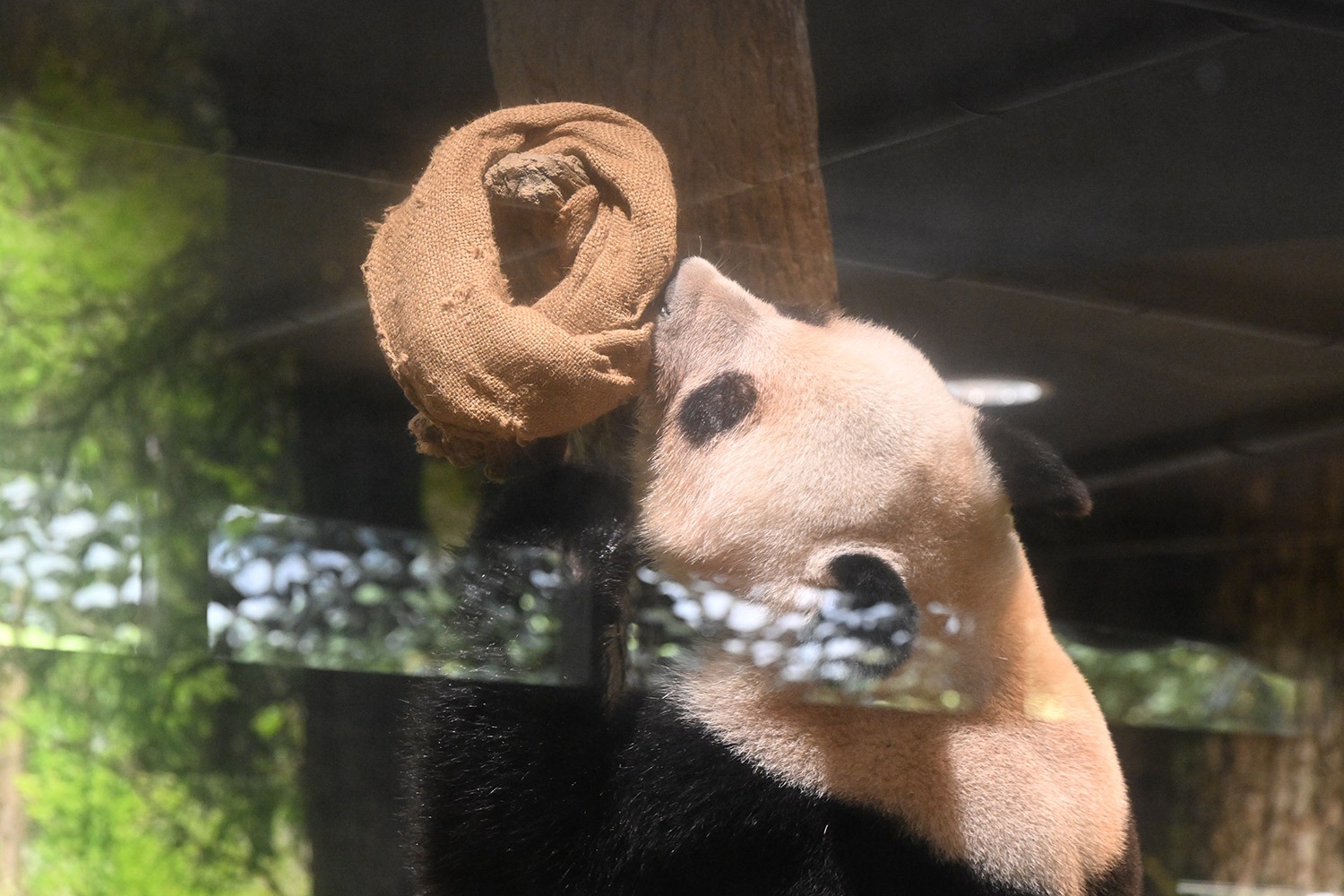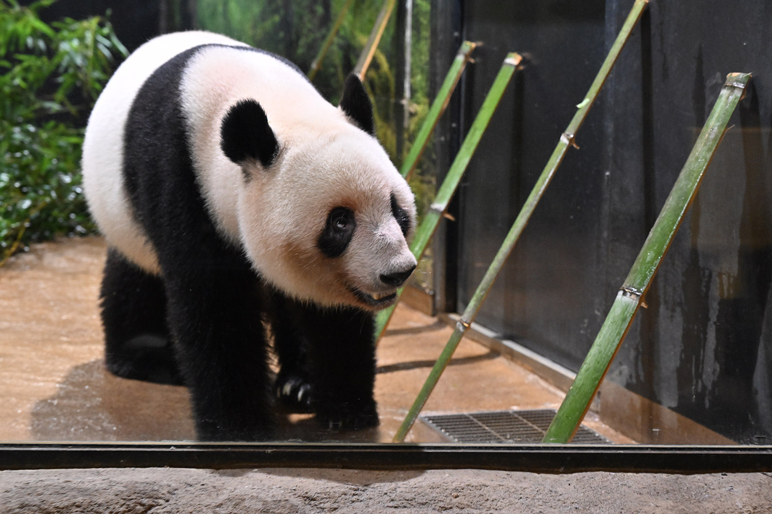 今日のパンダは10:00からです。月曜日の開園日。今日も気温が高めでお部屋展示でした。