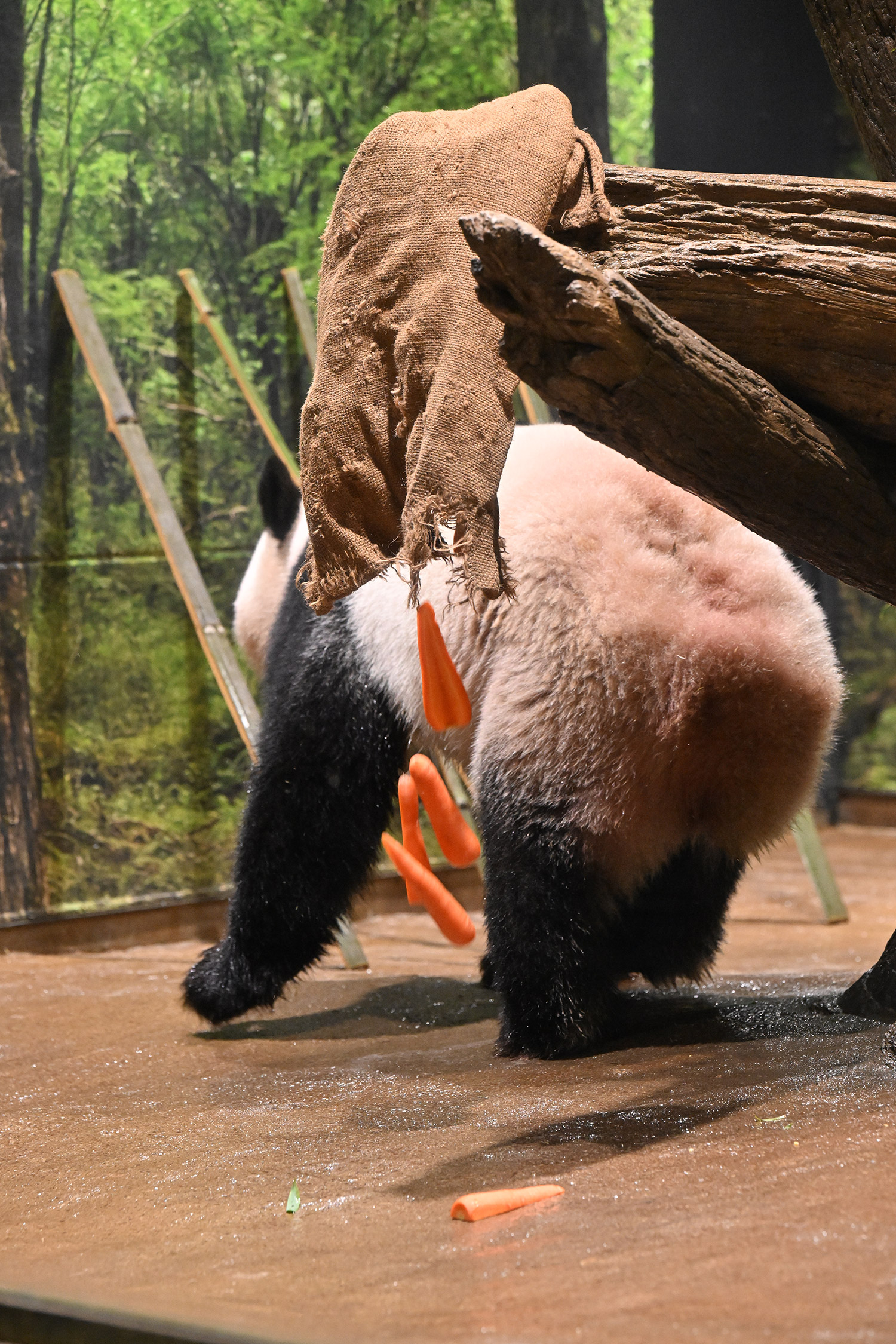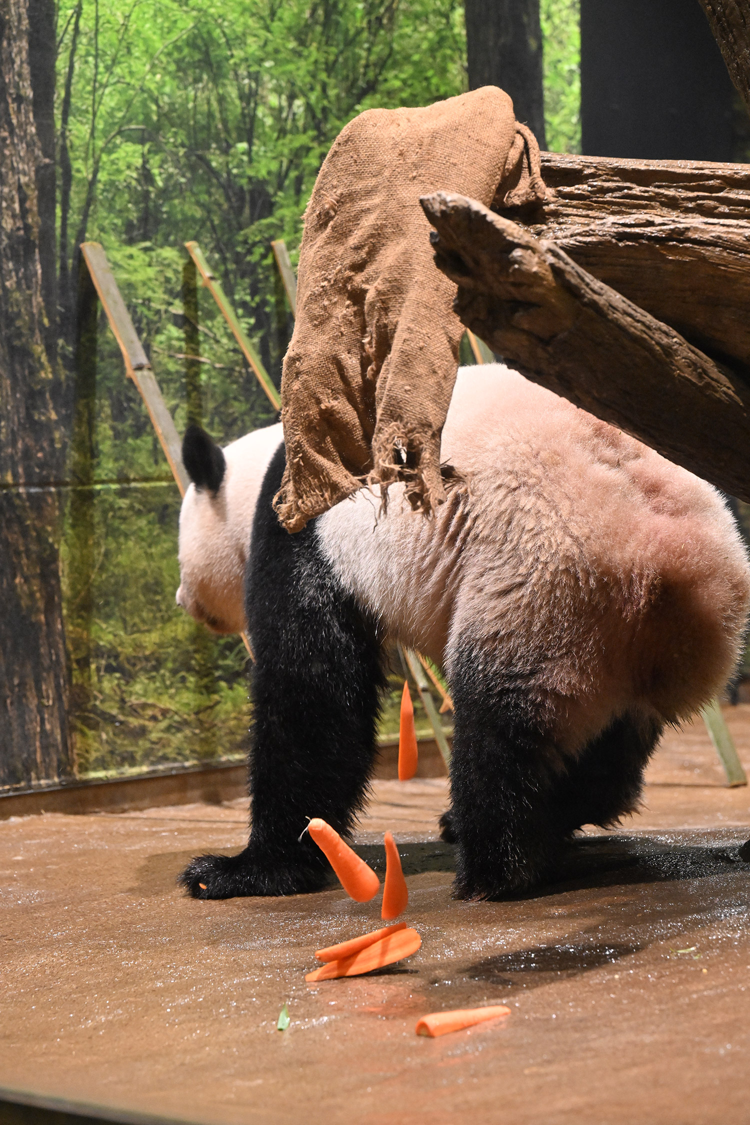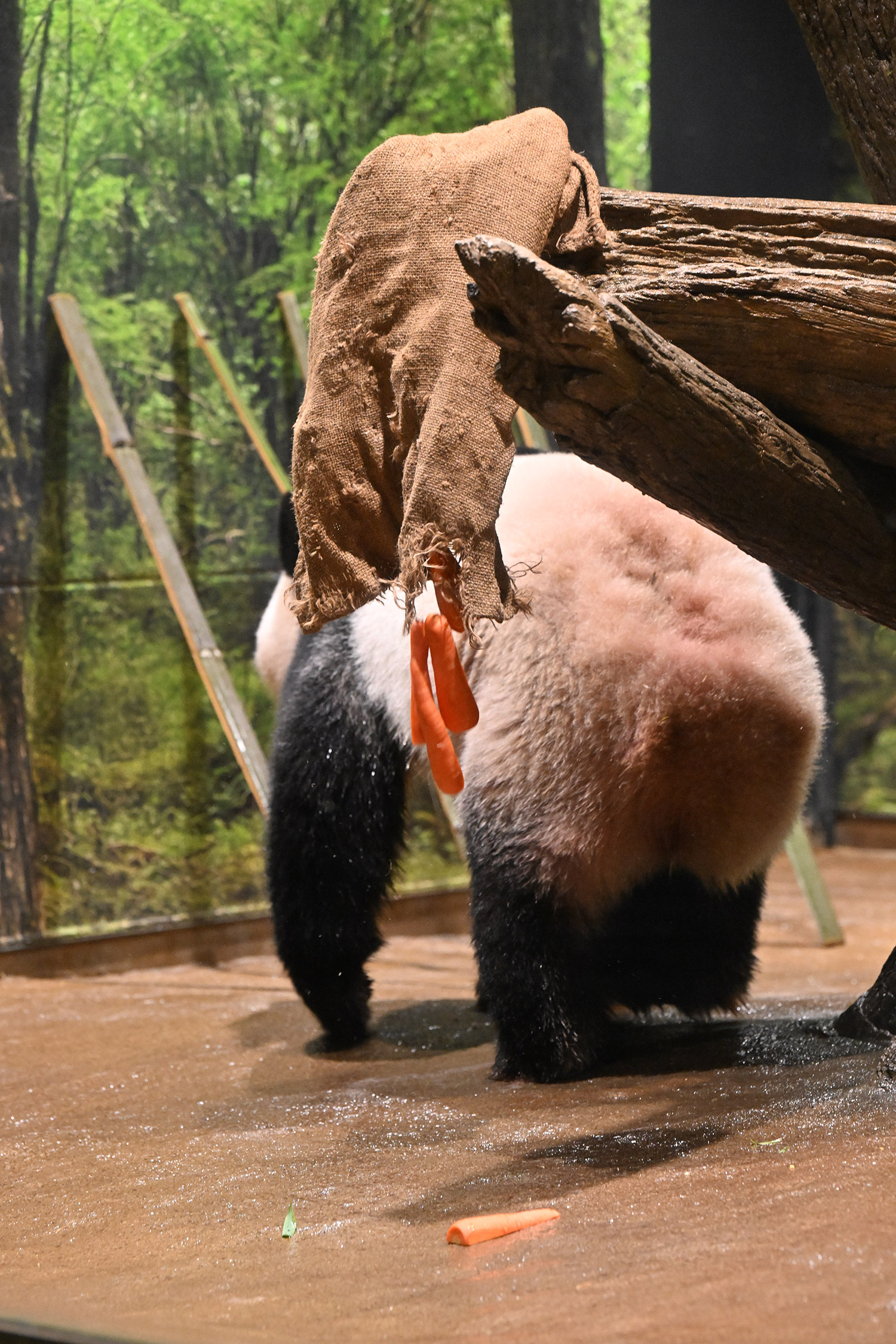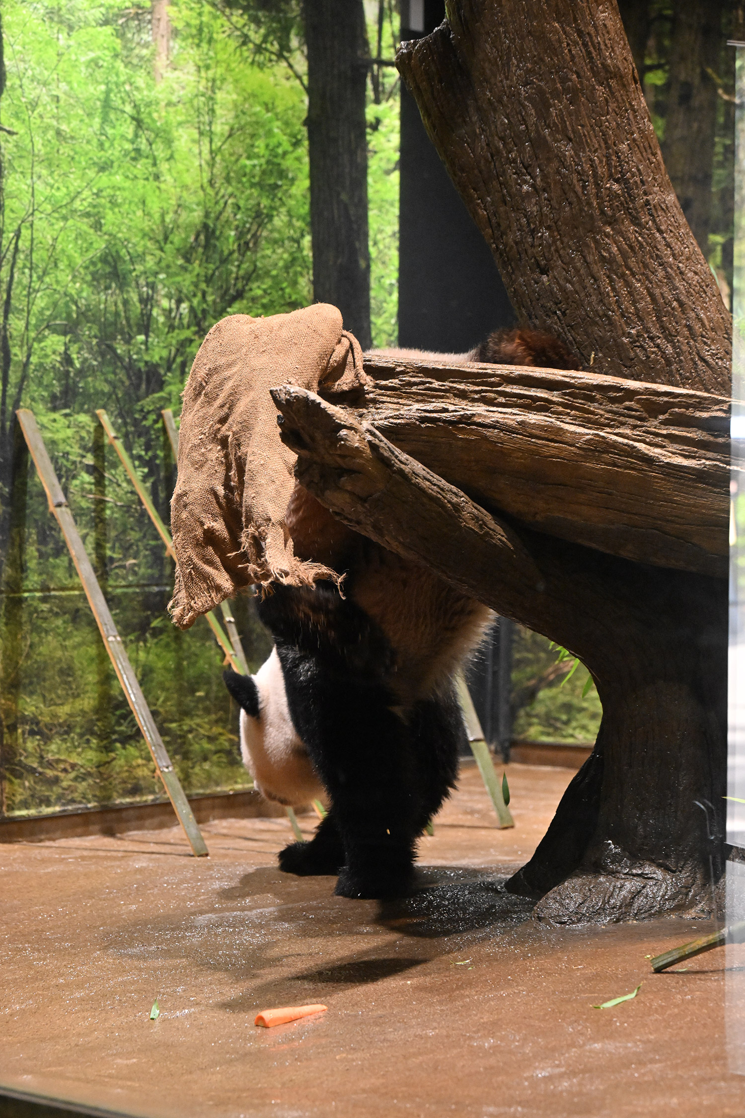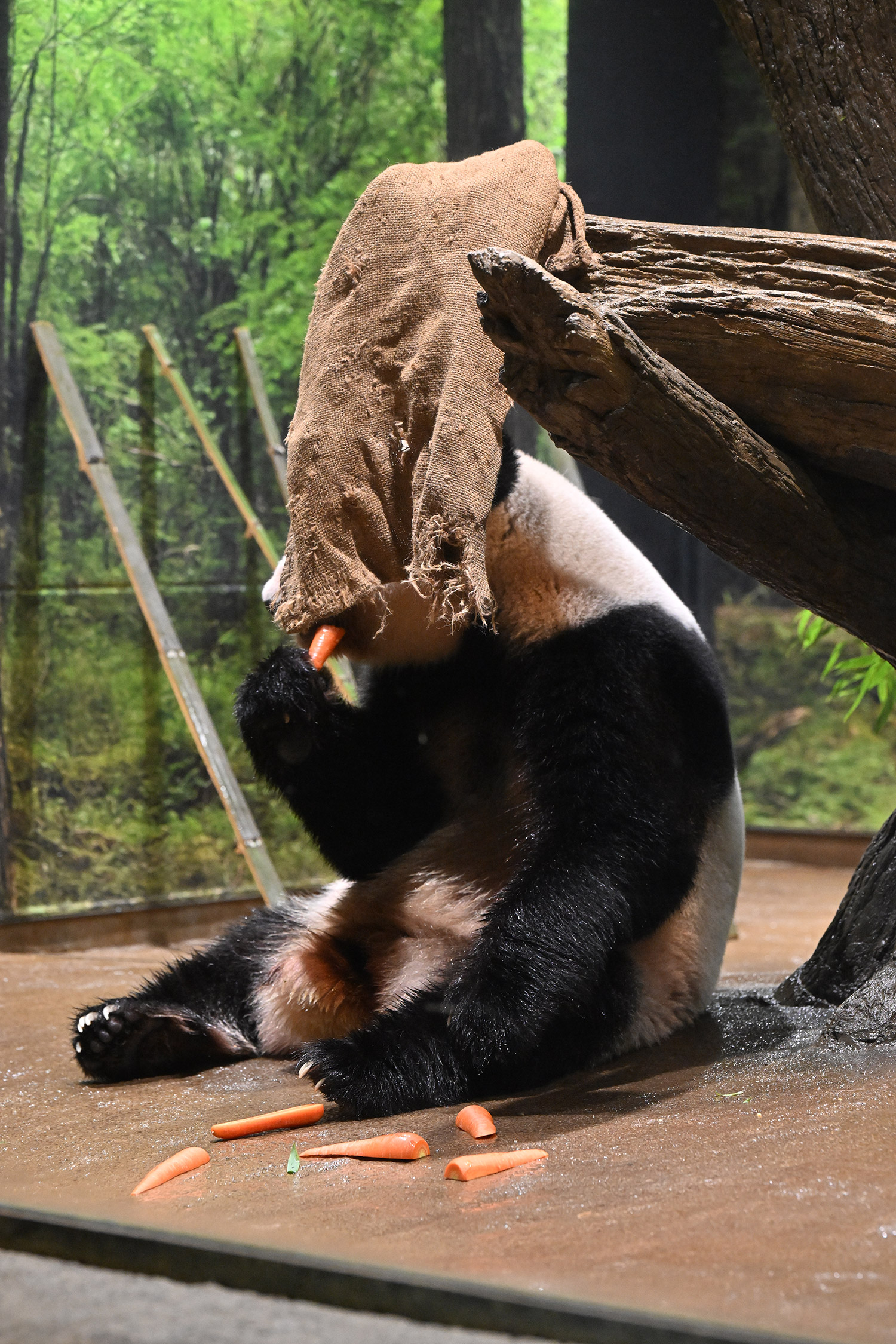 パンダ氏🐼様 皆様こんばんは うわぁー💓凄いなぁ~ 麻袋で絶妙にレイちゃんのお顔が隠れて 麻袋が🥕人参を食べているみたいな この瞬間!この場に氏様がおられる奇跡✨このお写真は 氏様にしか撮影できないと思いました人参 踊るように 落ちていく感じ 素敵です シャオのお腹~💚 ぷっくりで可愛いですねー シャオの後頭部って 特別なビームが出ているのか 心がほどけていく感じが致します 北陸のみっちゃん様 ピースの人形 今年は応募しました 教えてくださり本当にありがとうございます 日立パンダフェス 応援しながら 氏様の写真展を又開催していただきたいと心から思っています