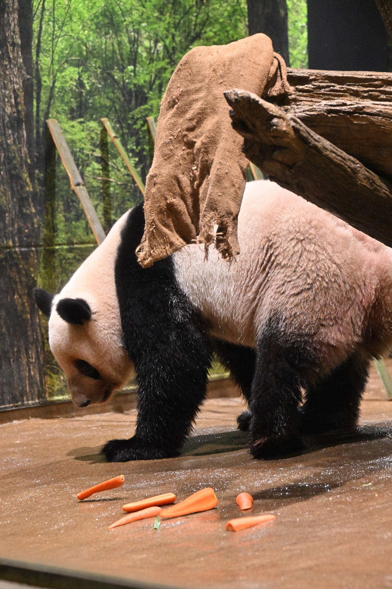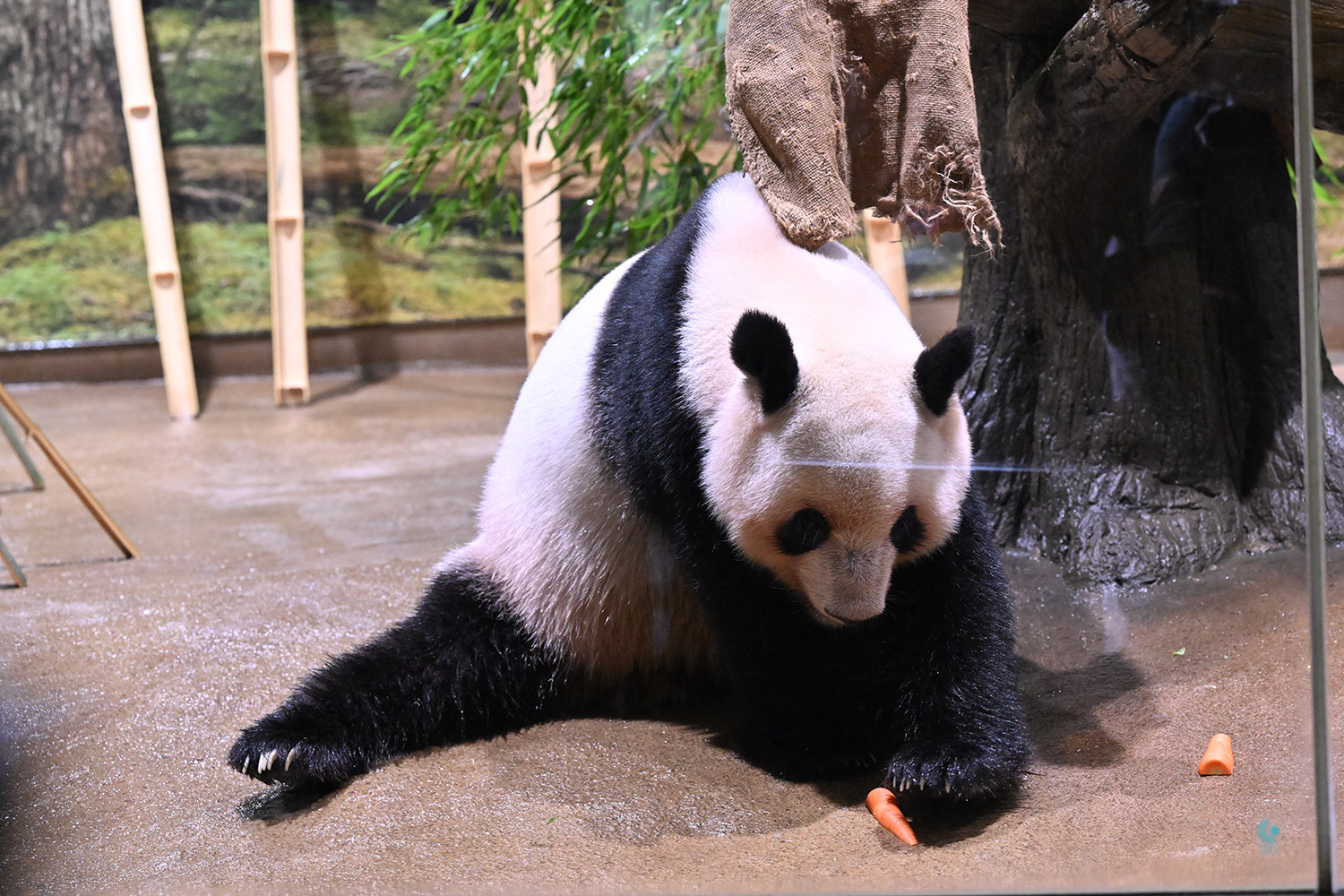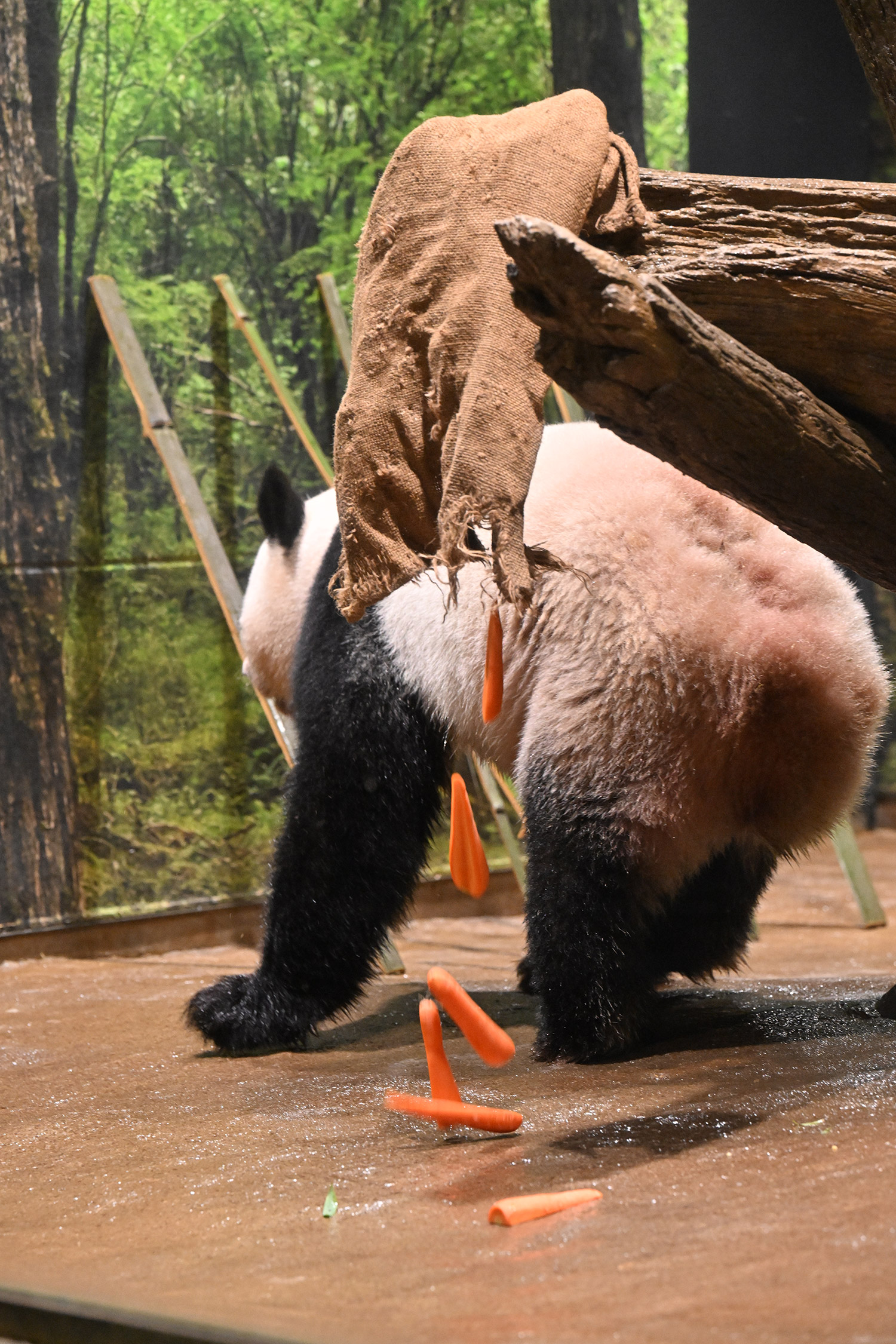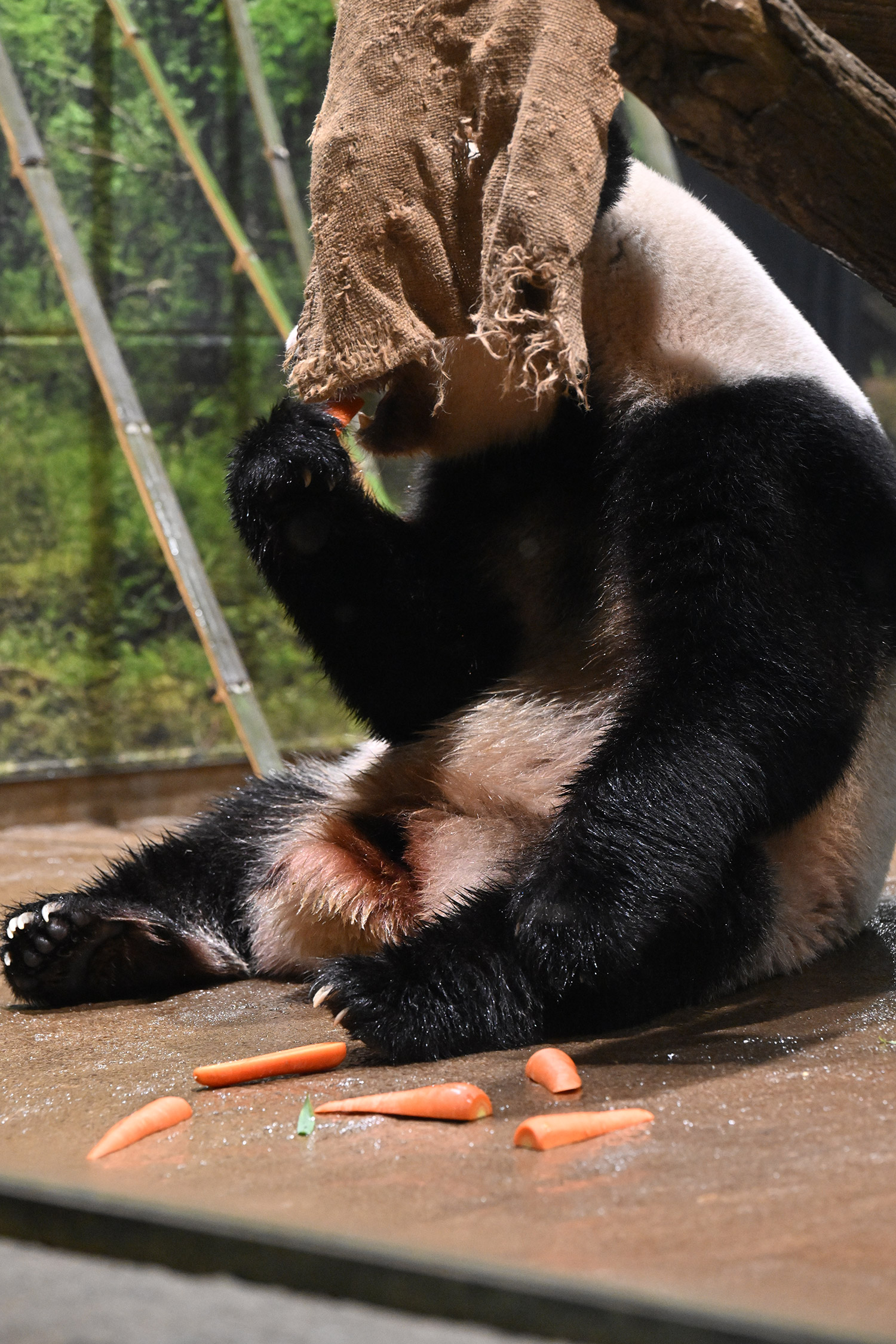 パンダ氏🐼様 皆様こんばんは うわぁー💓凄いなぁ~ 麻袋で絶妙にレイちゃんのお顔が隠れて 麻袋が🥕人参を食べているみたいな この瞬間!この場に氏様がおられる奇跡✨このお写真は 氏様にしか撮影できないと思いました人参 踊るように 落ちていく感じ 素敵です シャオのお腹~💚 ぷっくりで可愛いですねー シャオの後頭部って 特別なビームが出ているのか 心がほどけていく感じが致します 北陸のみっちゃん様 ピースの人形 今年は応募しました 教えてくださり本当にありがとうございます 日立パンダフェス 応援しながら 氏様の写真展を又開催していただきたいと心から思っています