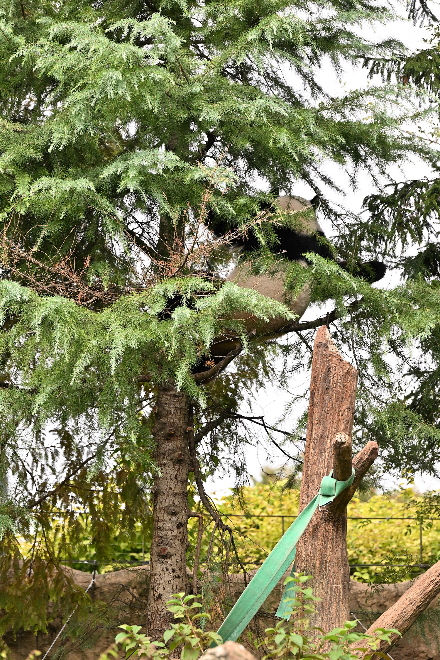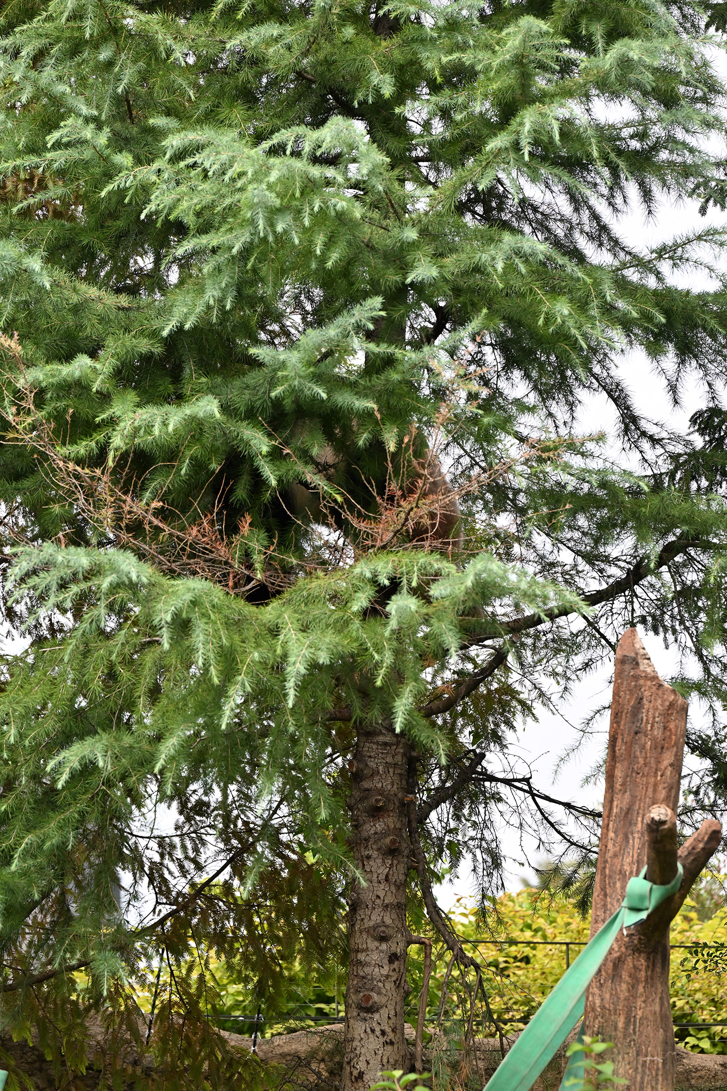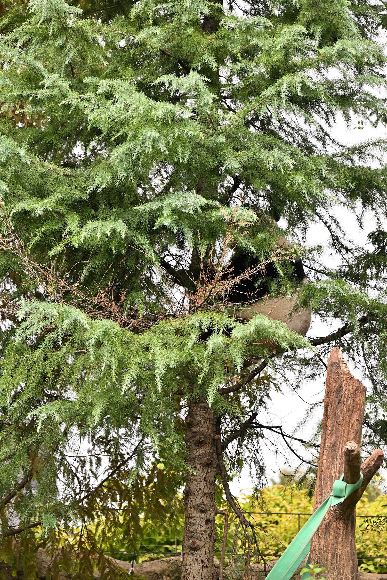 スイッチオン!ぐんぐん木登り🌳細い木の枝でひと休み(100kg超 重すぎない??ヒヤヒヤ)高い木(ヒマラヤスギ?)の中かくれんぼ うじ様お写真でシャオはどこ?あ!いた〜!木と一体化!楽しいー♪