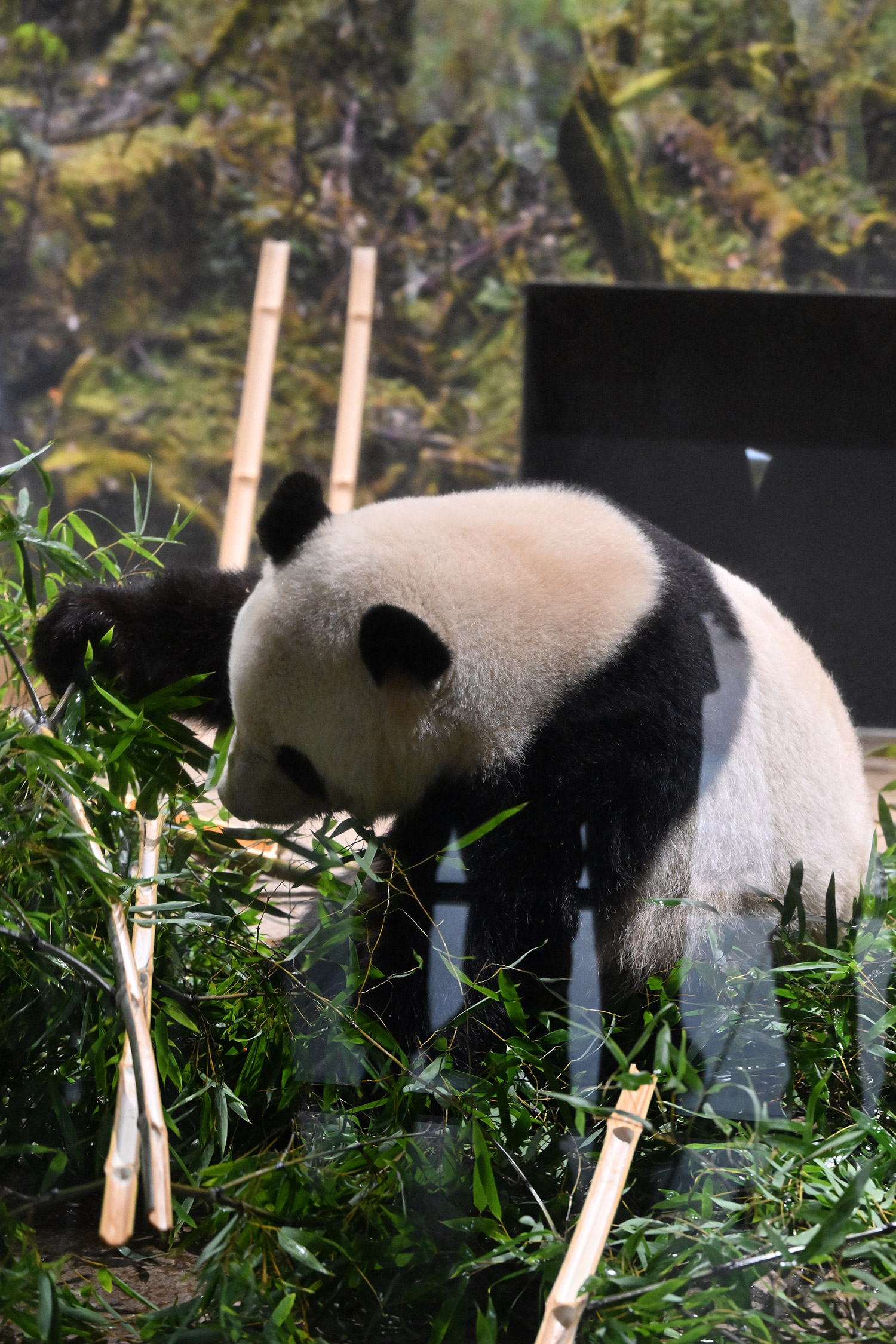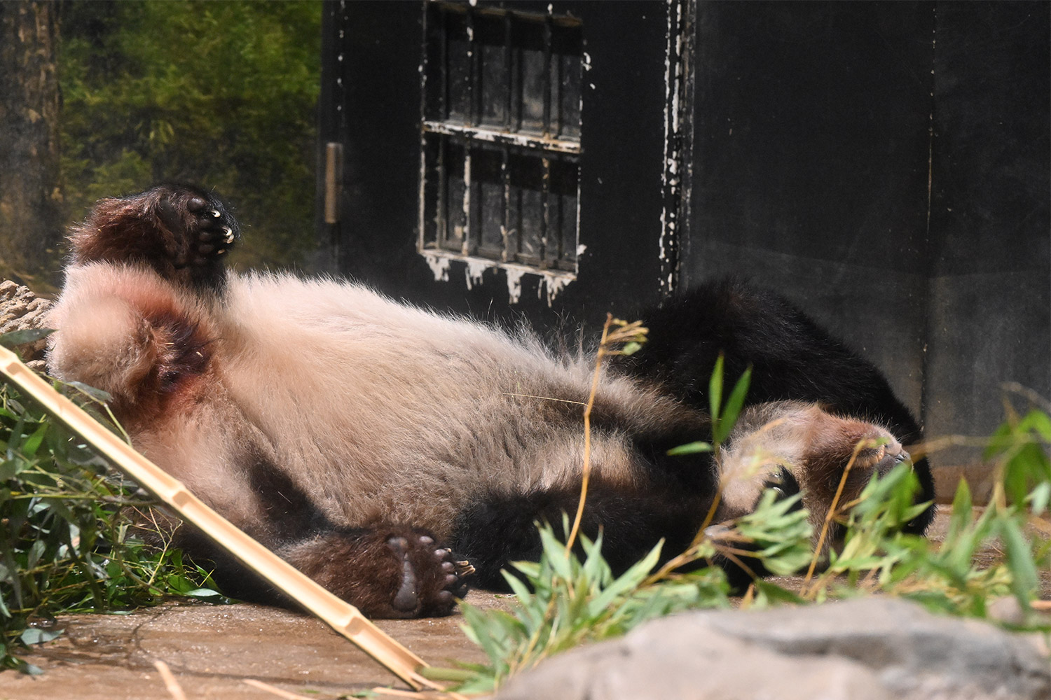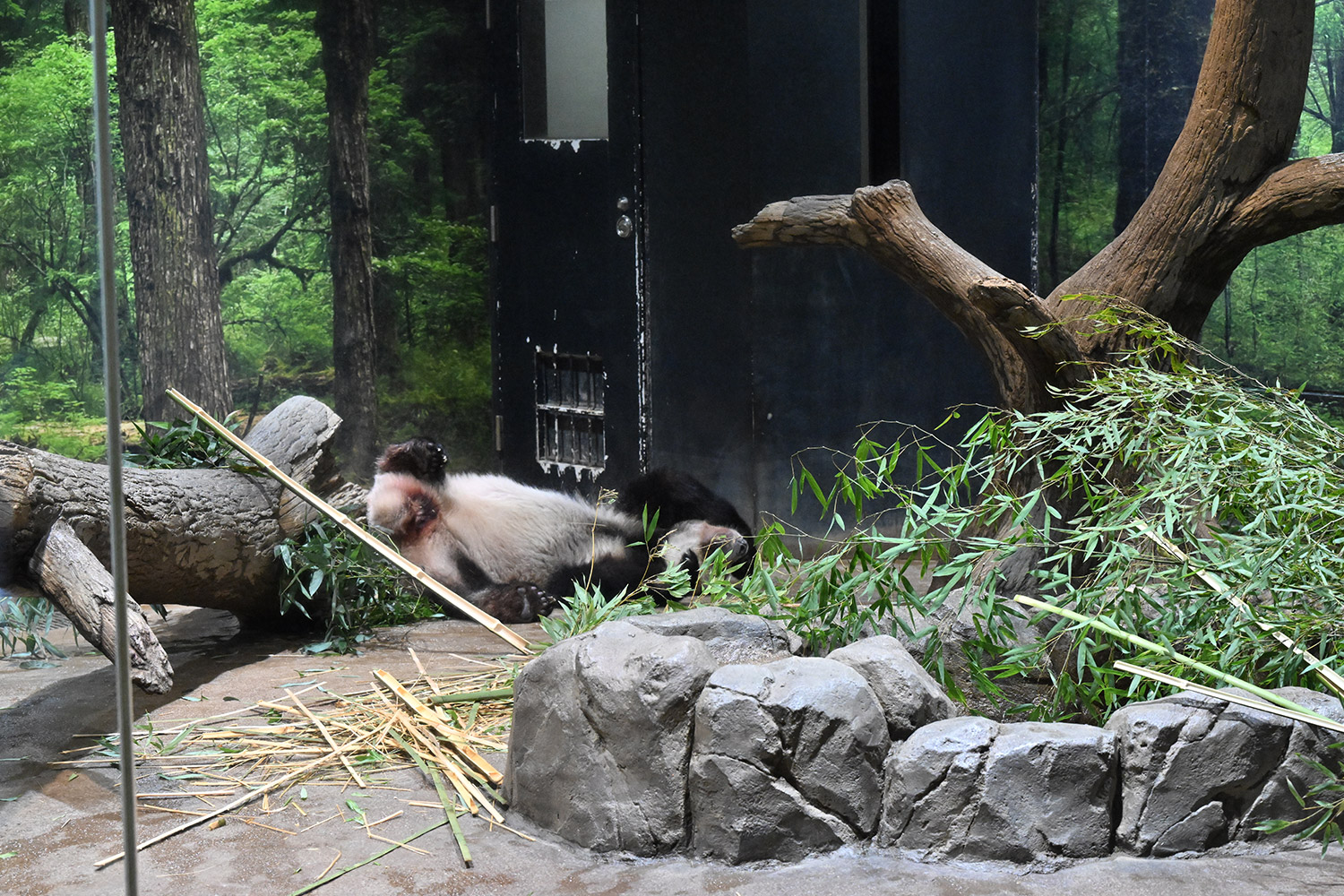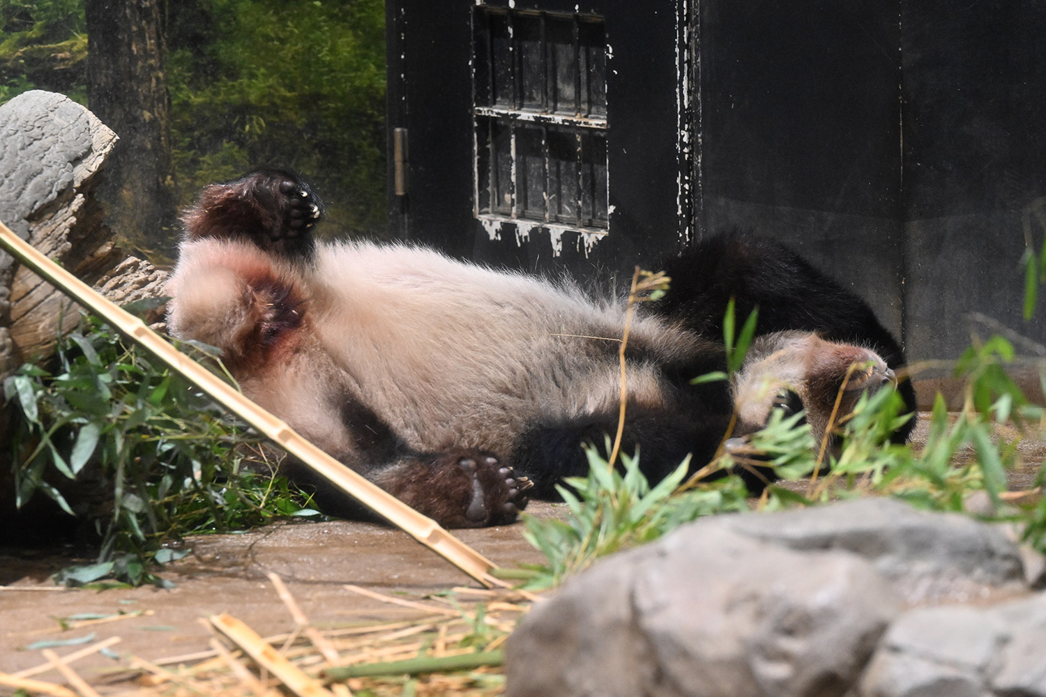 おはようございます。4枚目のシャオシャオの左脚と写り込んだお客さんの頭部が重なって、のけぞってモゾモゾする幻の小ちゃい🐼さんが見えますね😆レイレイのヘソ天寝、片脚が上がっているところにタンタンお嬢様の寝相を思い出しました。