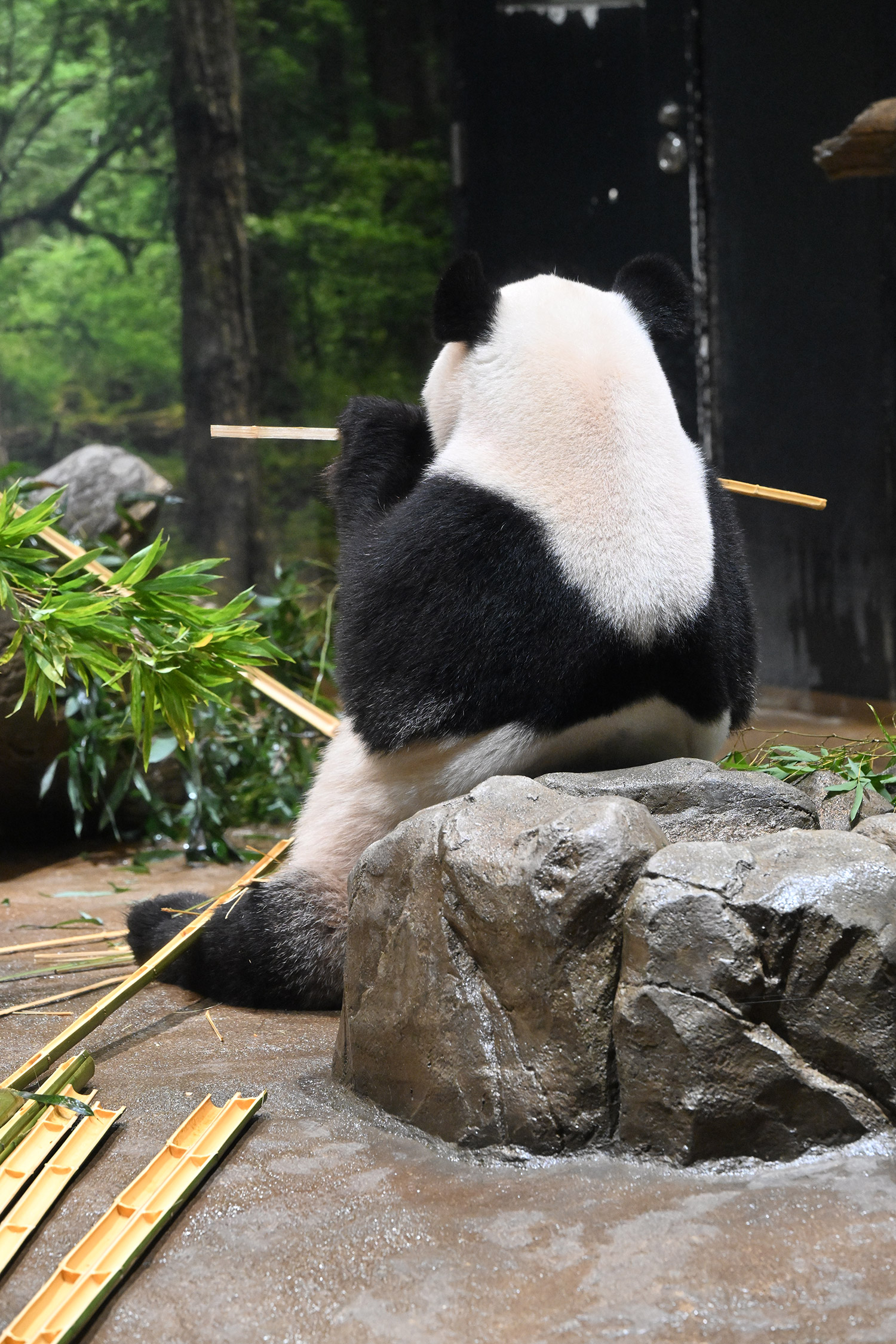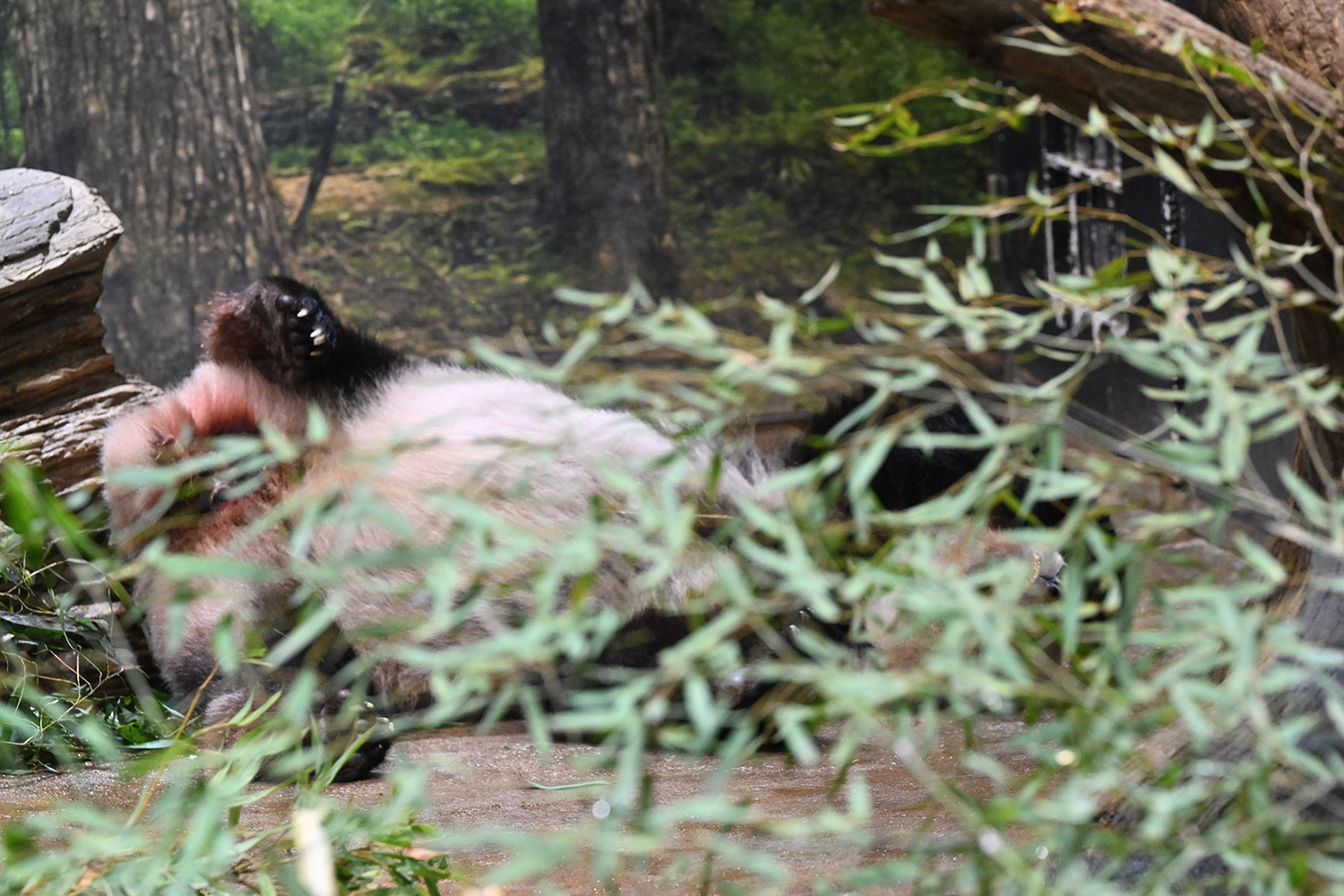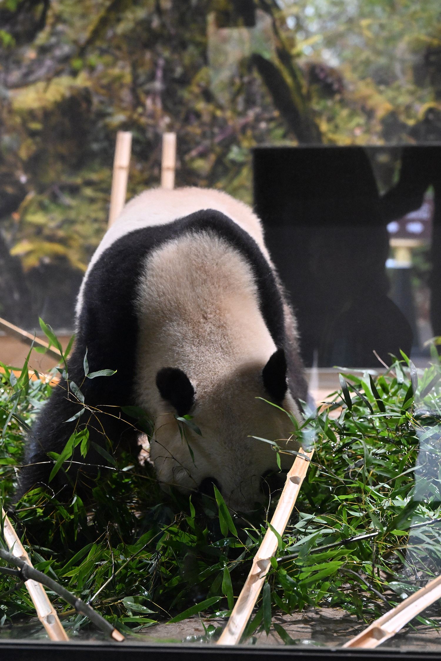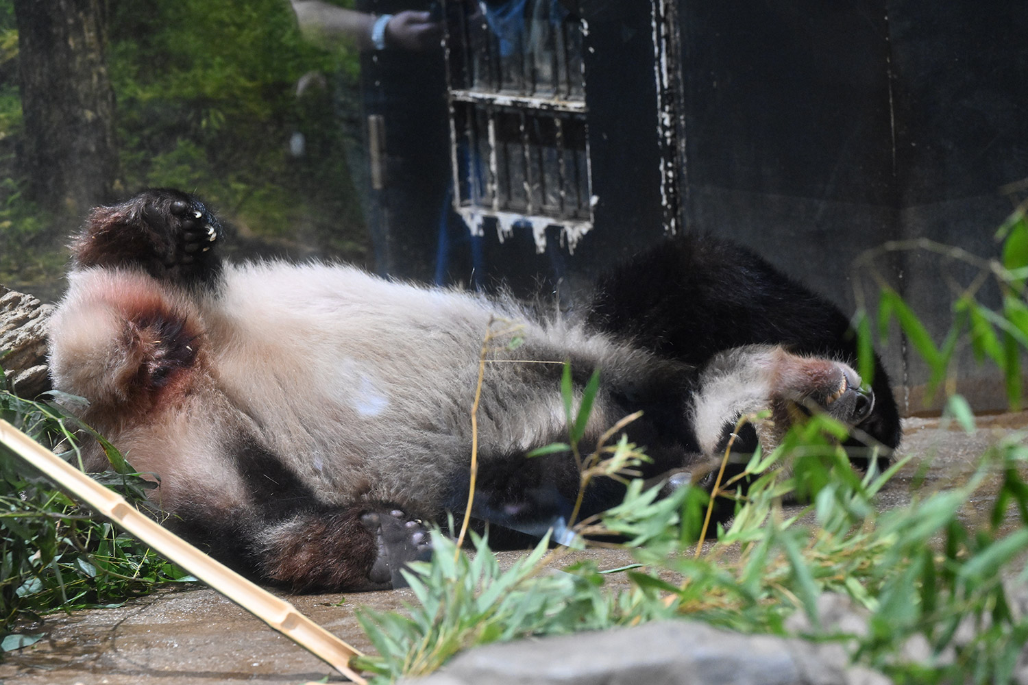 おはようございます。4枚目のシャオシャオの左脚と写り込んだお客さんの頭部が重なって、のけぞってモゾモゾする幻の小ちゃい🐼さんが見えますね😆レイレイのヘソ天寝、片脚が上がっているところにタンタンお嬢様の寝相を思い出しました。