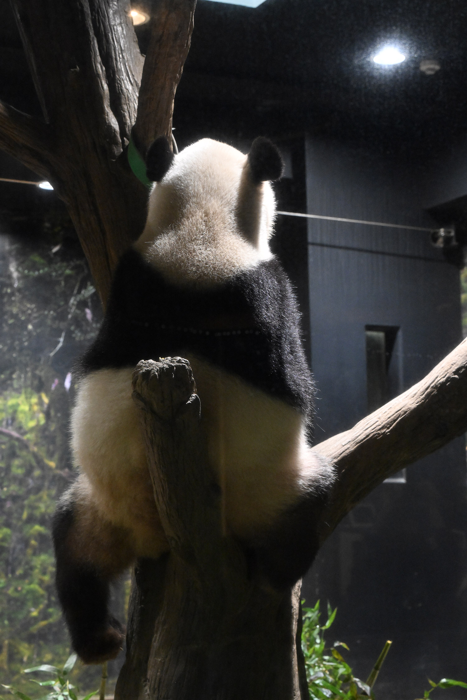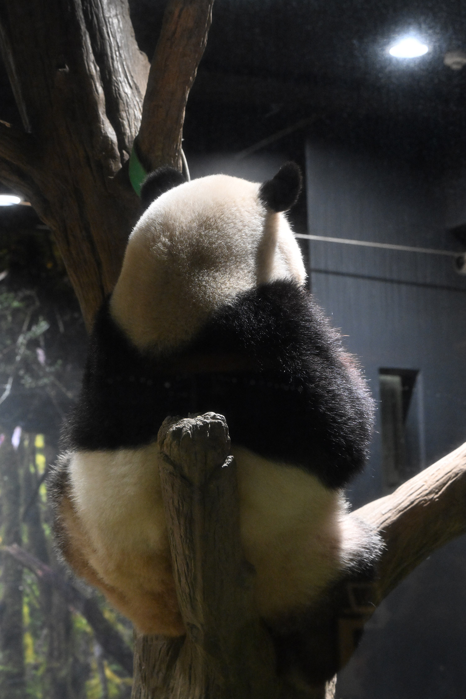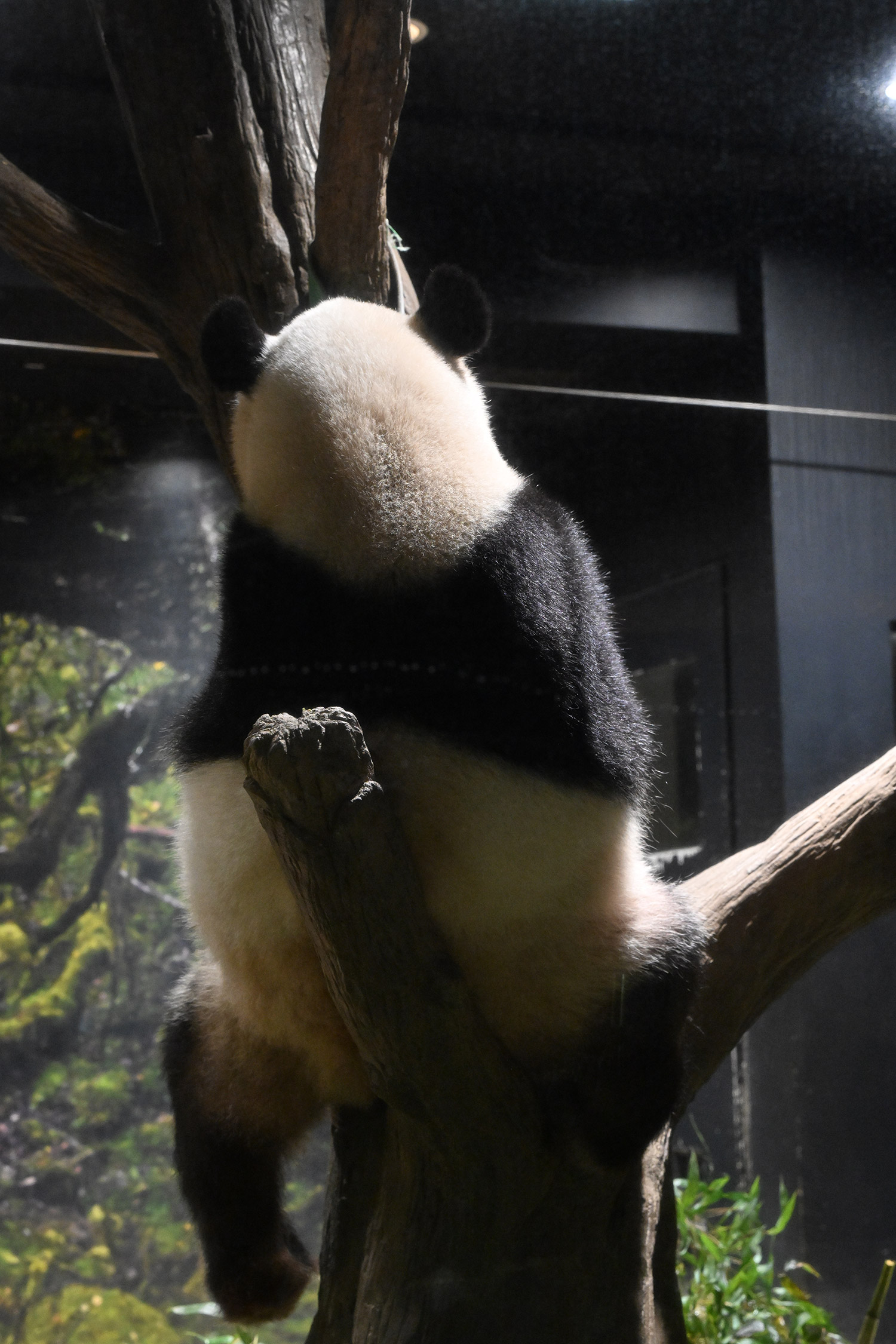 闇にライトで照らされた手足ふんばる勇者のような擬木上のシャオ君🐼格好いいな。レイちゃん満点のお行儀良さでお食事綺麗な姿勢とヘソ天寝のギャップに笑います。開放されてお空飛んでる夢を見てるのかな。