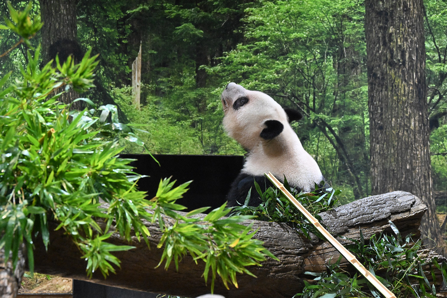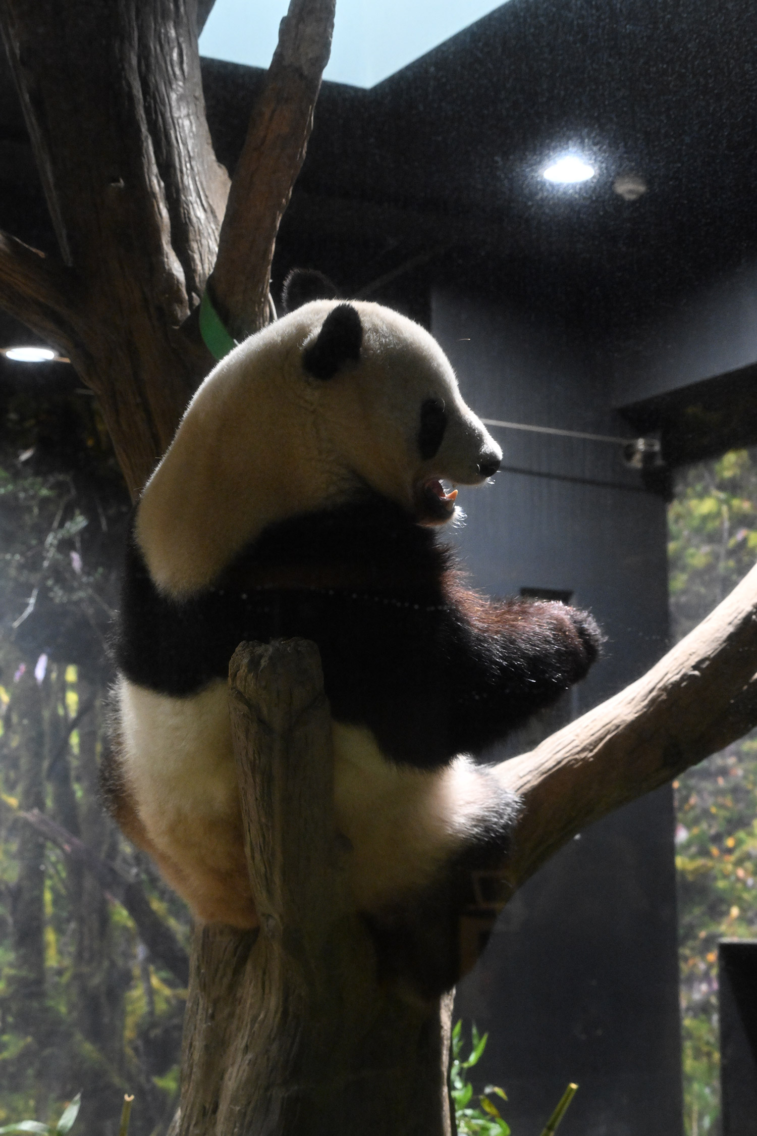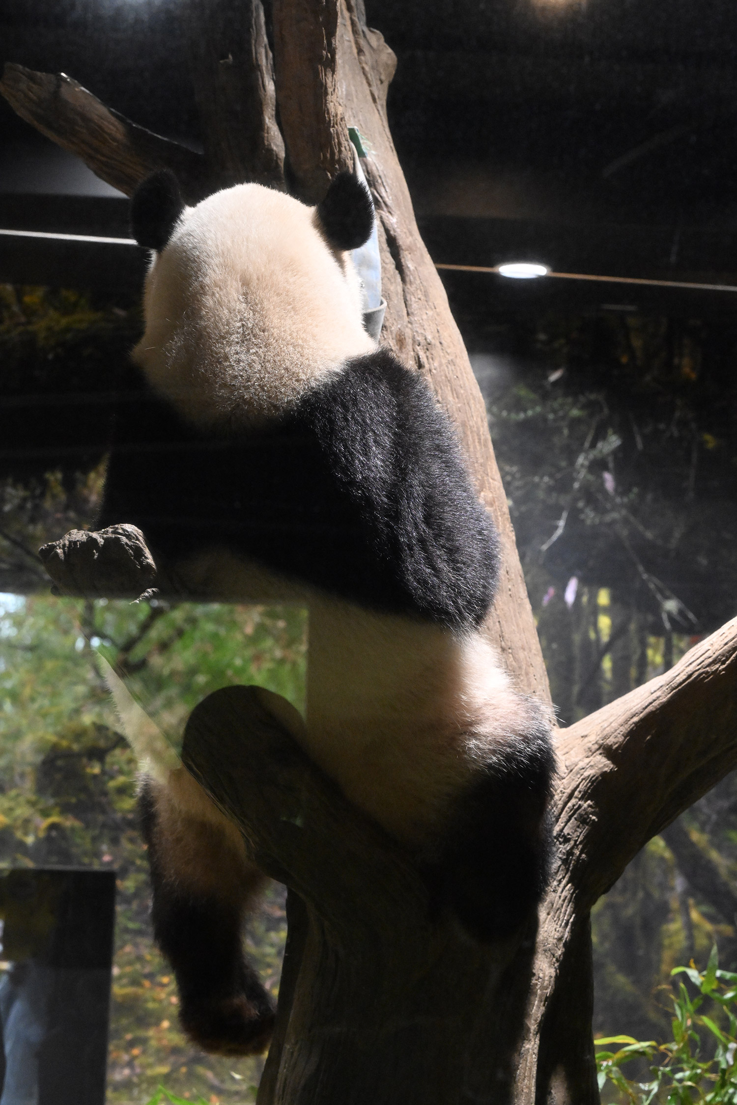 闇にライトで照らされた手足ふんばる勇者のような擬木上のシャオ君🐼格好いいな。レイちゃん満点のお行儀良さでお食事綺麗な姿勢とヘソ天寝のギャップに笑います。開放されてお空飛んでる夢を見てるのかな。