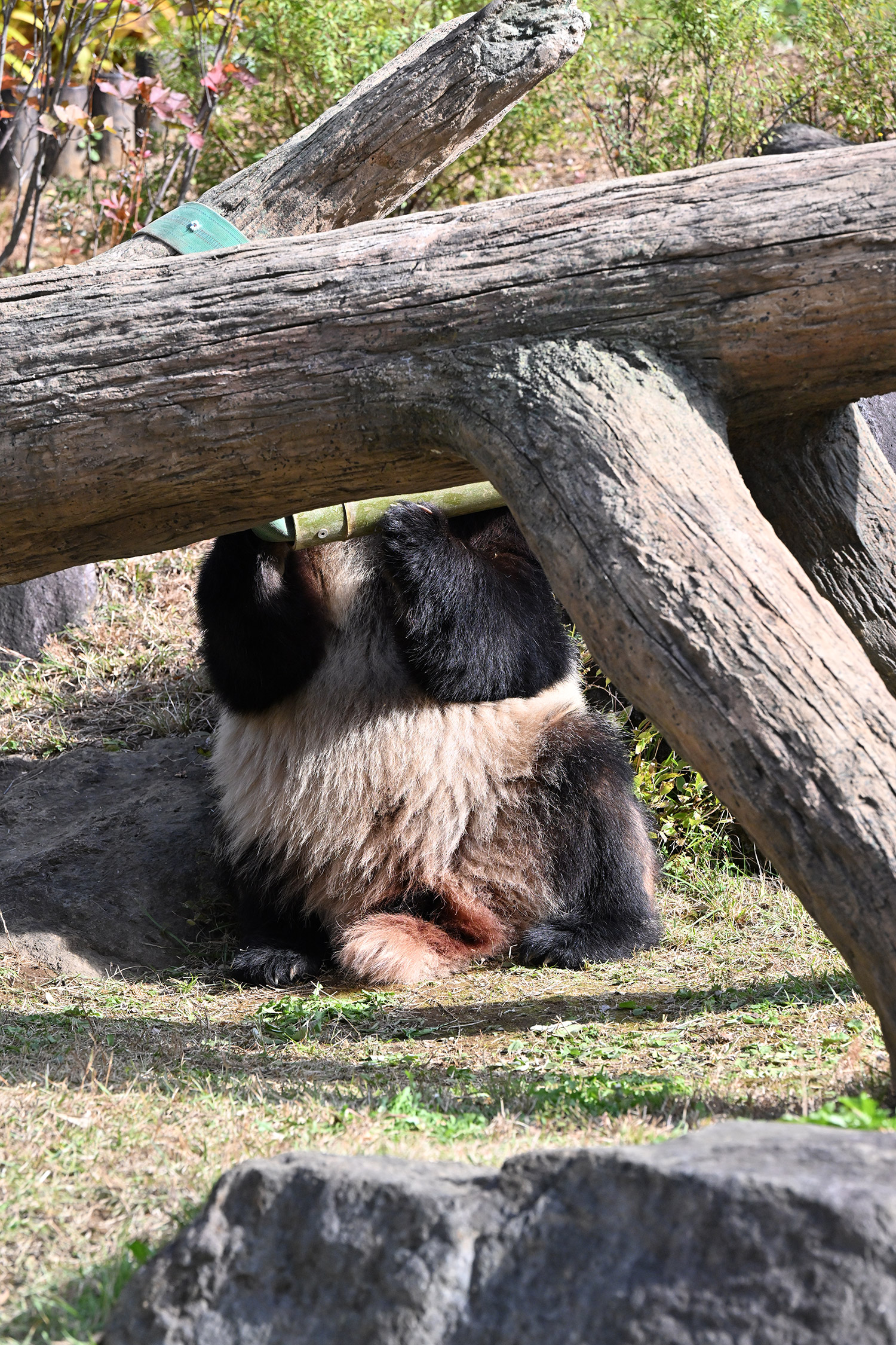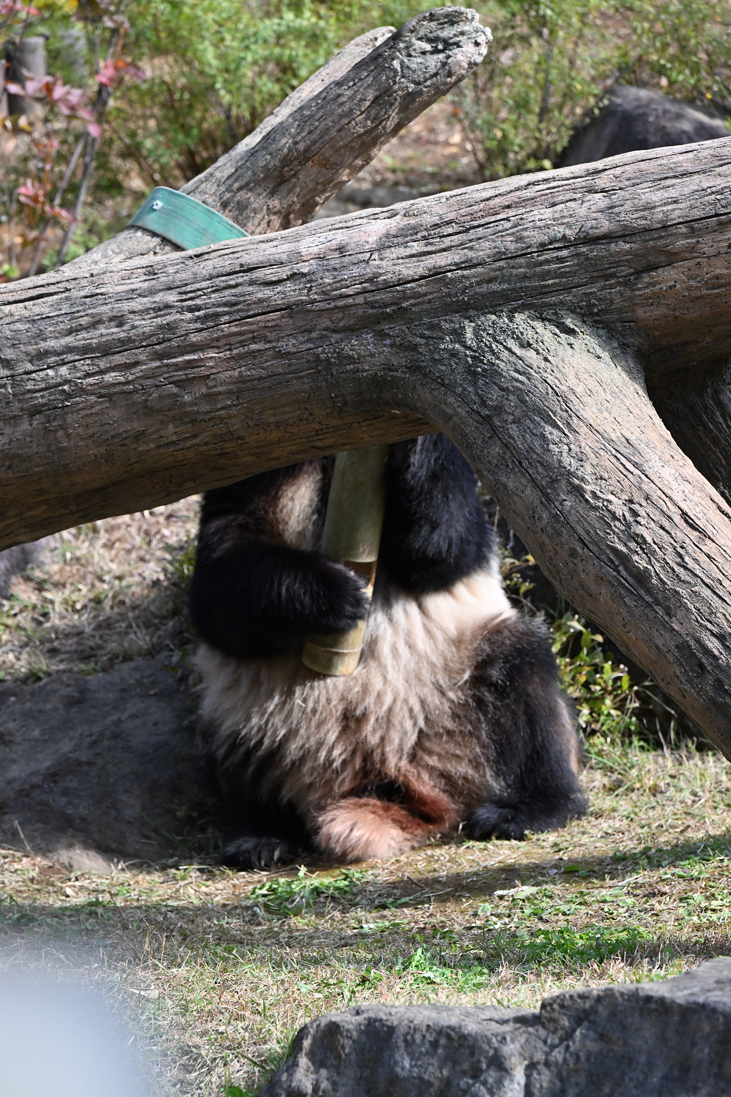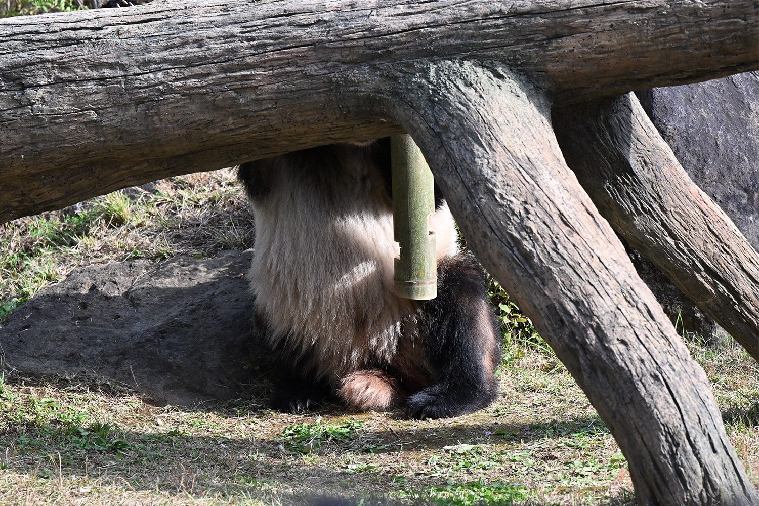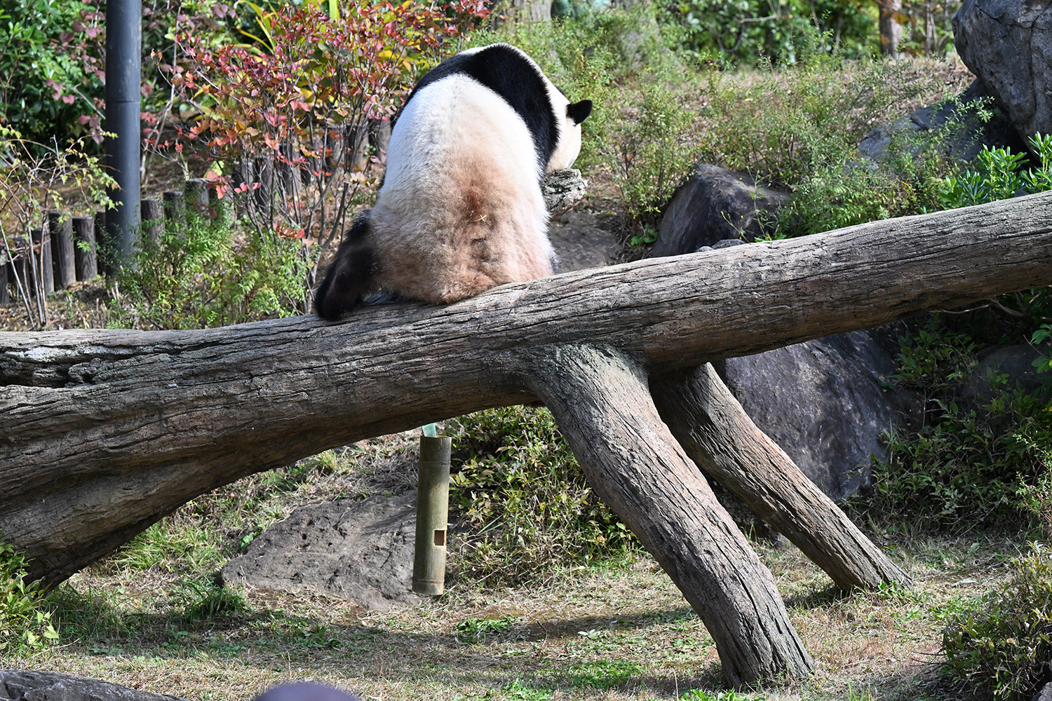 シャオシャオは、お庭で擬木の後ろで、竹筒の中から、おやつ、みつけたかな、、、