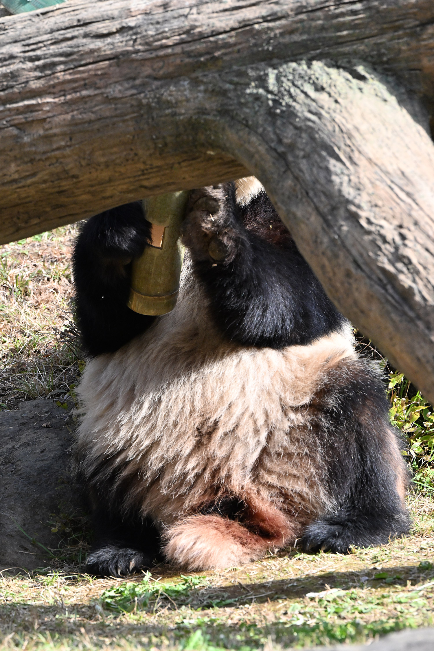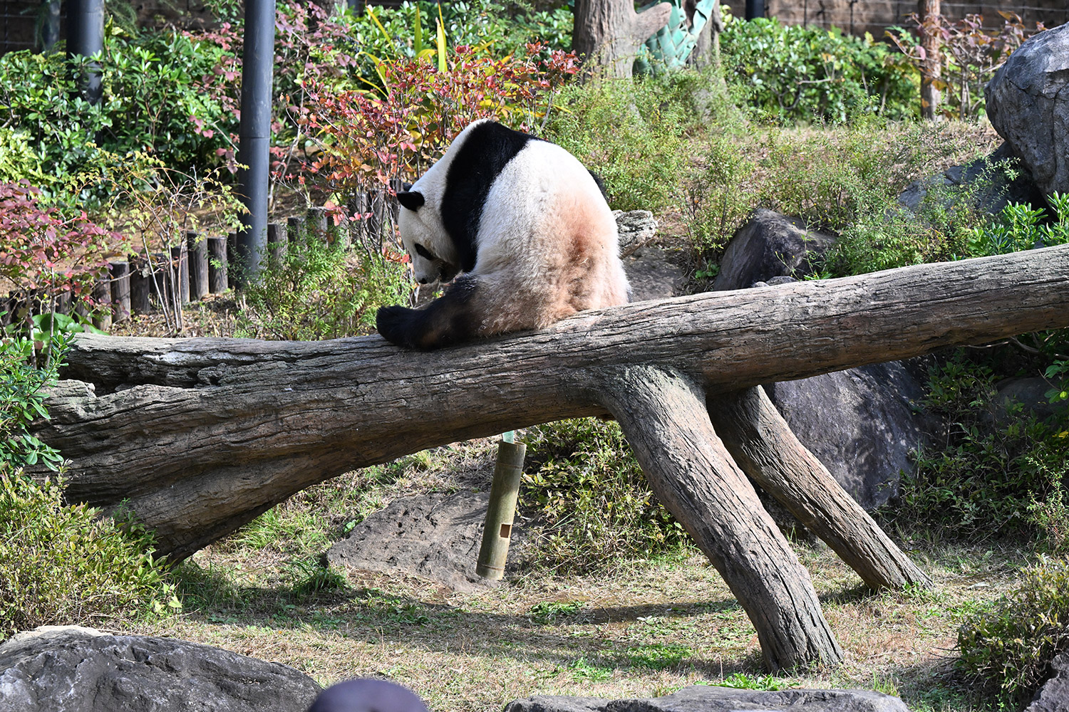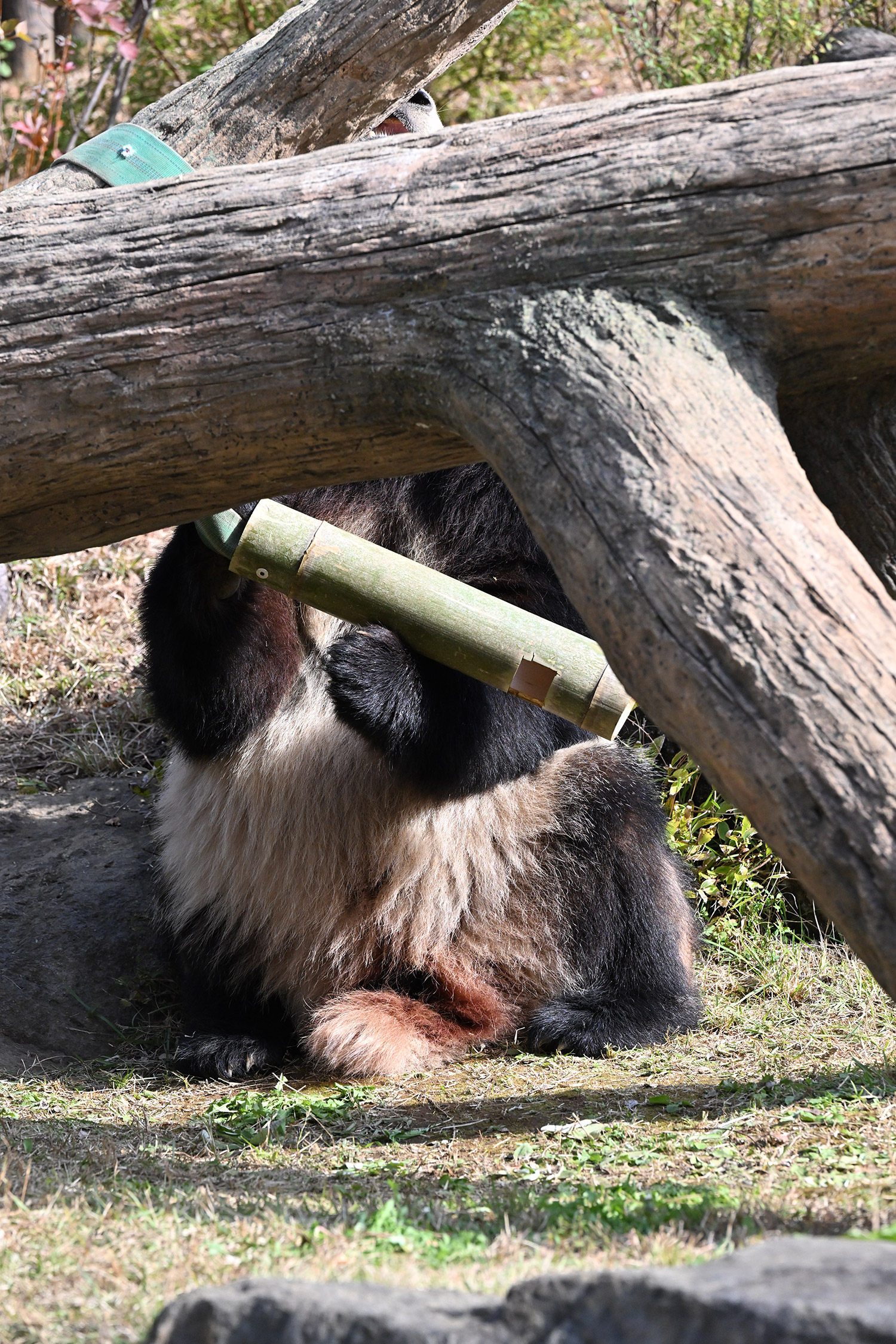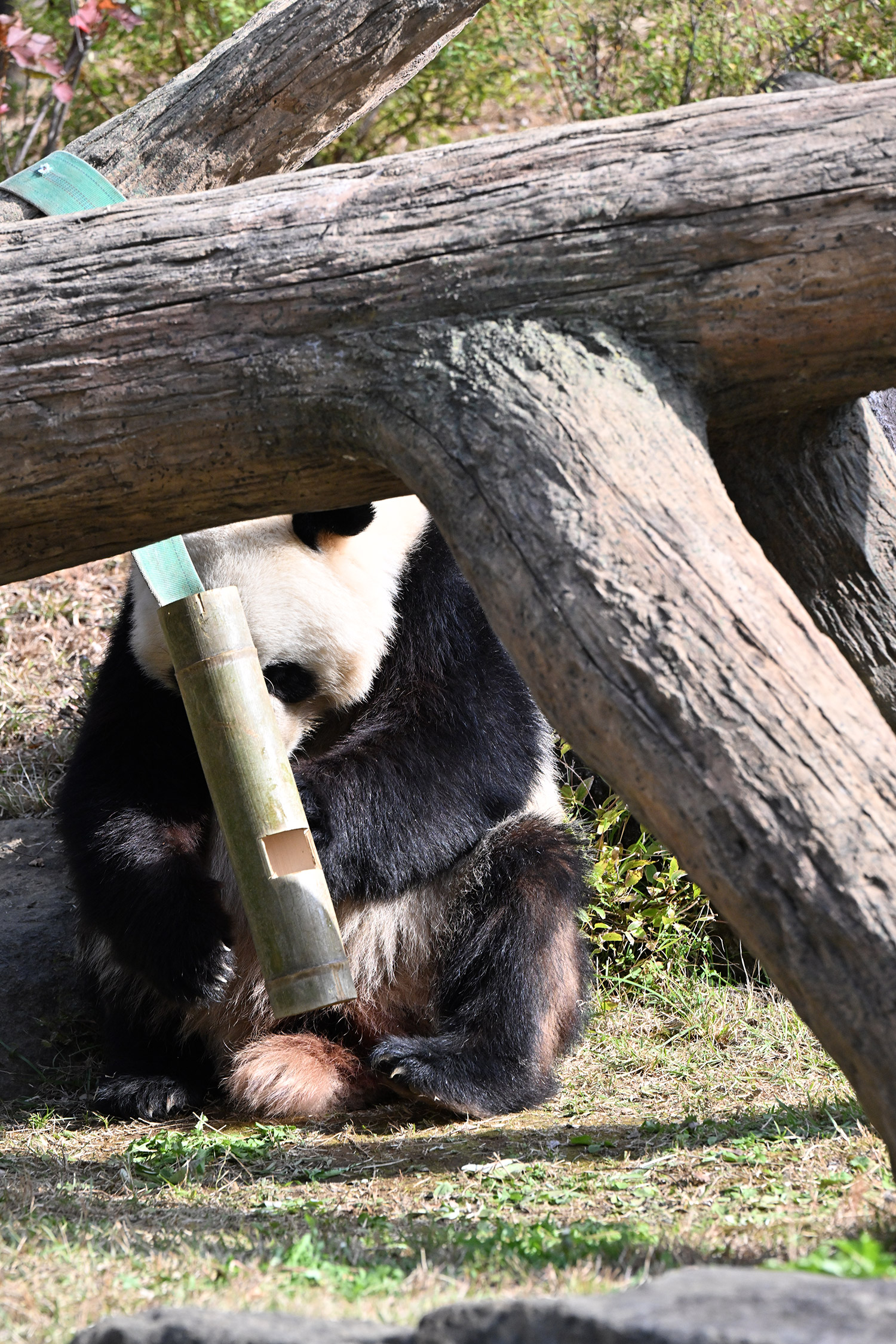 シャオシャオは、お庭で擬木の後ろで、竹筒の中から、おやつ、みつけたかな、、、