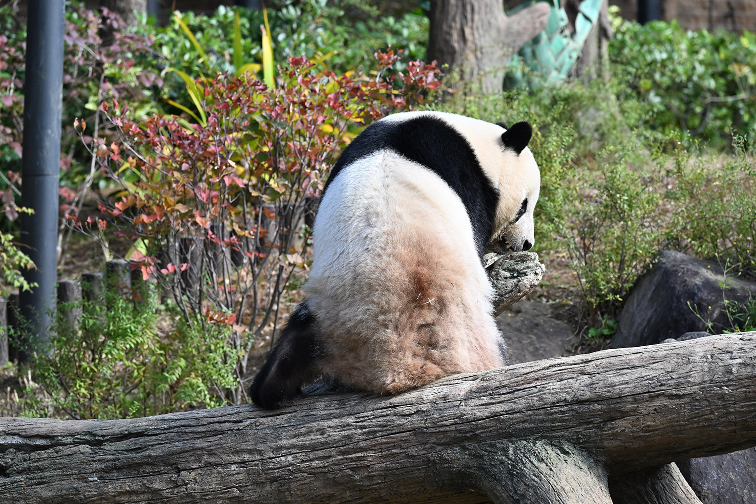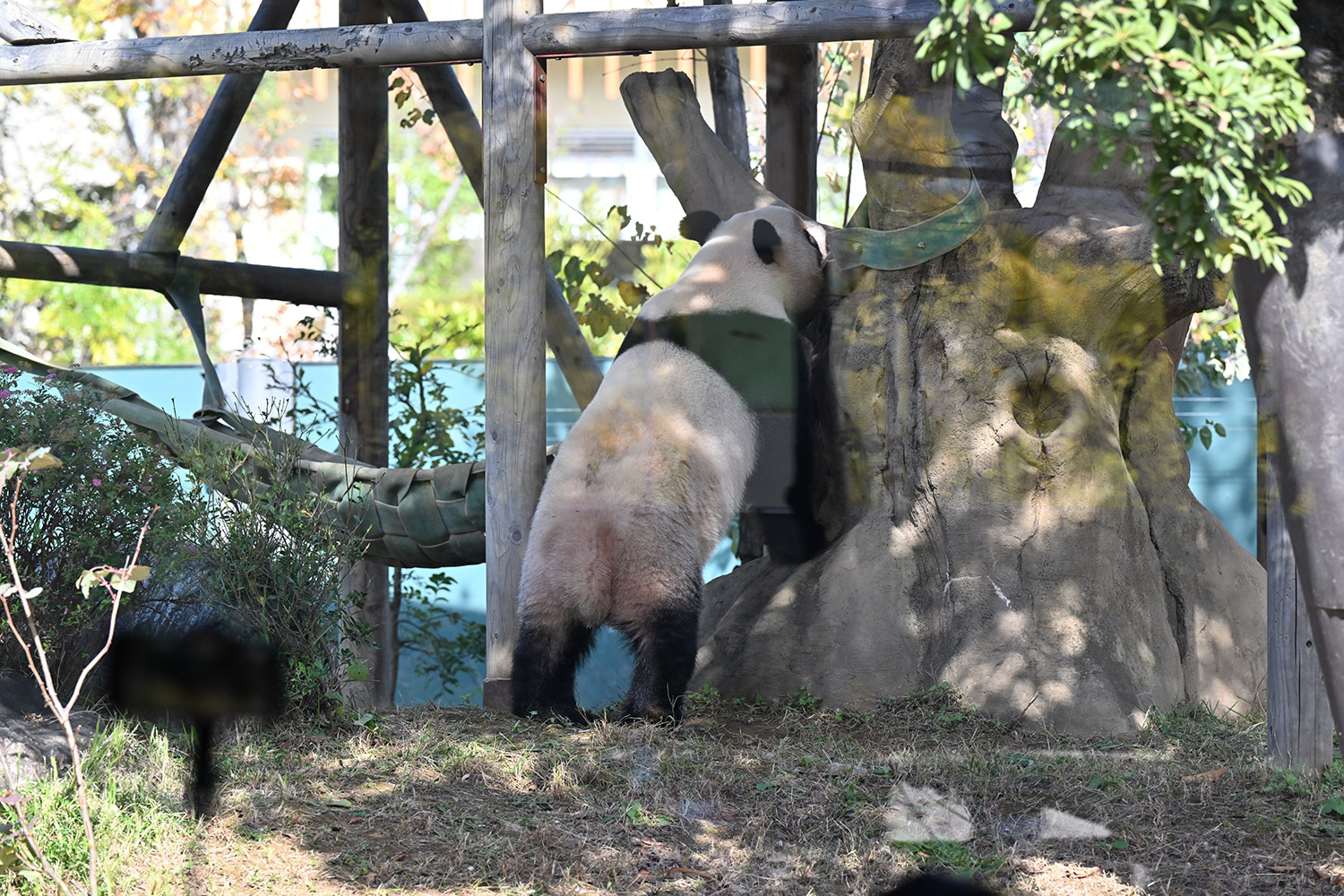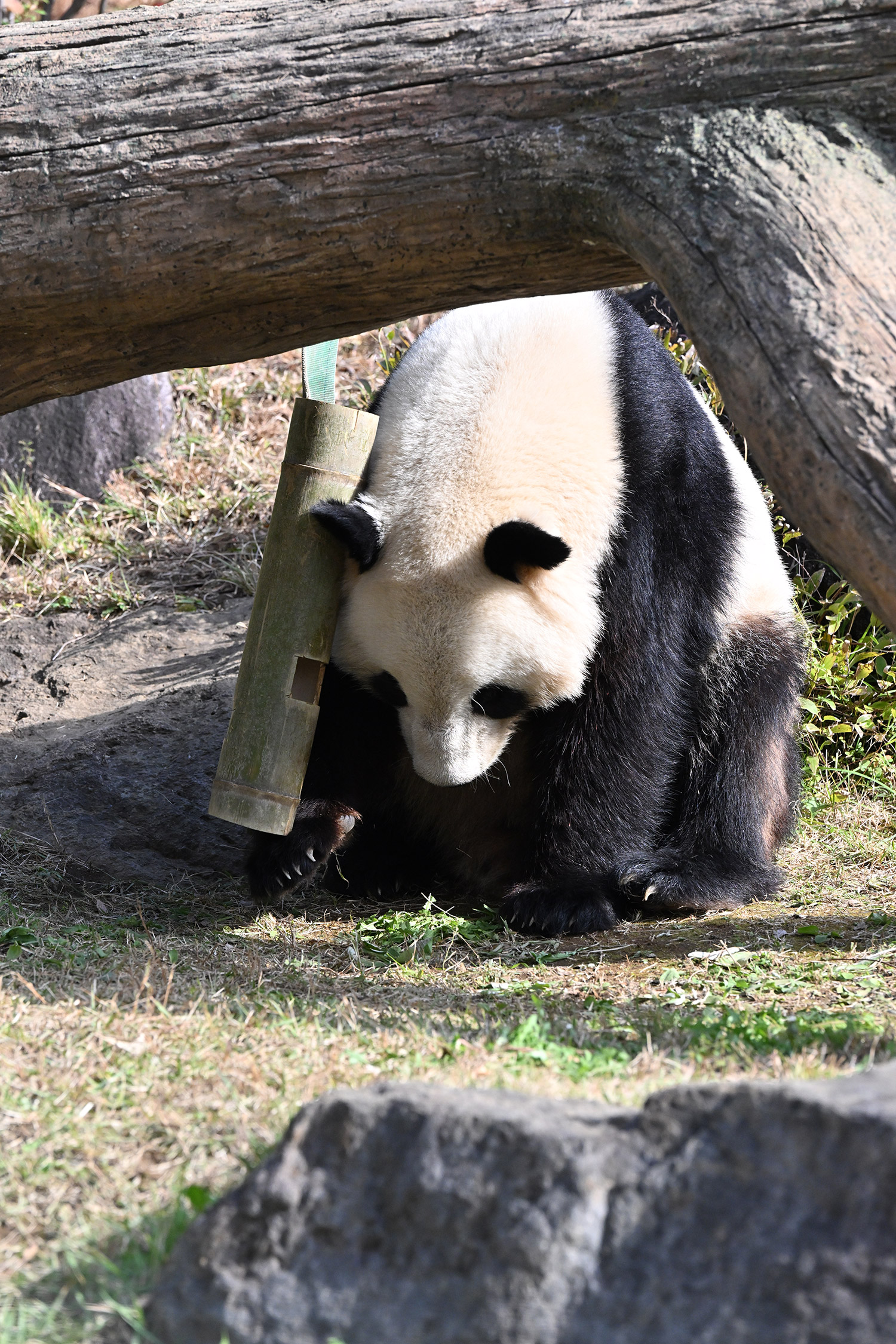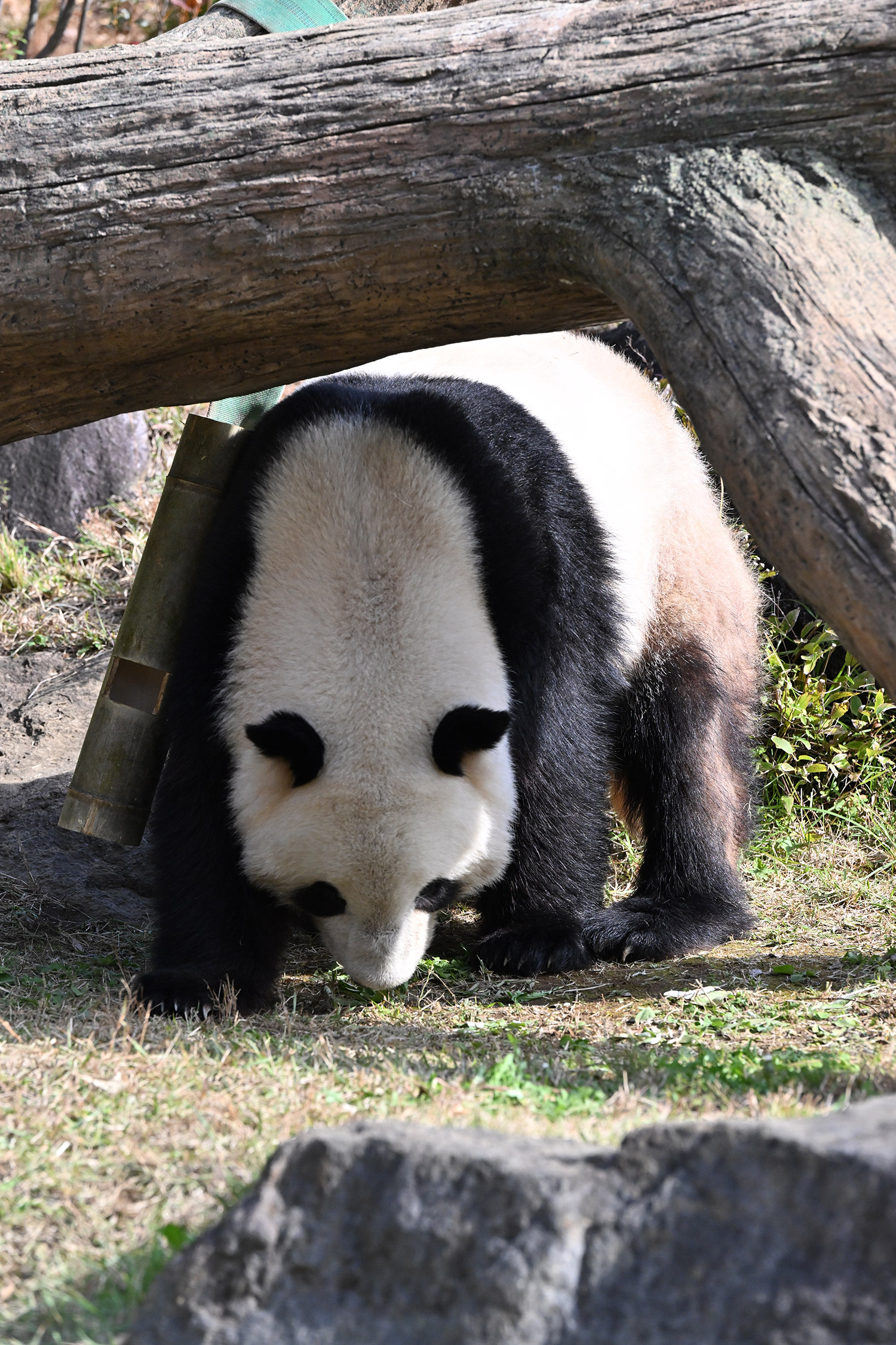 シャオシャオは、お庭で擬木の後ろで、竹筒の中から、おやつ、みつけたかな、、、
