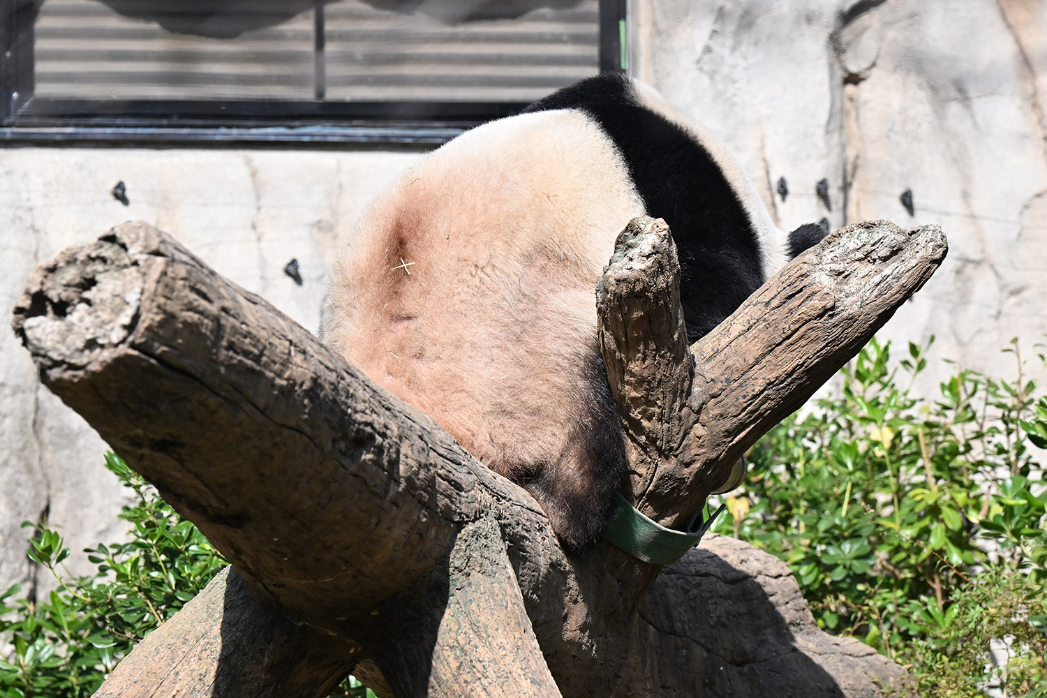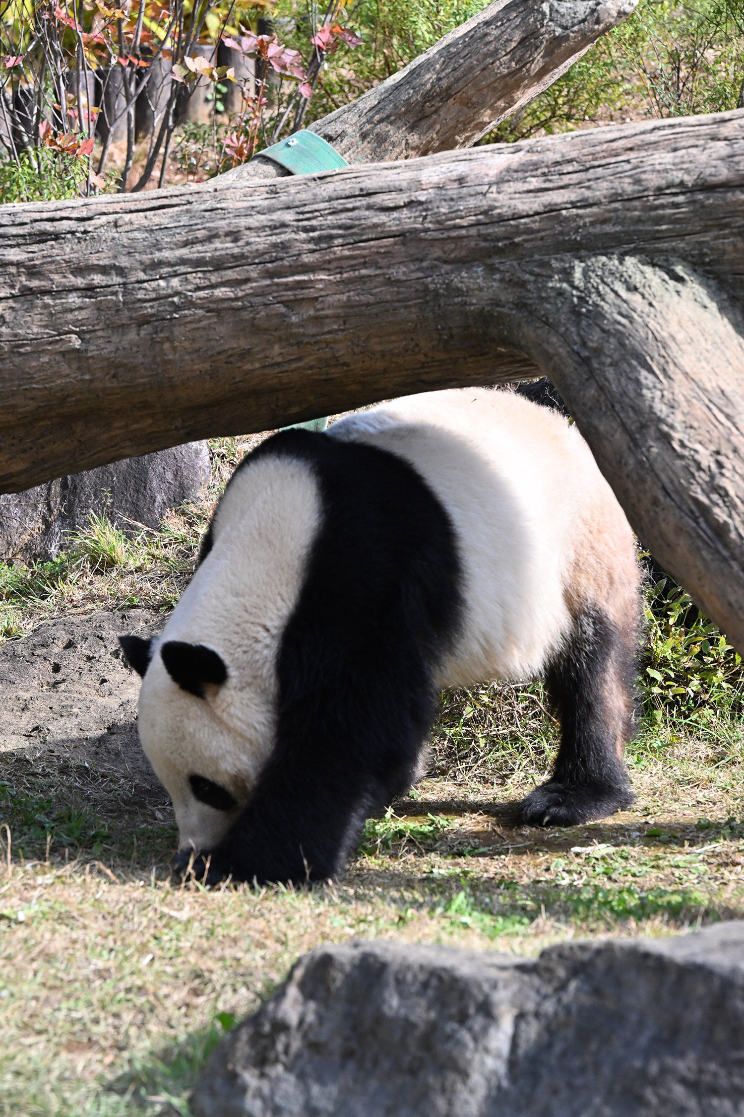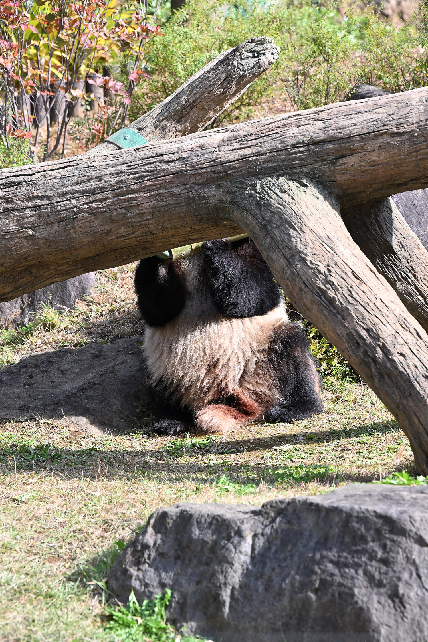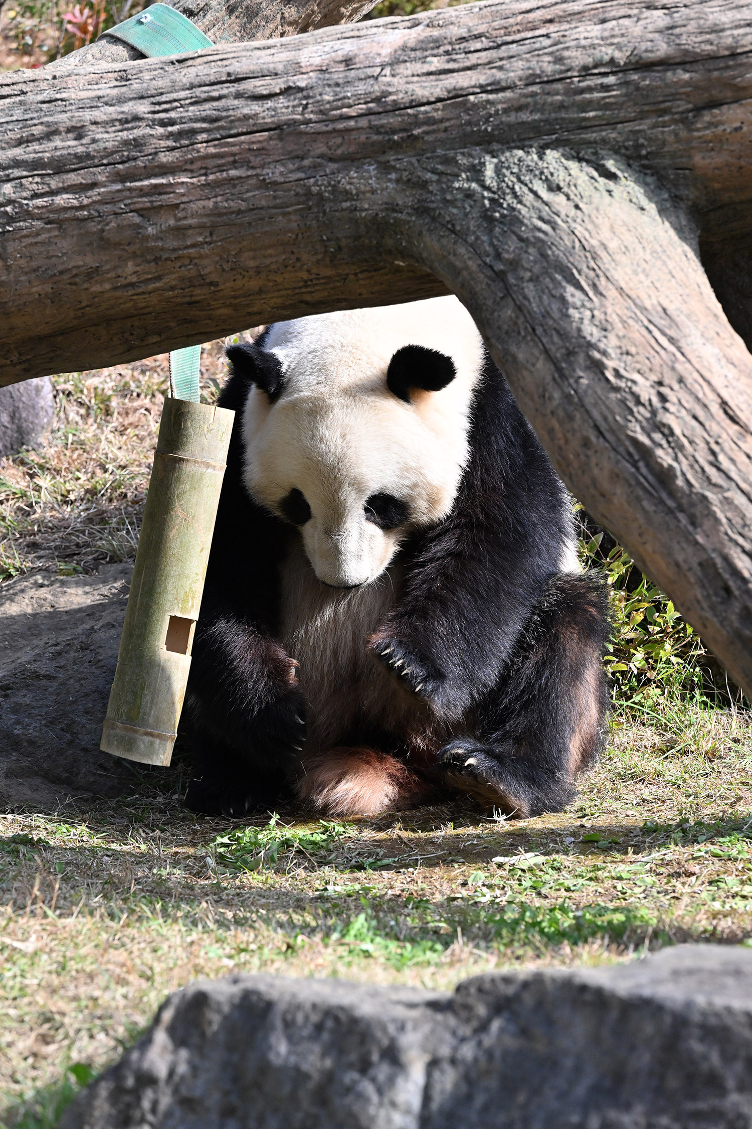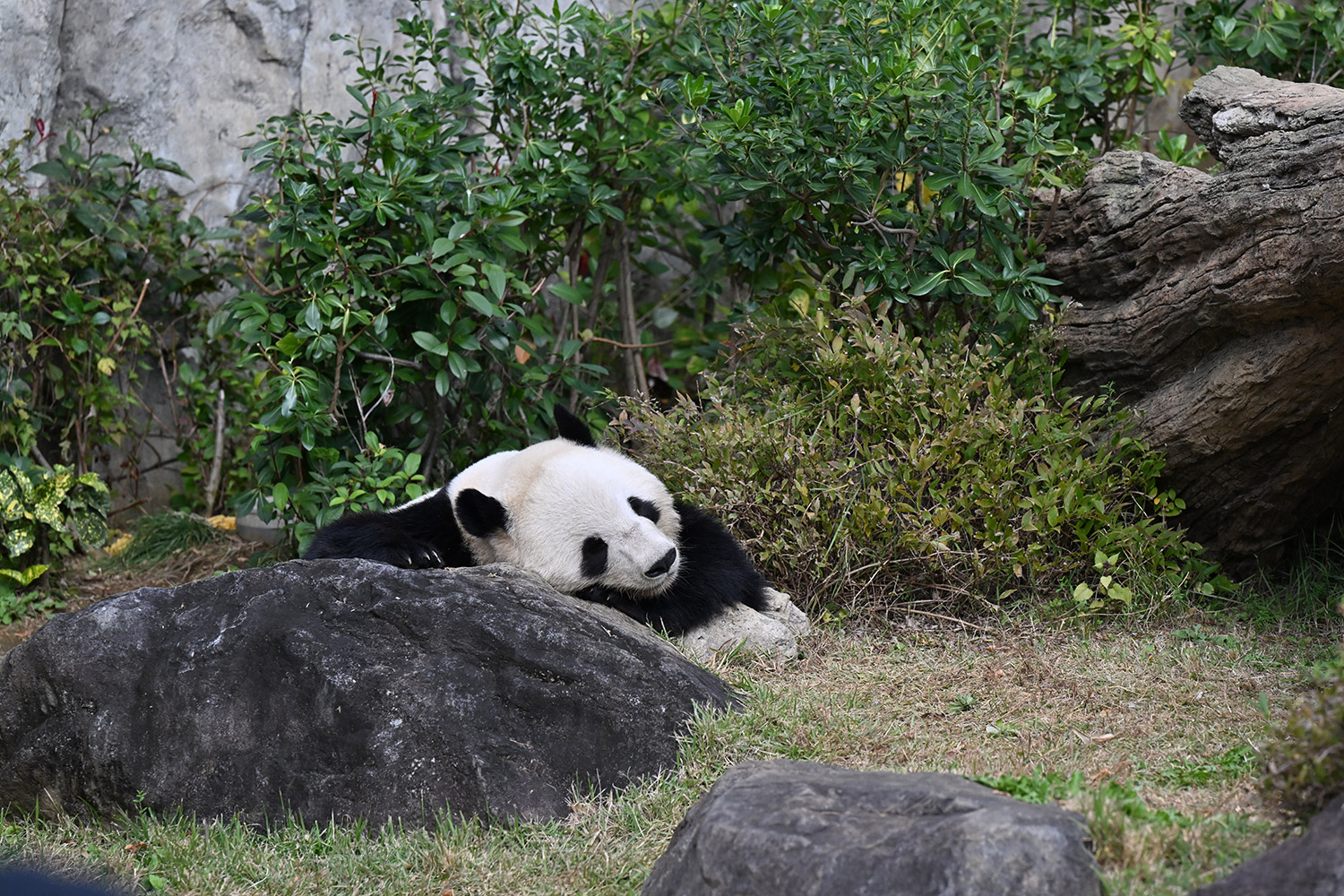 木の上のシャオシャオ、おしりに小さなバッテン×があり、2度見しました(笑)石の上で休憩、ぽかぽかして気持ち良さそう。とても可愛い寝顔に私も笑顔になります。