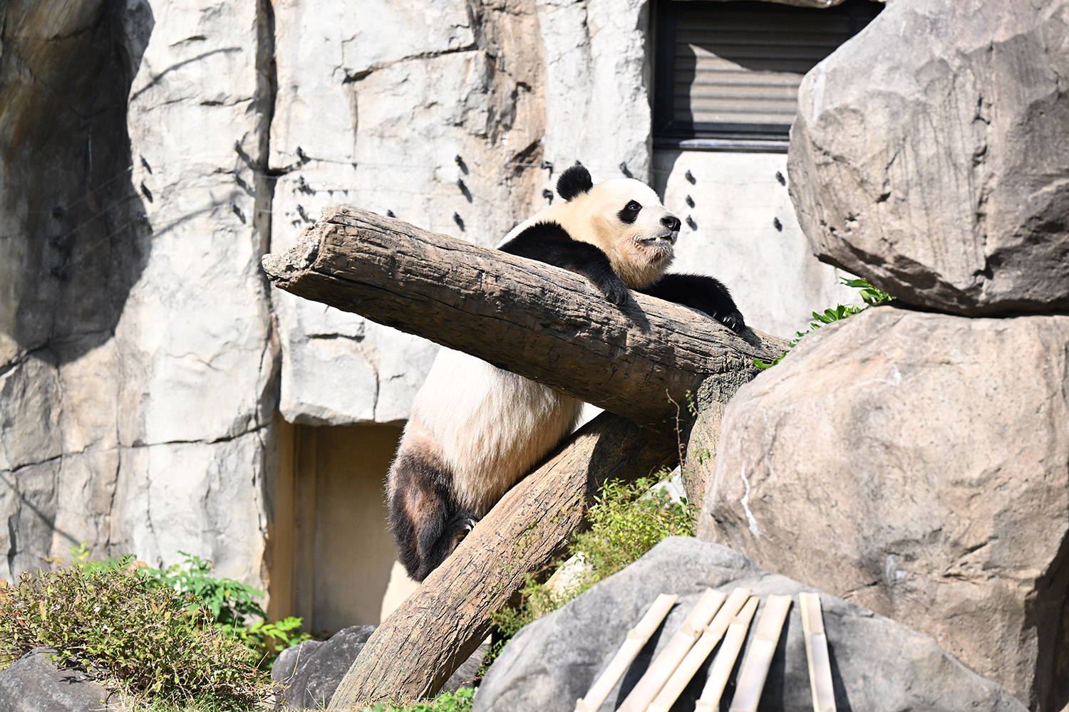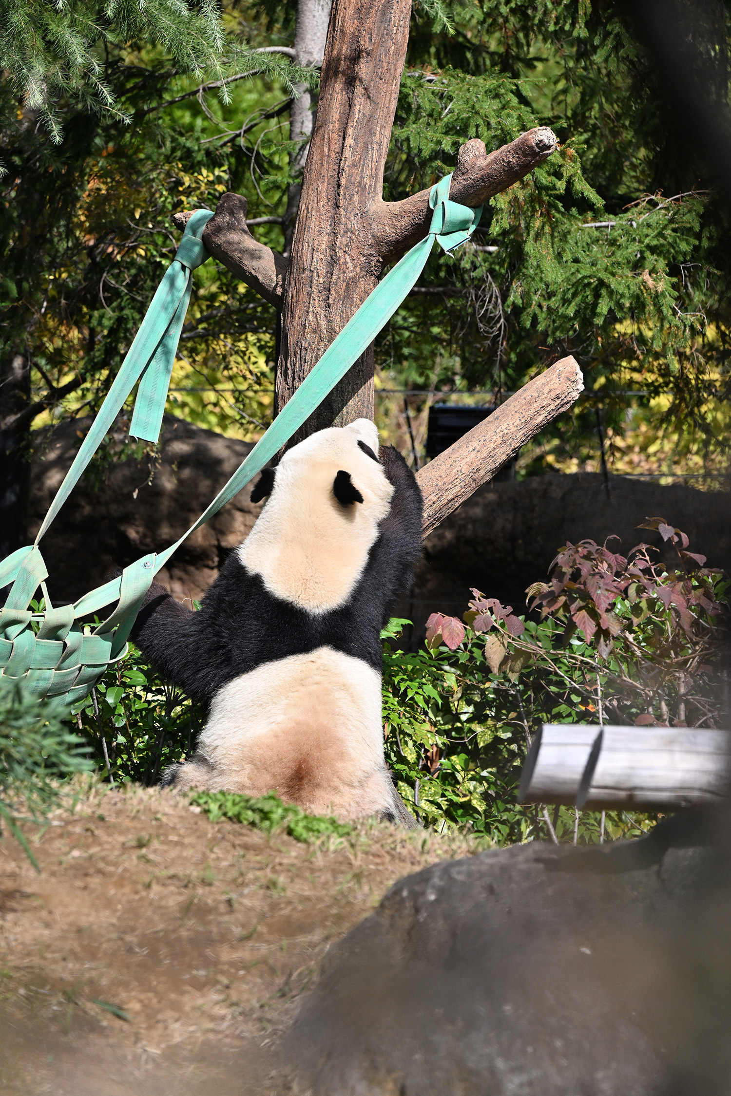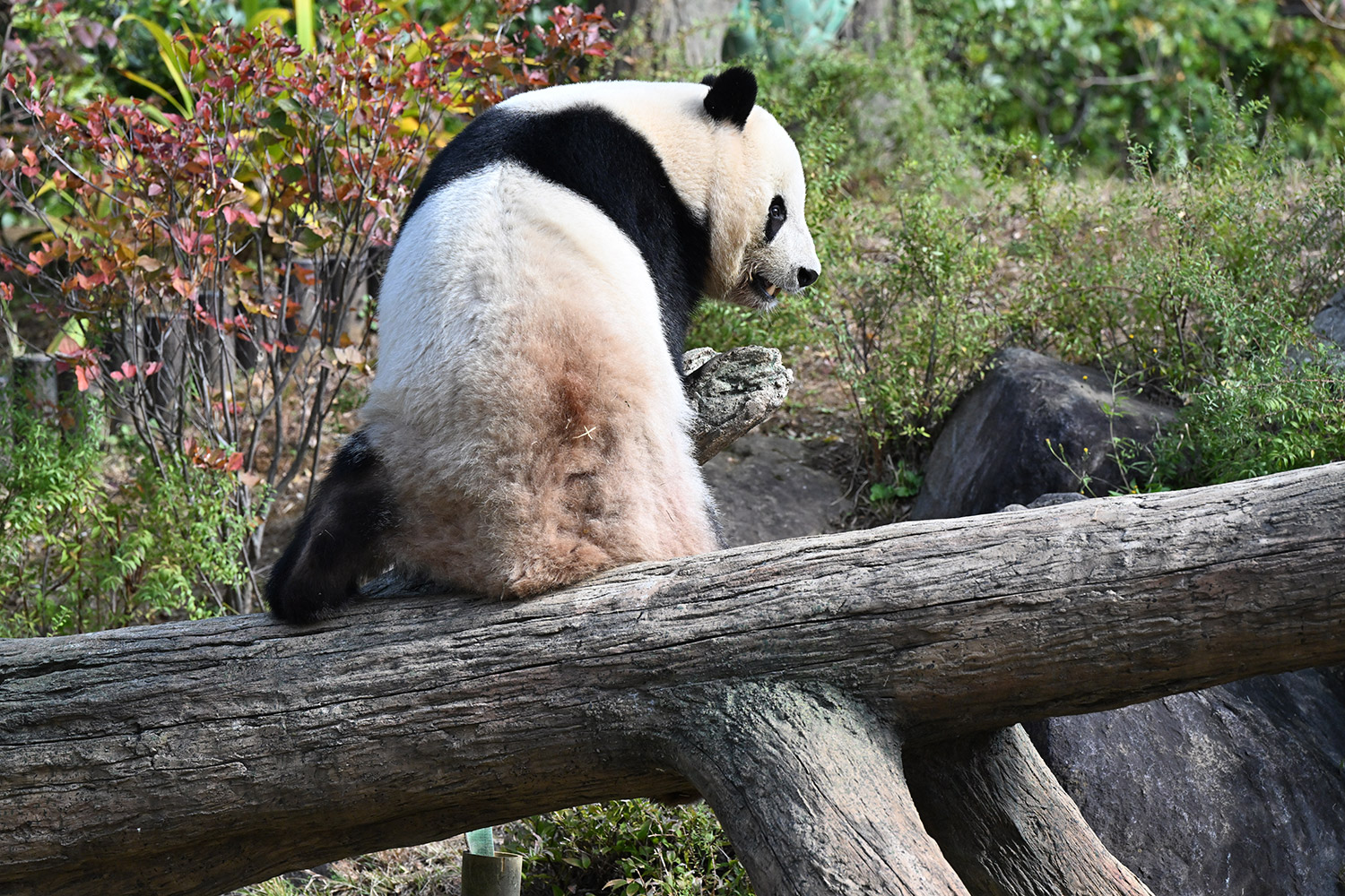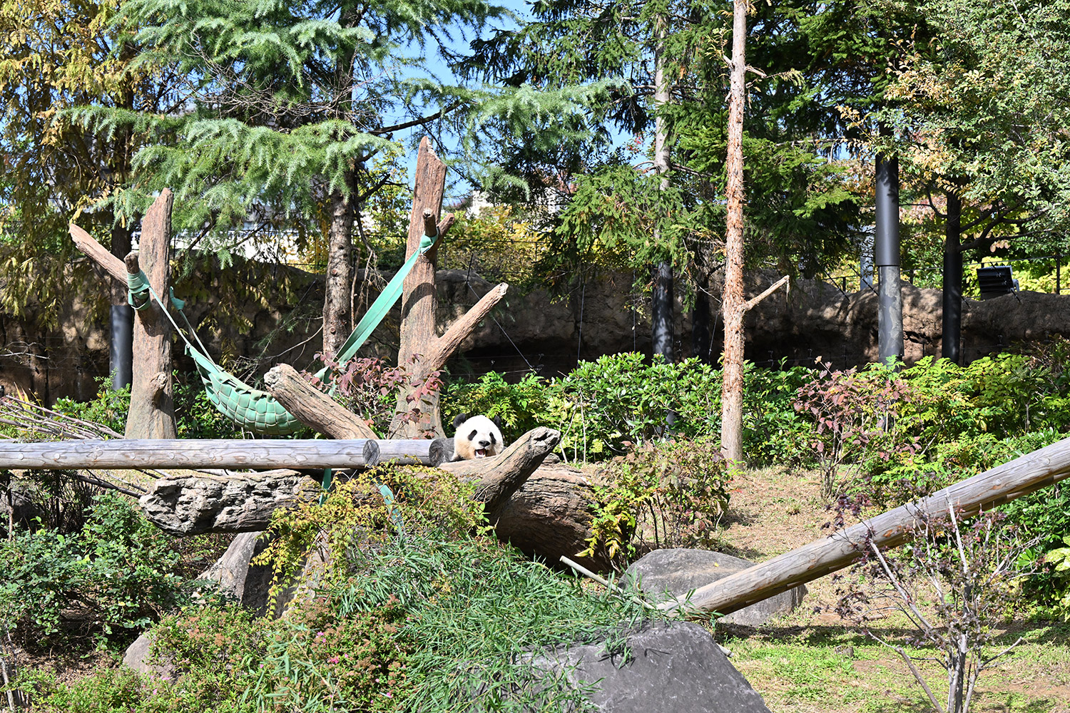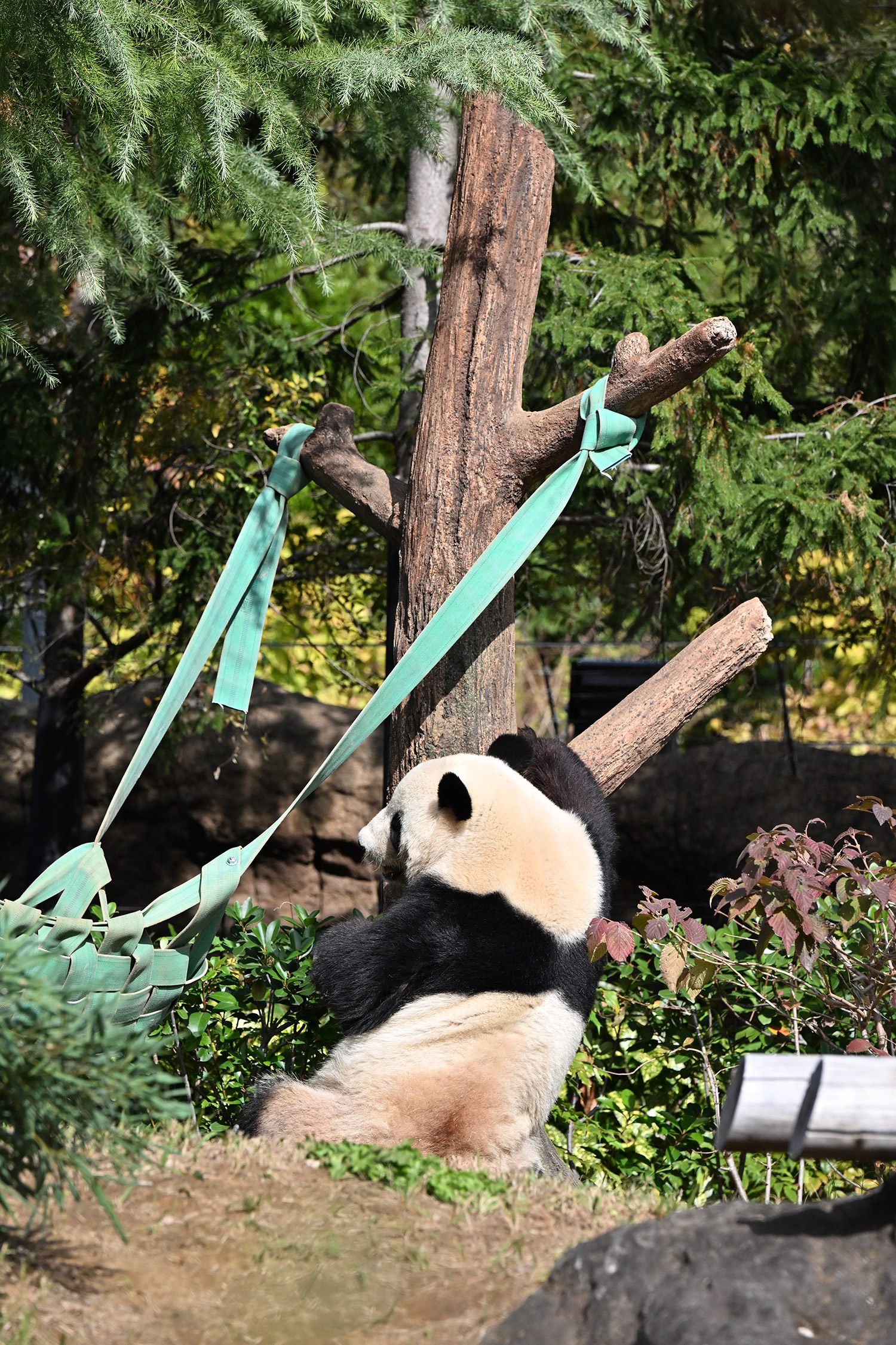 木の上のシャオシャオ、おしりに小さなバッテン×があり、2度見しました(笑)石の上で休憩、ぽかぽかして気持ち良さそう。とても可愛い寝顔に私も笑顔になります。