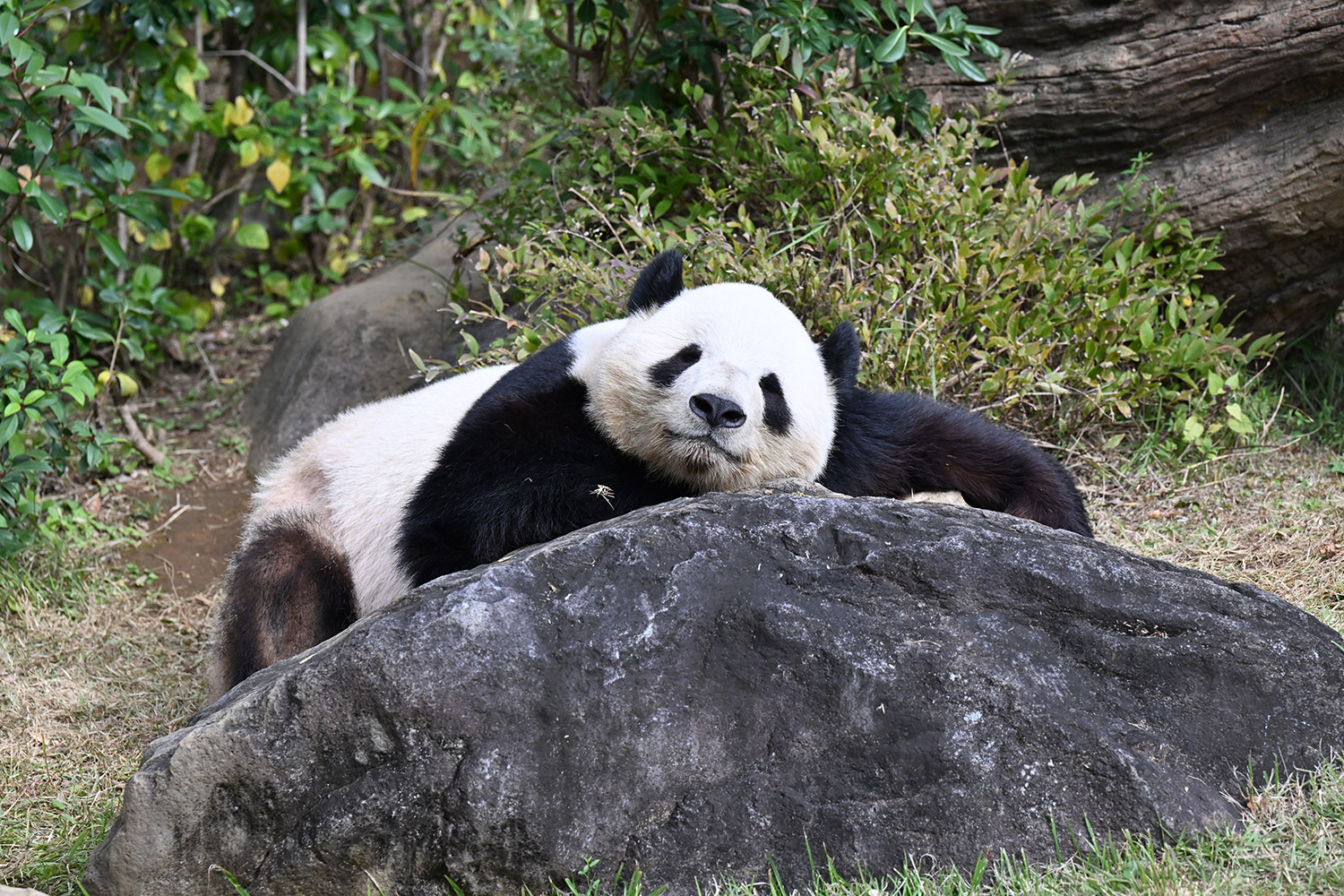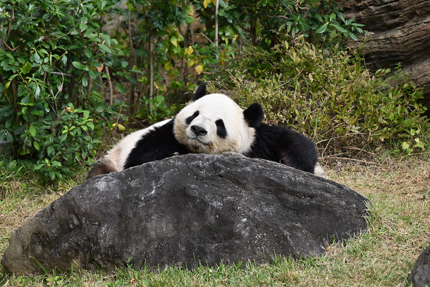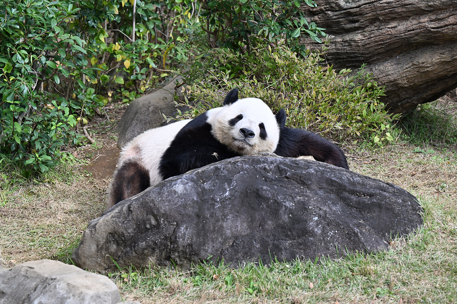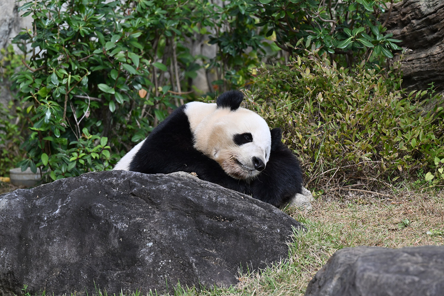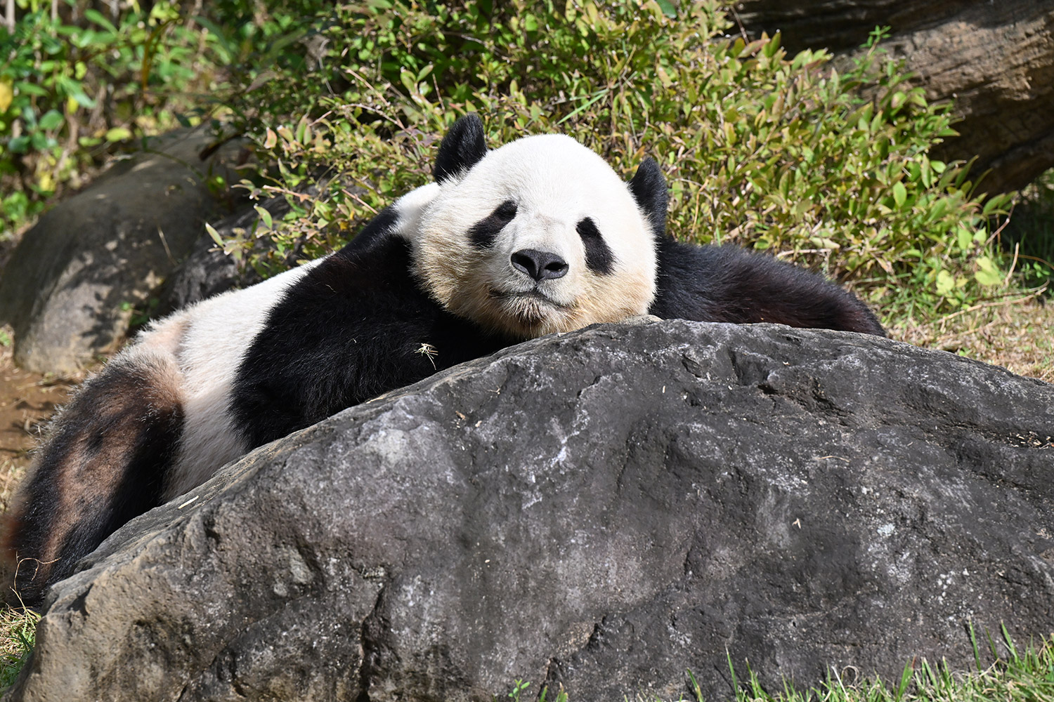 おやつゲットできたのかなぁ〜〜!?🐼💚大きな石に持たれてネムネム〜〜💤💤リラックスできるね❣️