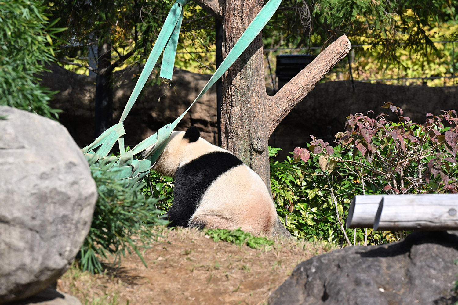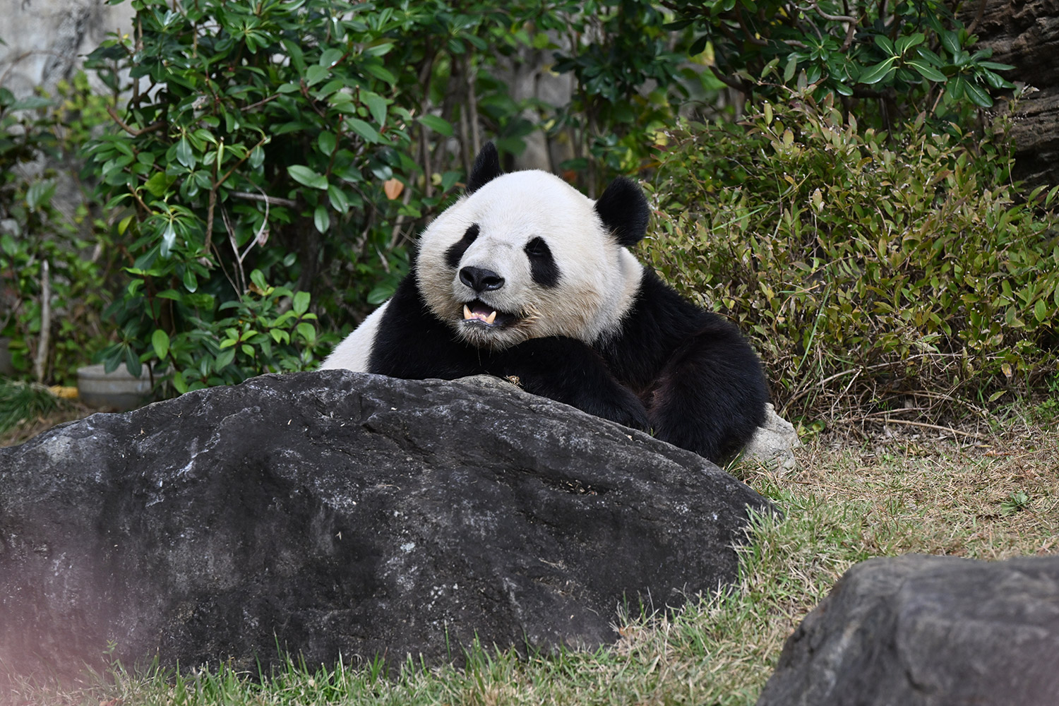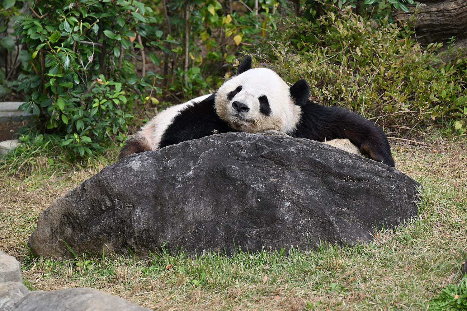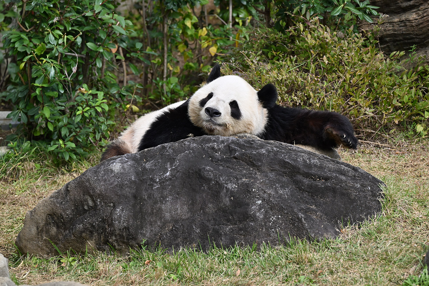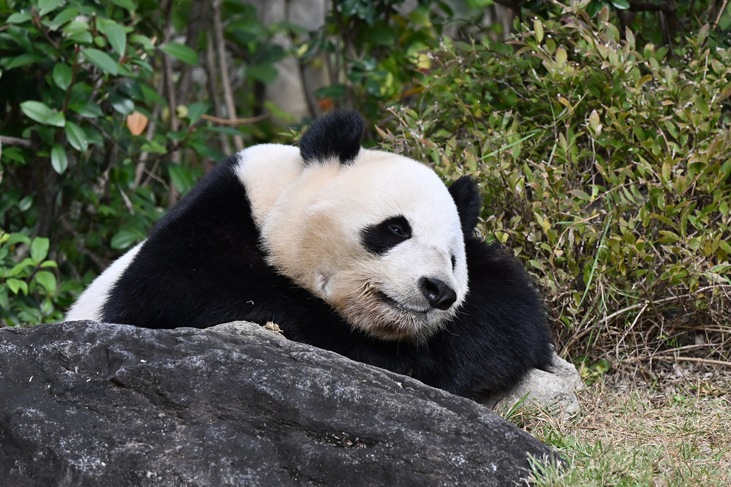 おやつゲットできたのかなぁ〜〜!?🐼💚大きな石に持たれてネムネム〜〜💤💤リラックスできるね❣️