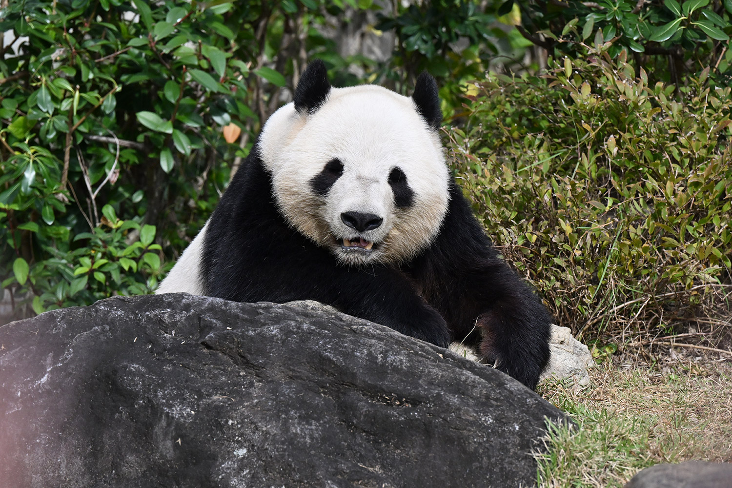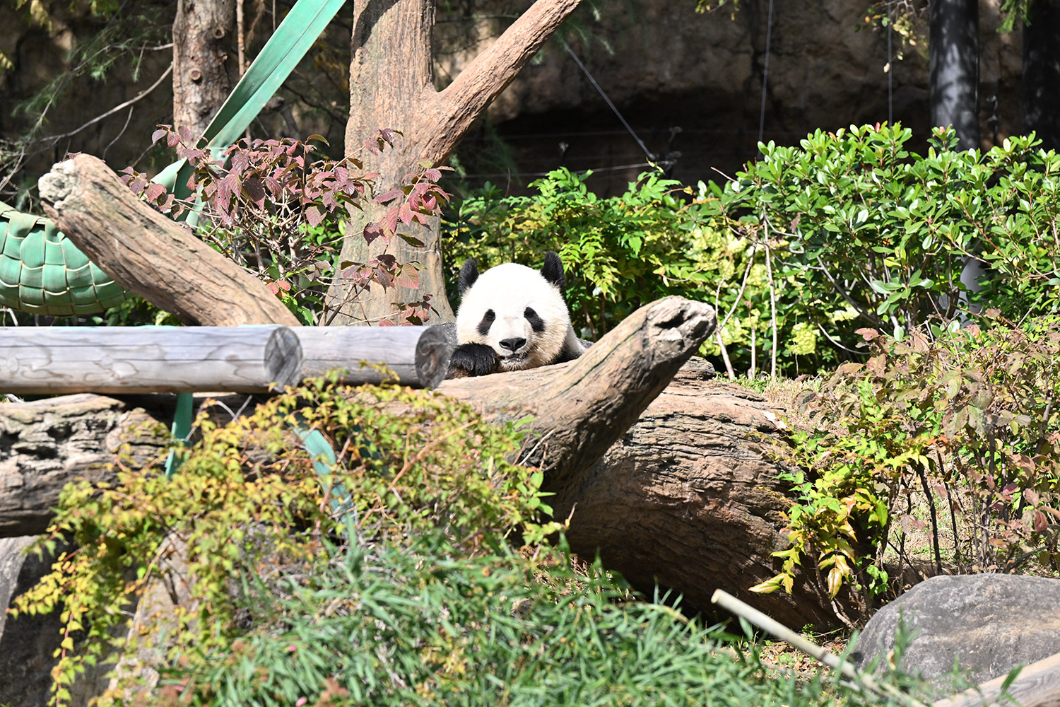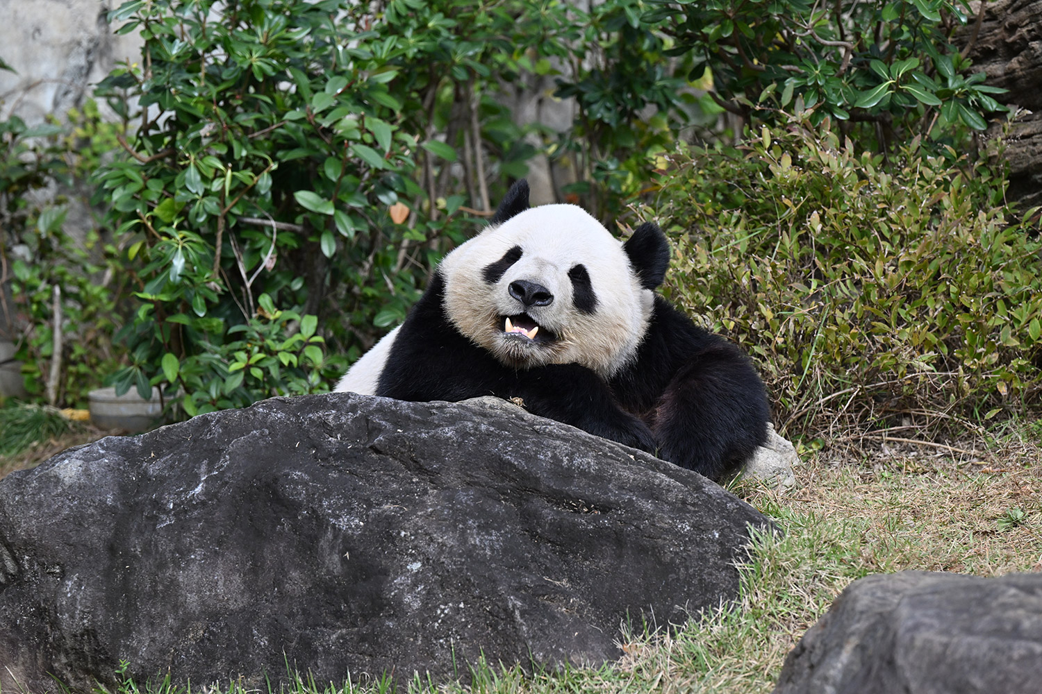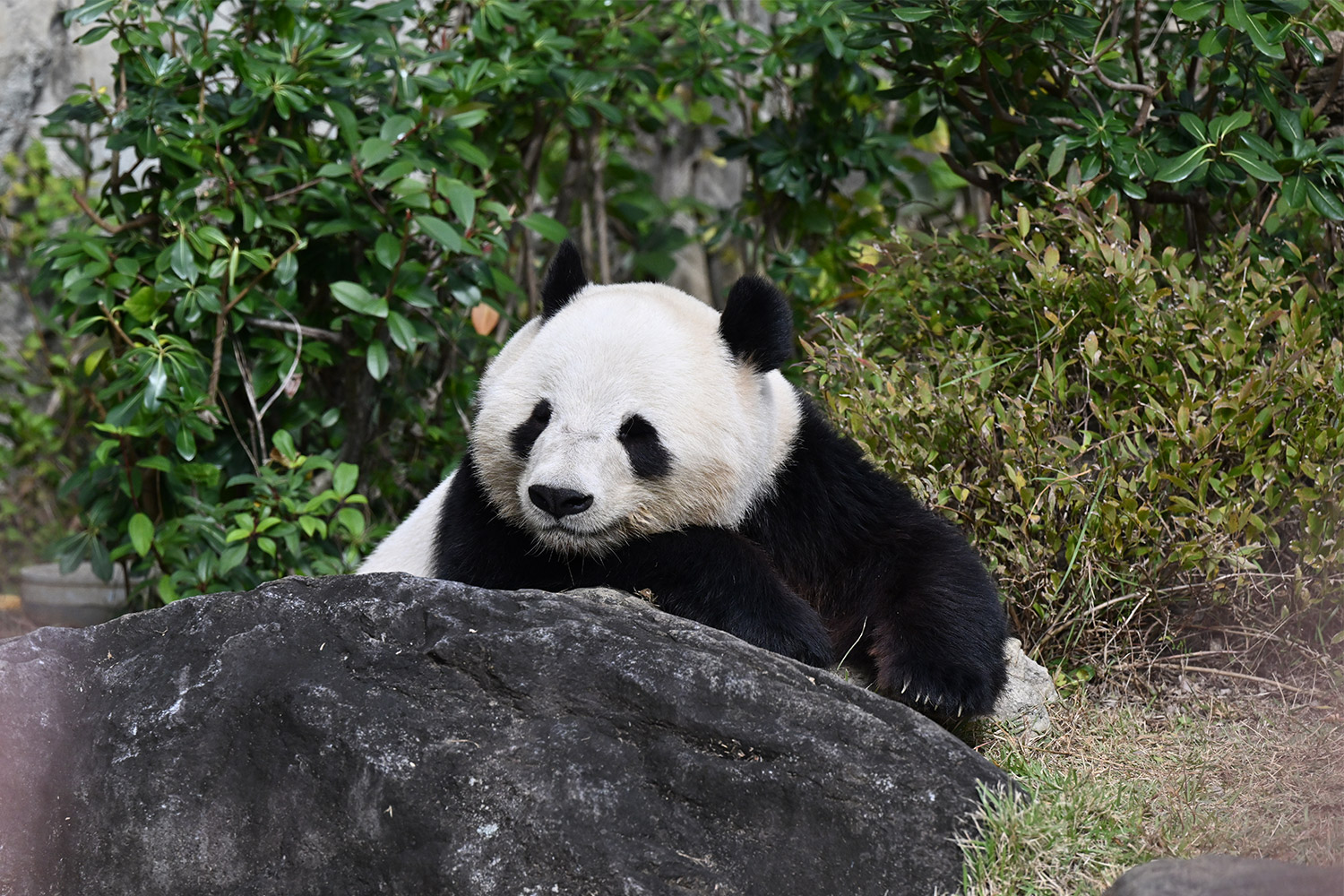 おやつゲットできたのかなぁ〜〜!?🐼💚大きな石に持たれてネムネム〜〜💤💤リラックスできるね❣️
