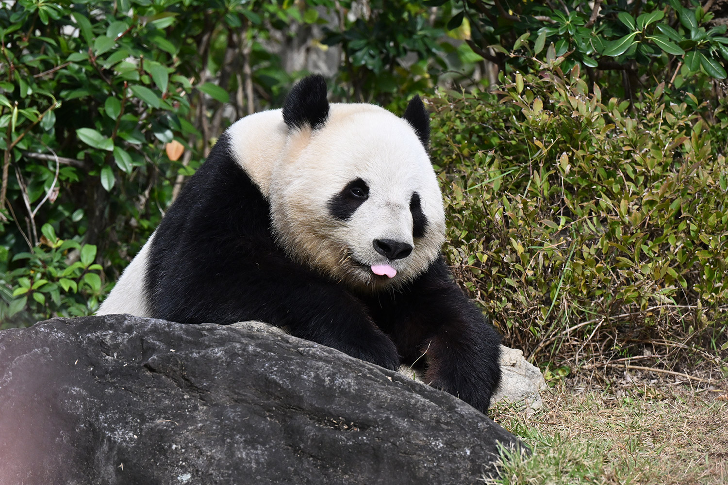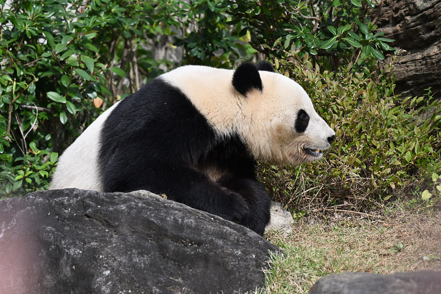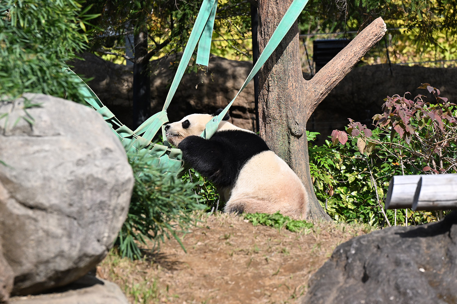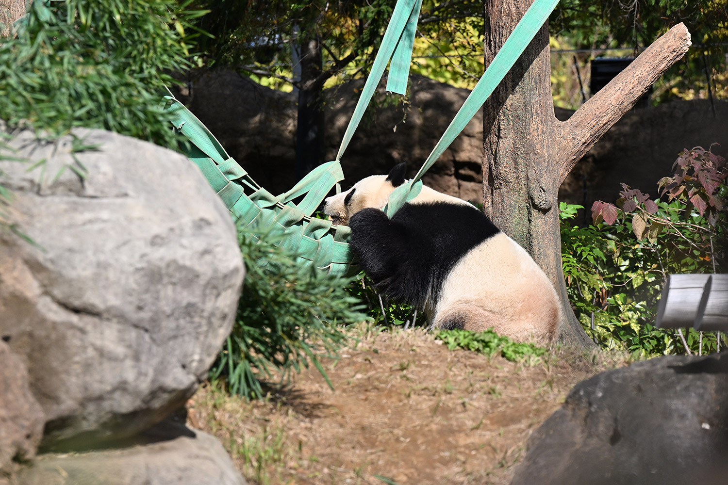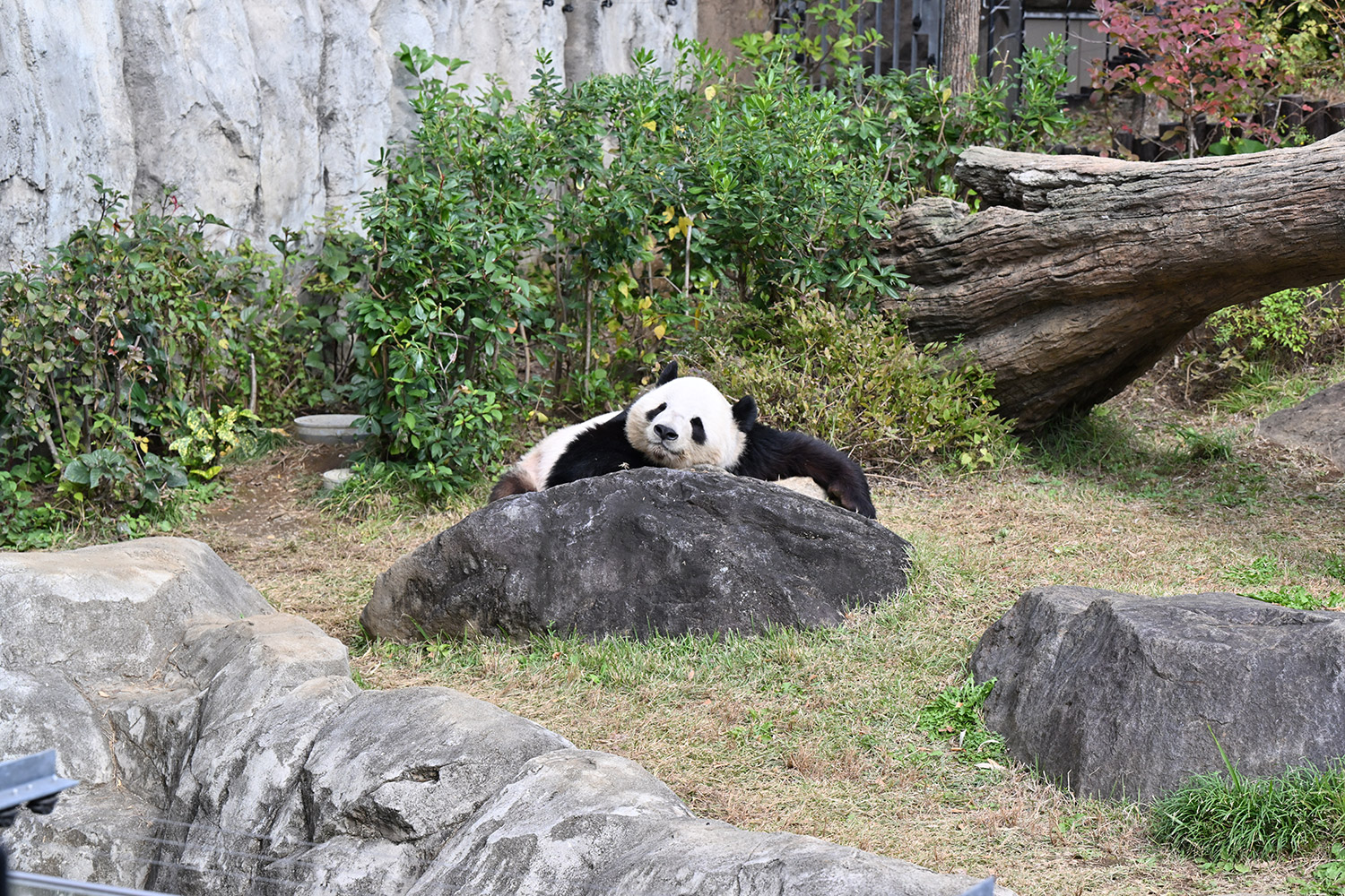 おやつゲットできたのかなぁ〜〜!?🐼💚大きな石に持たれてネムネム〜〜💤💤リラックスできるね❣️