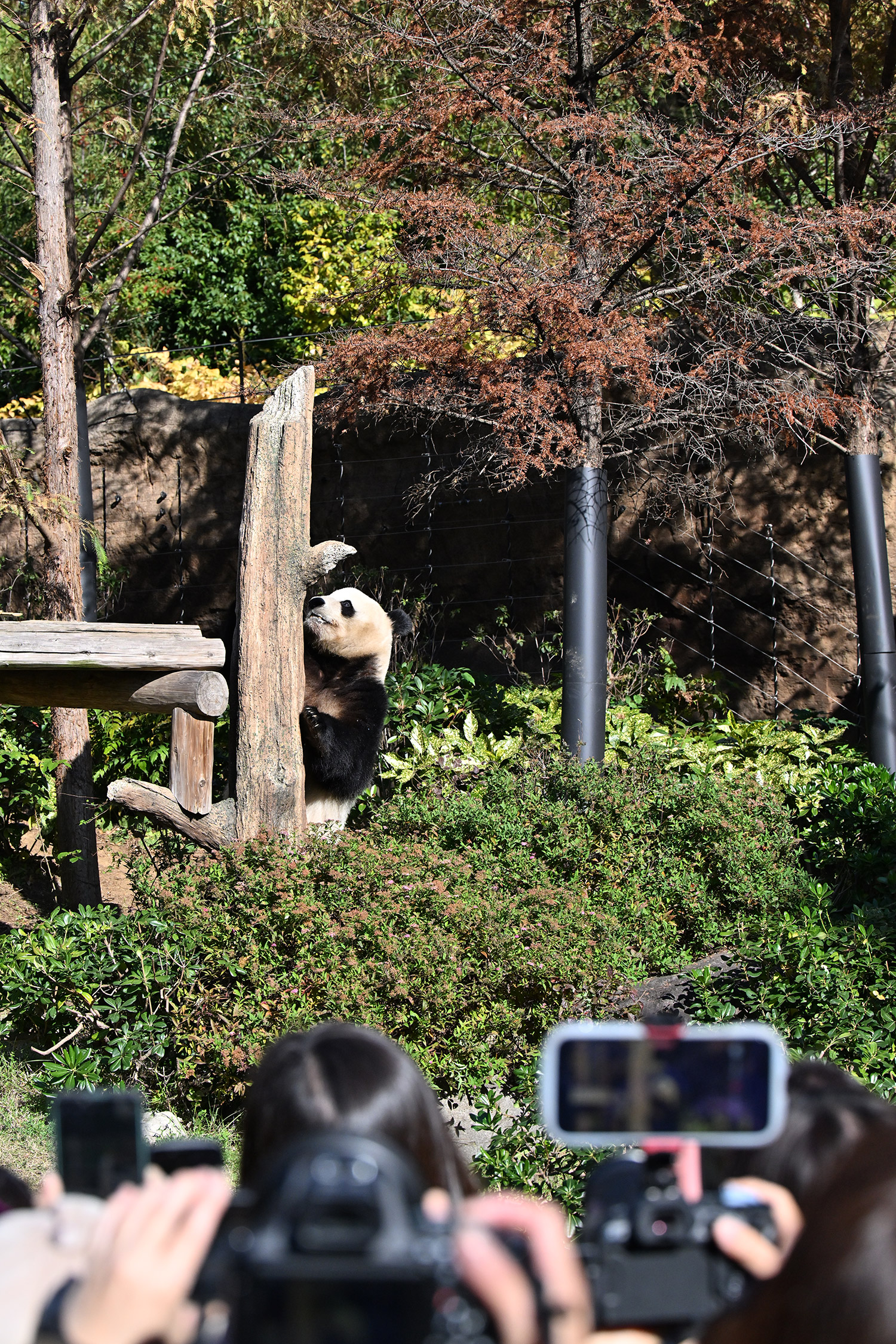 私も10時15分頃からレイちゃん80分待ちで(途中、レイちゃん観覧を終えられた高氏様のお姿をチラリ👀)お部屋正面でお食事するレイちゃんに感動のあまり、録画ボタンを押し忘れてかなり落ち込みました💦次のエリアではお庭で擬木に吊るされた竹筒と根気強く向き合っていました。待機中シンシンの小さなお庭の真っ赤に色づいた葉を眺めていると、シンシンの笑顔が浮かんできて励まされているような気持ちになりました。シャオのお庭はライブハウスのような盛り上がり🎶幼稚園の子供達も続々と参加🤣