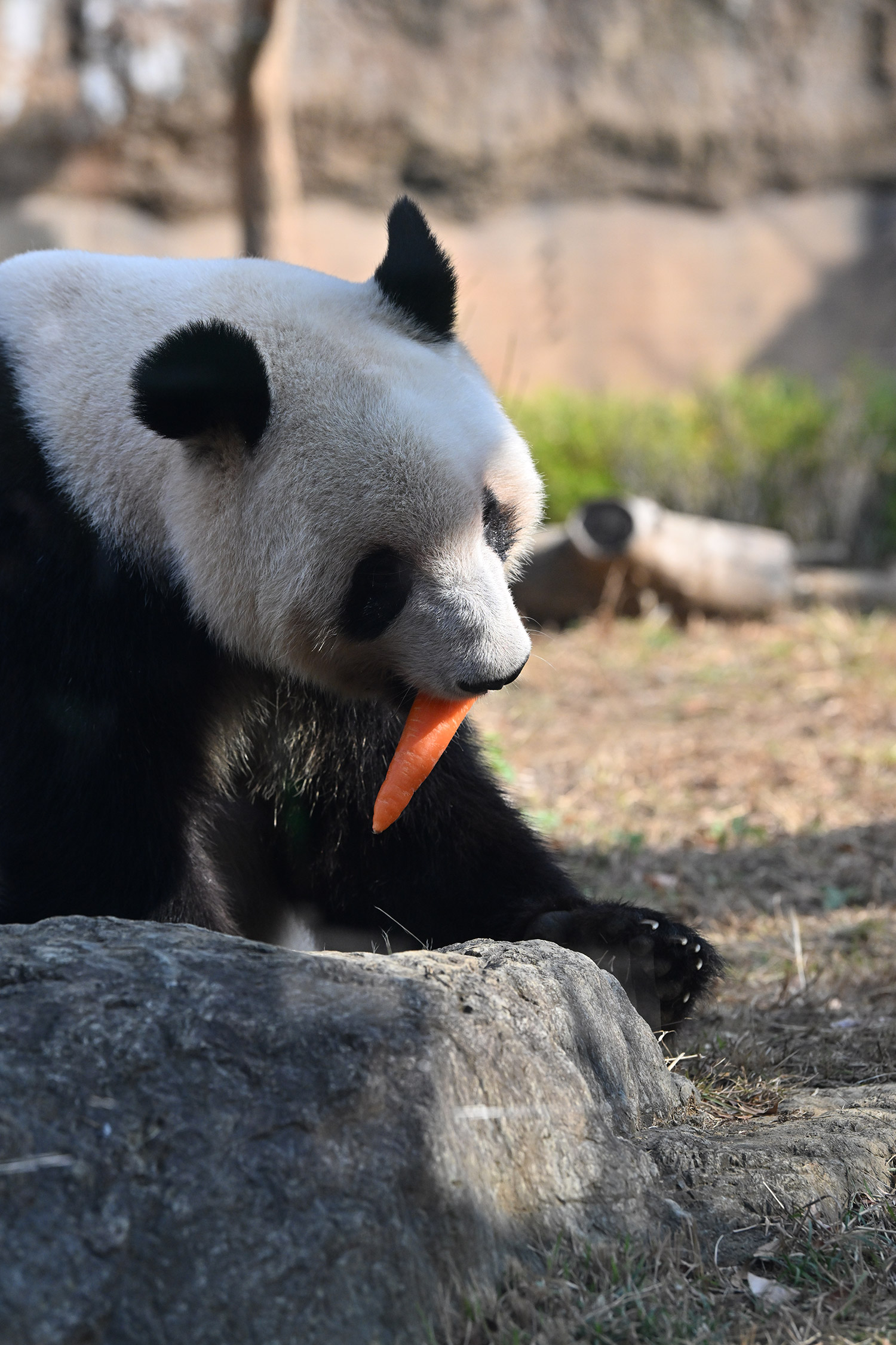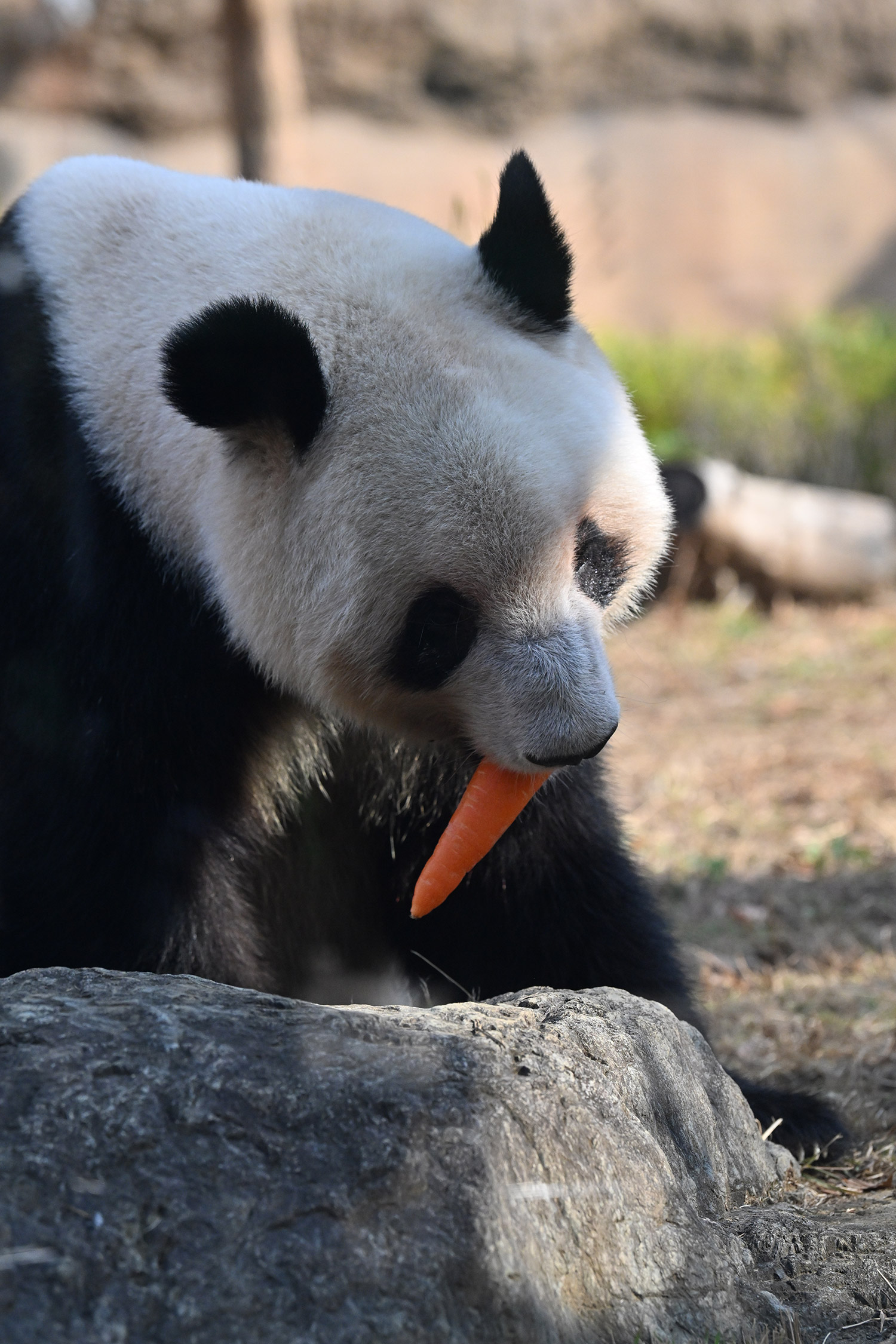左手に人参🥕岩にもたれて食べているレイちゃんが一瞬シャンシャンに見えました。あれ!?と思ったらレイちゃんでした🤣💦 こちらを向いて抗議するレイちゃん💢 ごめんね美🐼姉妹だからまちがえまちた😄❤️ 再び木登りシャオくんのお背中うねうね🌳から降りる様子も何とも可愛いです😍❤️ 氏さまが心をこめて大切に切り取って下さったお写真の一枚いちまい本当にありがとうございます😊💕