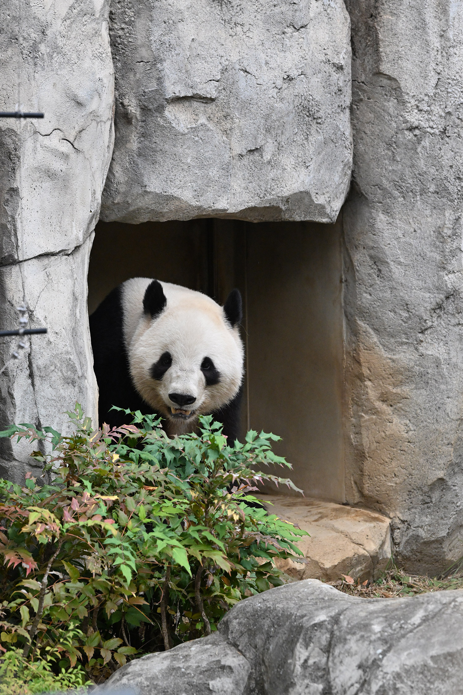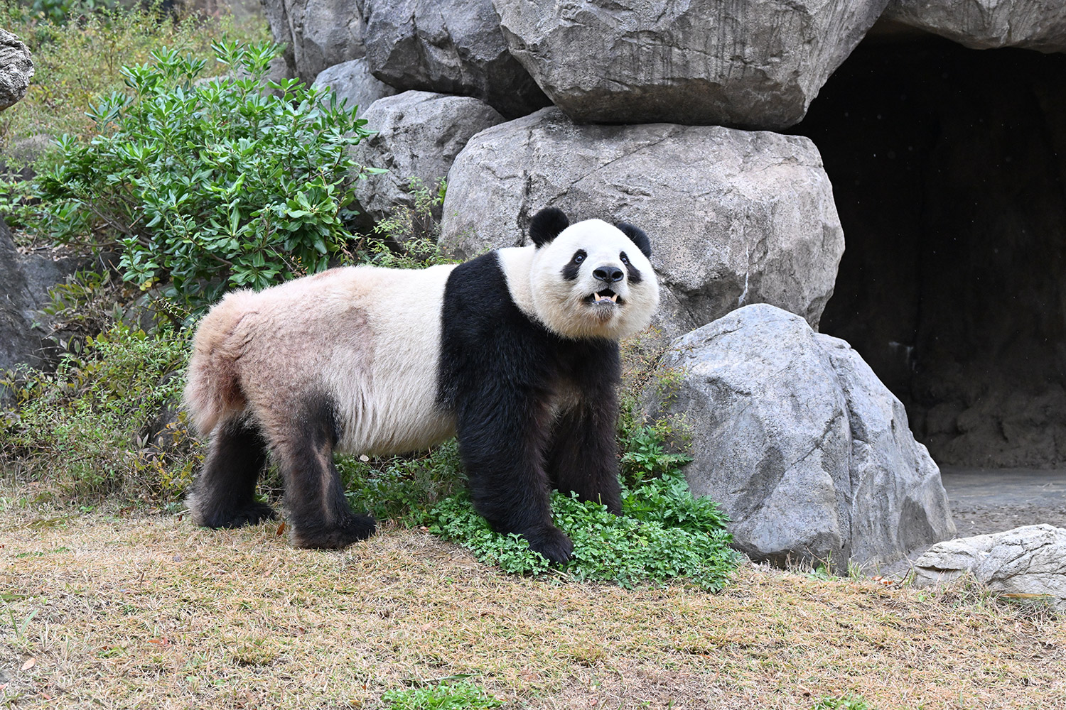 洞窟前で上の方を見上げるシャオシャオがリーリーそっくり。