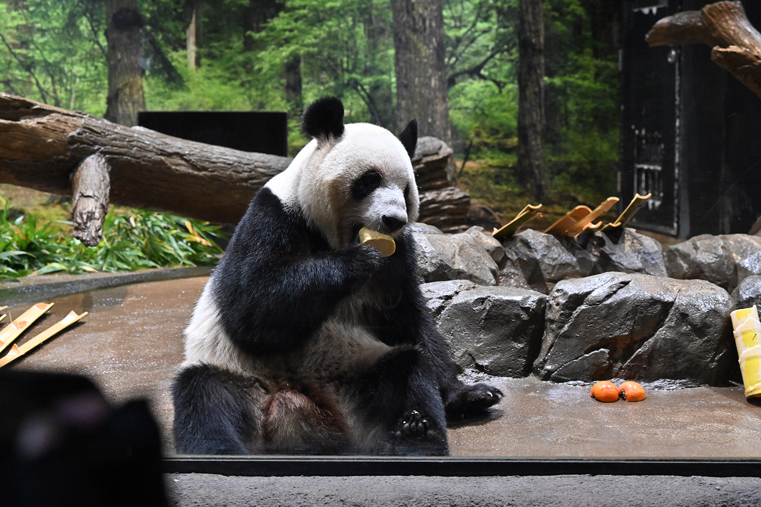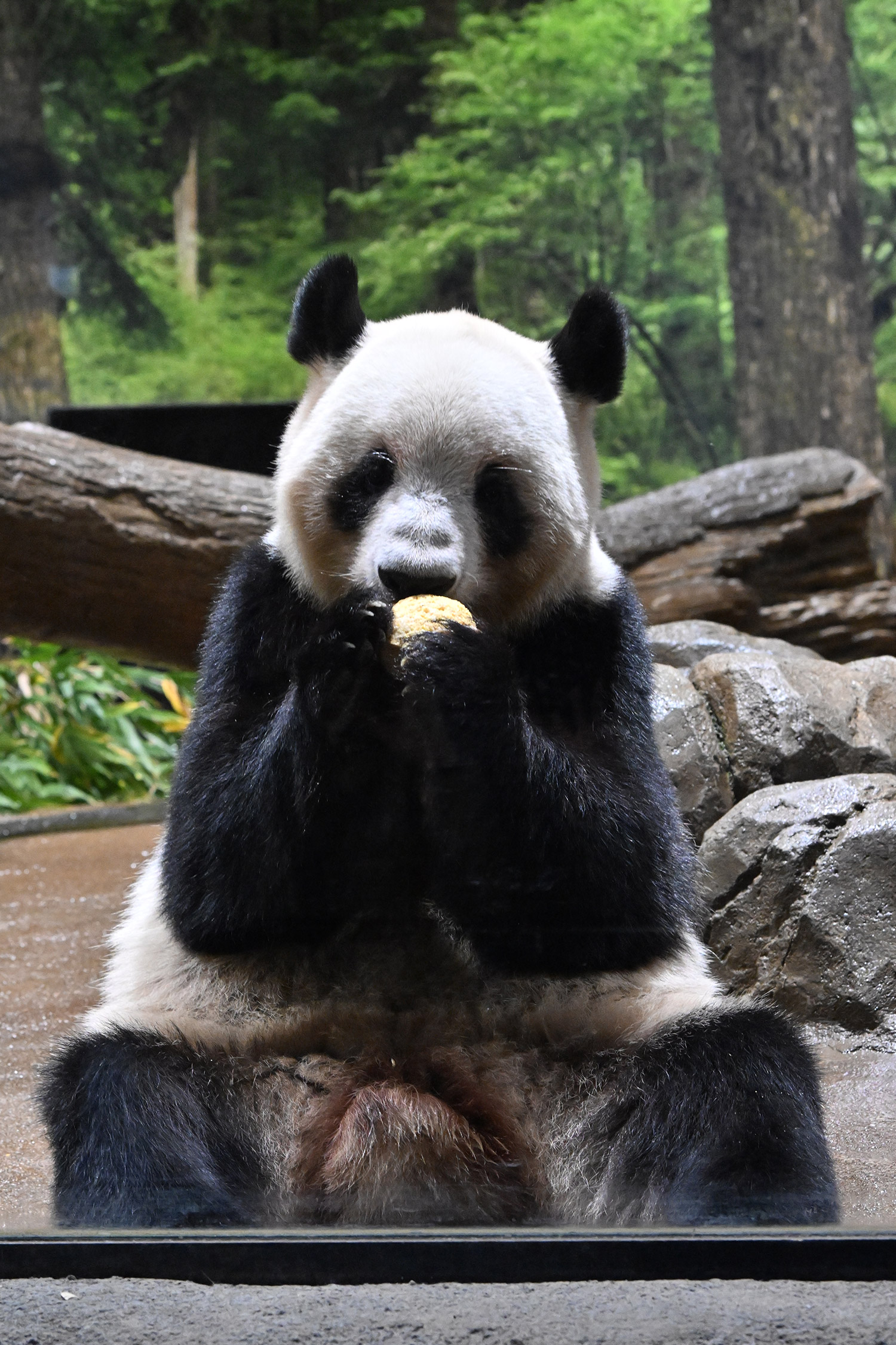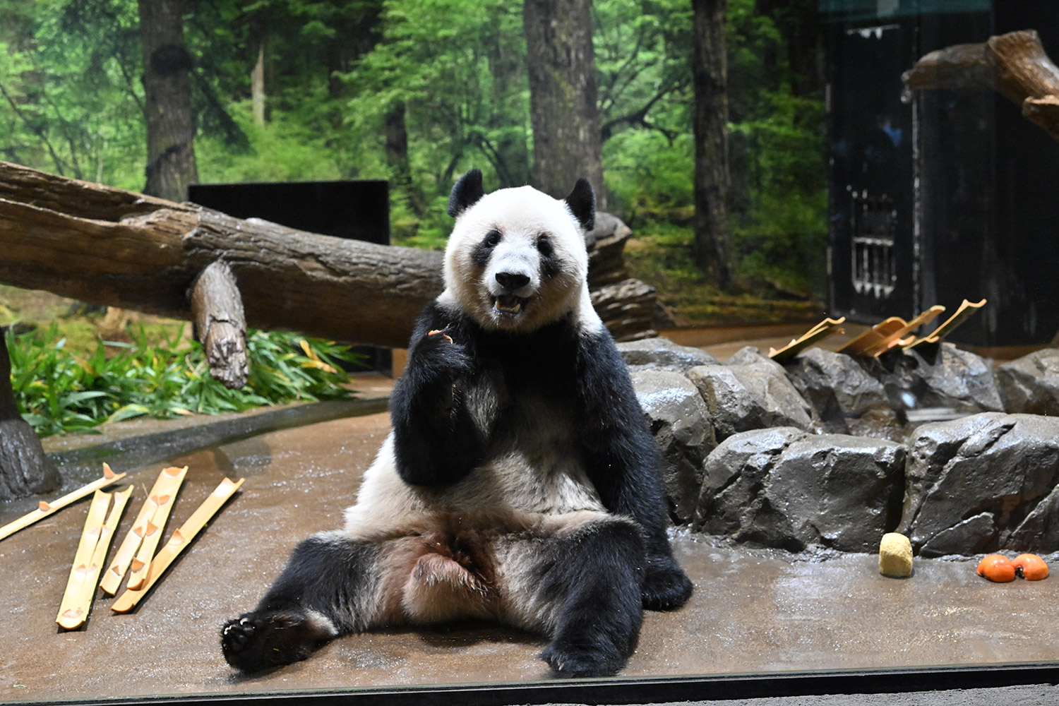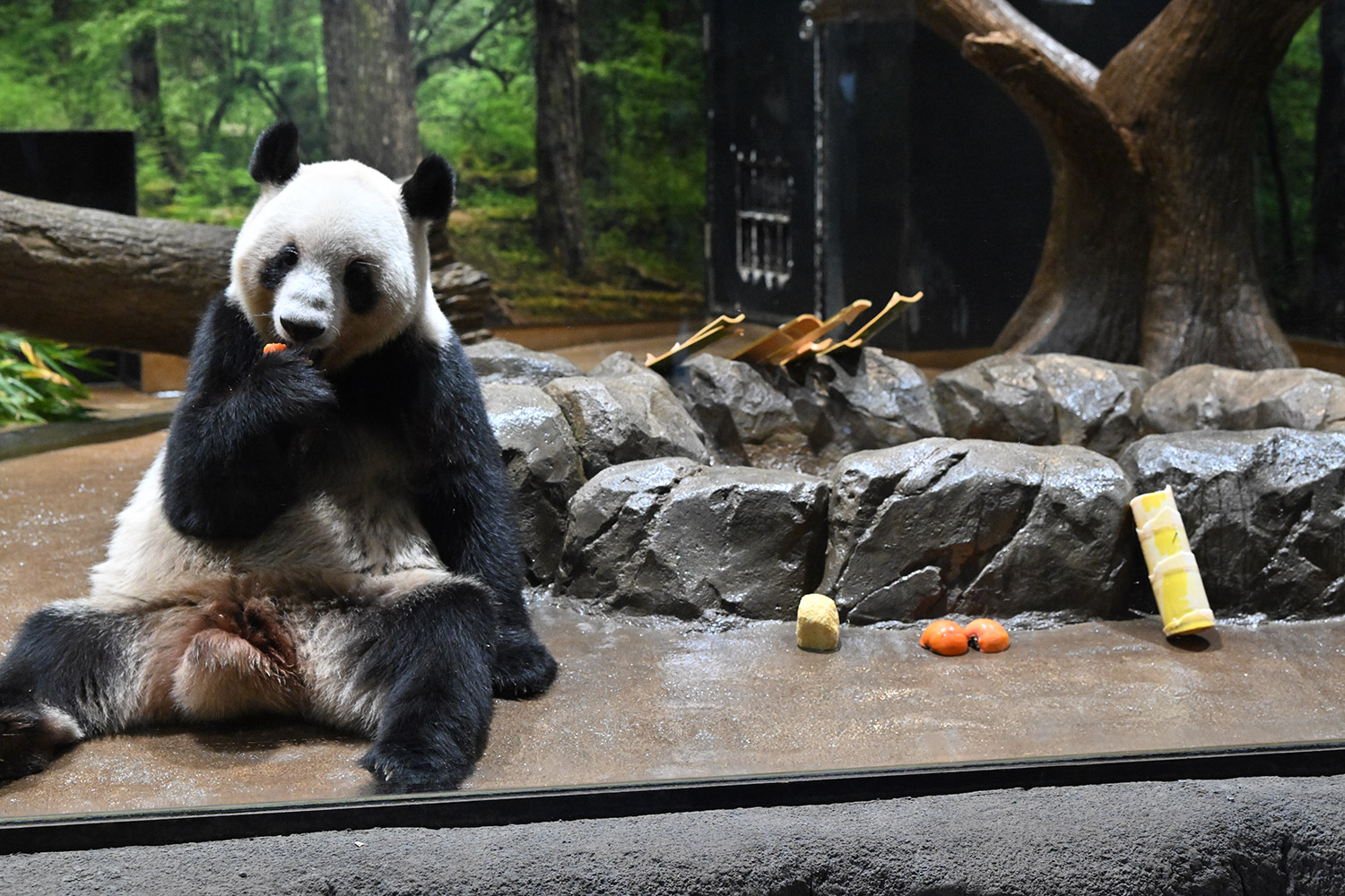 今日はパンダ団子が!レイちゃんの表情で美味しいのが♡分かりますね。筍は茹でた物なのかな、私には美味しそうに見えますがポツンと…ですね。シャオ君、場所を変えてお食事や木登りとお庭を満喫😊これだけ沢山のお写真を撮影されるのは、かなり大変なのではと想像いたします。私もシャオ君だけ午後観覧、お部屋で斜めのお食事姿。一生懸命でまあるい頭が、ピョコピョコ動いてなんて可愛いんでしょうと同時に会えなくなるんだと鼻の奥がツンとしました。観覧の場所はぎゅうぎゅうの人で「もうすぐいなくなっちゃうから」の声も聴こえました。レイちゃんに並ぶのは無理で諦め、初めて池之端門から出て根津千駄木と歩いて地下鉄へ、暑く無いので街歩きしてみました💨明日は土曜日また更に混雑しますね。どんな時も素敵なお写真を見せて下さりありがとうごさいます✨✨