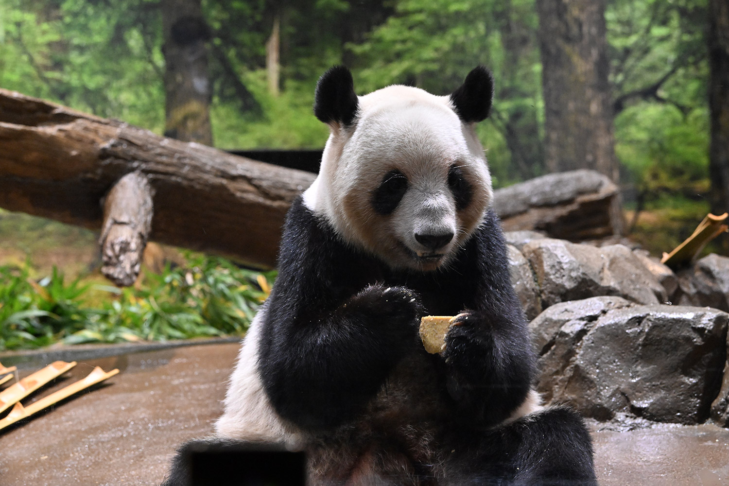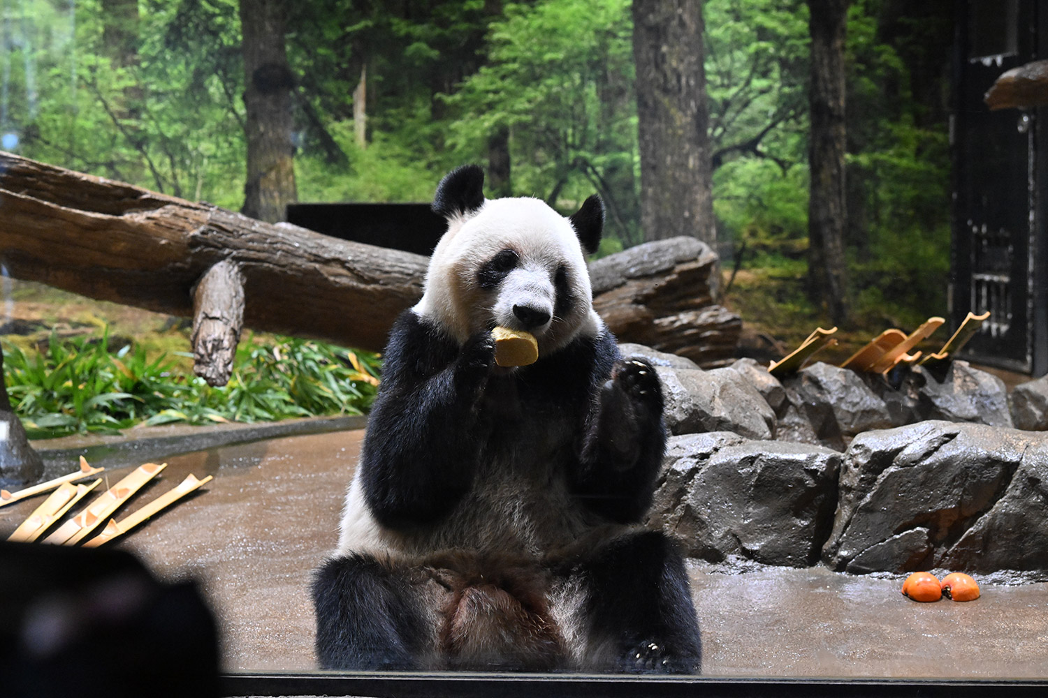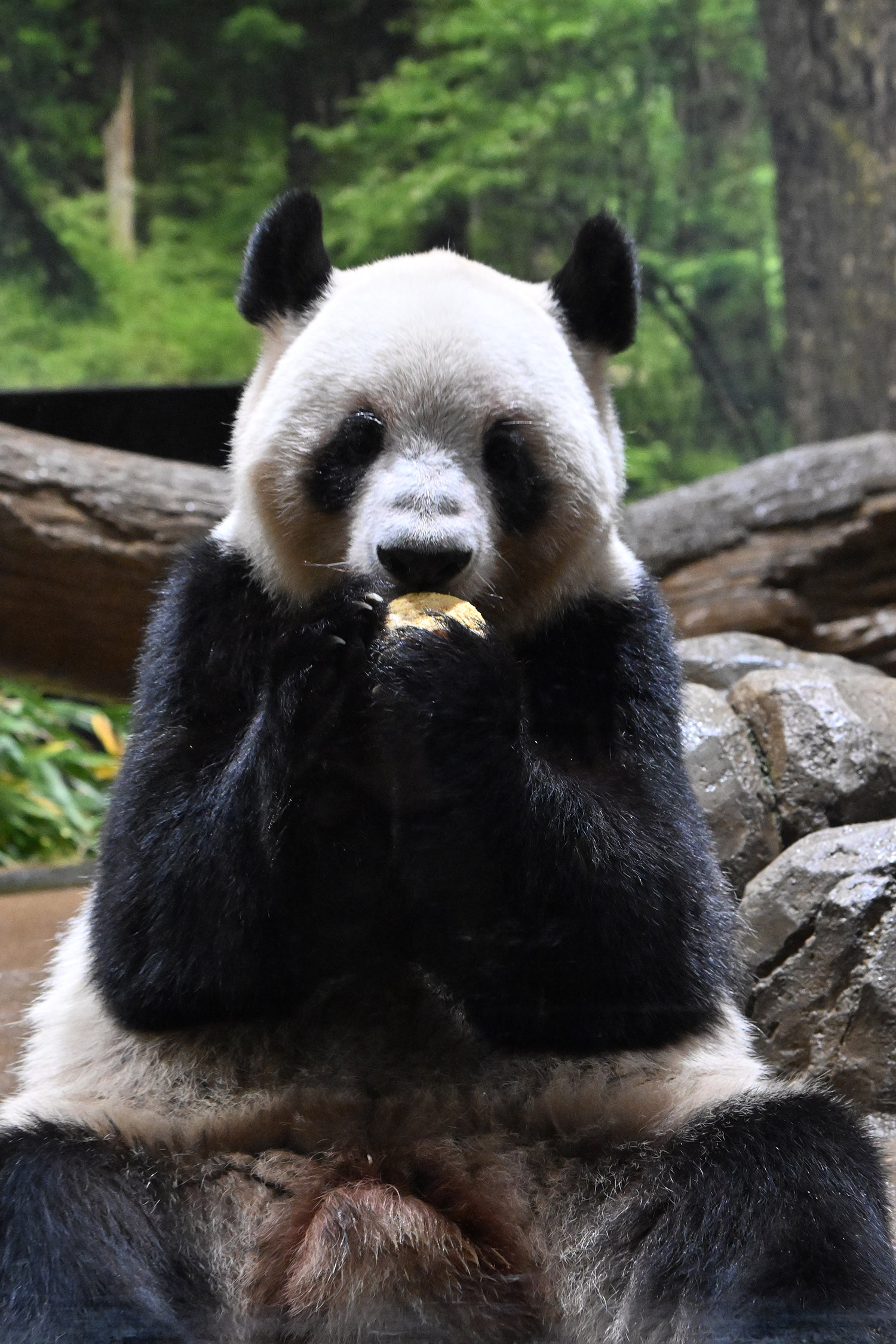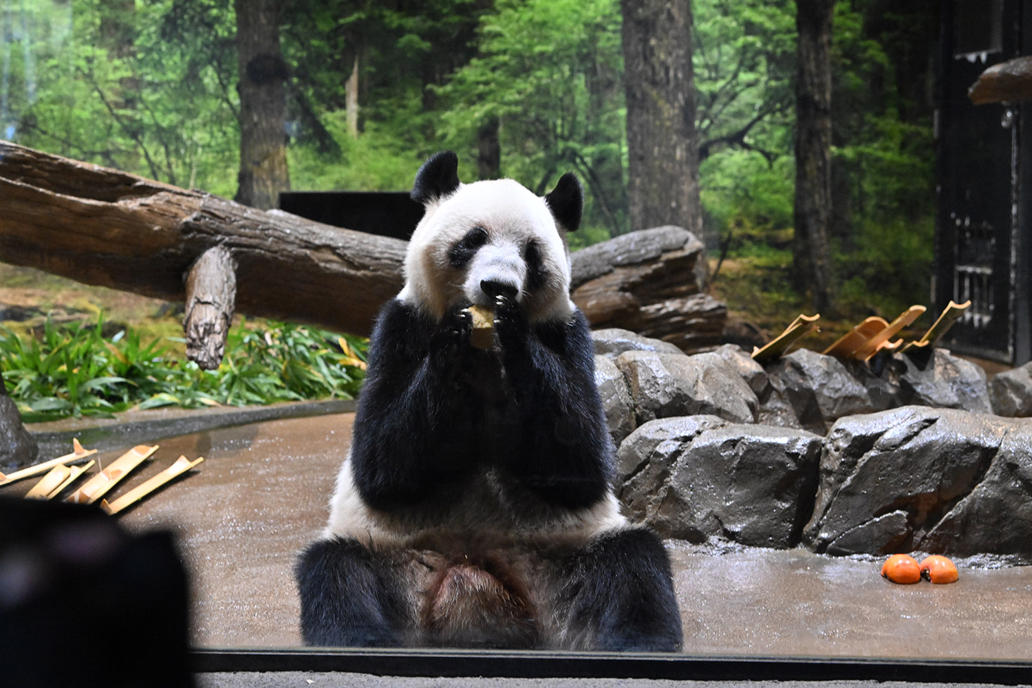 今日はパンダ団子が!レイちゃんの表情で美味しいのが♡分かりますね。筍は茹でた物なのかな、私には美味しそうに見えますがポツンと…ですね。シャオ君、場所を変えてお食事や木登りとお庭を満喫😊これだけ沢山のお写真を撮影されるのは、かなり大変なのではと想像いたします。私もシャオ君だけ午後観覧、お部屋で斜めのお食事姿。一生懸命でまあるい頭が、ピョコピョコ動いてなんて可愛いんでしょうと同時に会えなくなるんだと鼻の奥がツンとしました。観覧の場所はぎゅうぎゅうの人で「もうすぐいなくなっちゃうから」の声も聴こえました。レイちゃんに並ぶのは無理で諦め、初めて池之端門から出て根津千駄木と歩いて地下鉄へ、暑く無いので街歩きしてみました💨明日は土曜日また更に混雑しますね。どんな時も素敵なお写真を見せて下さりありがとうごさいます✨✨