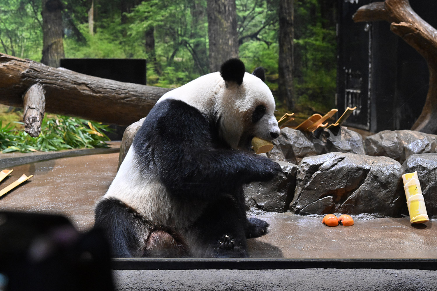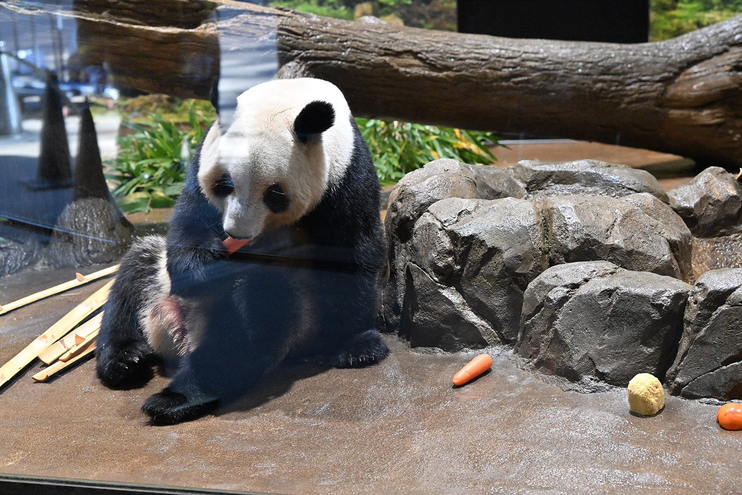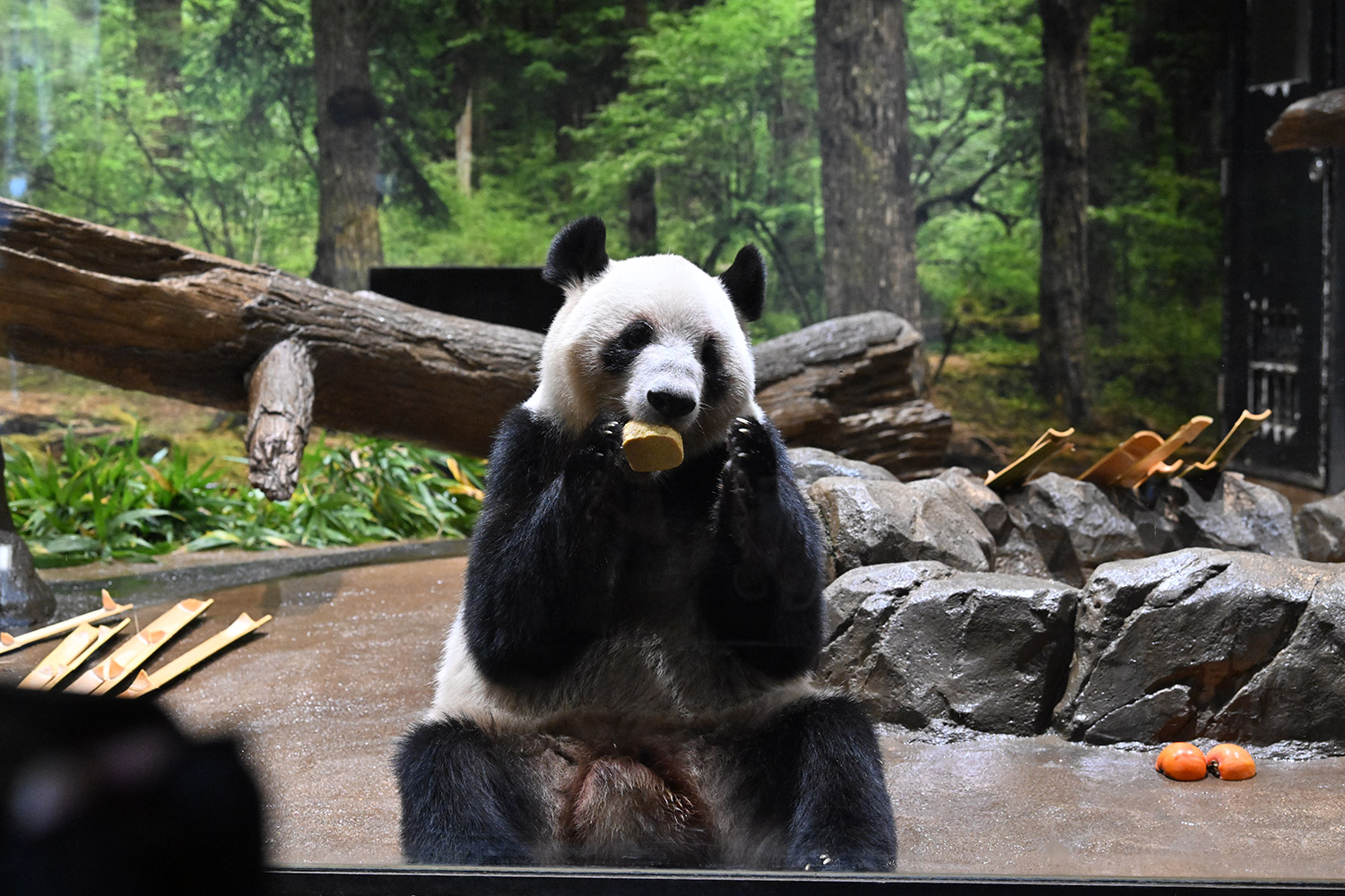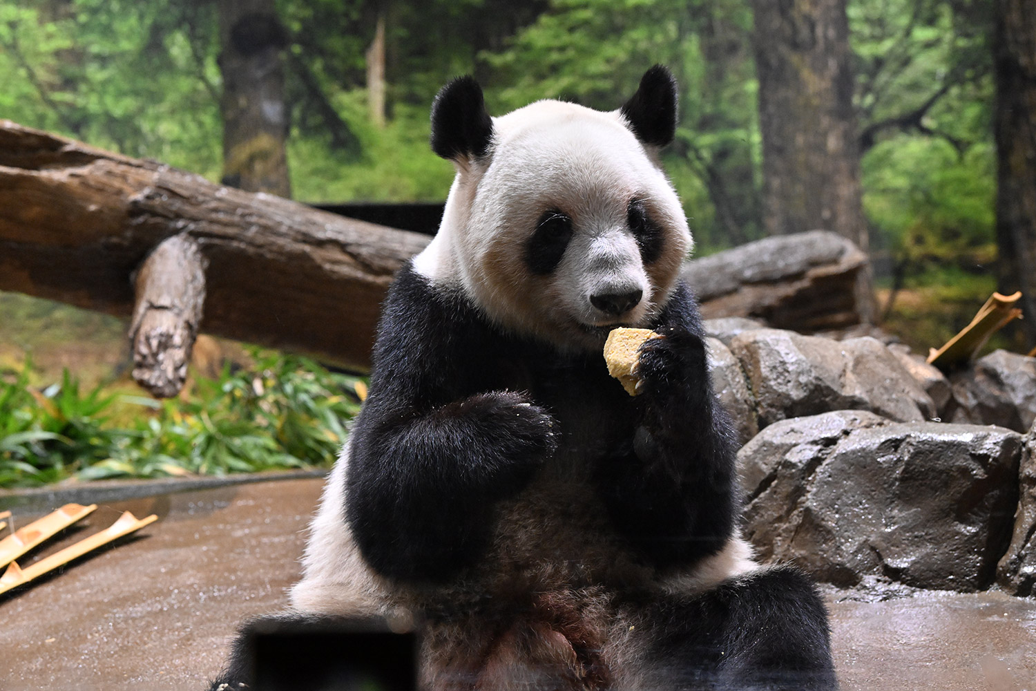 今日はパンダ団子が!レイちゃんの表情で美味しいのが♡分かりますね。筍は茹でた物なのかな、私には美味しそうに見えますがポツンと…ですね。シャオ君、場所を変えてお食事や木登りとお庭を満喫😊これだけ沢山のお写真を撮影されるのは、かなり大変なのではと想像いたします。私もシャオ君だけ午後観覧、お部屋で斜めのお食事姿。一生懸命でまあるい頭が、ピョコピョコ動いてなんて可愛いんでしょうと同時に会えなくなるんだと鼻の奥がツンとしました。観覧の場所はぎゅうぎゅうの人で「もうすぐいなくなっちゃうから」の声も聴こえました。レイちゃんに並ぶのは無理で諦め、初めて池之端門から出て根津千駄木と歩いて地下鉄へ、暑く無いので街歩きしてみました💨明日は土曜日また更に混雑しますね。どんな時も素敵なお写真を見せて下さりありがとうごさいます✨✨