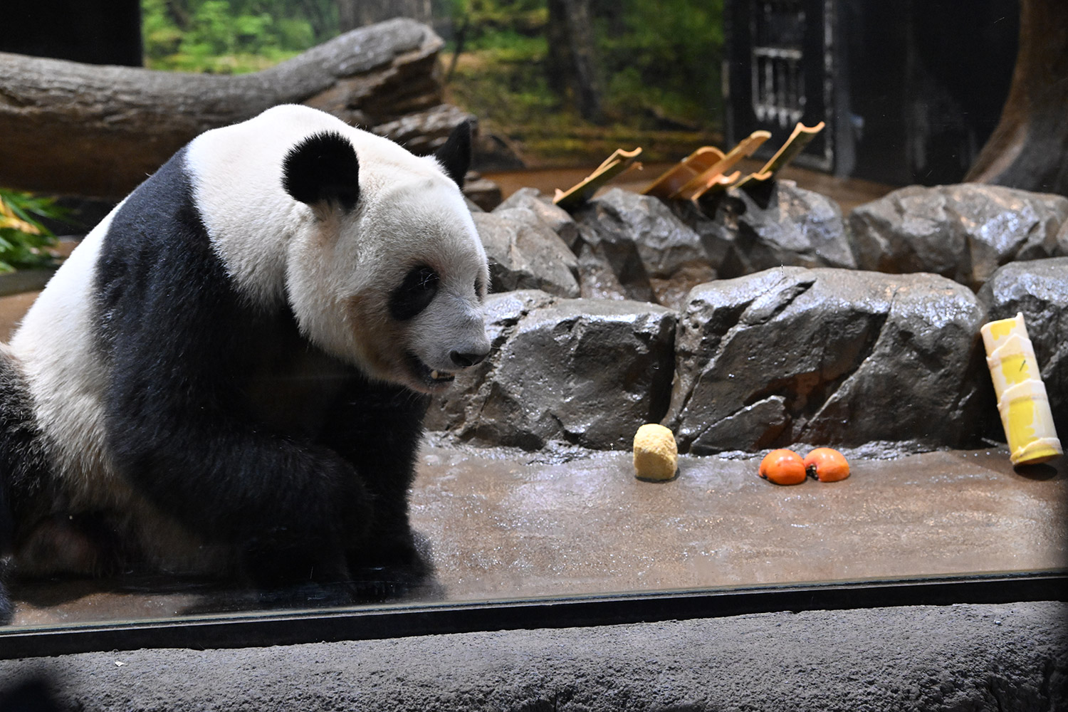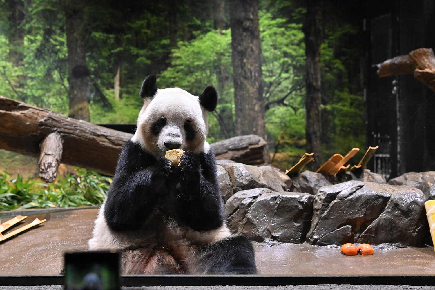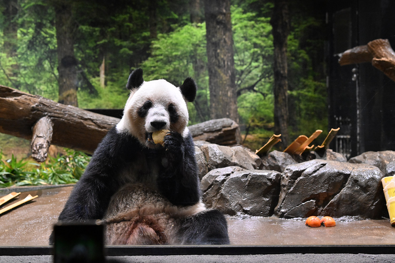 レイちゃんは充実のおやつタイム😋🍡大きなパンダ団子を美味しそうに食べる様子をありがとうございます🙏 雅安の香香もマルセイユ石鹸みたいに大きなお団子を食べていましたね。香香は大胆にひと口でもぐもぐ🤣💕 レイちゃん柿は気に入ったご様子で良かったです。
