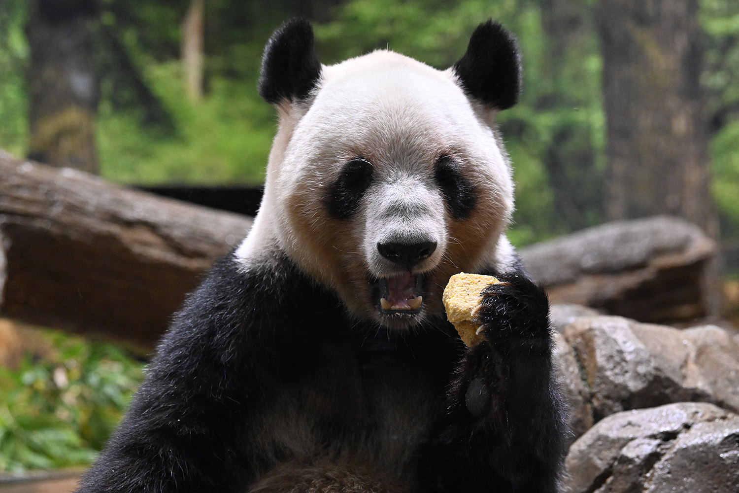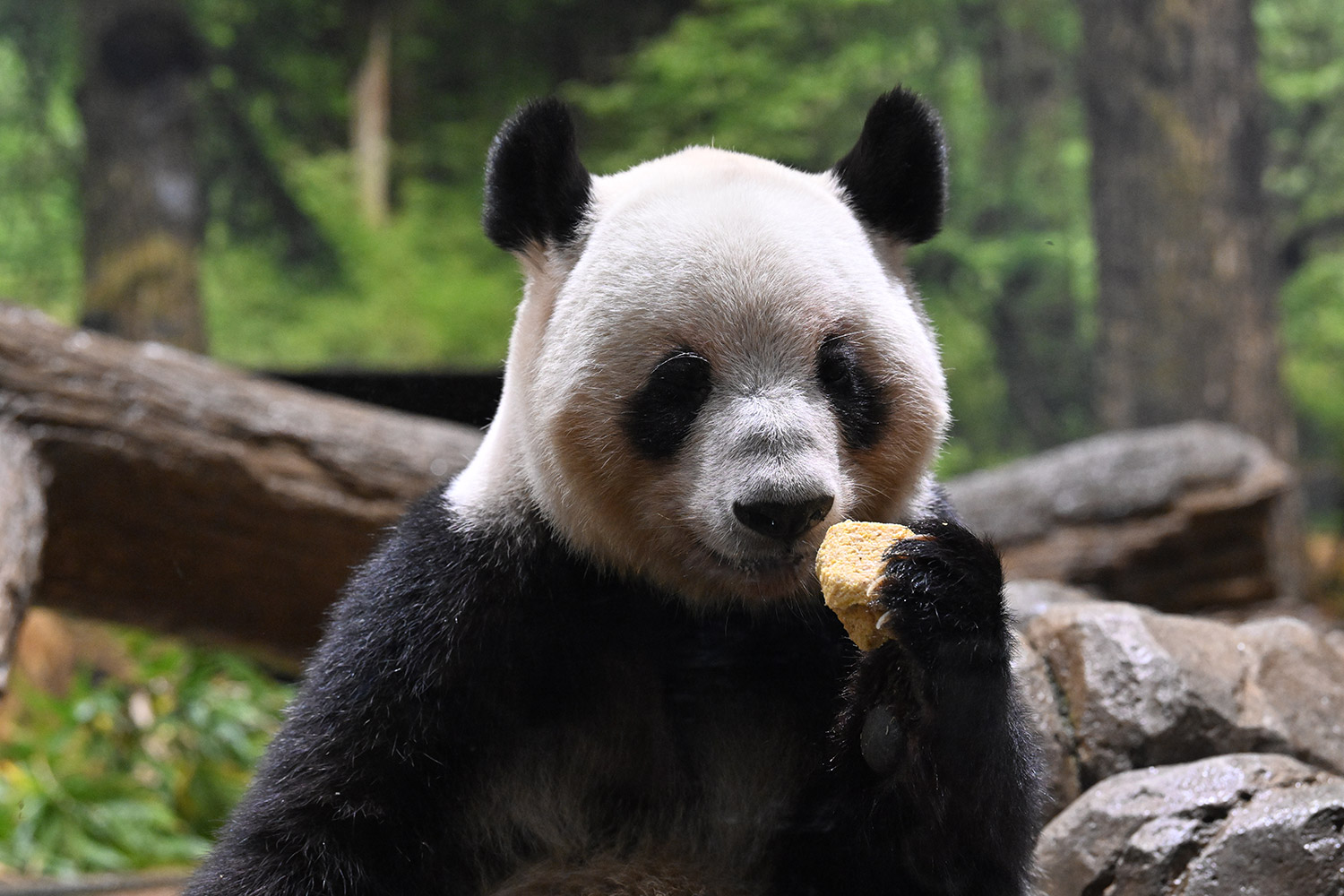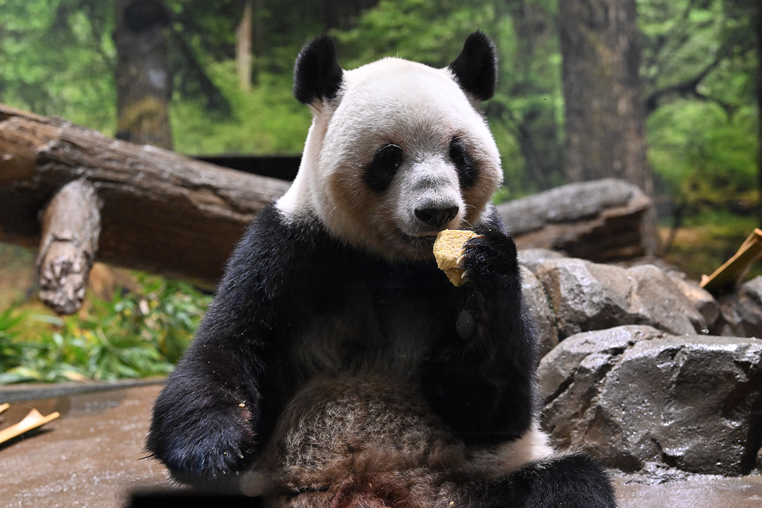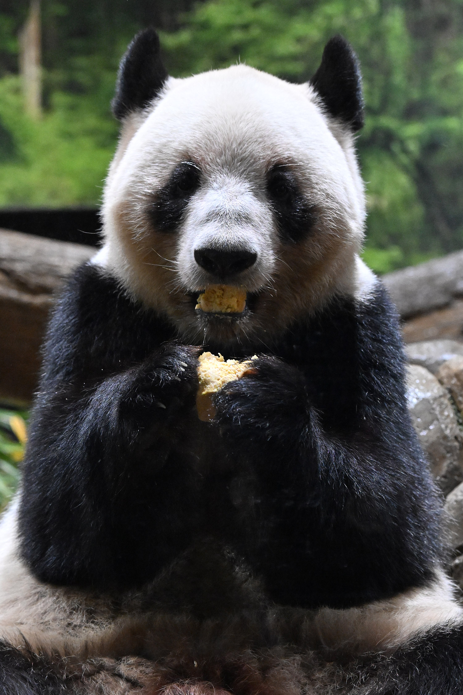 レイちゃんは充実のおやつタイム😋🍡大きなパンダ団子を美味しそうに食べる様子をありがとうございます🙏 雅安の香香もマルセイユ石鹸みたいに大きなお団子を食べていましたね。香香は大胆にひと口でもぐもぐ🤣💕 レイちゃん柿は気に入ったご様子で良かったです。