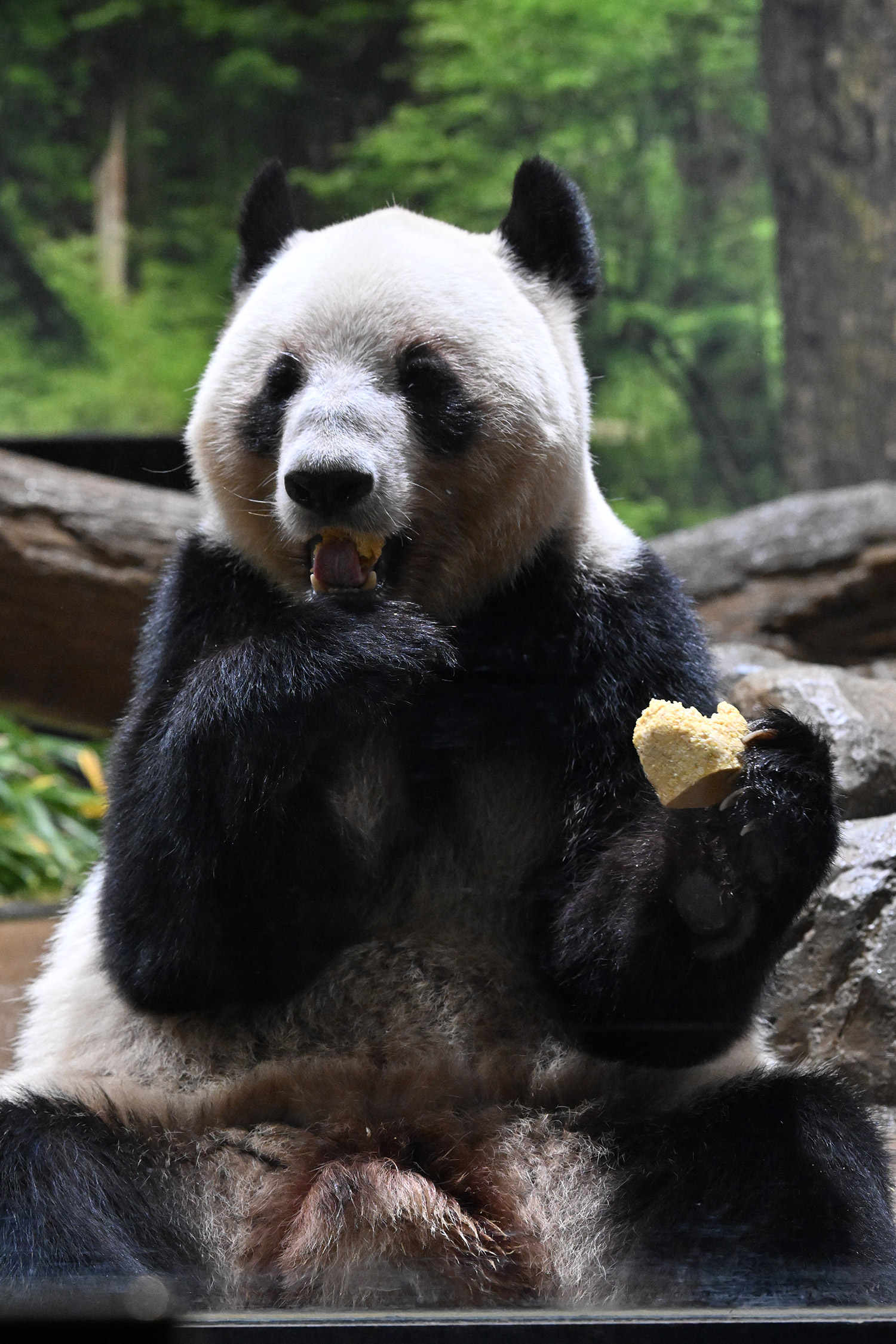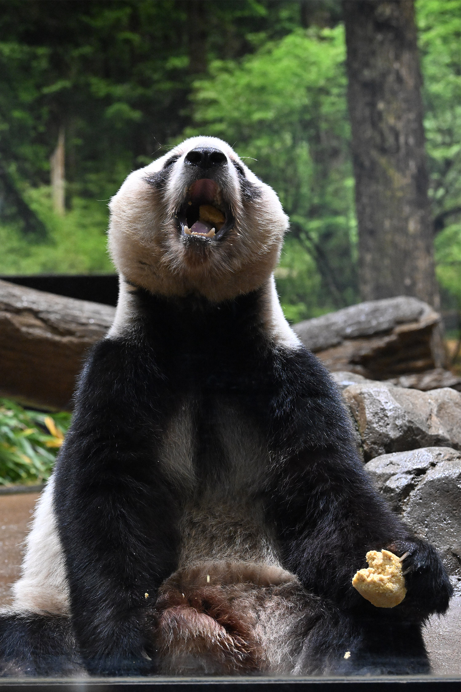 日本のオヤツも大型化してますね🤣💕食べごたえのあるサイズになってシャオレイには嬉しい変化でしょう。レイちゃん、このたけのこはイカンかった👀?いつも思うけど、パンダ団子ってパンダ蛋糕(ダンガオ:ケーキのこと)音誤訳じゃないのかしら。大きめの蛋糕を持ってるとシンシンみたいにボロボロこぼさないかしら、って思うけど、シャン同様上向いて上手に食べてますね😊💓ご飯前のお庭パトロール、お部屋に帰る前にギャラリー真ん前を通過しますよね😆!ちゃんとファンサしてくれて、レイちゃん、ありがと💕