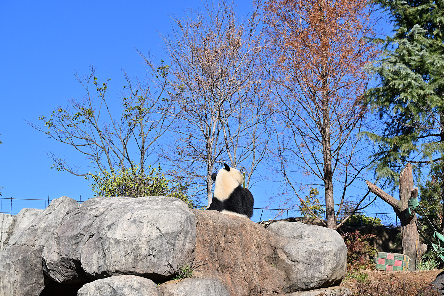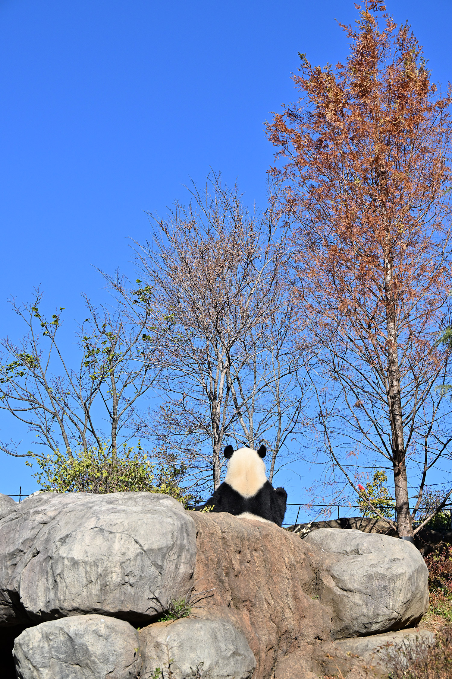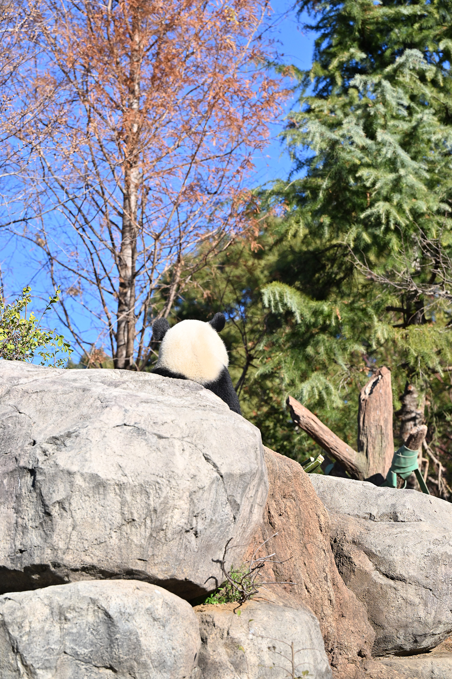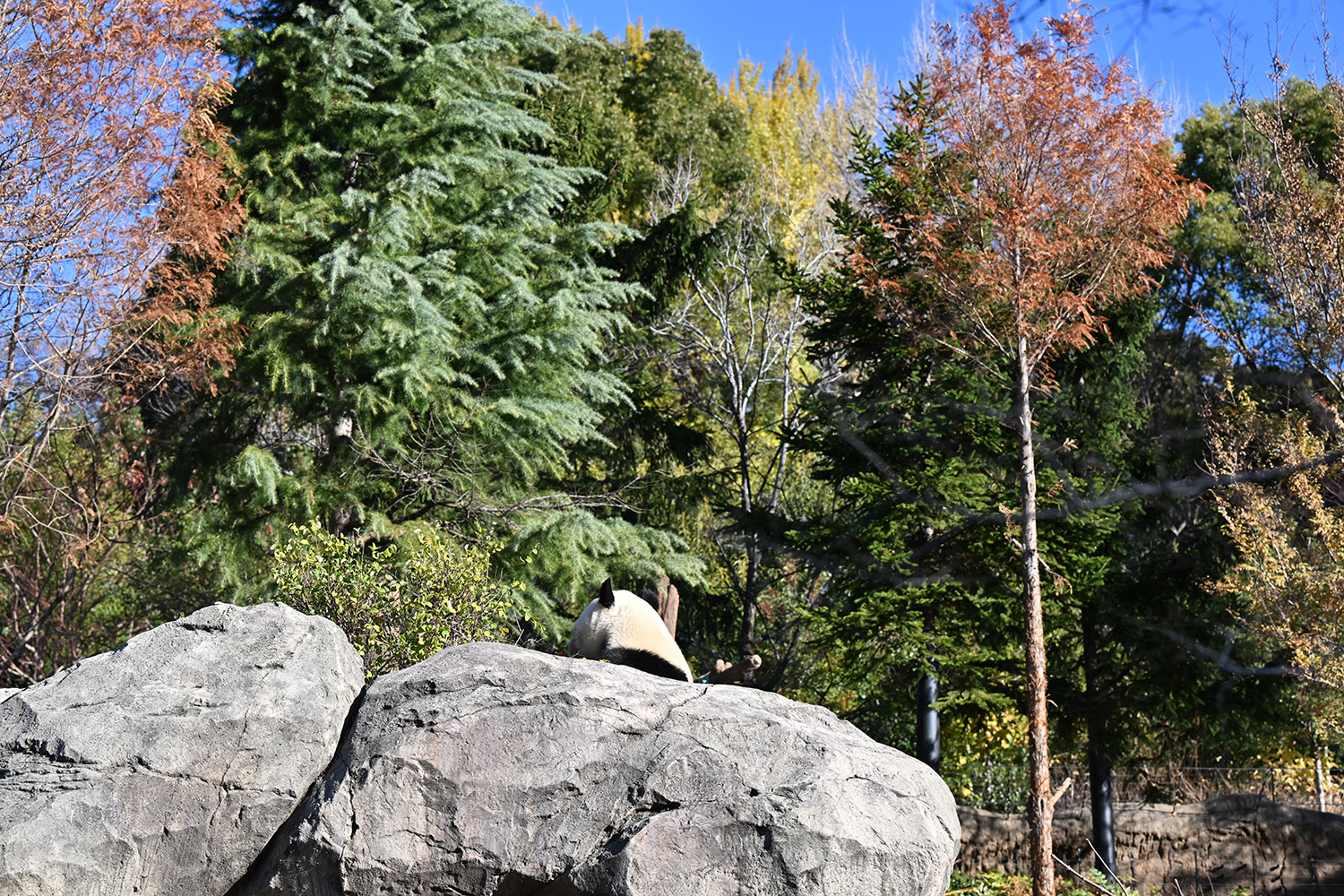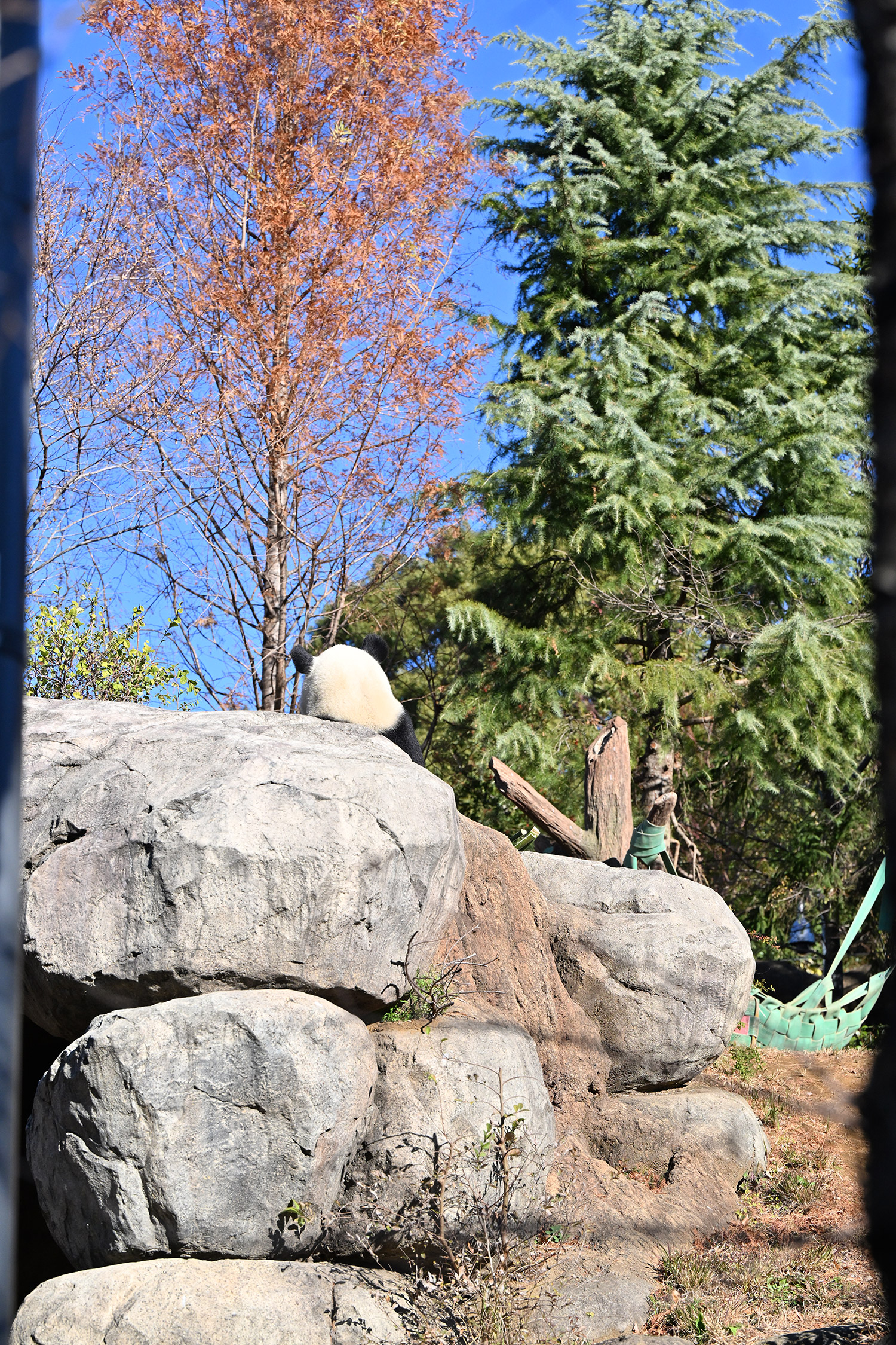 澄み渡った12月の青空と紅葉🍁白黒のシャオ🐼美しいシーンが心に染み入ります✨洞窟上の丸い後頭部、シャオと精養軒…期間限定の光景にウルッですが嬉しい!パパのお庭→シャオのお庭に。シャオ頼もしいぞ!褒めてくれるね!