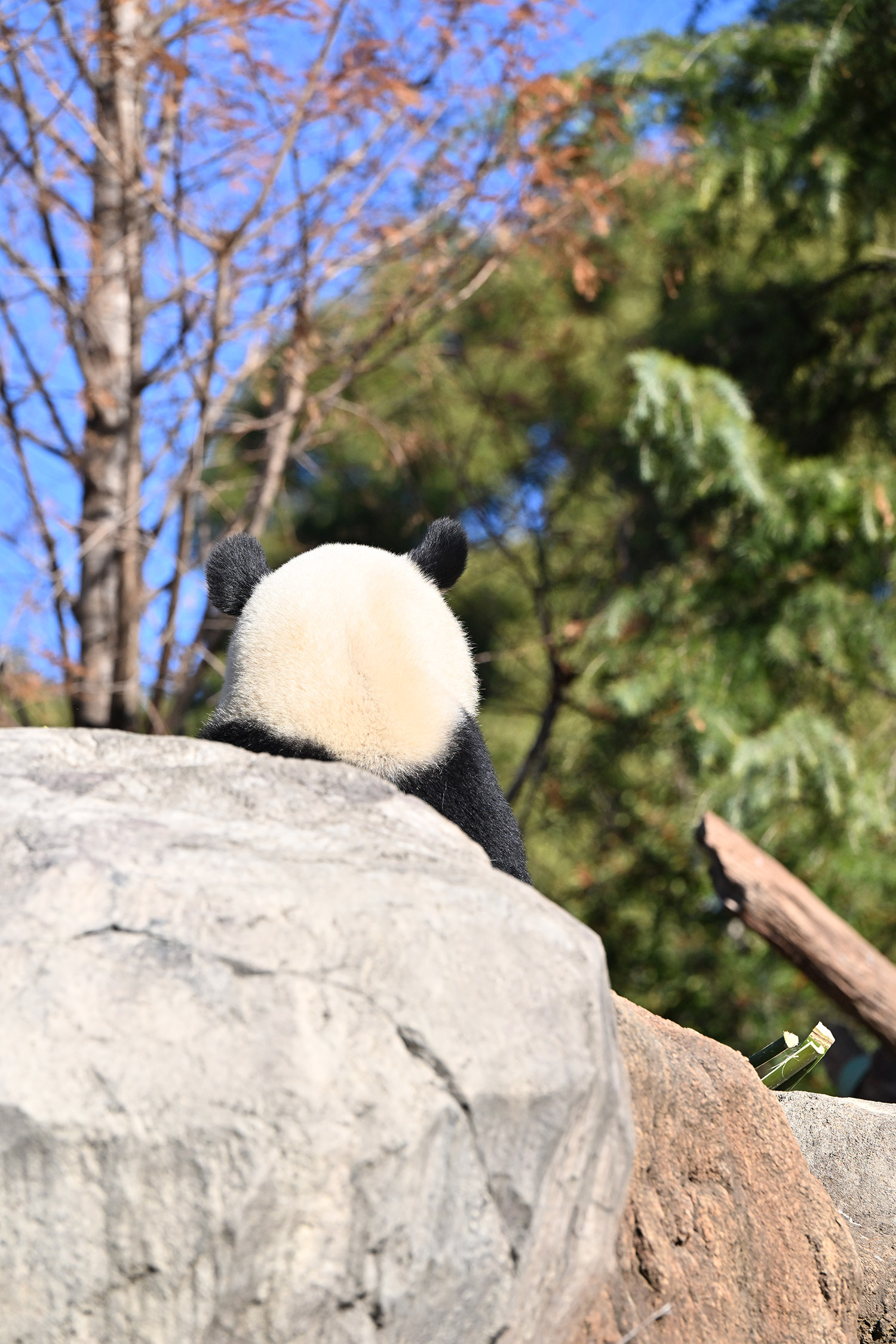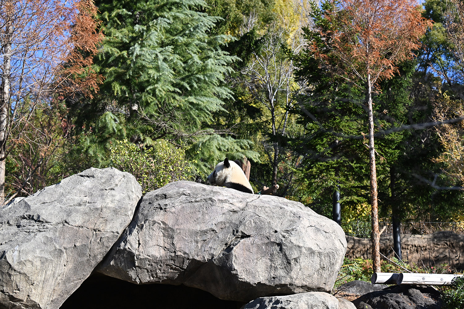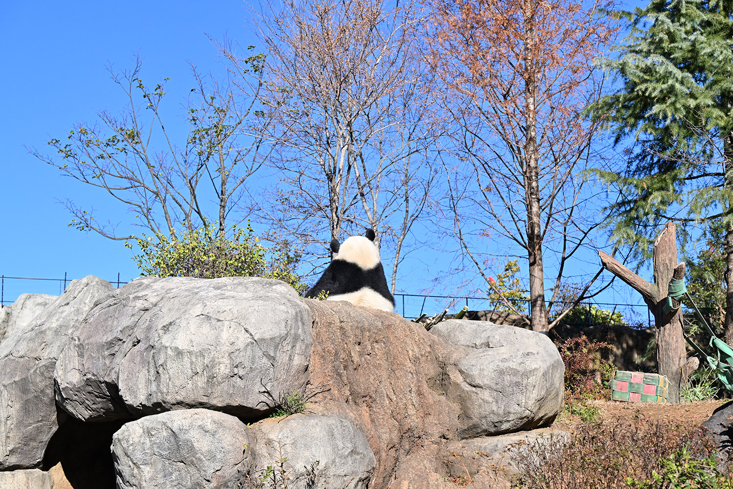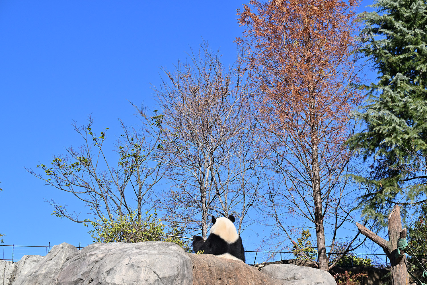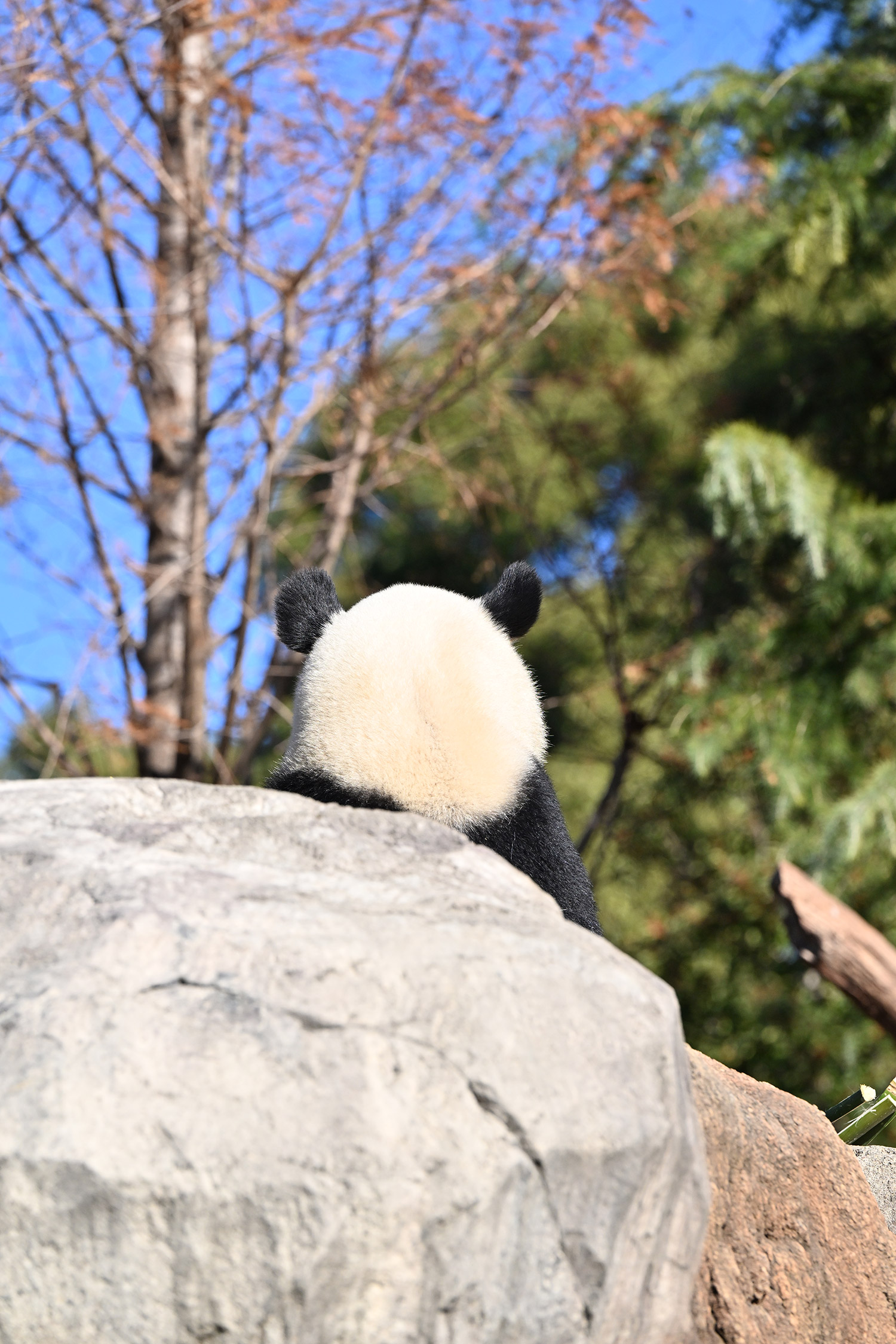 澄み渡った12月の青空と紅葉🍁白黒のシャオ🐼美しいシーンが心に染み入ります✨洞窟上の丸い後頭部、シャオと精養軒…期間限定の光景にウルッですが嬉しい!パパのお庭→シャオのお庭に。シャオ頼もしいぞ!褒めてくれるね!