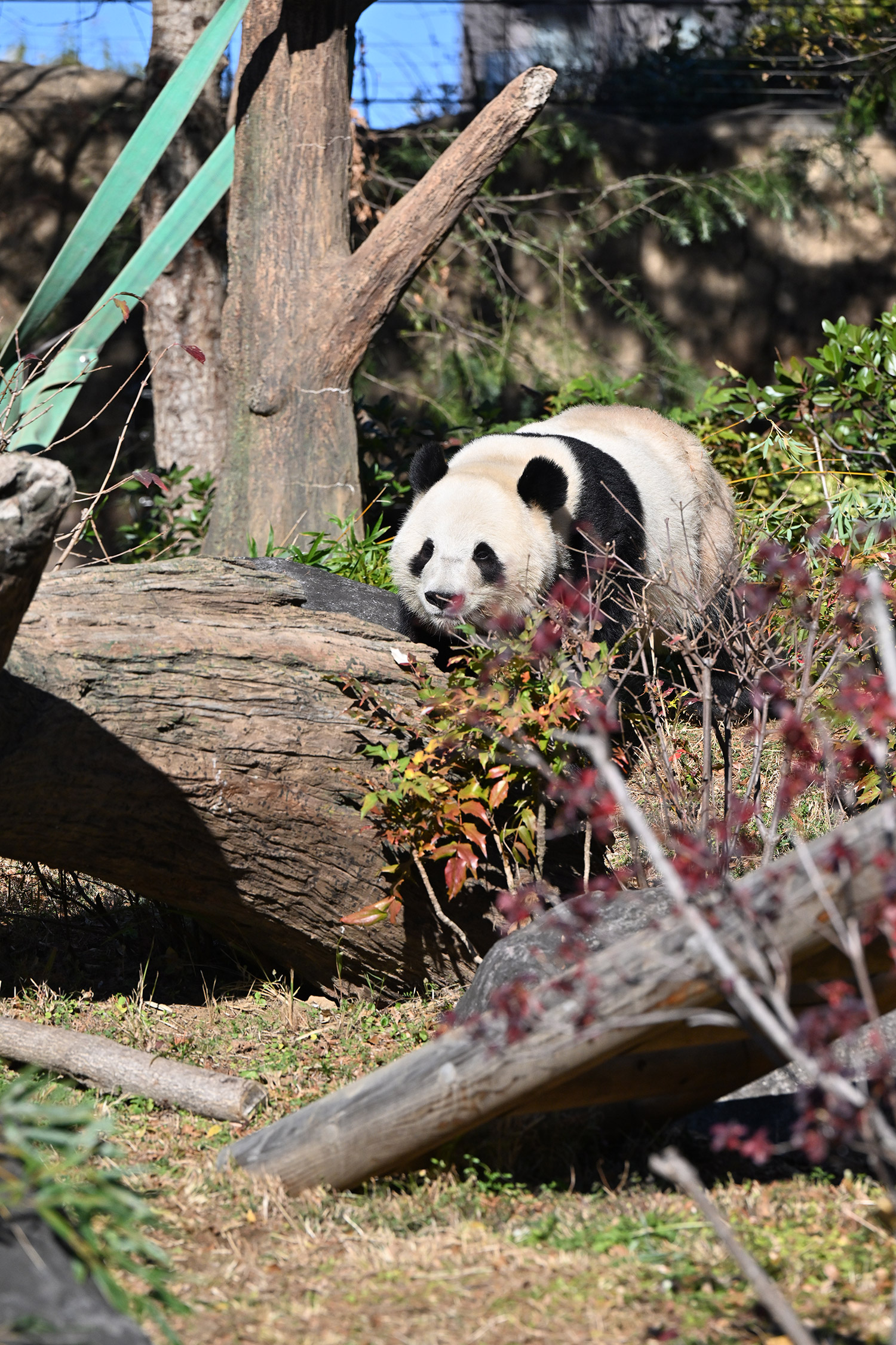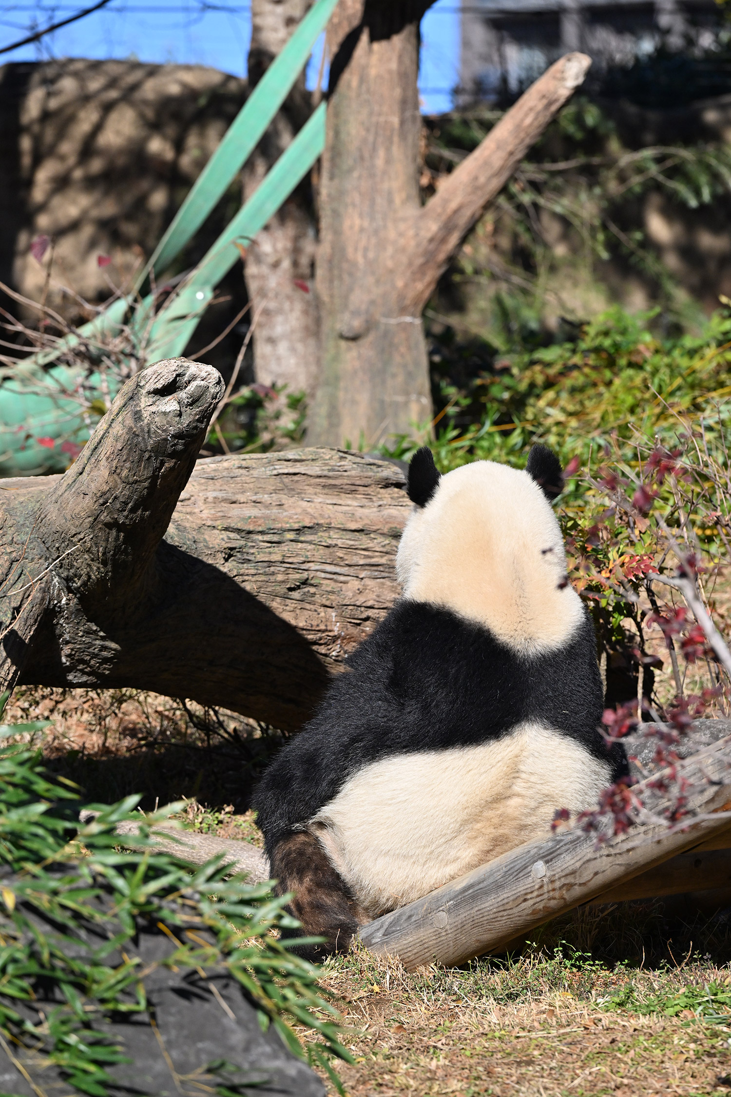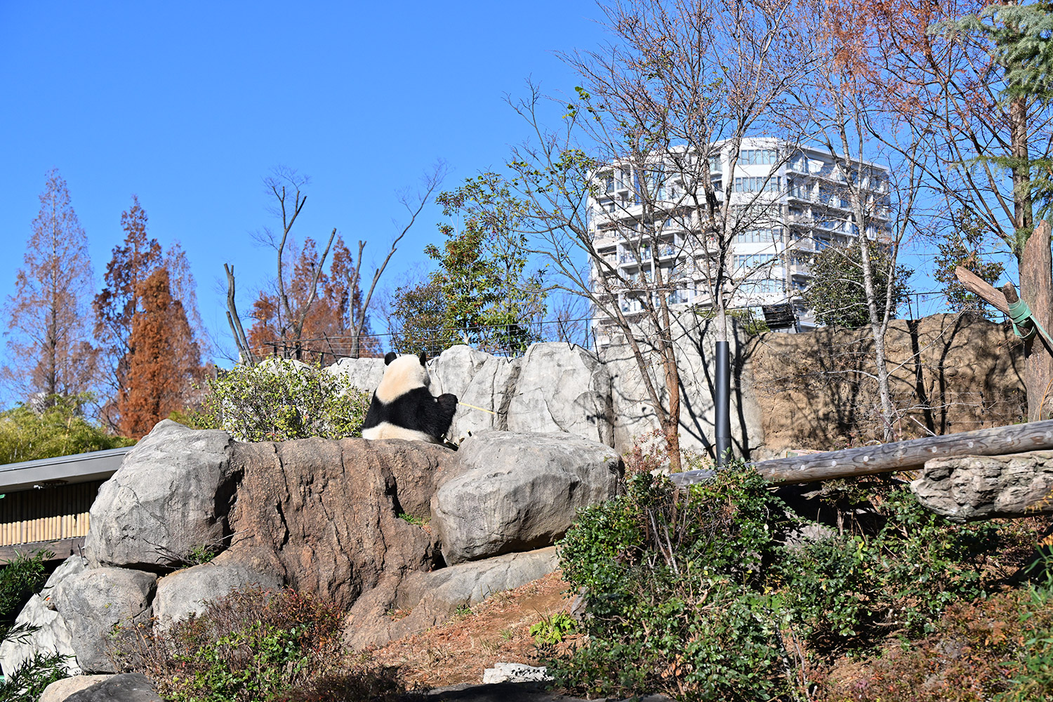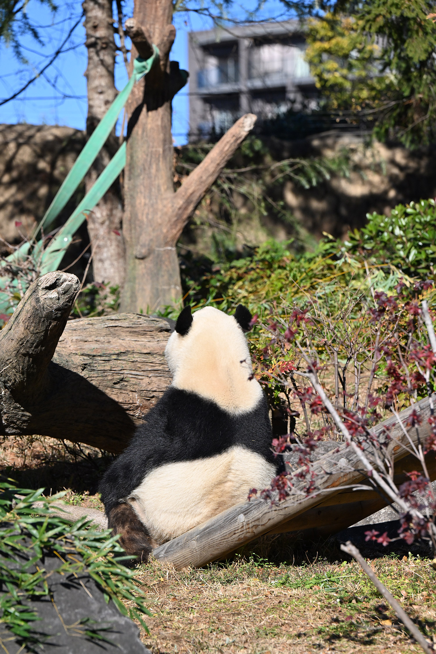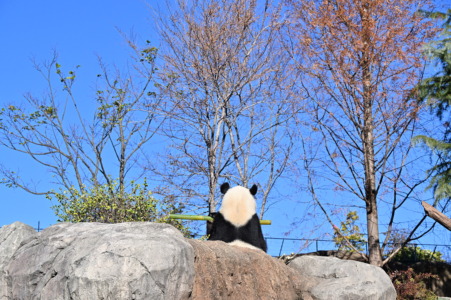 澄み渡った12月の青空と紅葉🍁白黒のシャオ🐼美しいシーンが心に染み入ります✨洞窟上の丸い後頭部、シャオと精養軒…期間限定の光景にウルッですが嬉しい!パパのお庭→シャオのお庭に。シャオ頼もしいぞ!褒めてくれるね!