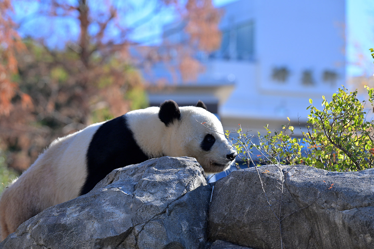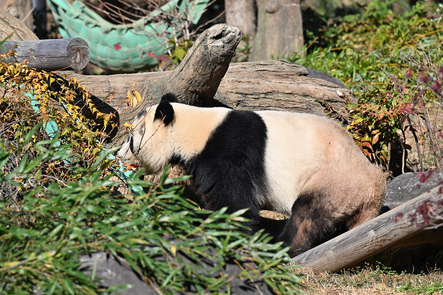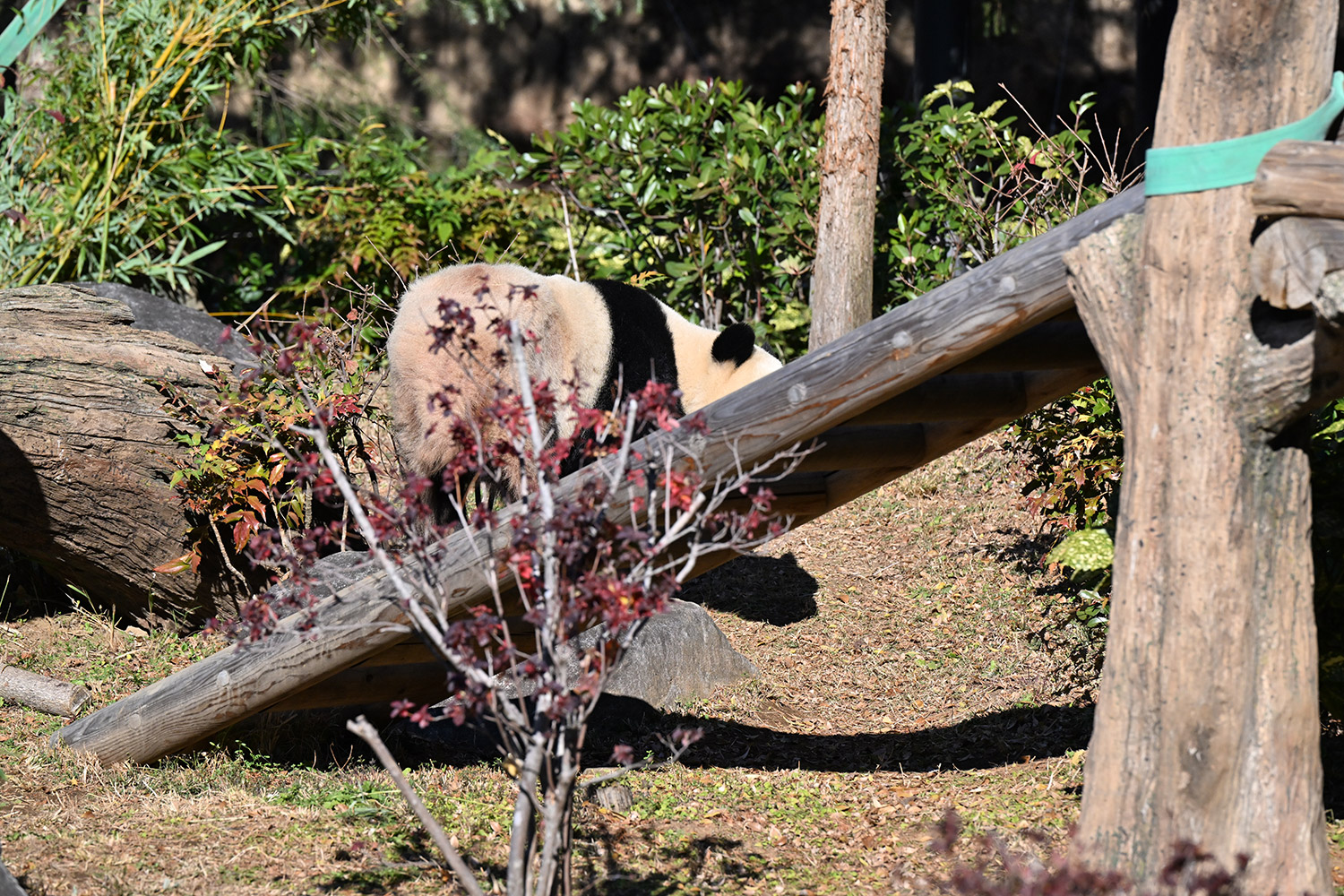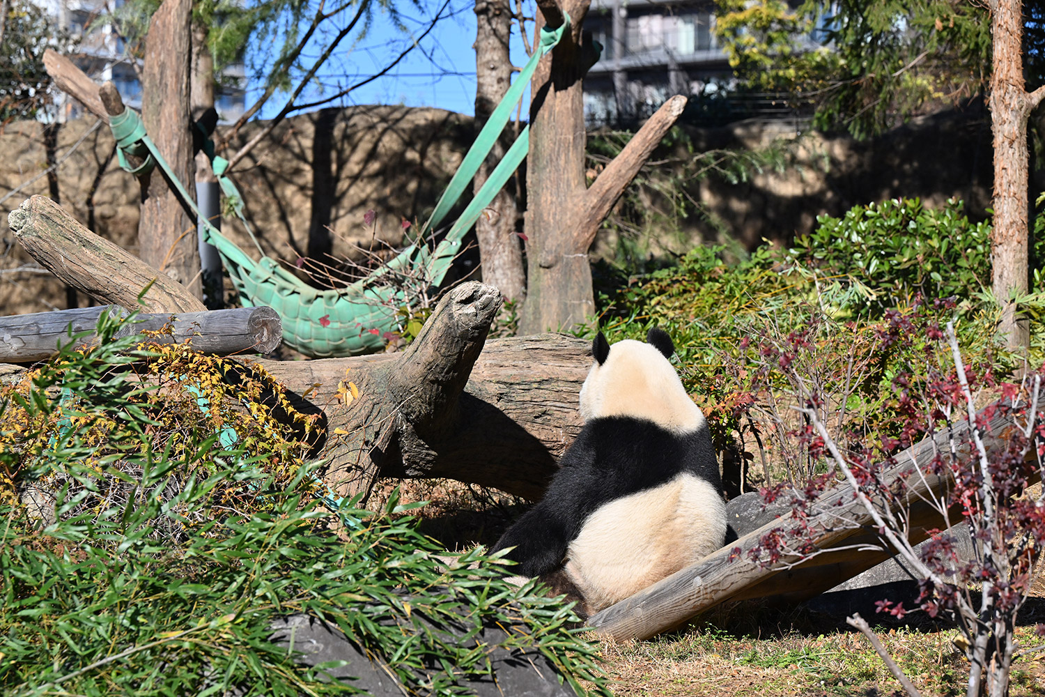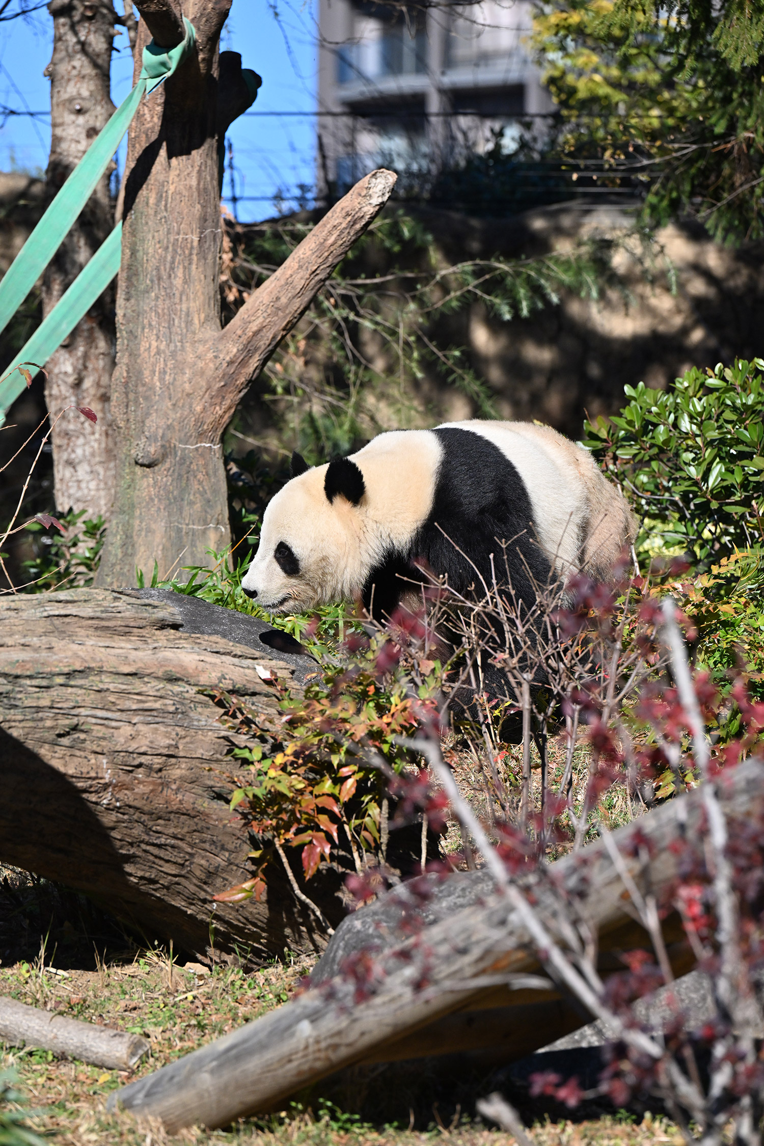 澄み渡った12月の青空と紅葉🍁白黒のシャオ🐼美しいシーンが心に染み入ります✨洞窟上の丸い後頭部、シャオと精養軒…期間限定の光景にウルッですが嬉しい!パパのお庭→シャオのお庭に。シャオ頼もしいぞ!褒めてくれるね!