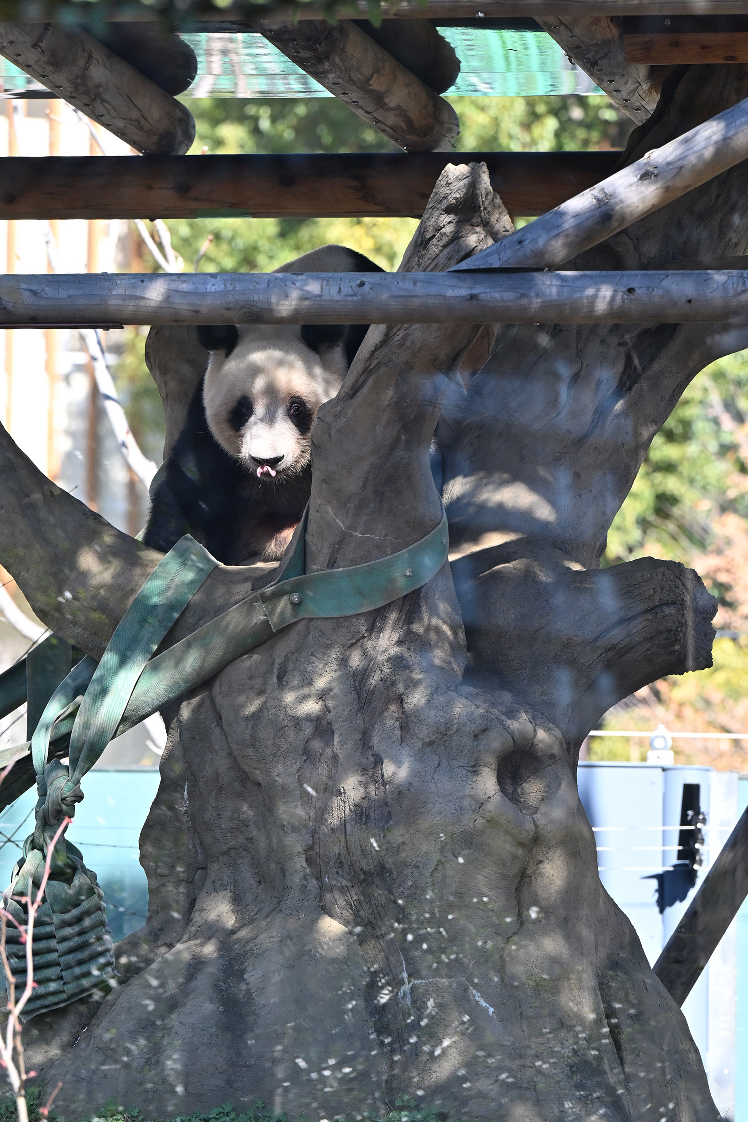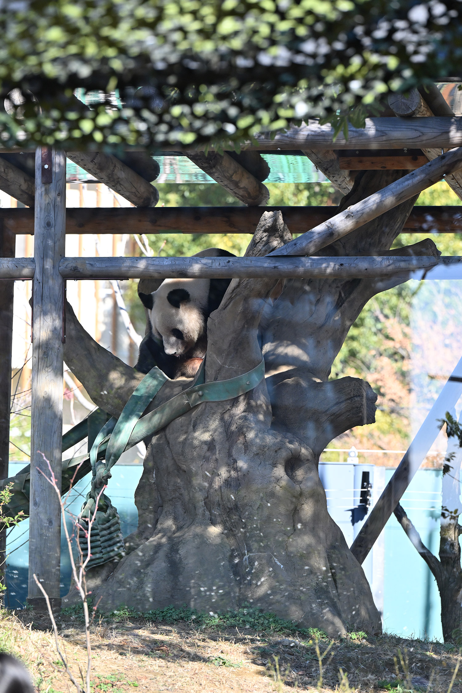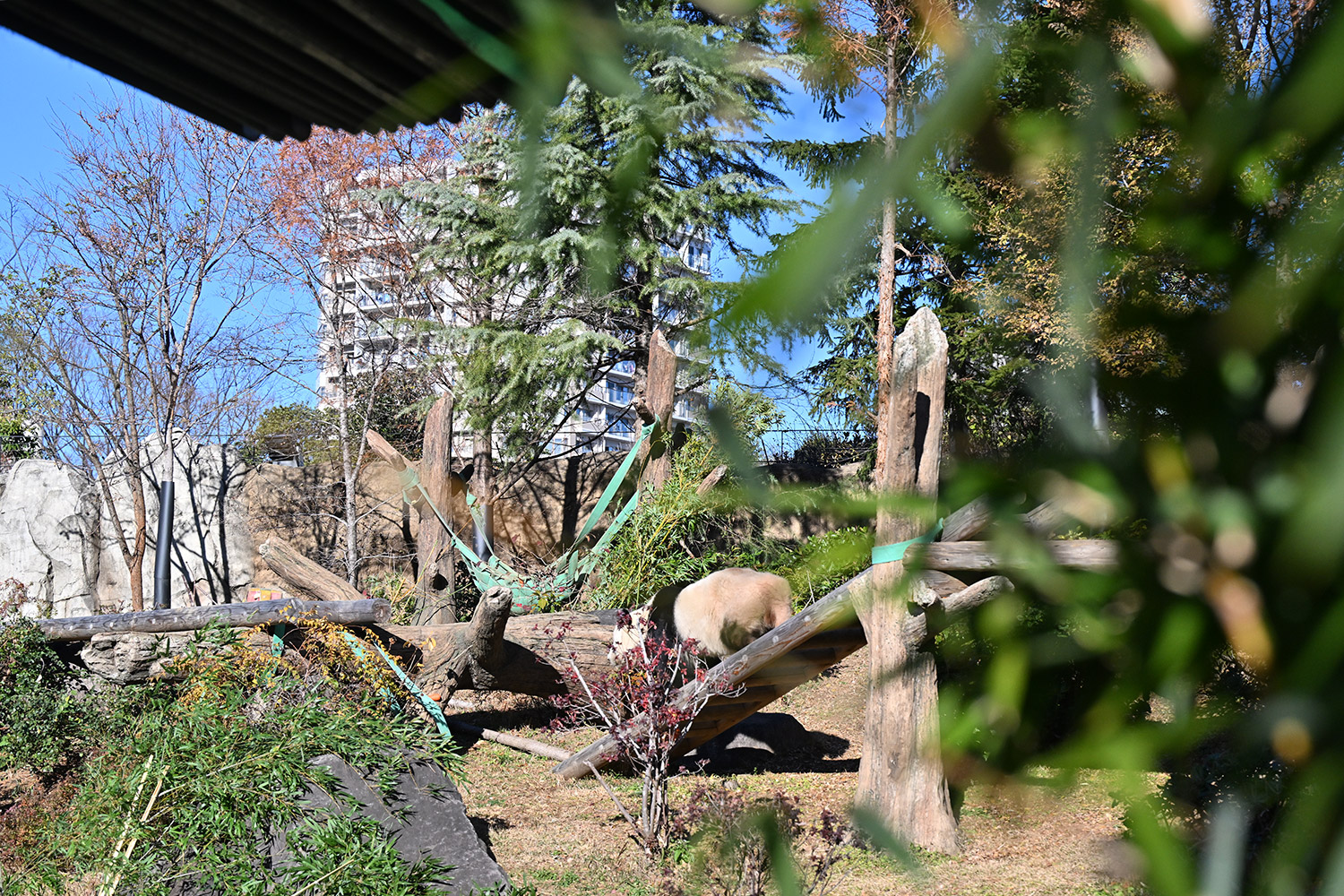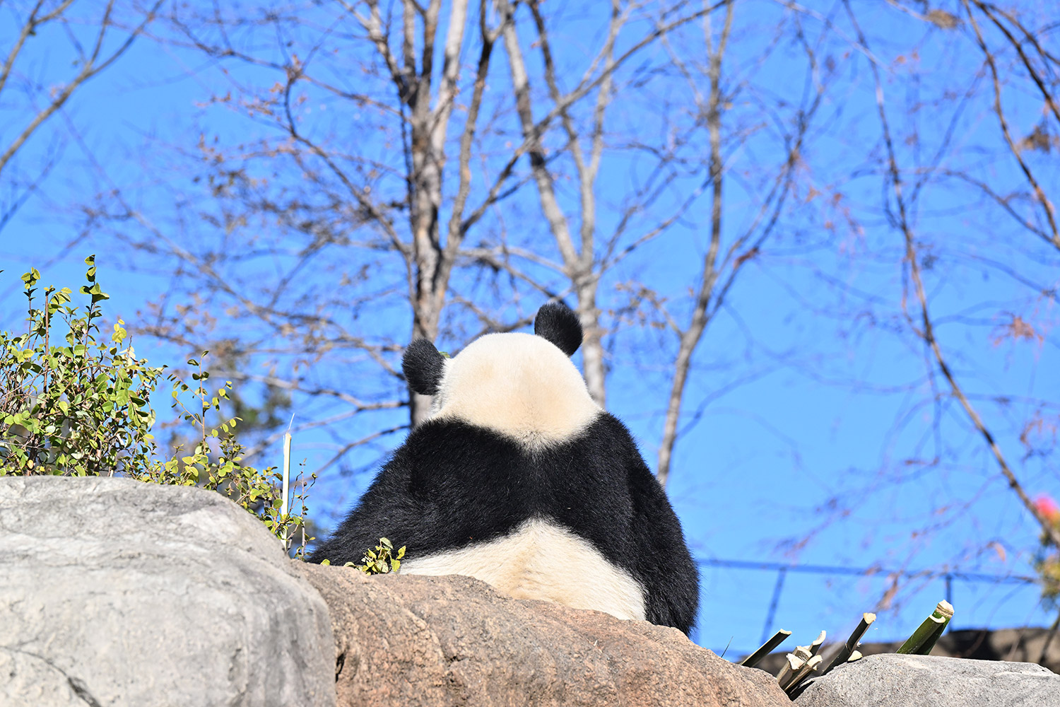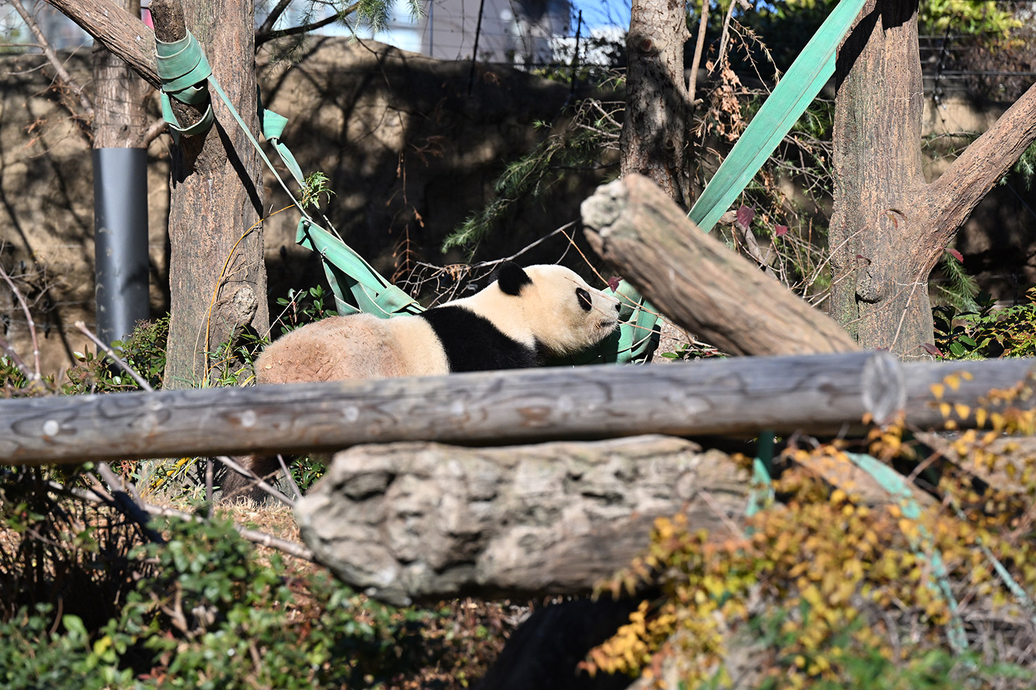 澄み渡った12月の青空と紅葉🍁白黒のシャオ🐼美しいシーンが心に染み入ります✨洞窟上の丸い後頭部、シャオと精養軒…期間限定の光景にウルッですが嬉しい!パパのお庭→シャオのお庭に。シャオ頼もしいぞ!褒めてくれるね!