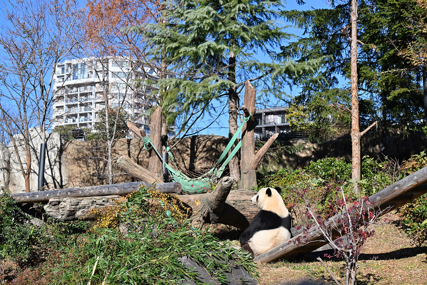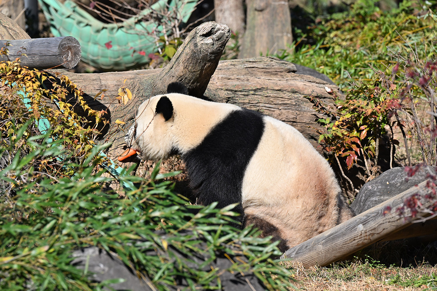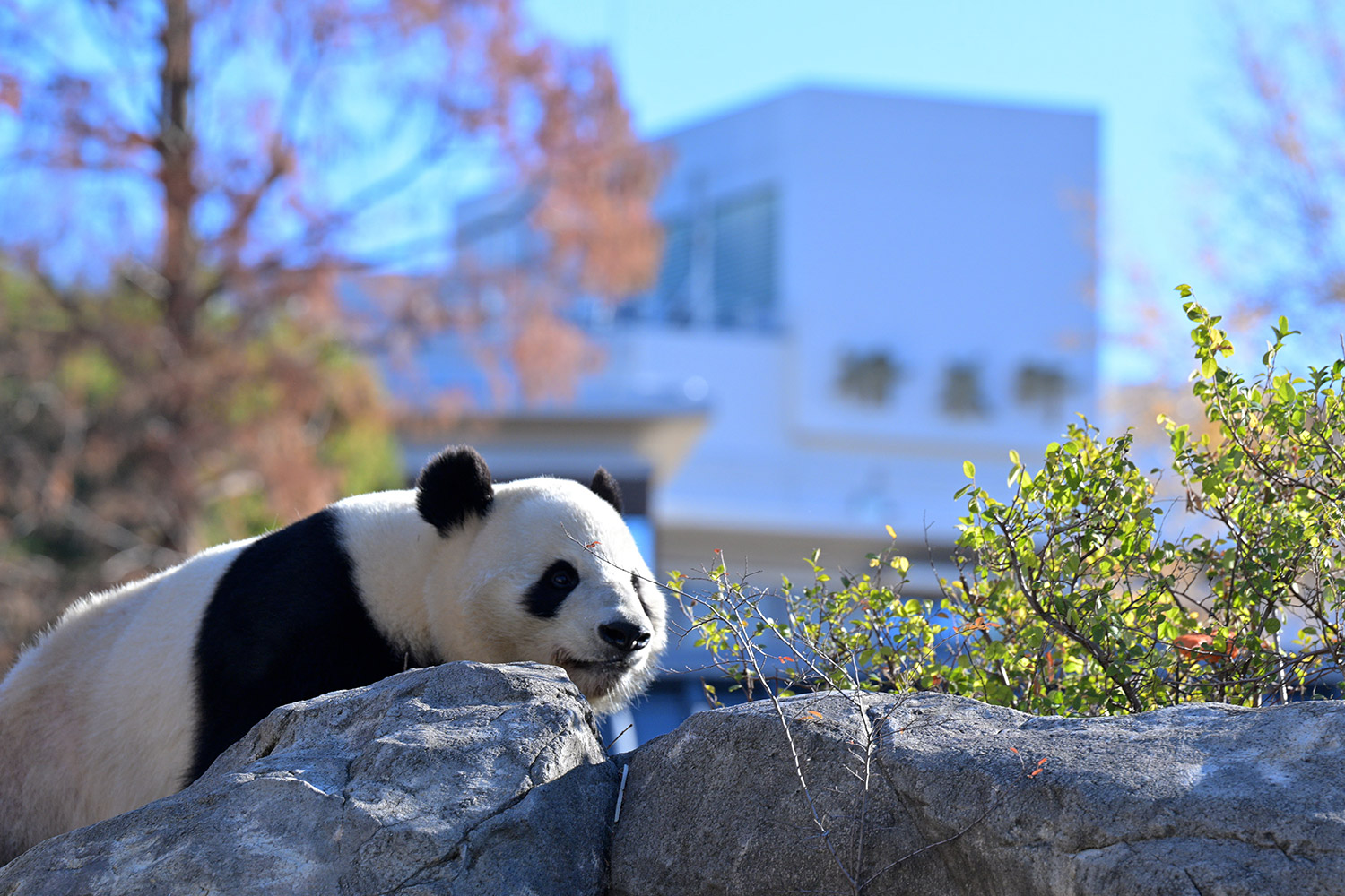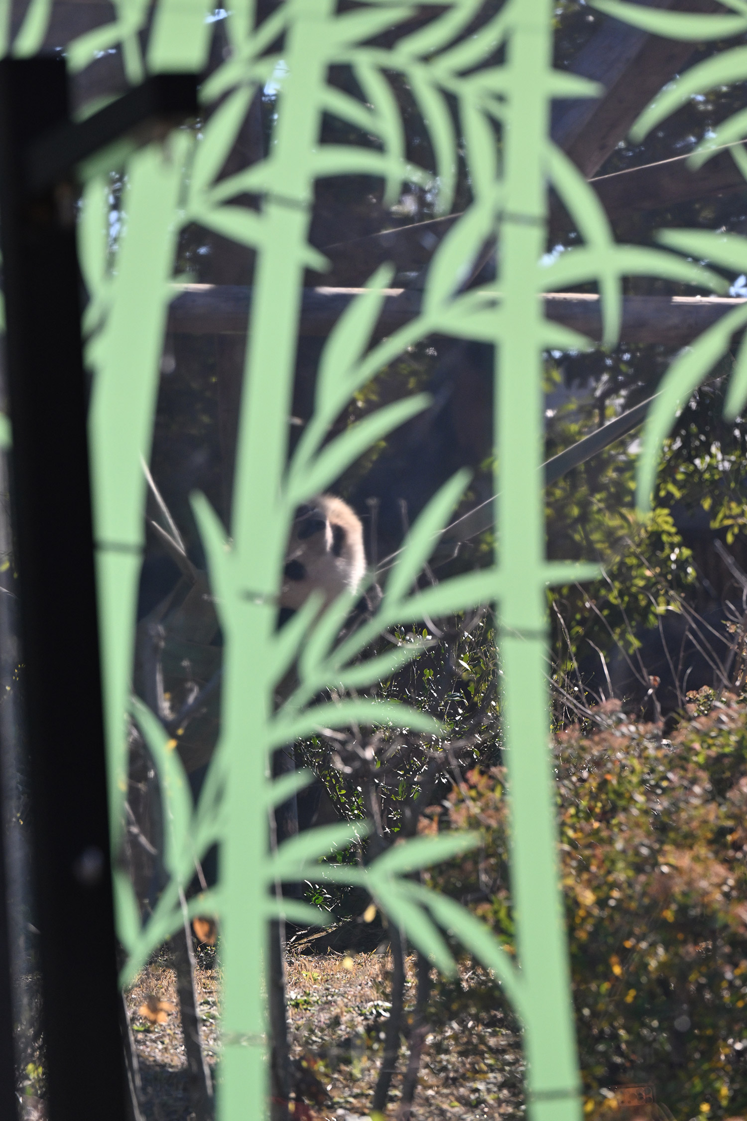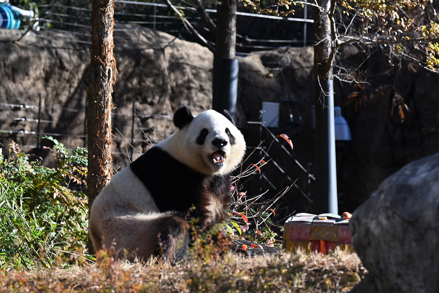 澄み渡った12月の青空と紅葉🍁白黒のシャオ🐼美しいシーンが心に染み入ります✨洞窟上の丸い後頭部、シャオと精養軒…期間限定の光景にウルッですが嬉しい!パパのお庭→シャオのお庭に。シャオ頼もしいぞ!褒めてくれるね!