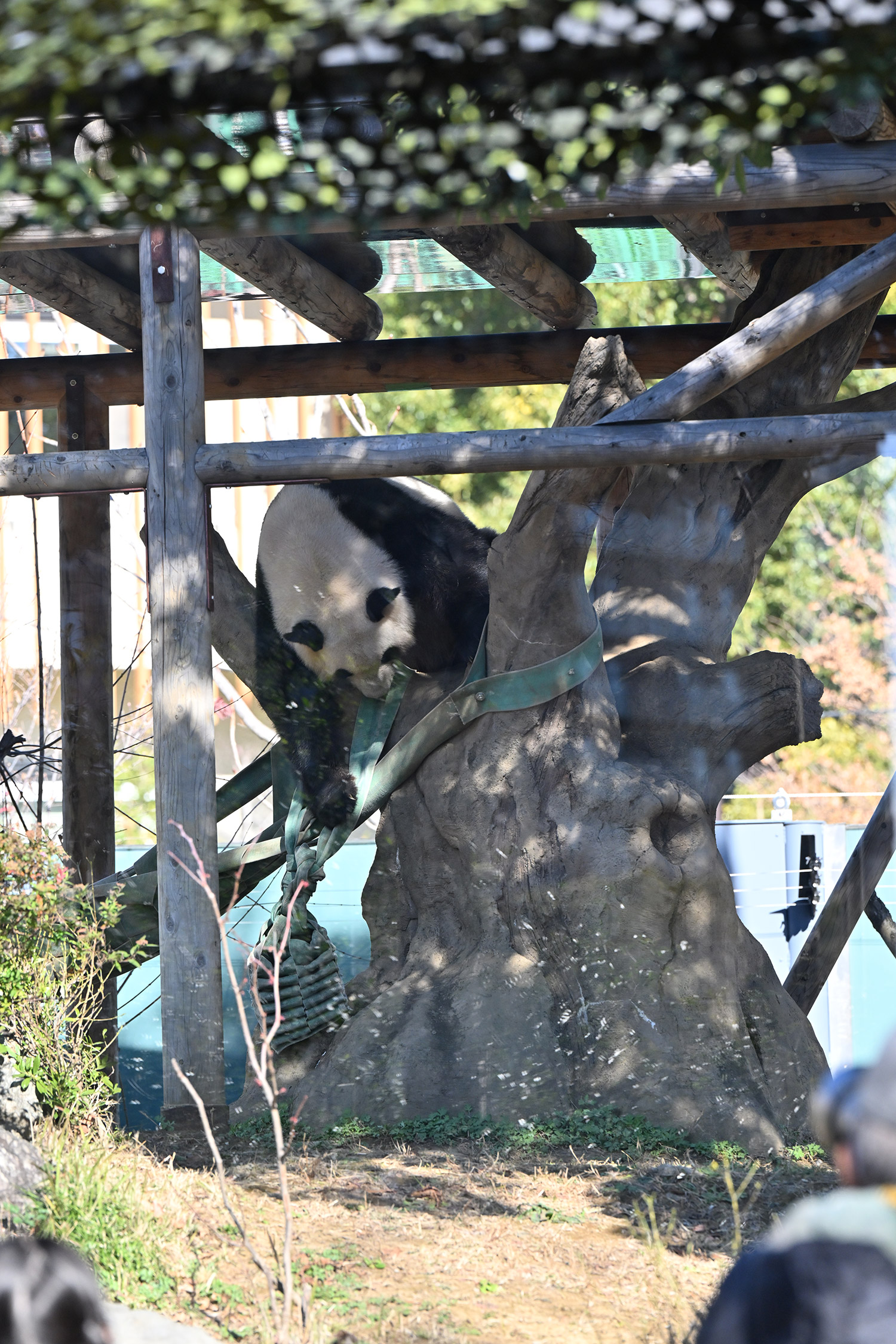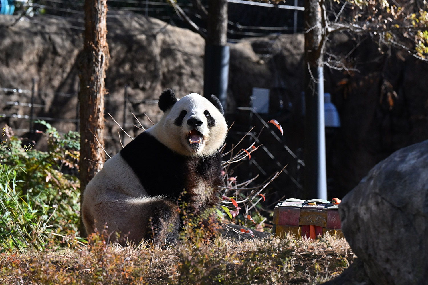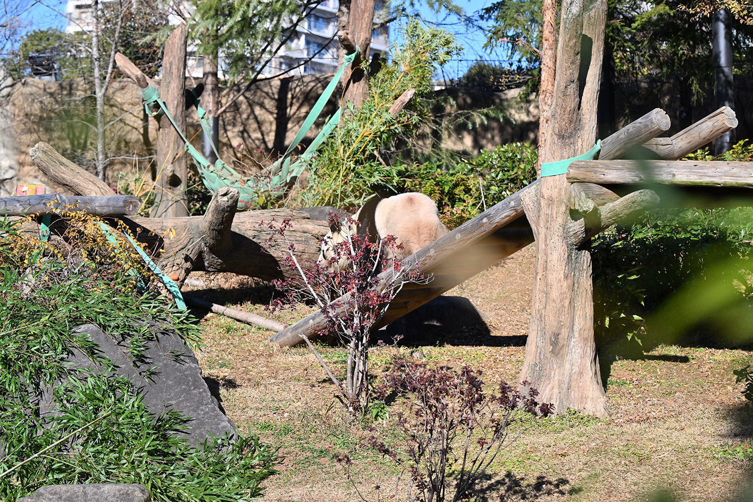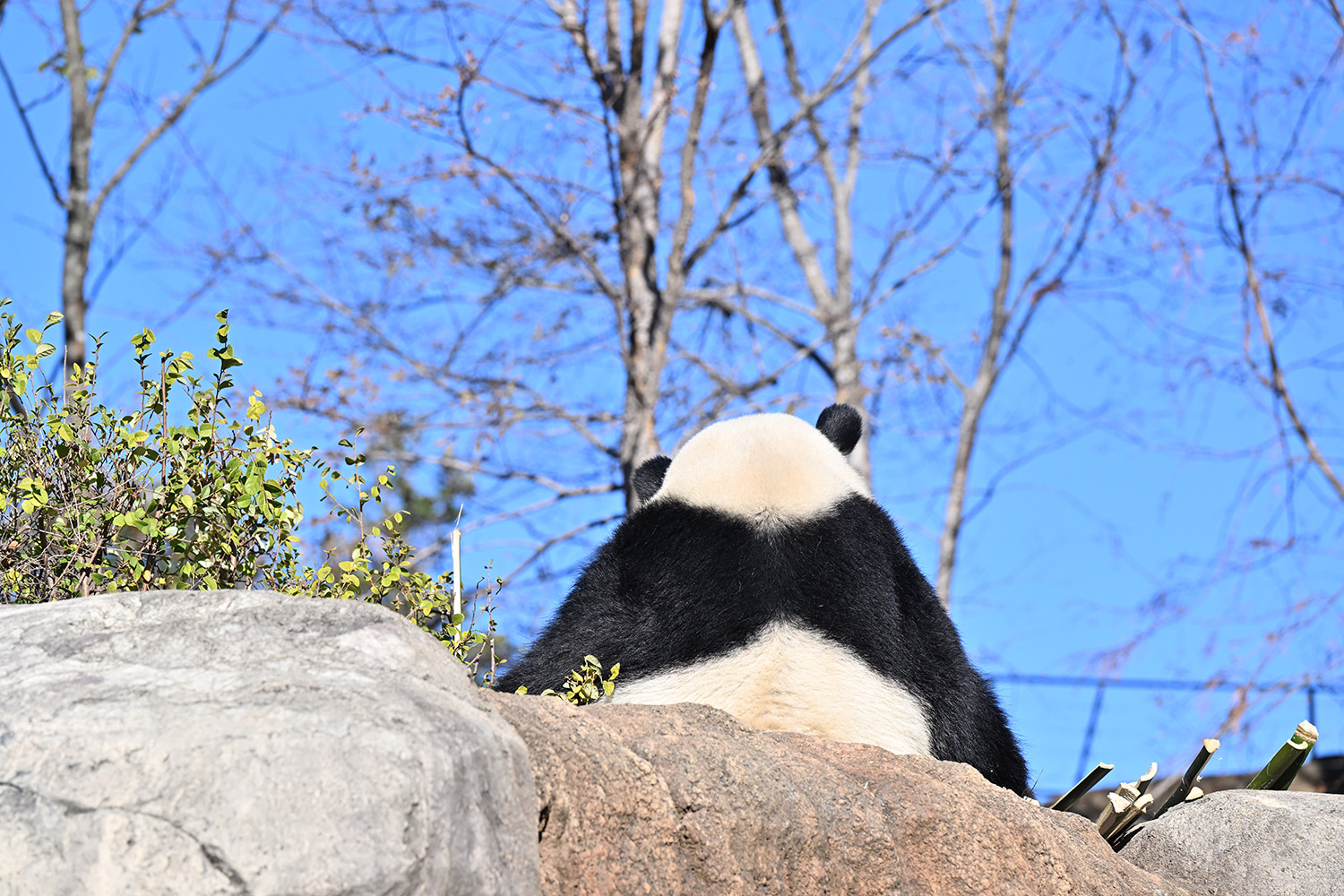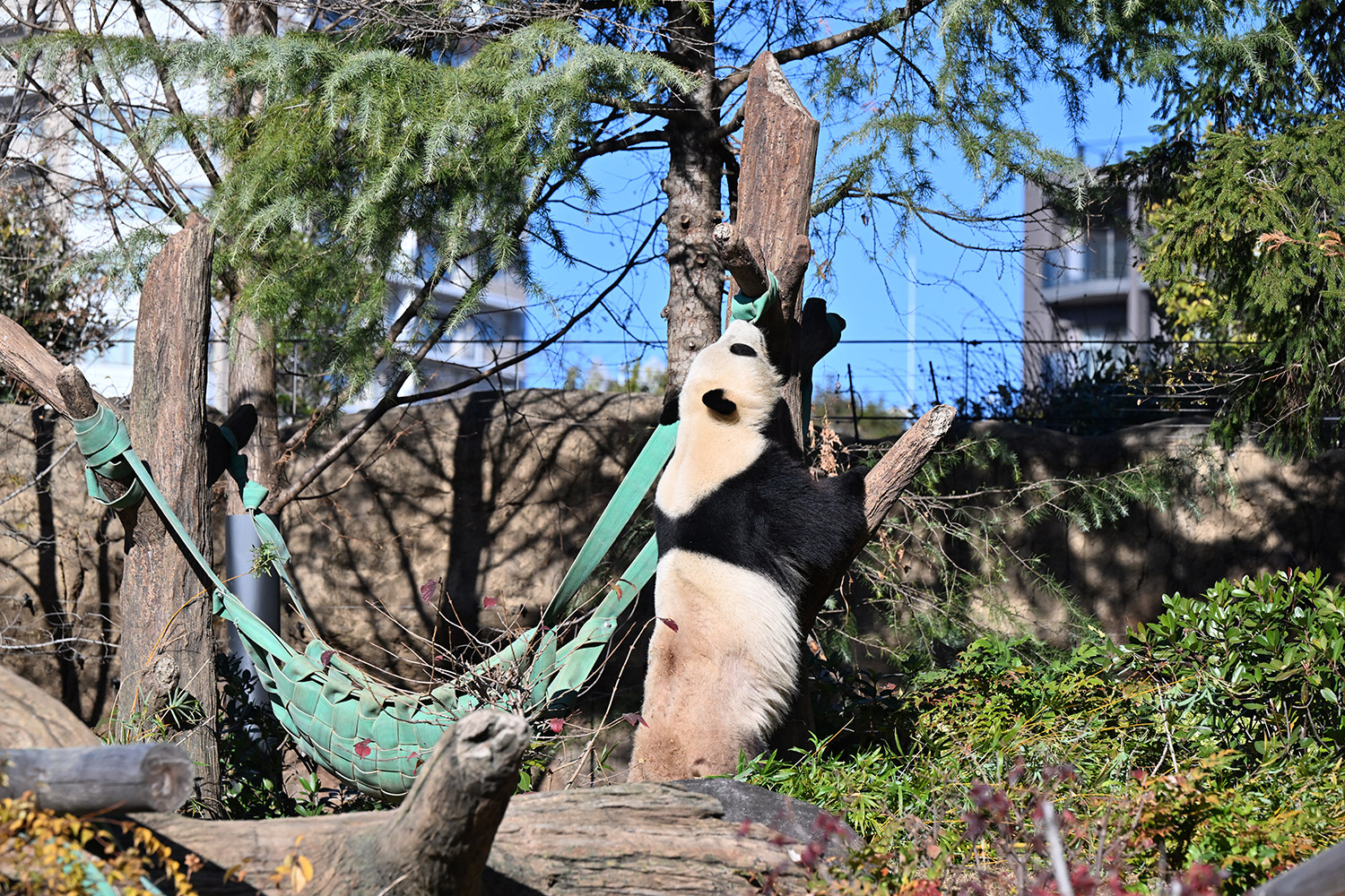 澄み渡った12月の青空と紅葉🍁白黒のシャオ🐼美しいシーンが心に染み入ります✨洞窟上の丸い後頭部、シャオと精養軒…期間限定の光景にウルッですが嬉しい!パパのお庭→シャオのお庭に。シャオ頼もしいぞ!褒めてくれるね!
