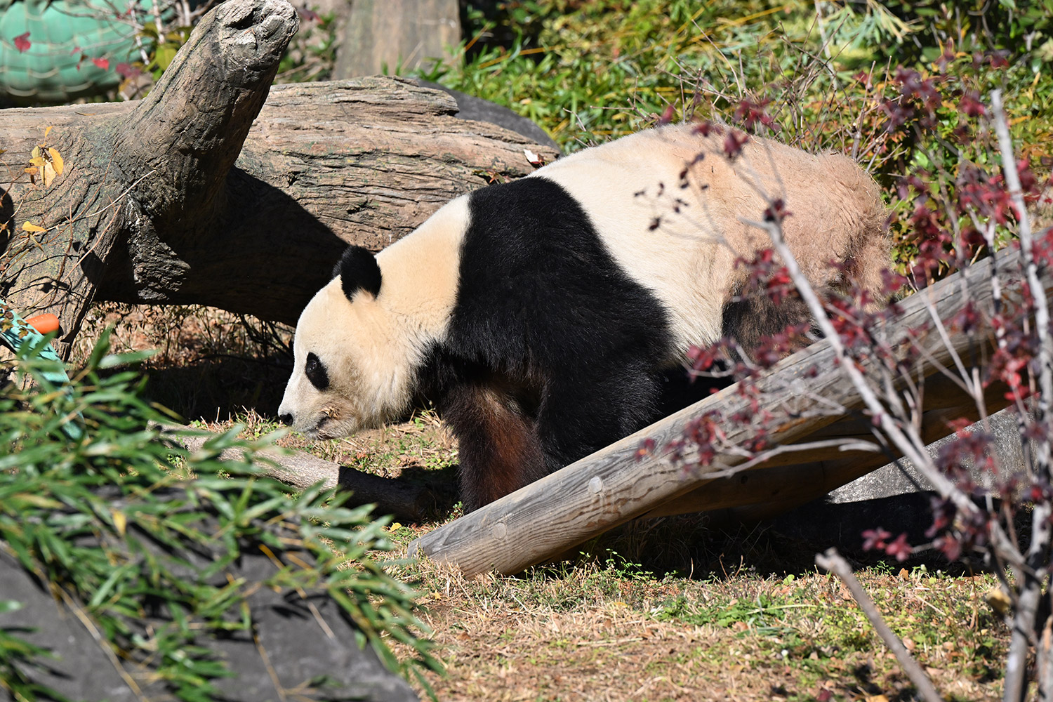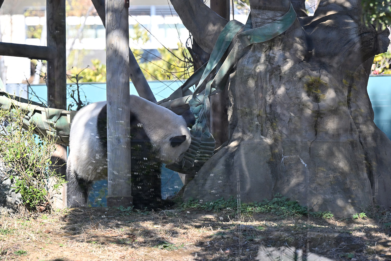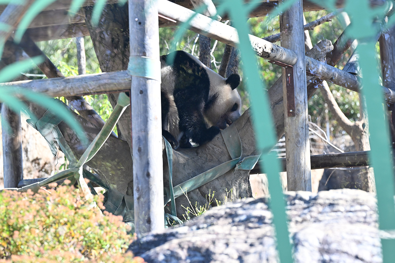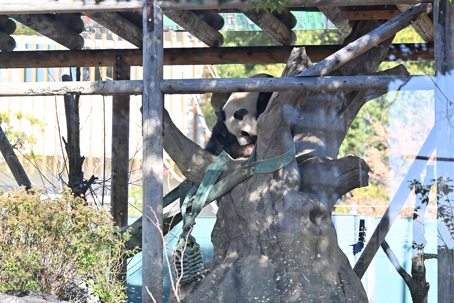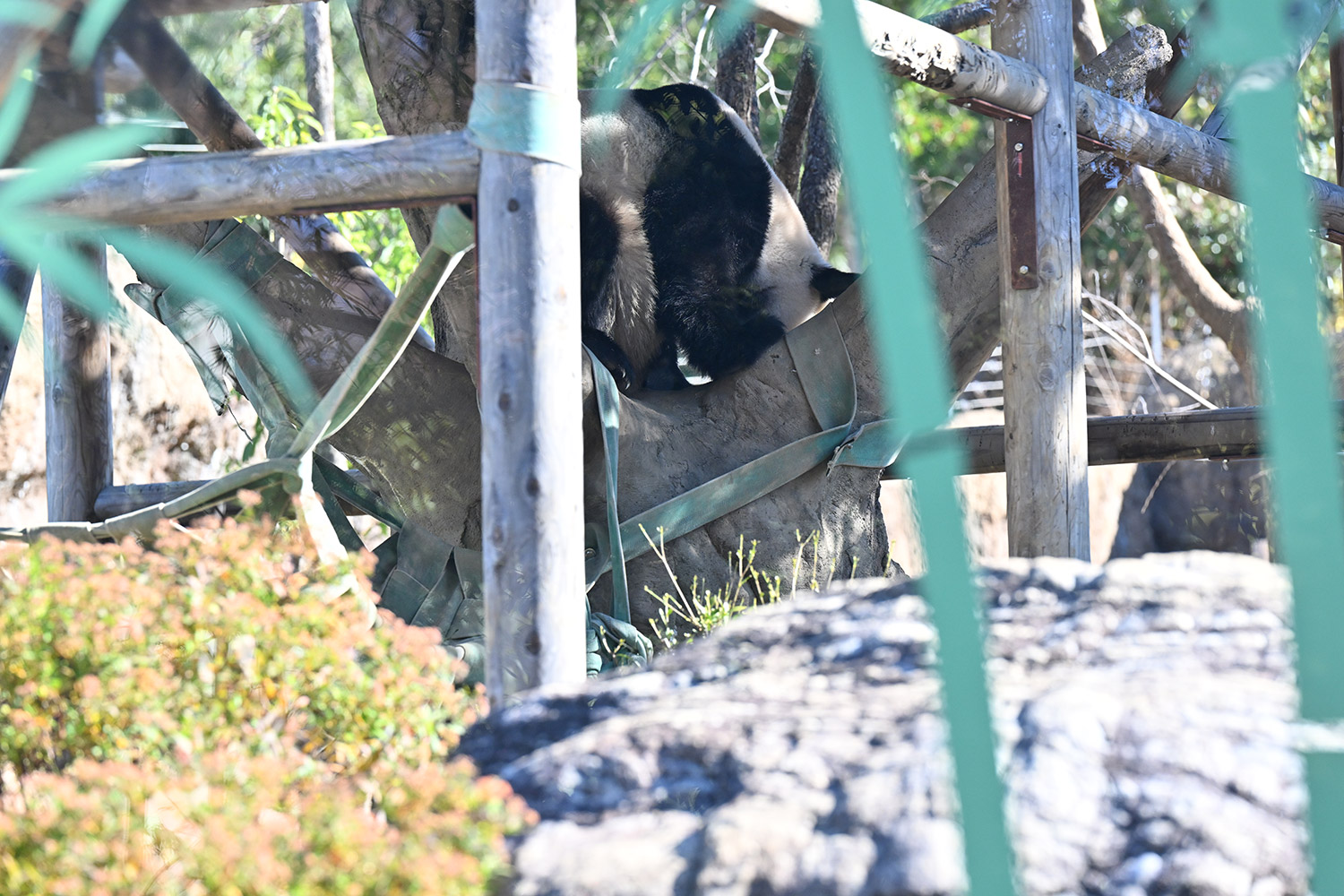 澄み渡った12月の青空と紅葉🍁白黒のシャオ🐼美しいシーンが心に染み入ります✨洞窟上の丸い後頭部、シャオと精養軒…期間限定の光景にウルッですが嬉しい!パパのお庭→シャオのお庭に。シャオ頼もしいぞ!褒めてくれるね!