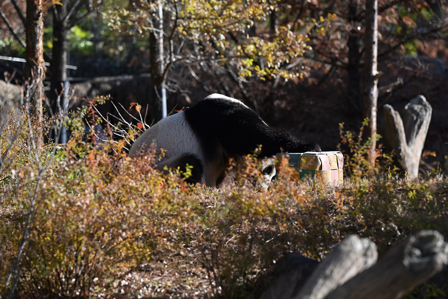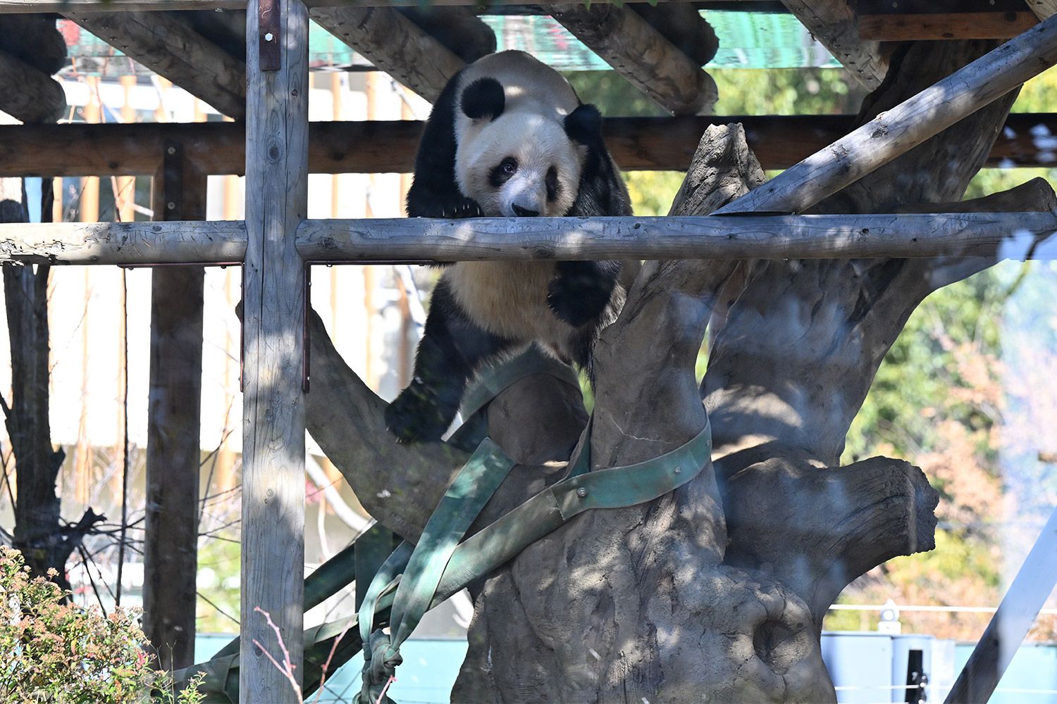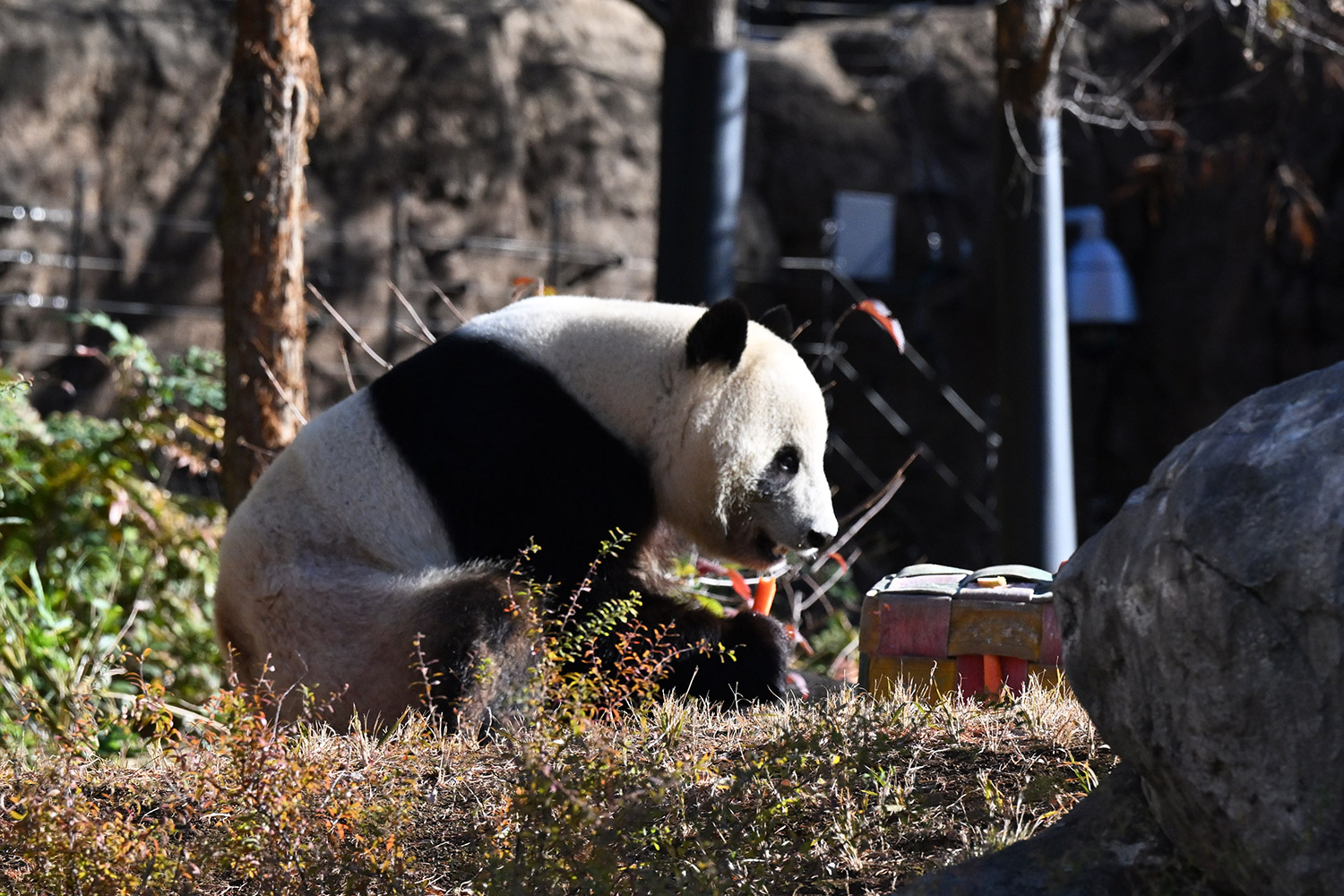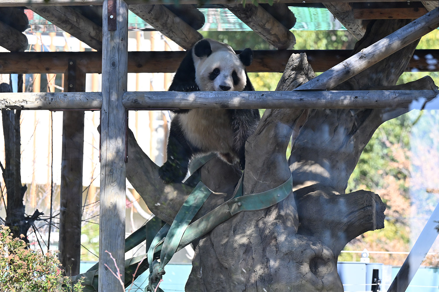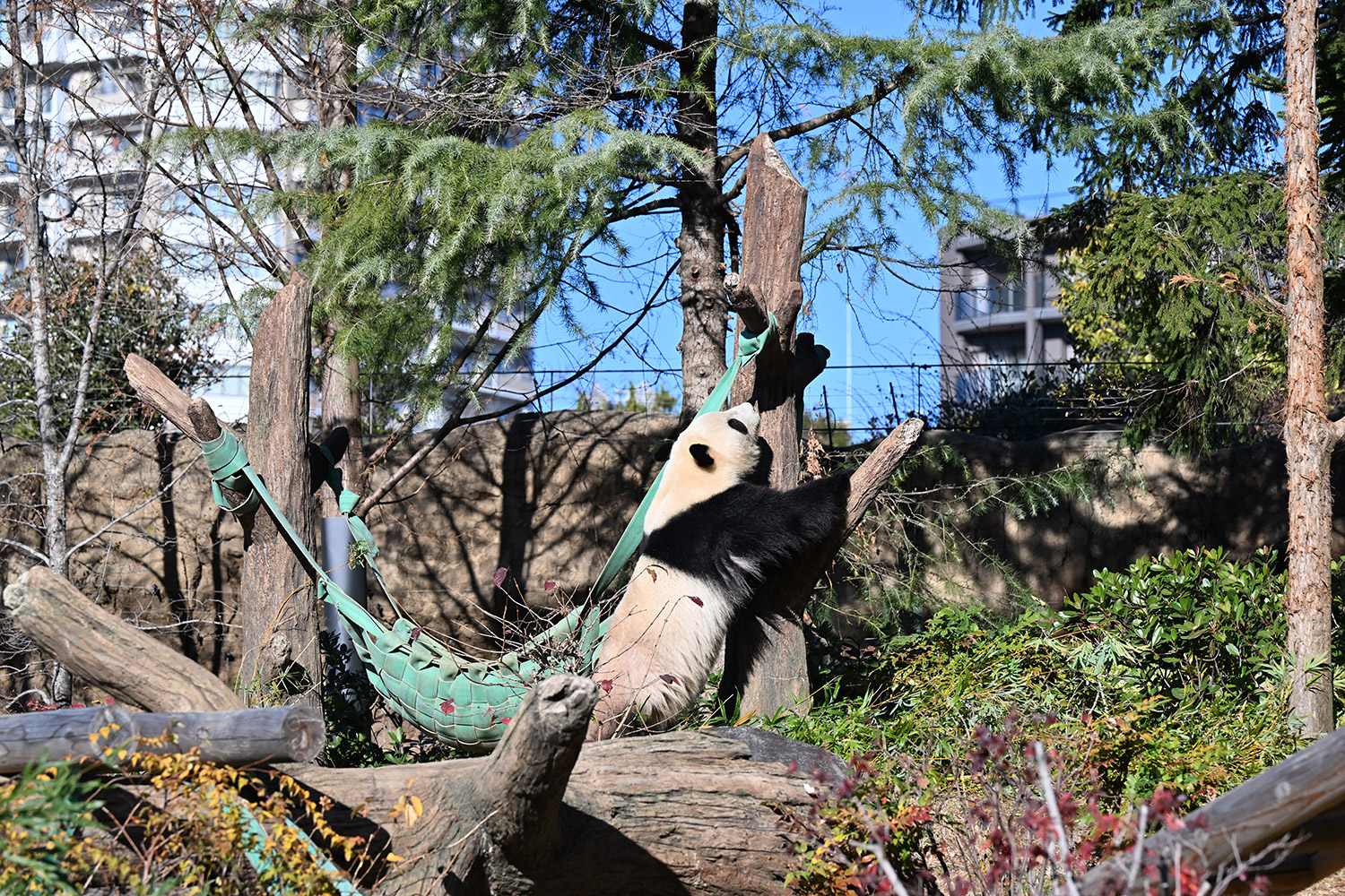 澄み渡った12月の青空と紅葉🍁白黒のシャオ🐼美しいシーンが心に染み入ります✨洞窟上の丸い後頭部、シャオと精養軒…期間限定の光景にウルッですが嬉しい!パパのお庭→シャオのお庭に。シャオ頼もしいぞ!褒めてくれるね!