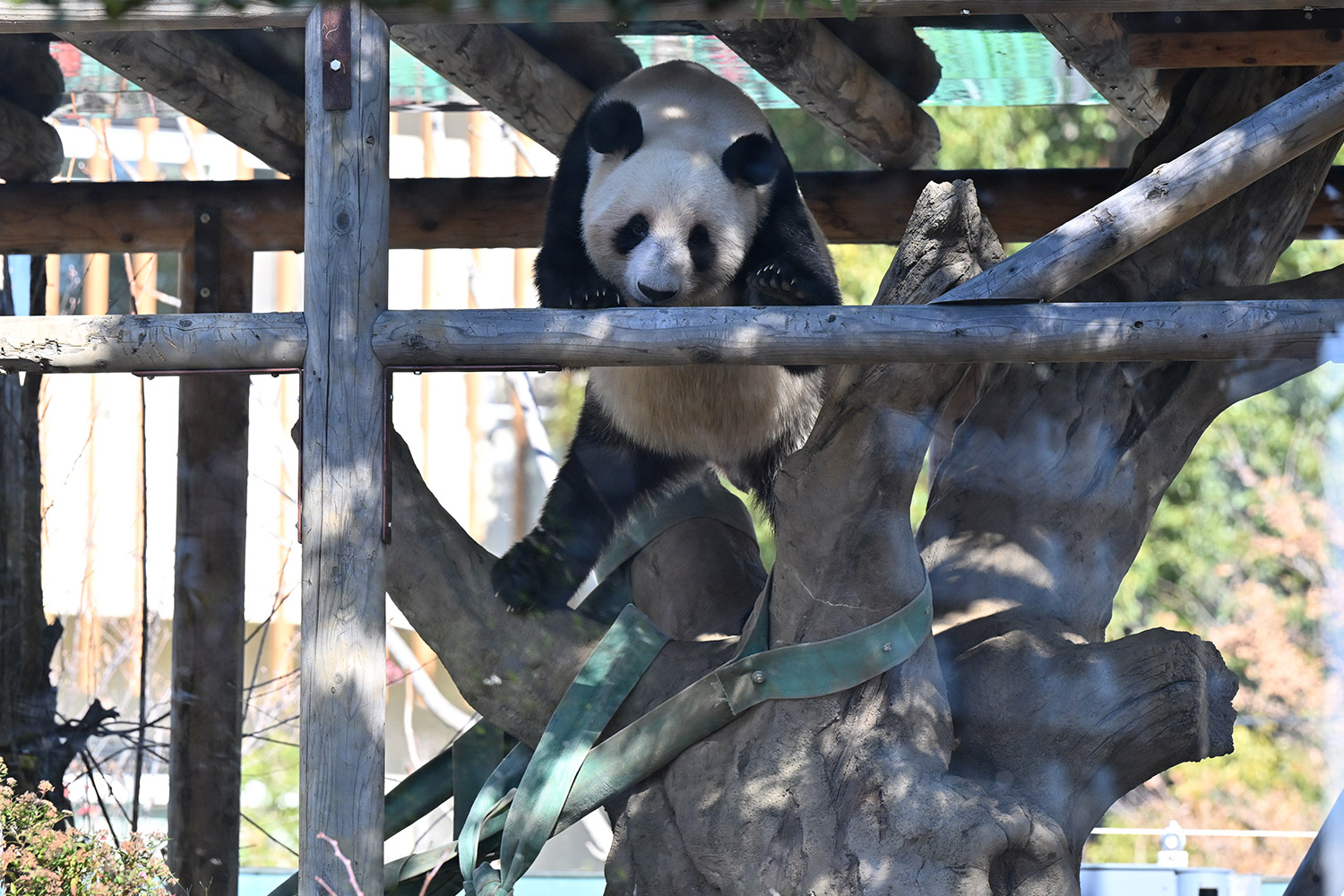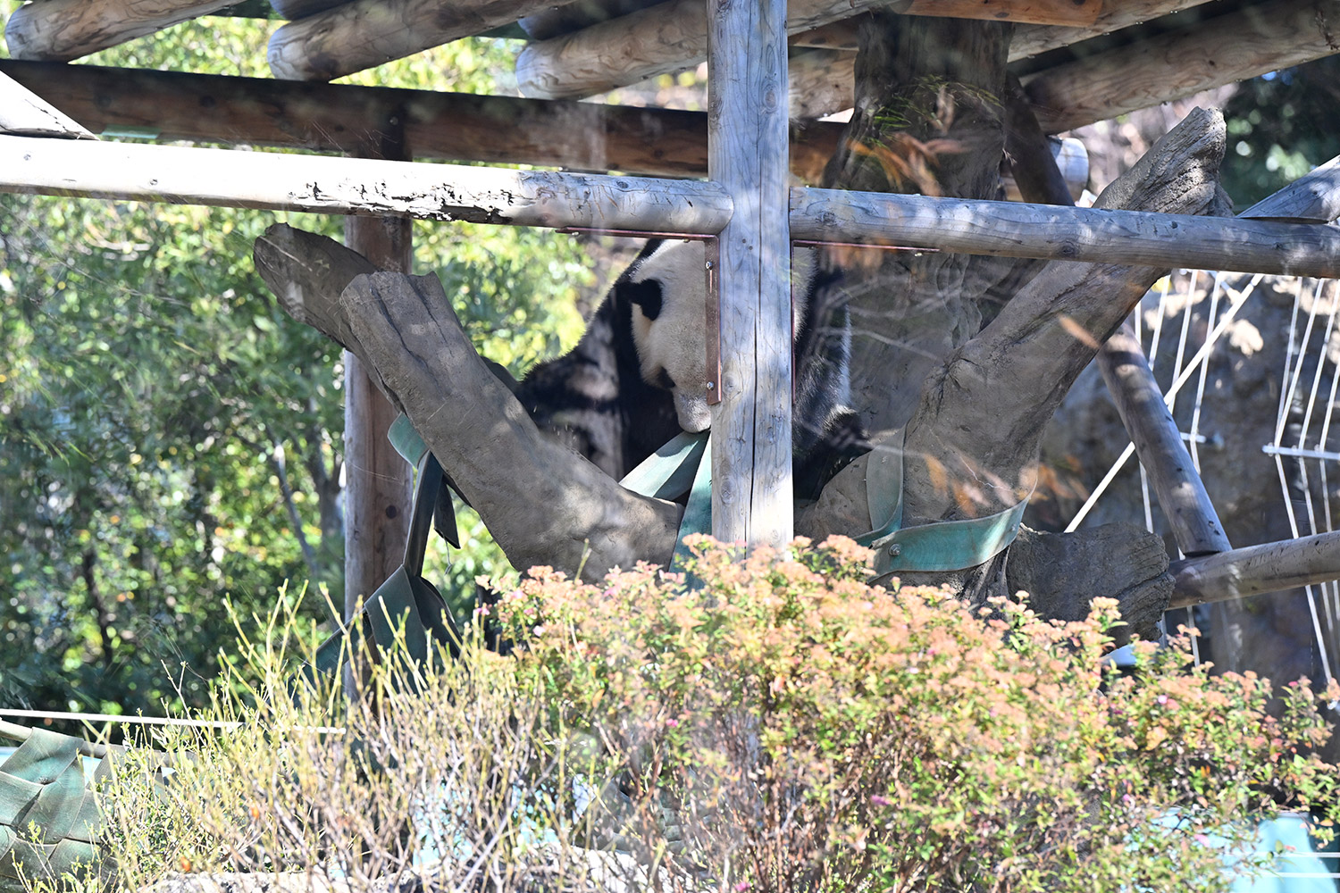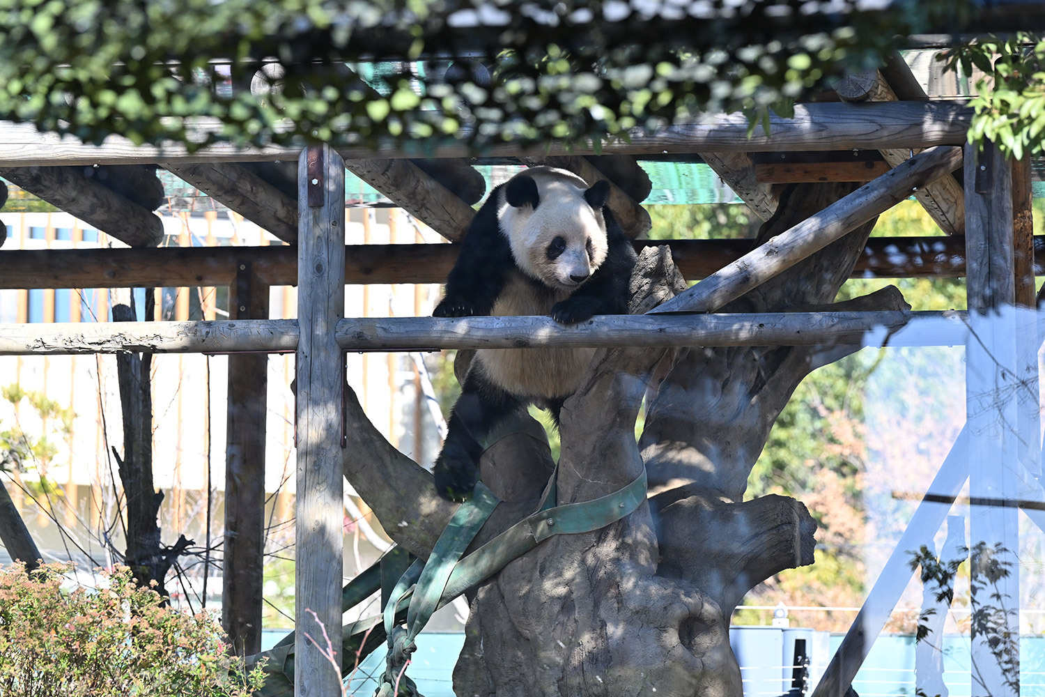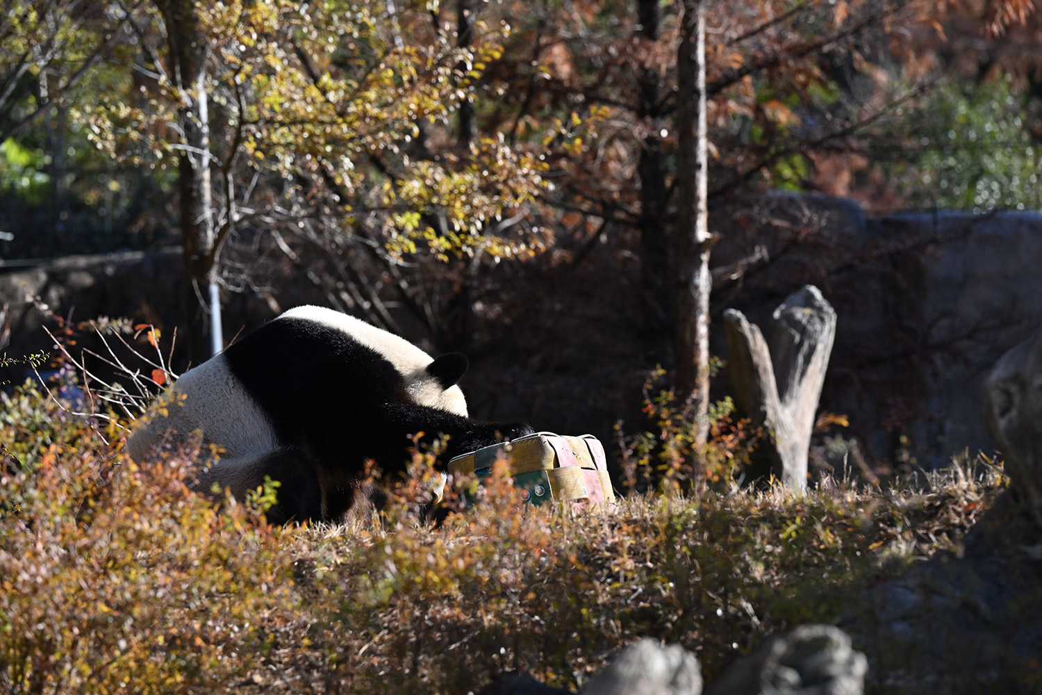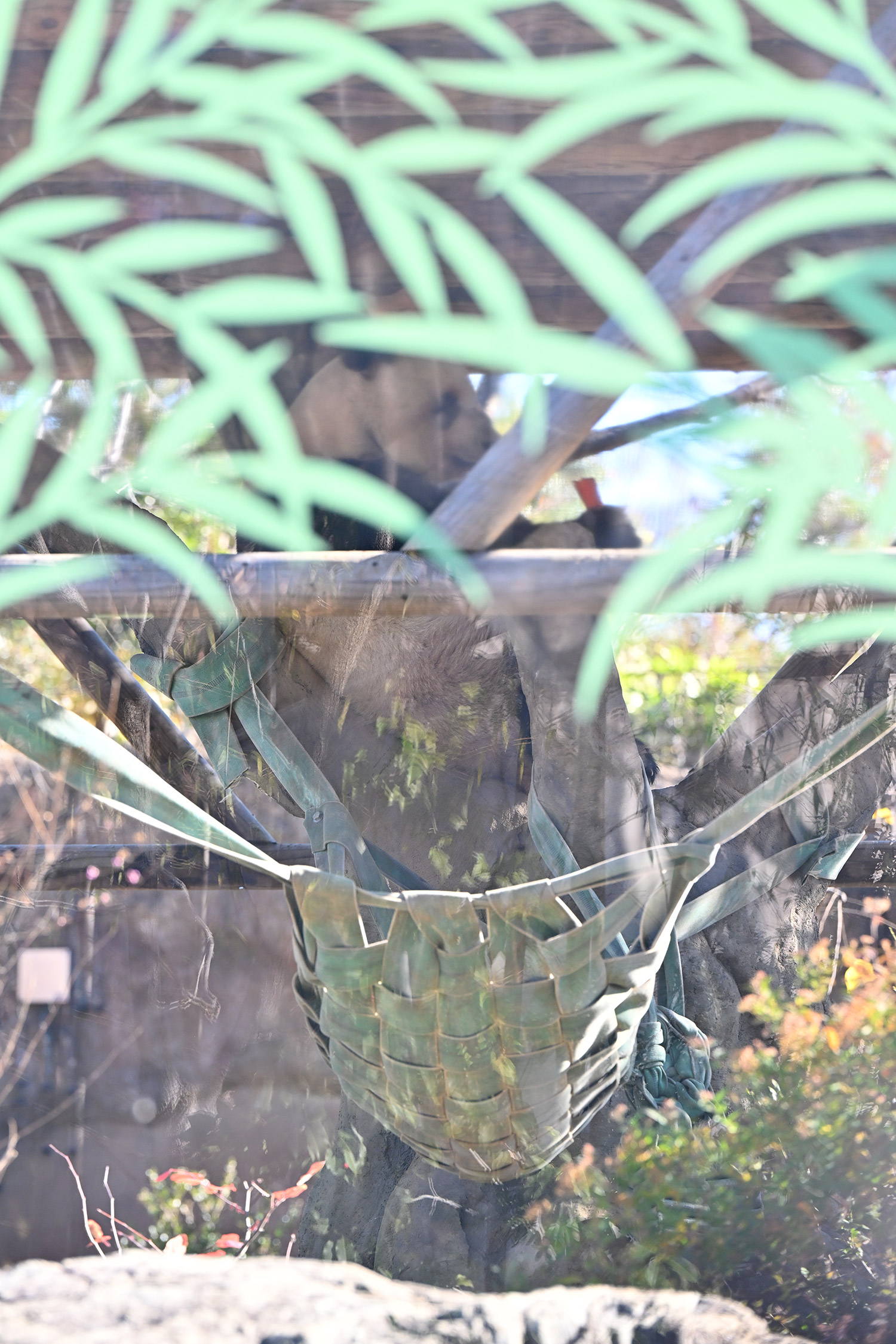 澄み渡った12月の青空と紅葉🍁白黒のシャオ🐼美しいシーンが心に染み入ります✨洞窟上の丸い後頭部、シャオと精養軒…期間限定の光景にウルッですが嬉しい!パパのお庭→シャオのお庭に。シャオ頼もしいぞ!褒めてくれるね!