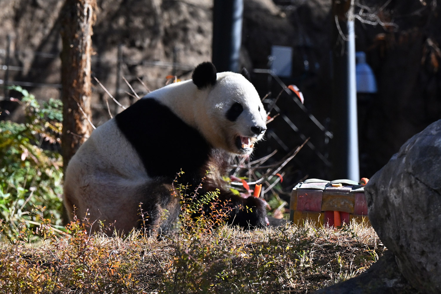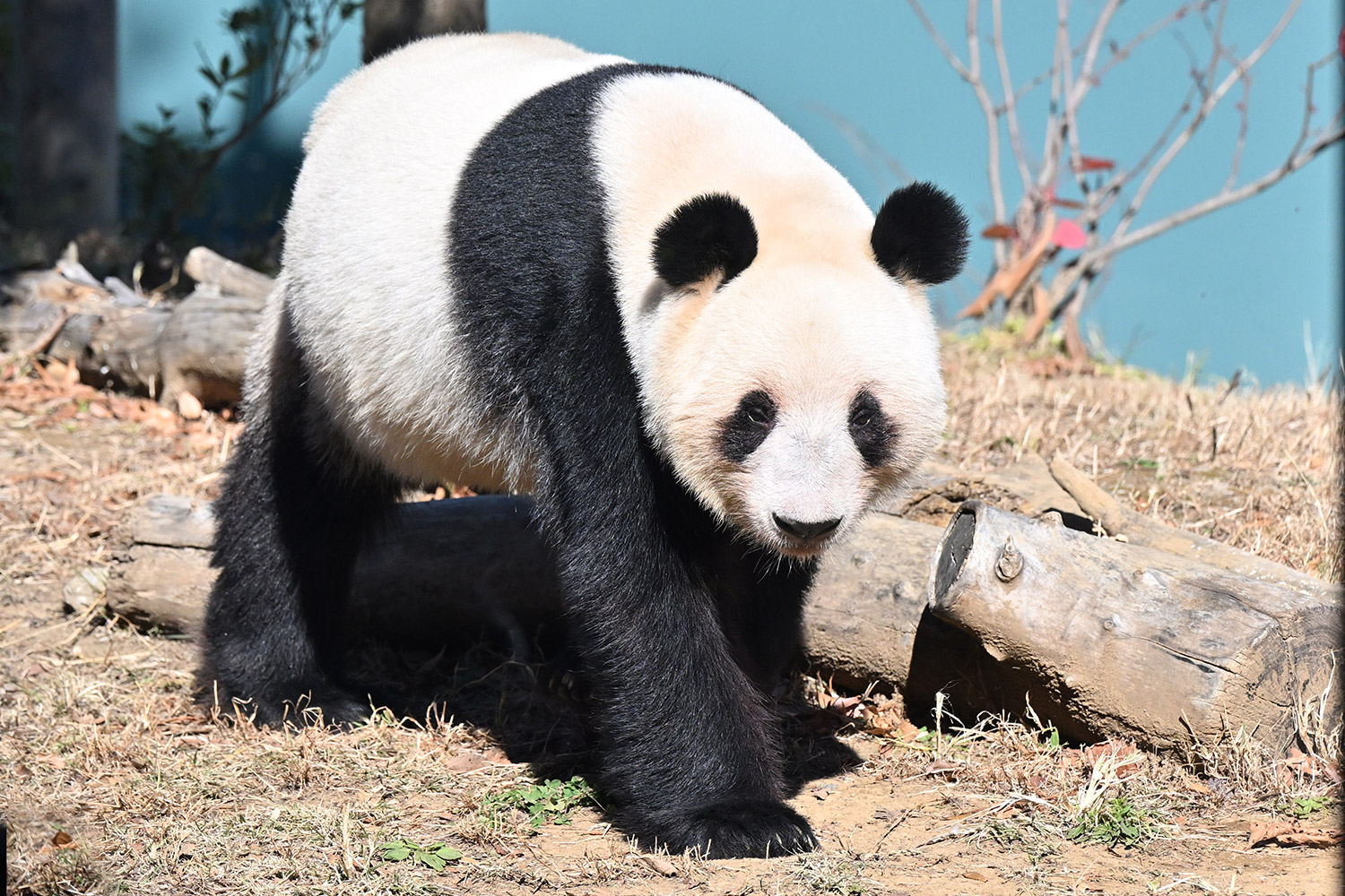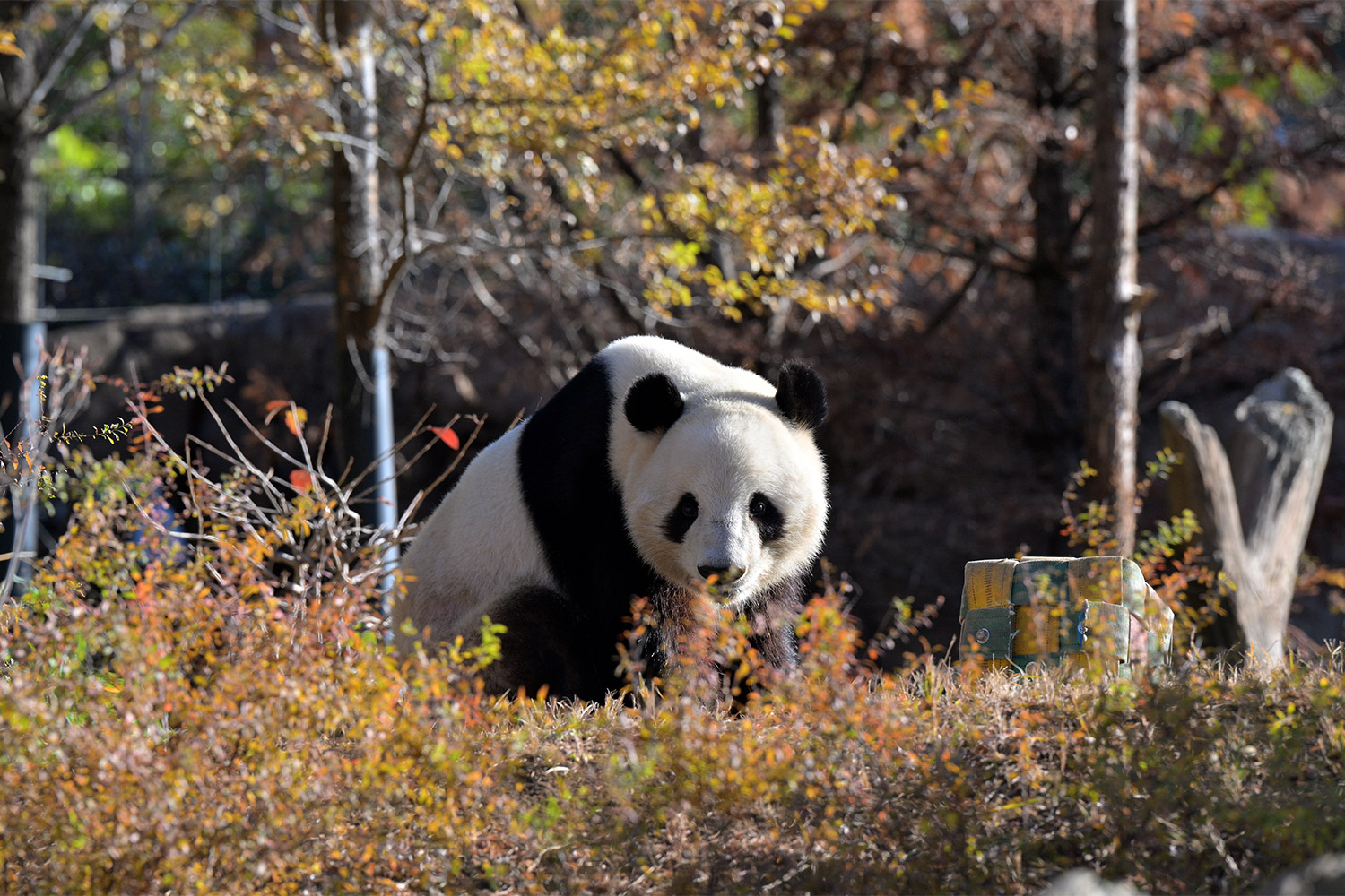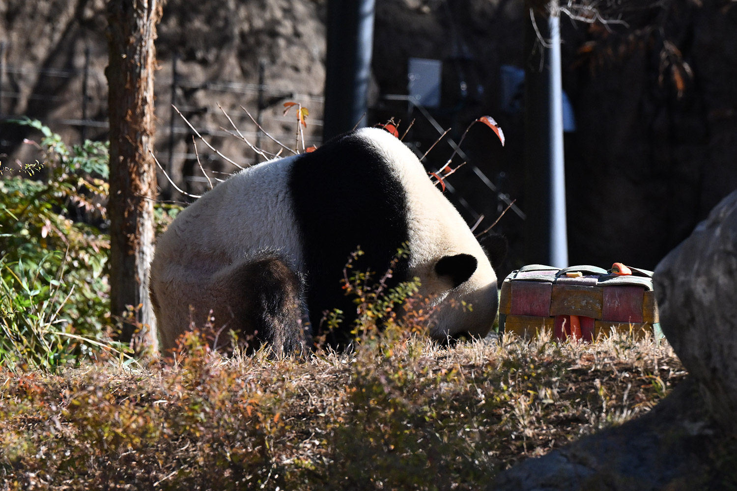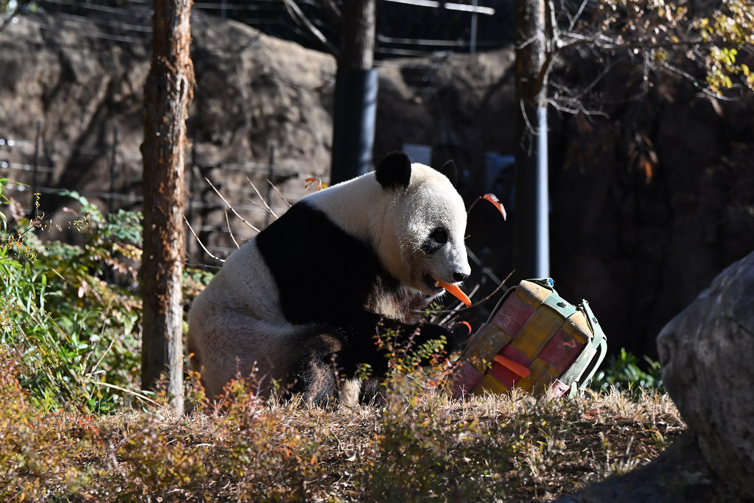 澄み渡った12月の青空と紅葉🍁白黒のシャオ🐼美しいシーンが心に染み入ります✨洞窟上の丸い後頭部、シャオと精養軒…期間限定の光景にウルッですが嬉しい!パパのお庭→シャオのお庭に。シャオ頼もしいぞ!褒めてくれるね!