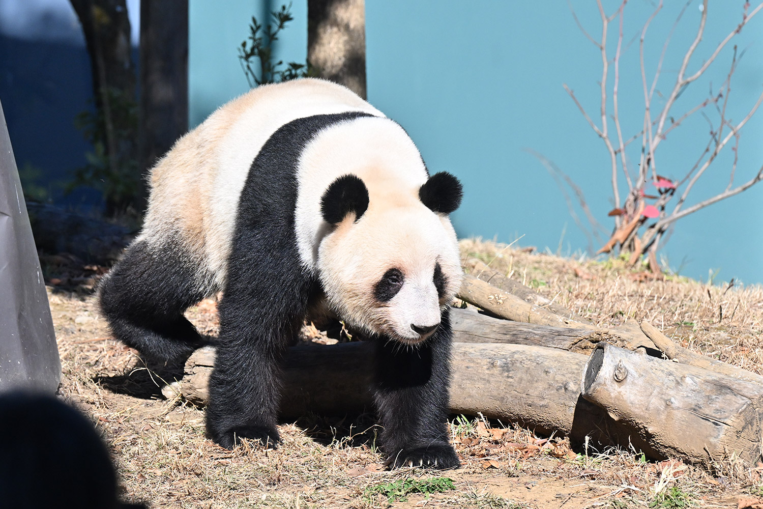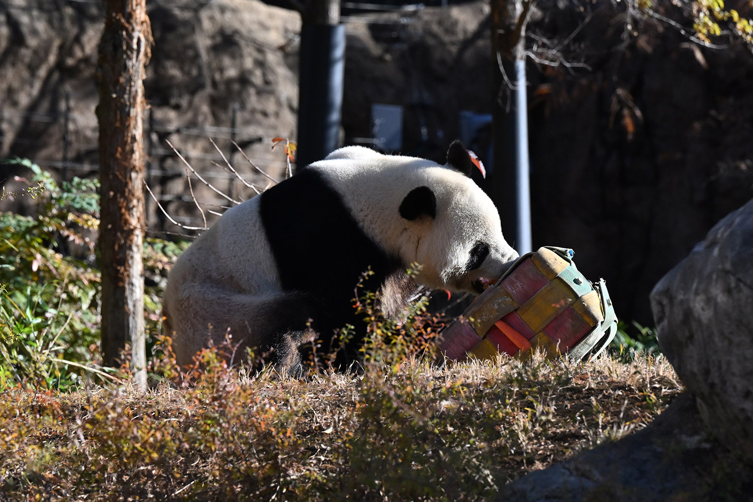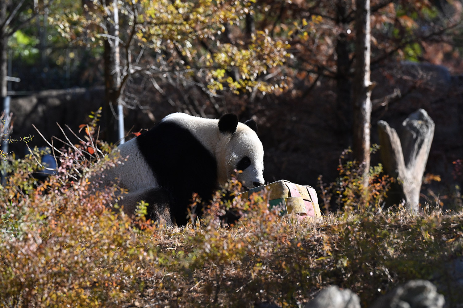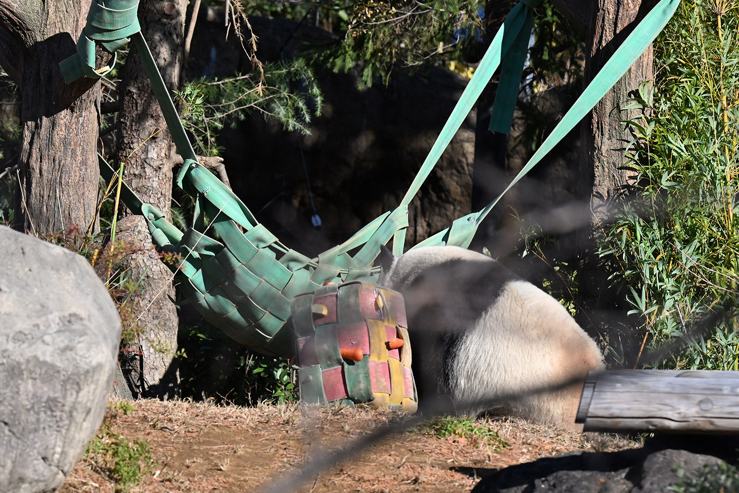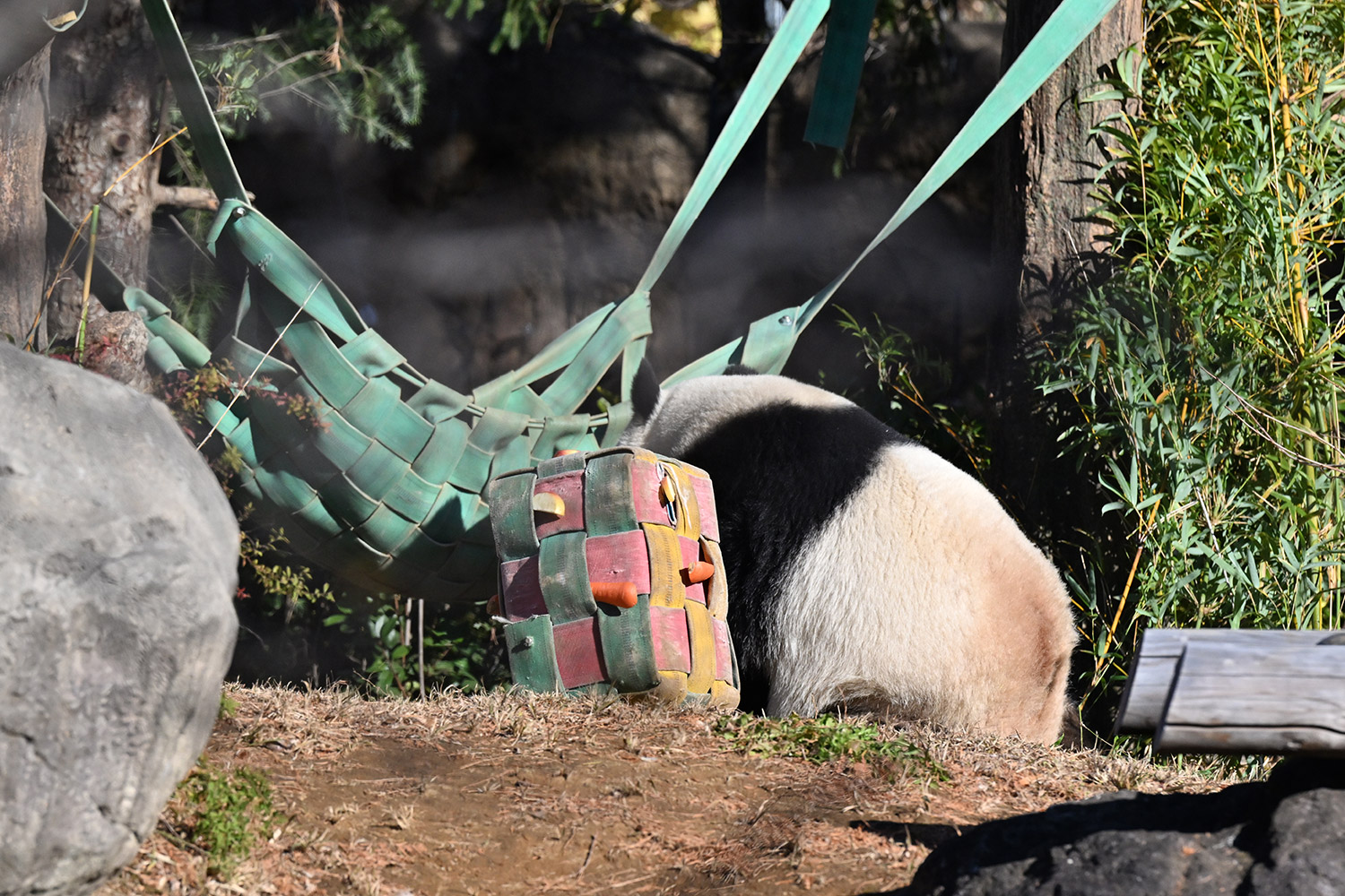 澄み渡った12月の青空と紅葉🍁白黒のシャオ🐼美しいシーンが心に染み入ります✨洞窟上の丸い後頭部、シャオと精養軒…期間限定の光景にウルッですが嬉しい!パパのお庭→シャオのお庭に。シャオ頼もしいぞ!褒めてくれるね!