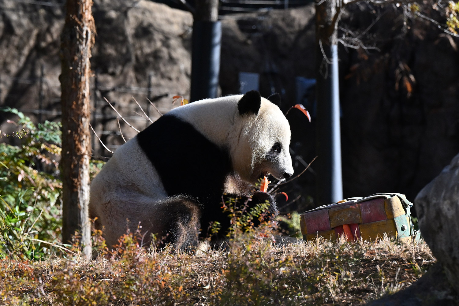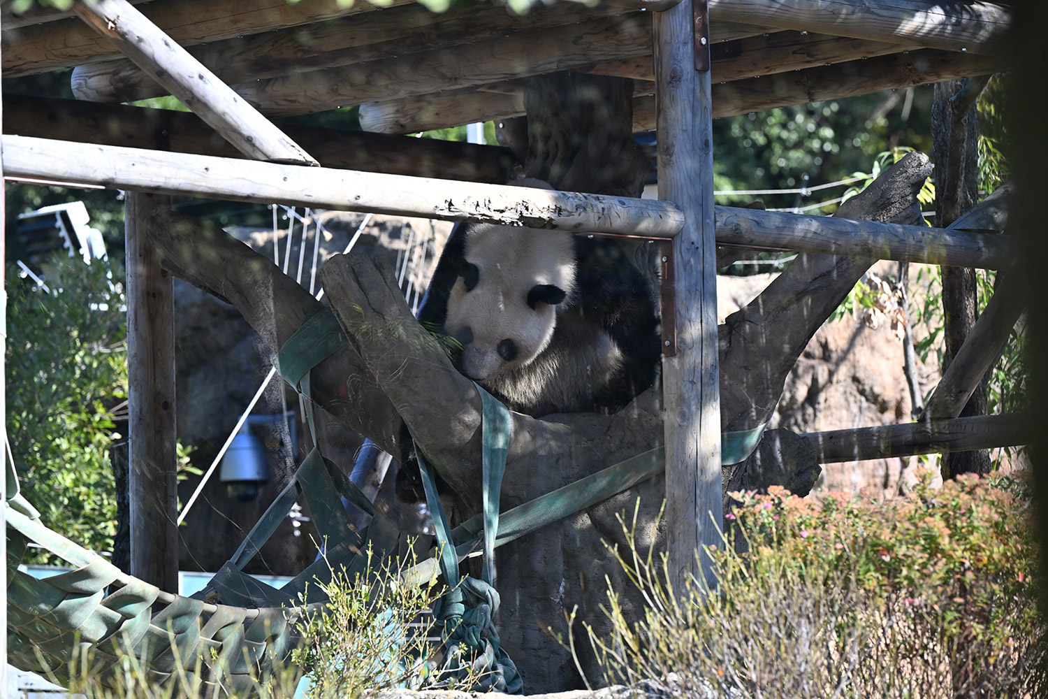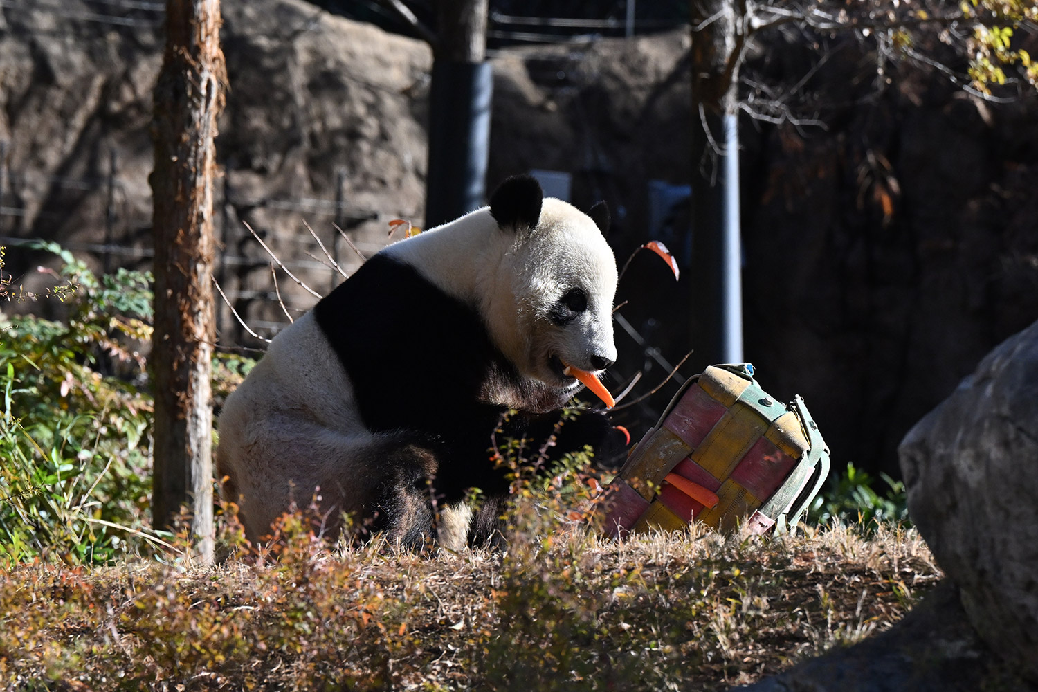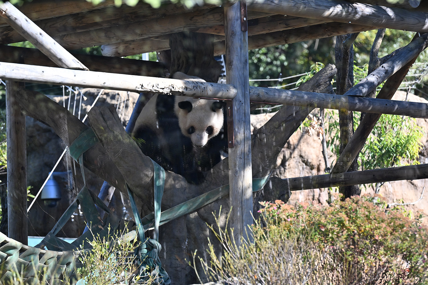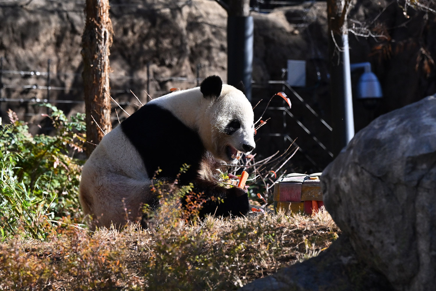 澄み渡った12月の青空と紅葉🍁白黒のシャオ🐼美しいシーンが心に染み入ります✨洞窟上の丸い後頭部、シャオと精養軒…期間限定の光景にウルッですが嬉しい!パパのお庭→シャオのお庭に。シャオ頼もしいぞ!褒めてくれるね!