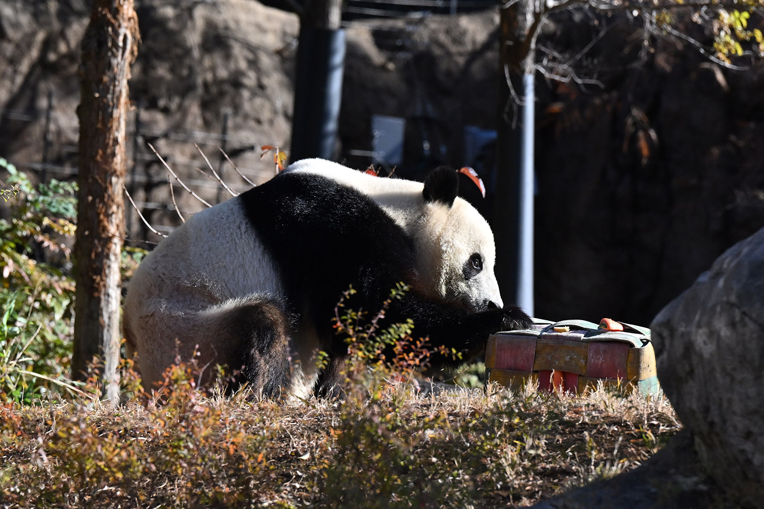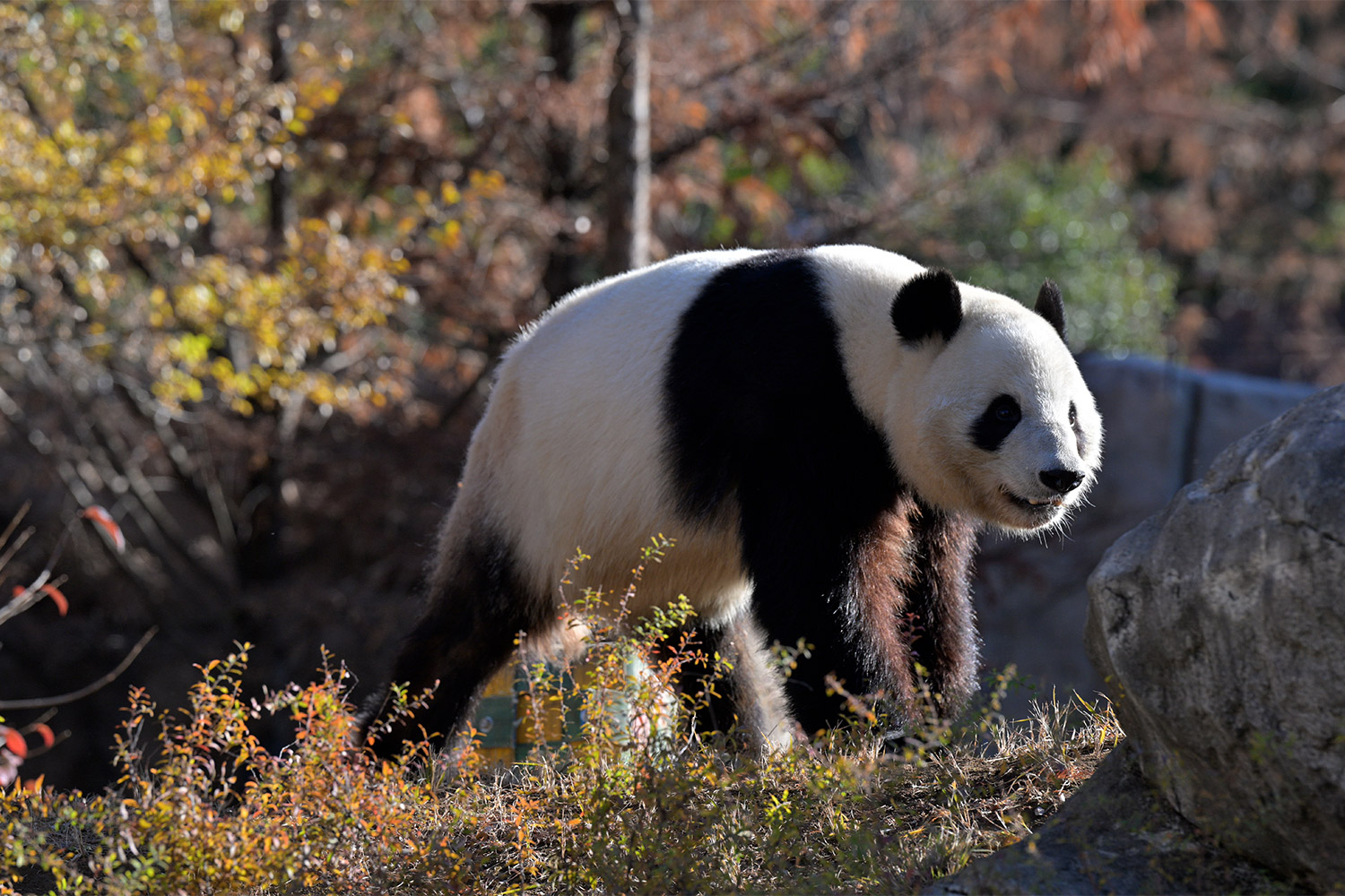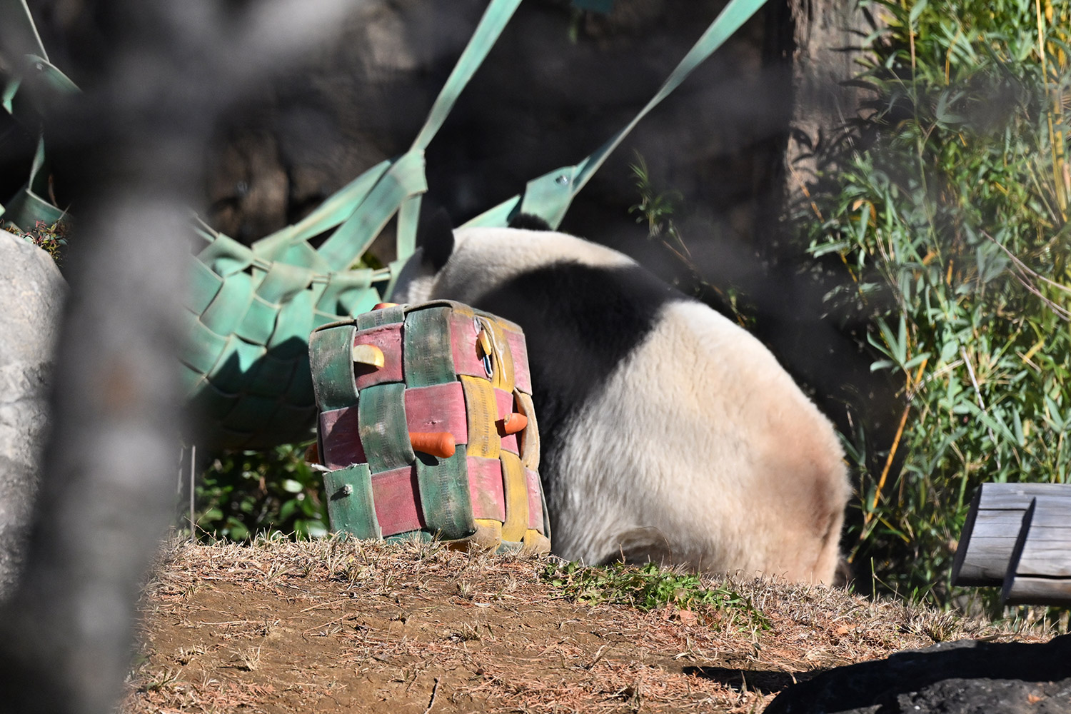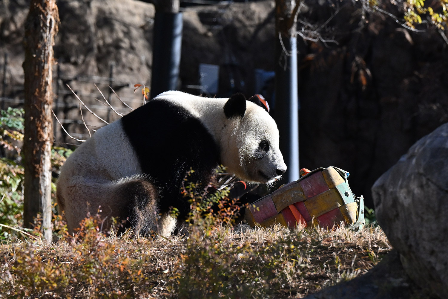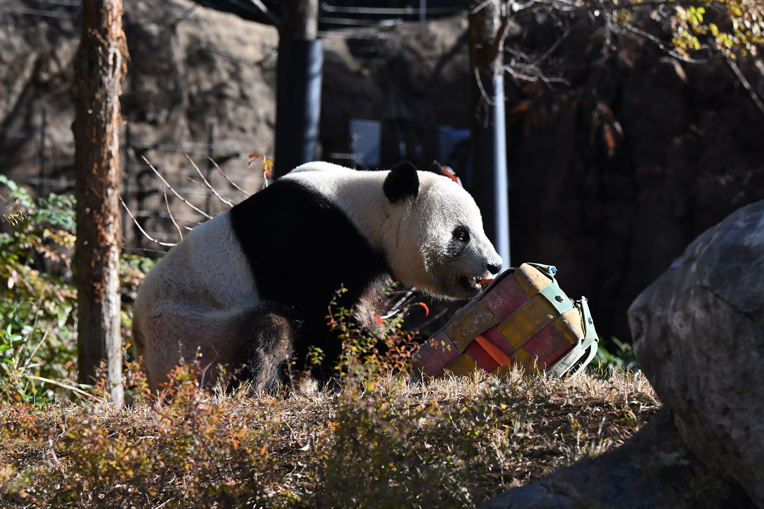 澄み渡った12月の青空と紅葉🍁白黒のシャオ🐼美しいシーンが心に染み入ります✨洞窟上の丸い後頭部、シャオと精養軒…期間限定の光景にウルッですが嬉しい!パパのお庭→シャオのお庭に。シャオ頼もしいぞ!褒めてくれるね!