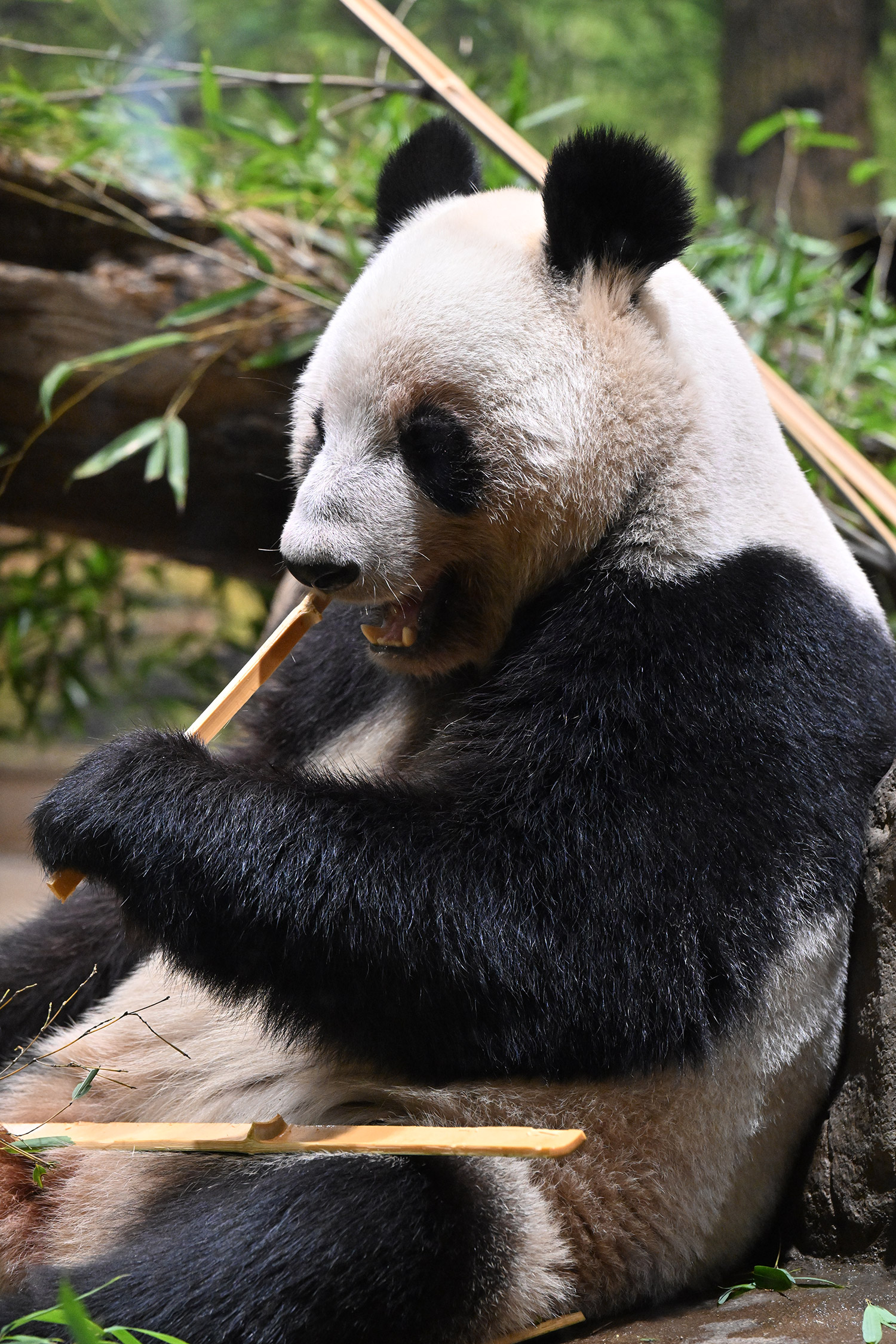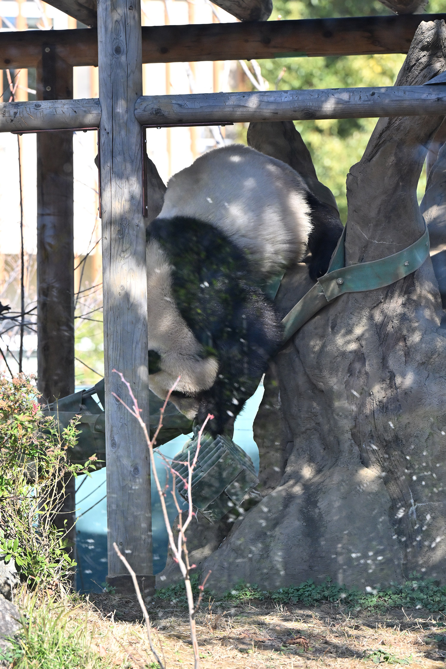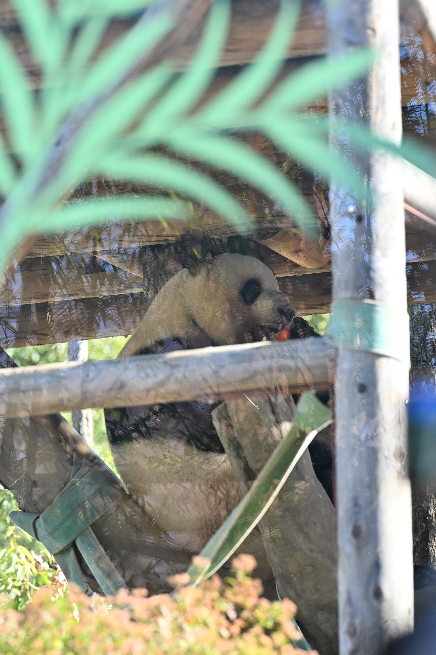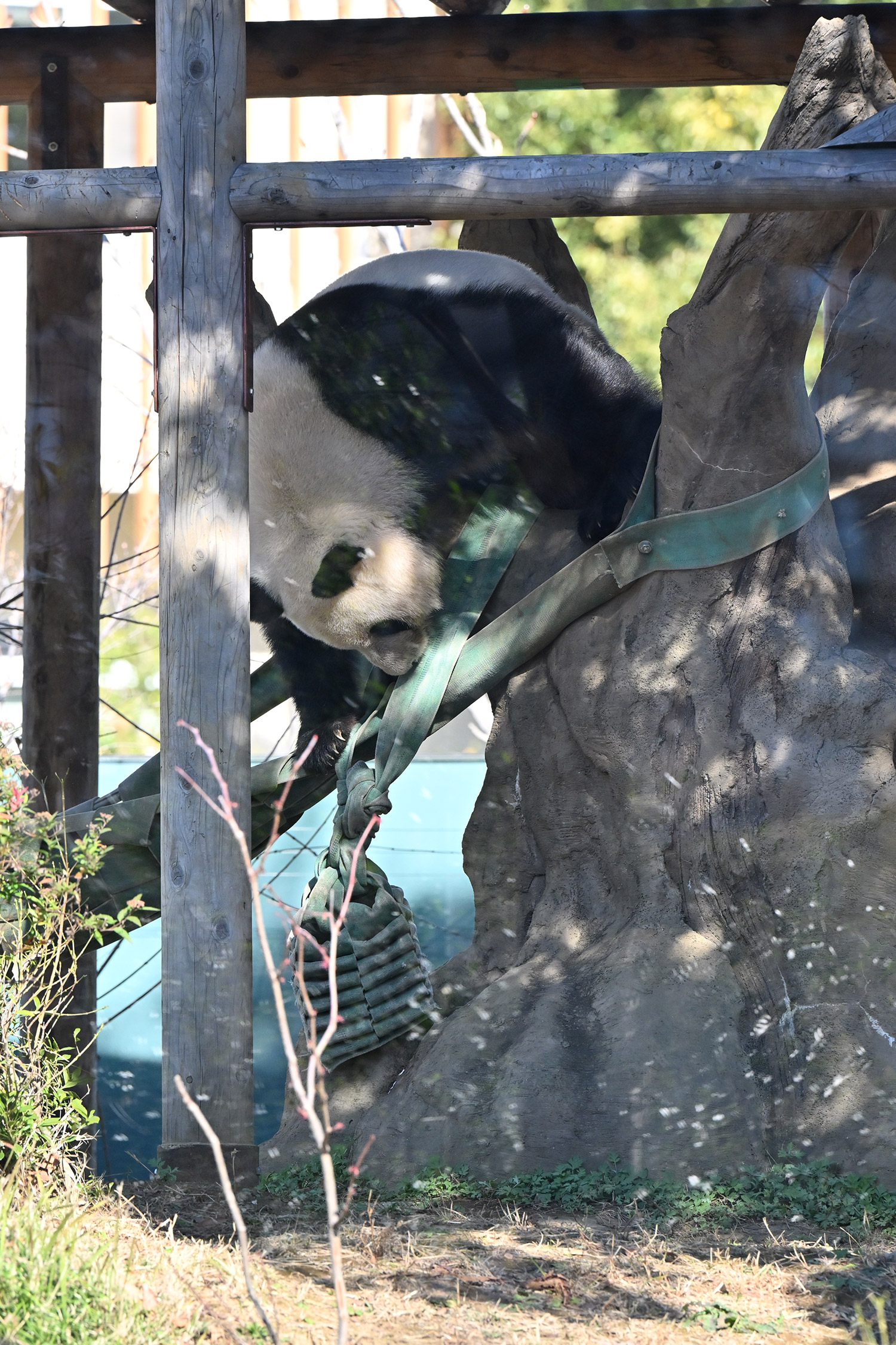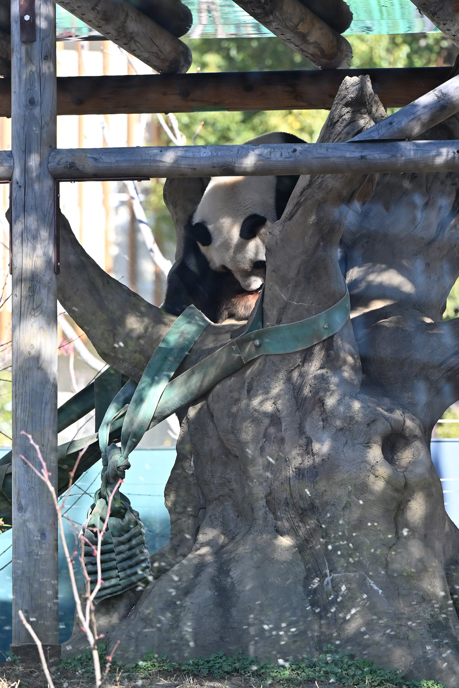 シャオくんもレイちゃんもお庭で食べるおやつを楽しみ今日を元気に暮らしていますね🤗❤️ シャオくんウヒヒと不思議な微笑み、そんなに人参おいしかったの〜?🤣🥕 レイちゃんモックでごろごろ今日は逆さに今日は😁櫓の下で大ジャーンプ⛷️そうなの竹はお部屋で食べるのね😋🎋 見る側の心情は段々とお写真が涙でにじみそうになっていますが😢、ふたりの表情や仕草が面白くてやはり笑顔になります😊💕 連日早朝から並ばれての撮影をありがとうございます🙏