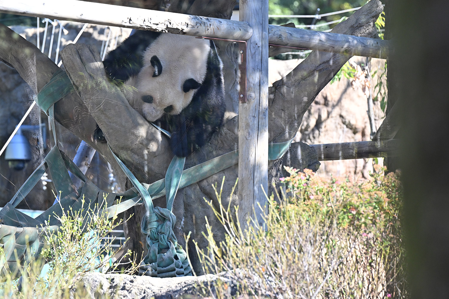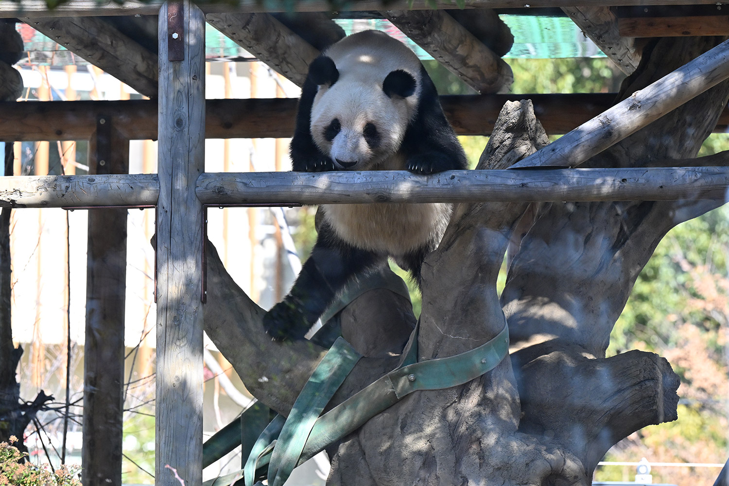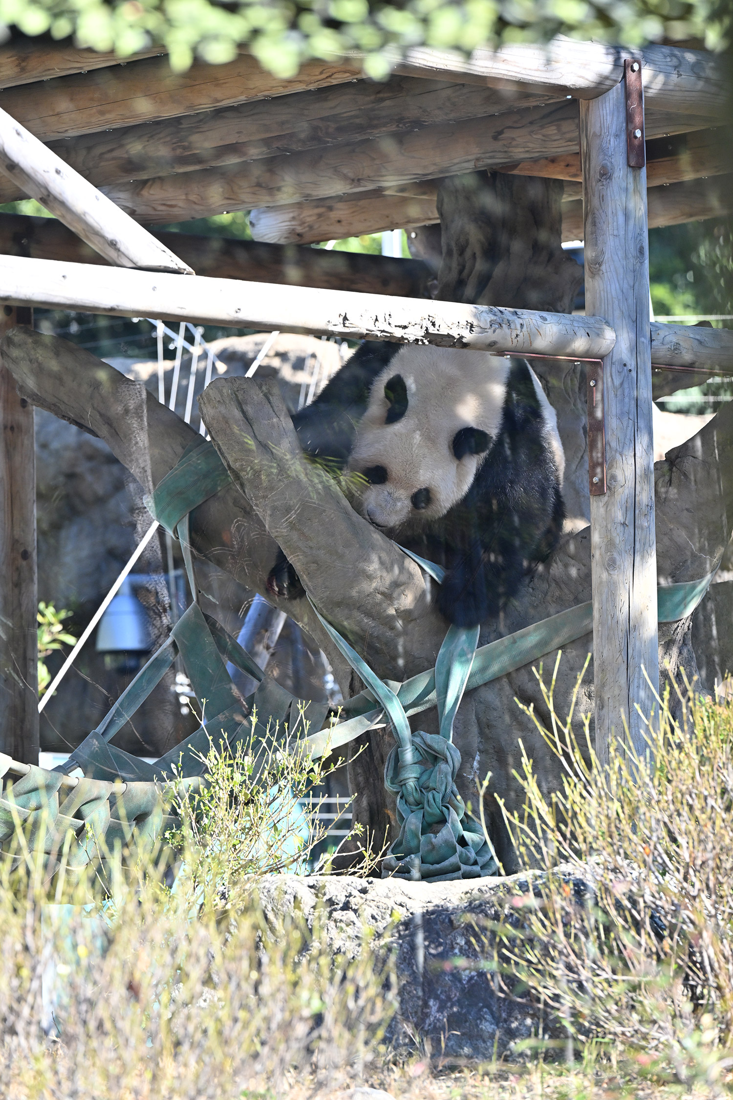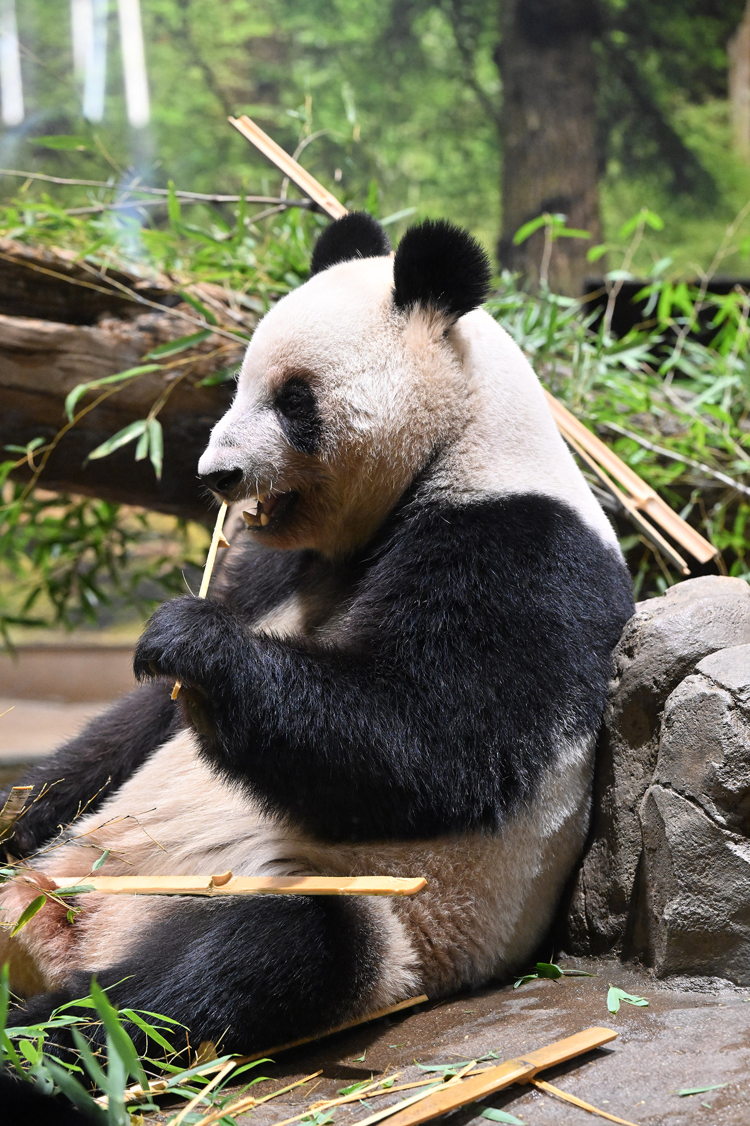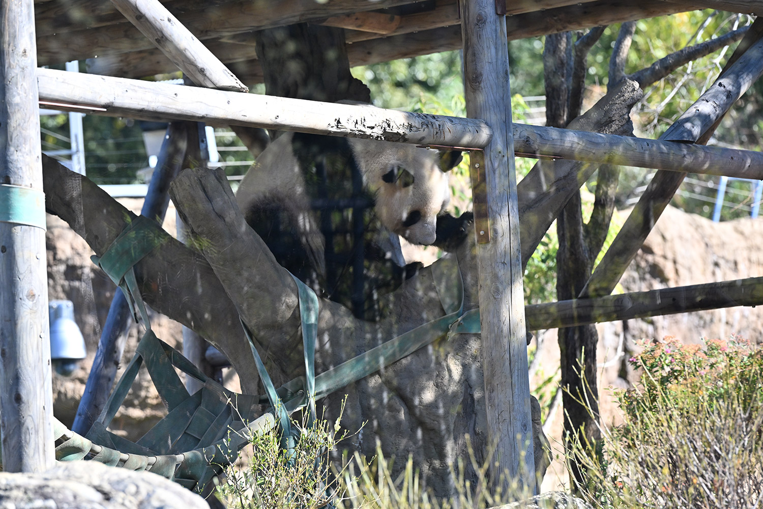 シャオくんもレイちゃんもお庭で食べるおやつを楽しみ今日を元気に暮らしていますね🤗❤️ シャオくんウヒヒと不思議な微笑み、そんなに人参おいしかったの〜?🤣🥕 レイちゃんモックでごろごろ今日は逆さに今日は😁櫓の下で大ジャーンプ⛷️そうなの竹はお部屋で食べるのね😋🎋 見る側の心情は段々とお写真が涙でにじみそうになっていますが😢、ふたりの表情や仕草が面白くてやはり笑顔になります😊💕 連日早朝から並ばれての撮影をありがとうございます🙏