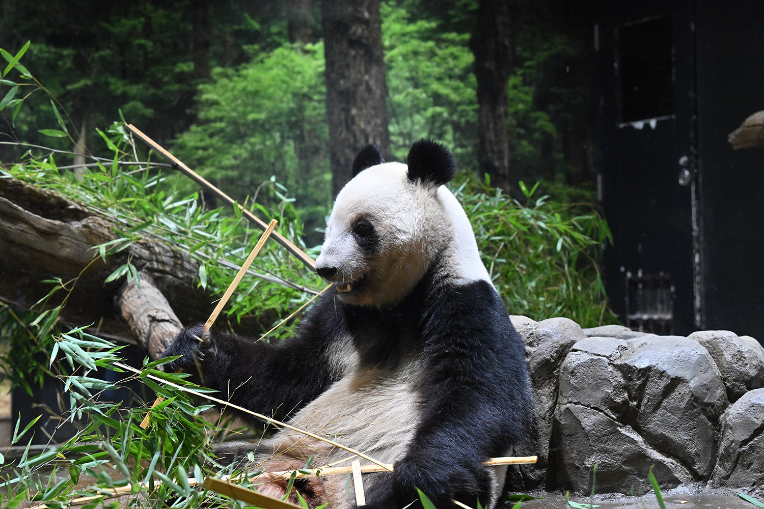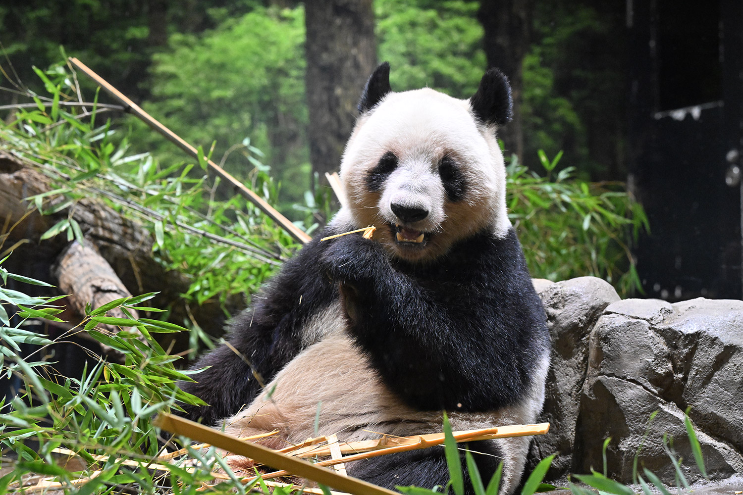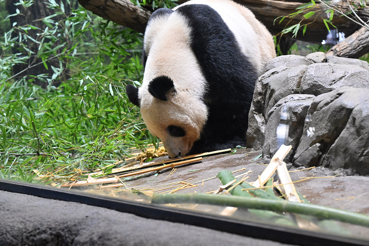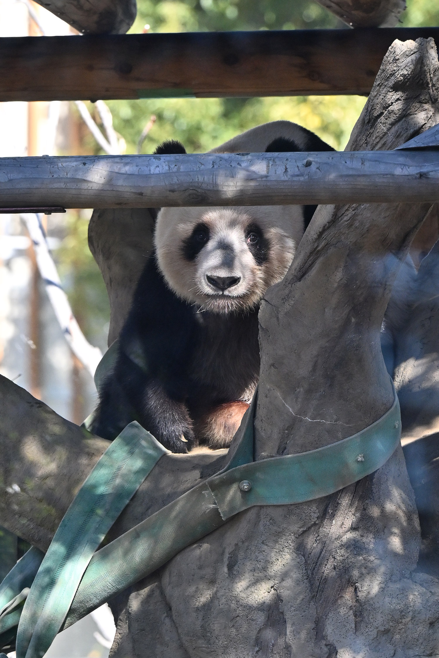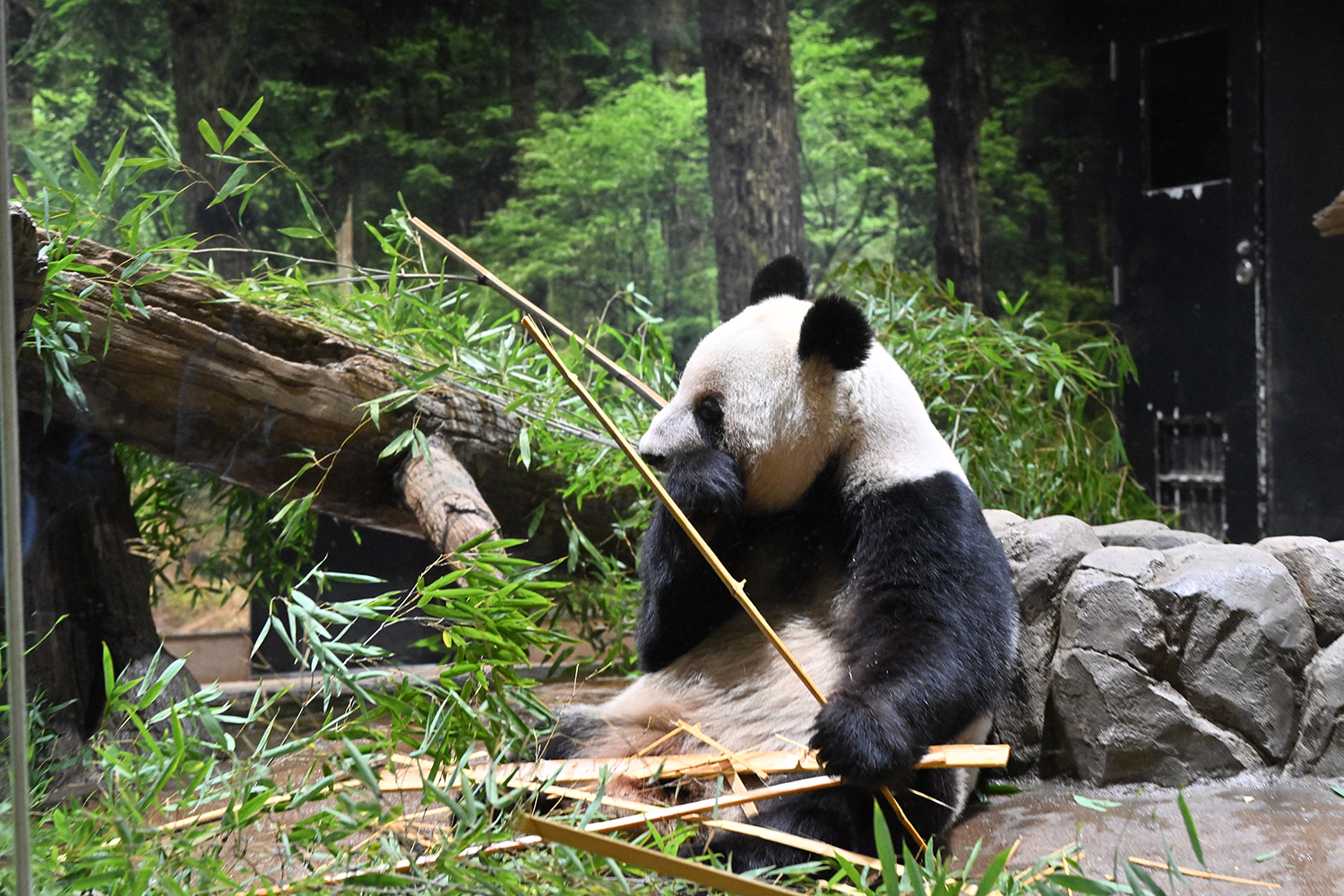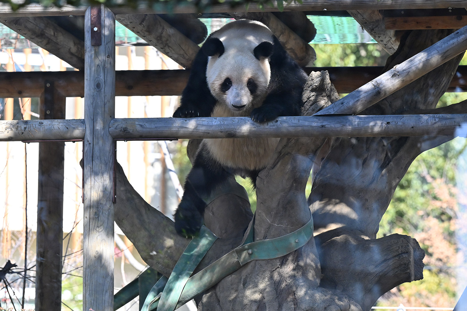 シャオくんもレイちゃんもお庭で食べるおやつを楽しみ今日を元気に暮らしていますね🤗❤️ シャオくんウヒヒと不思議な微笑み、そんなに人参おいしかったの〜?🤣🥕 レイちゃんモックでごろごろ今日は逆さに今日は😁櫓の下で大ジャーンプ⛷️そうなの竹はお部屋で食べるのね😋🎋 見る側の心情は段々とお写真が涙でにじみそうになっていますが😢、ふたりの表情や仕草が面白くてやはり笑顔になります😊💕 連日早朝から並ばれての撮影をありがとうございます🙏
